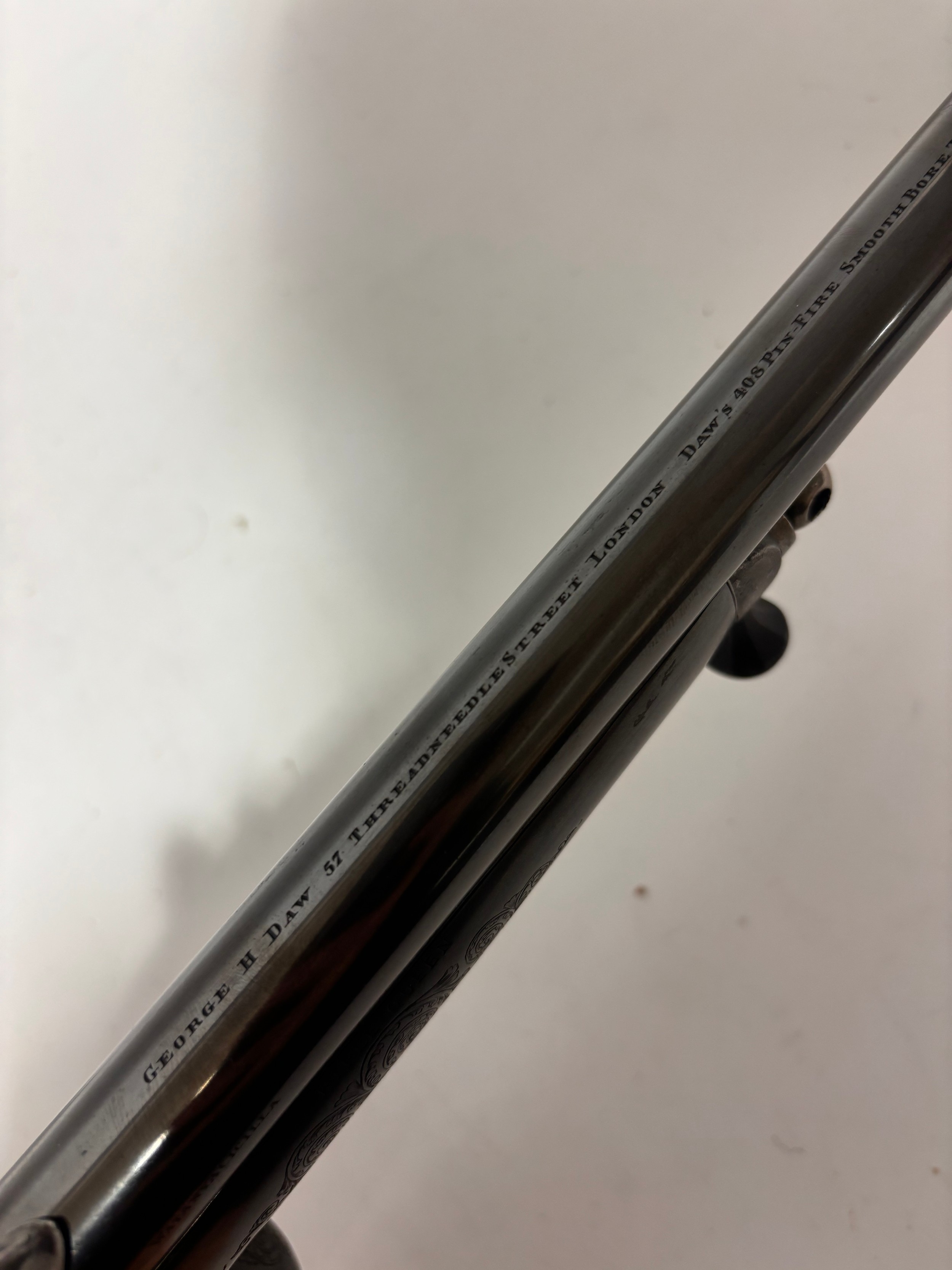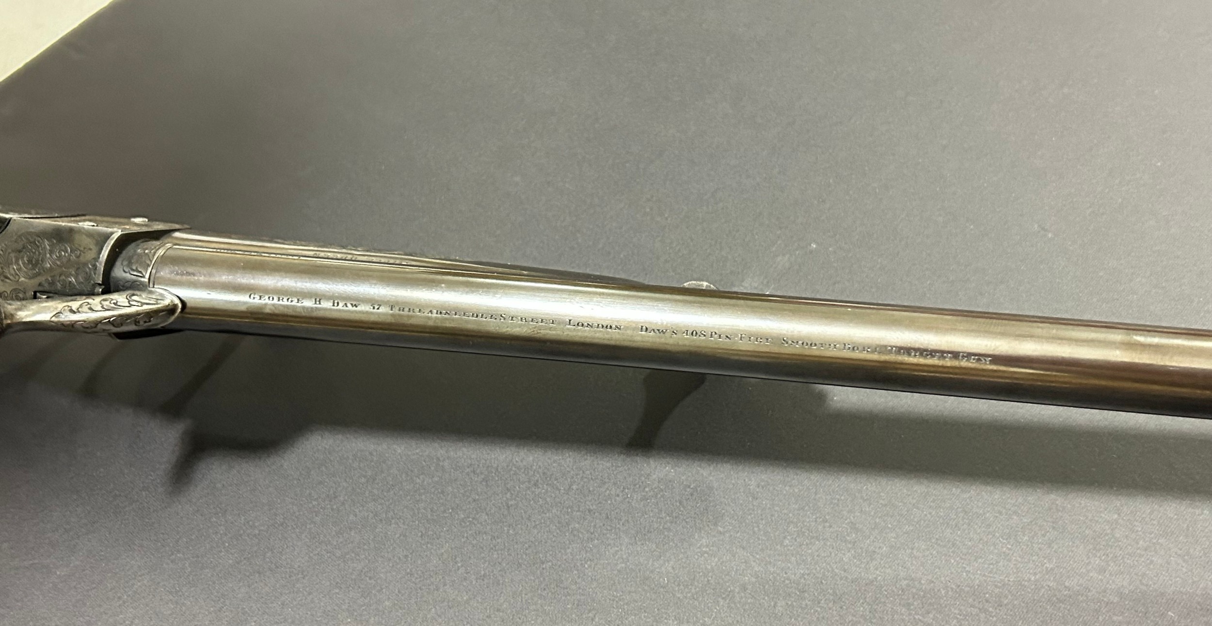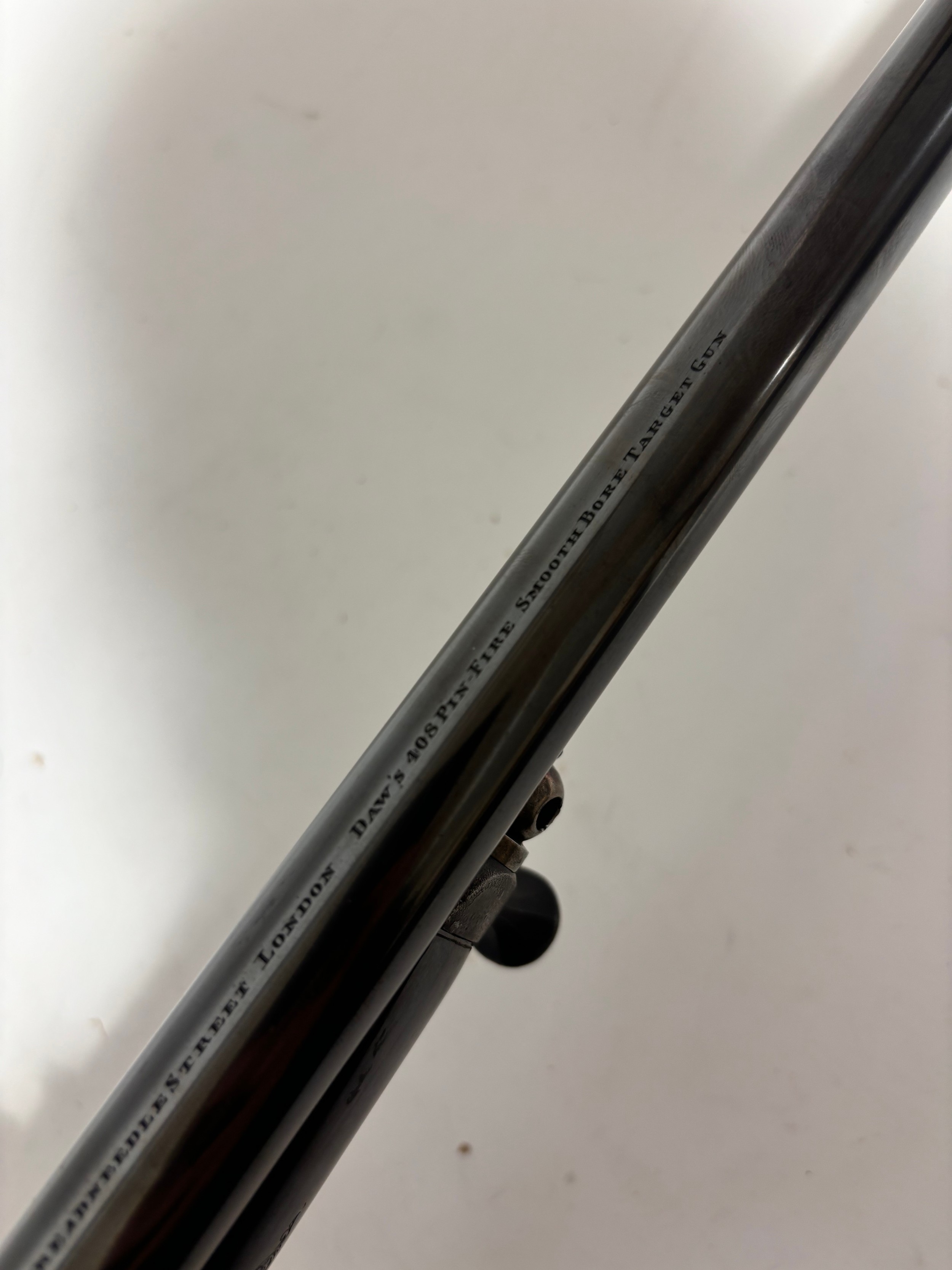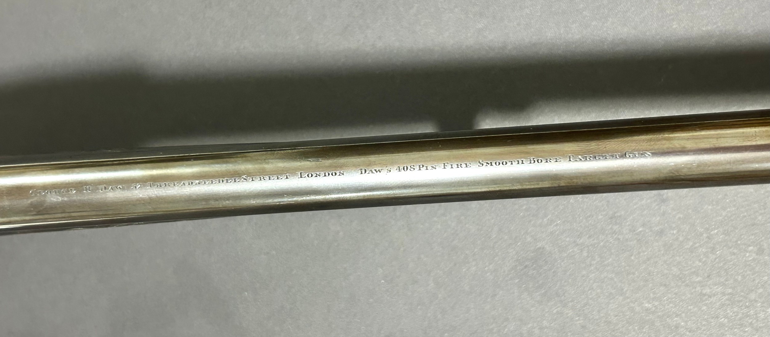 The receiver is engraved on both sides with the maker’s name “George H. Daw” and the top of the barrel with further inscription reading “George H. Daw, 57 Threadneedle Street, London. Daw’s 408 Pin-Fire Smooth Bore Target Gun” and matching serial number “3444”.