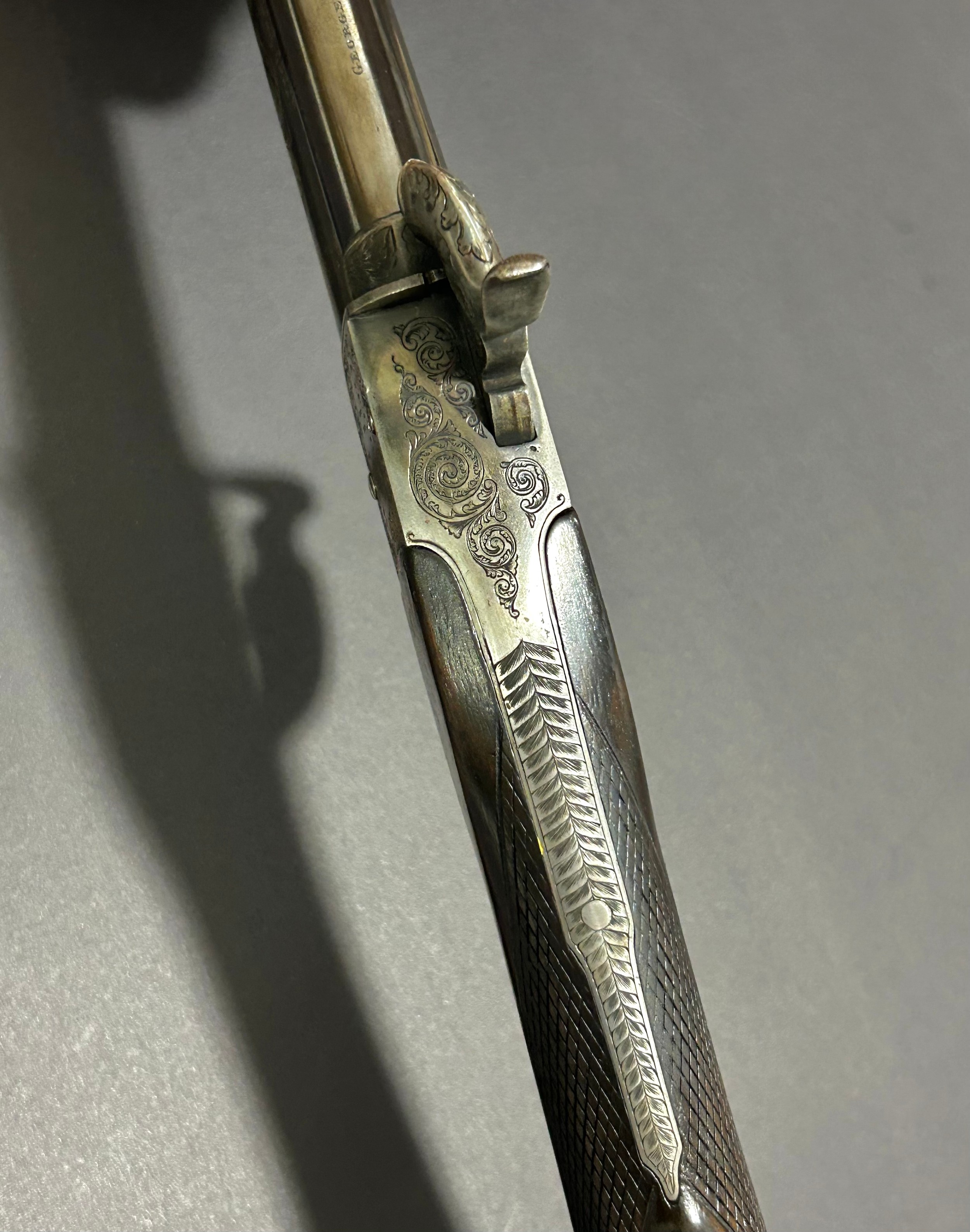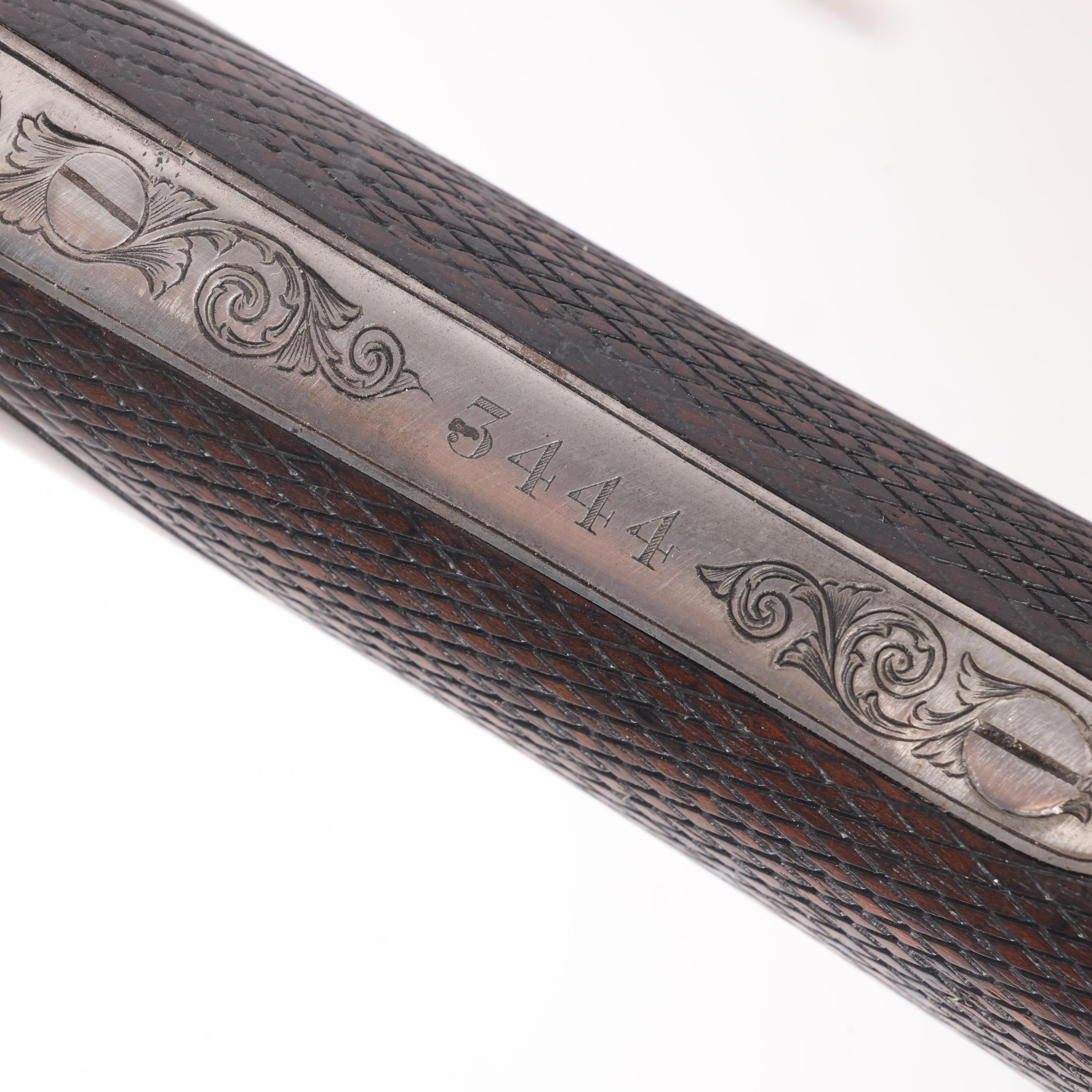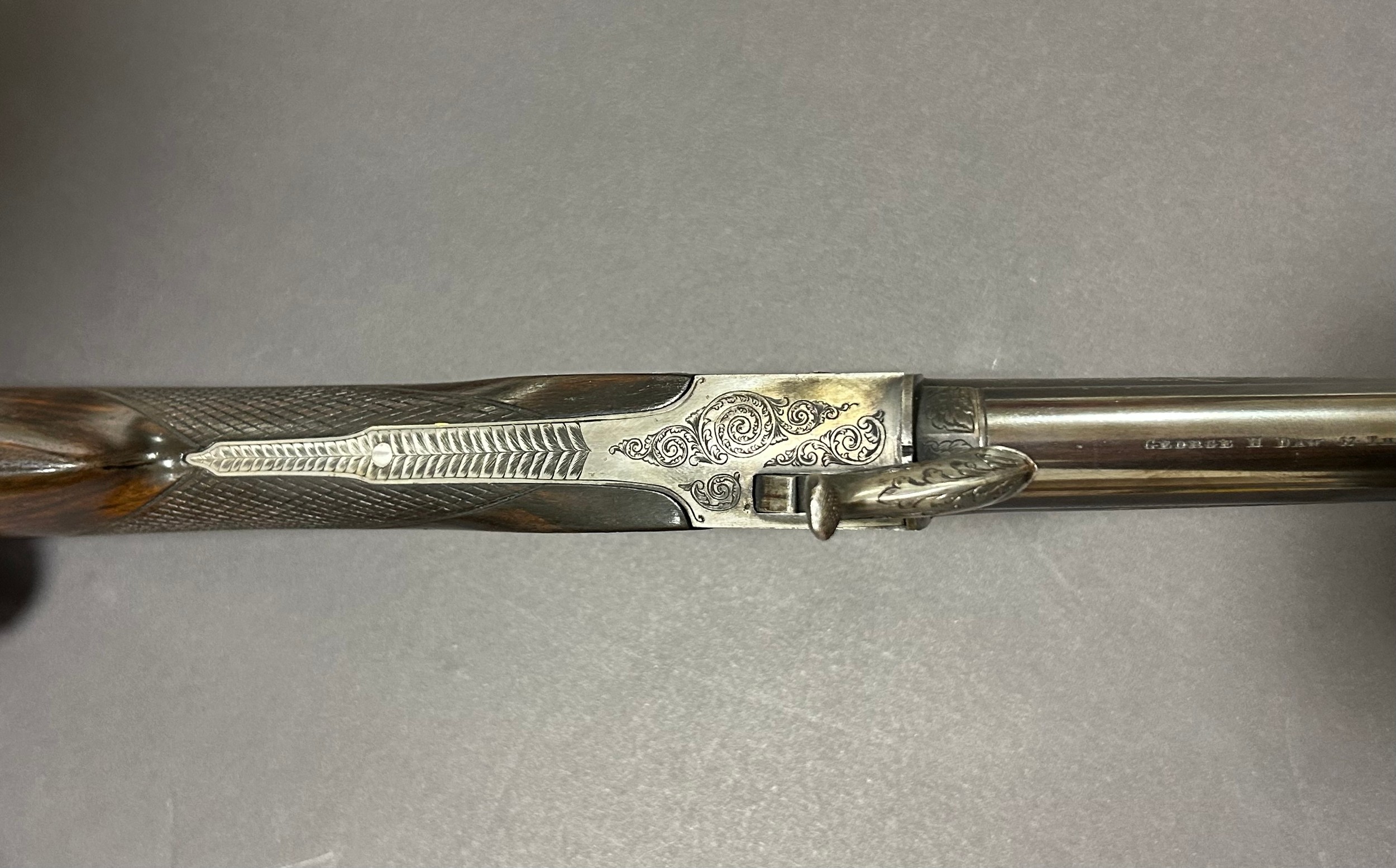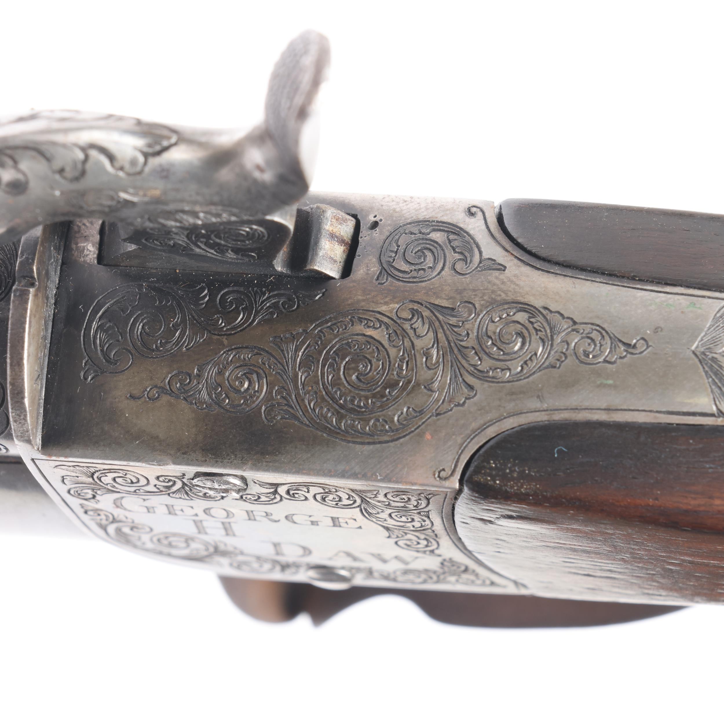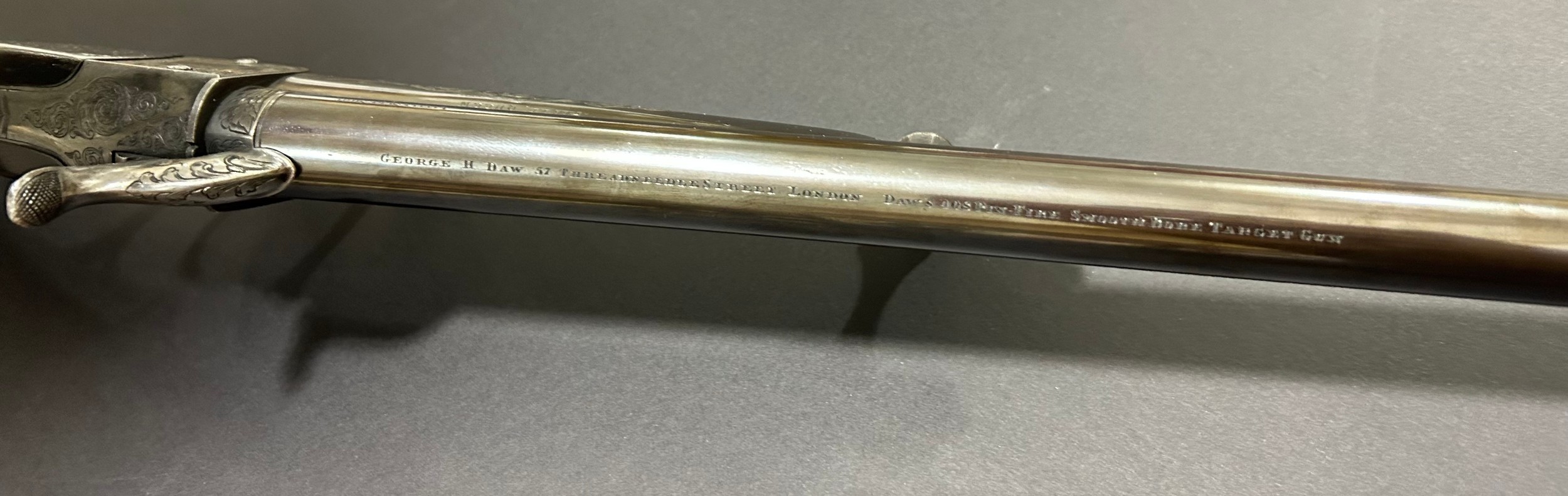 The receiver is engraved on both sides with the maker’s name “George H. Daw” and the top of the barrel with further inscription reading “George H. Daw, 57 Threadneedle Street, London. Daw’s 408 Pin-Fire Smooth Bore Target Gun” and matching serial number “3444”.