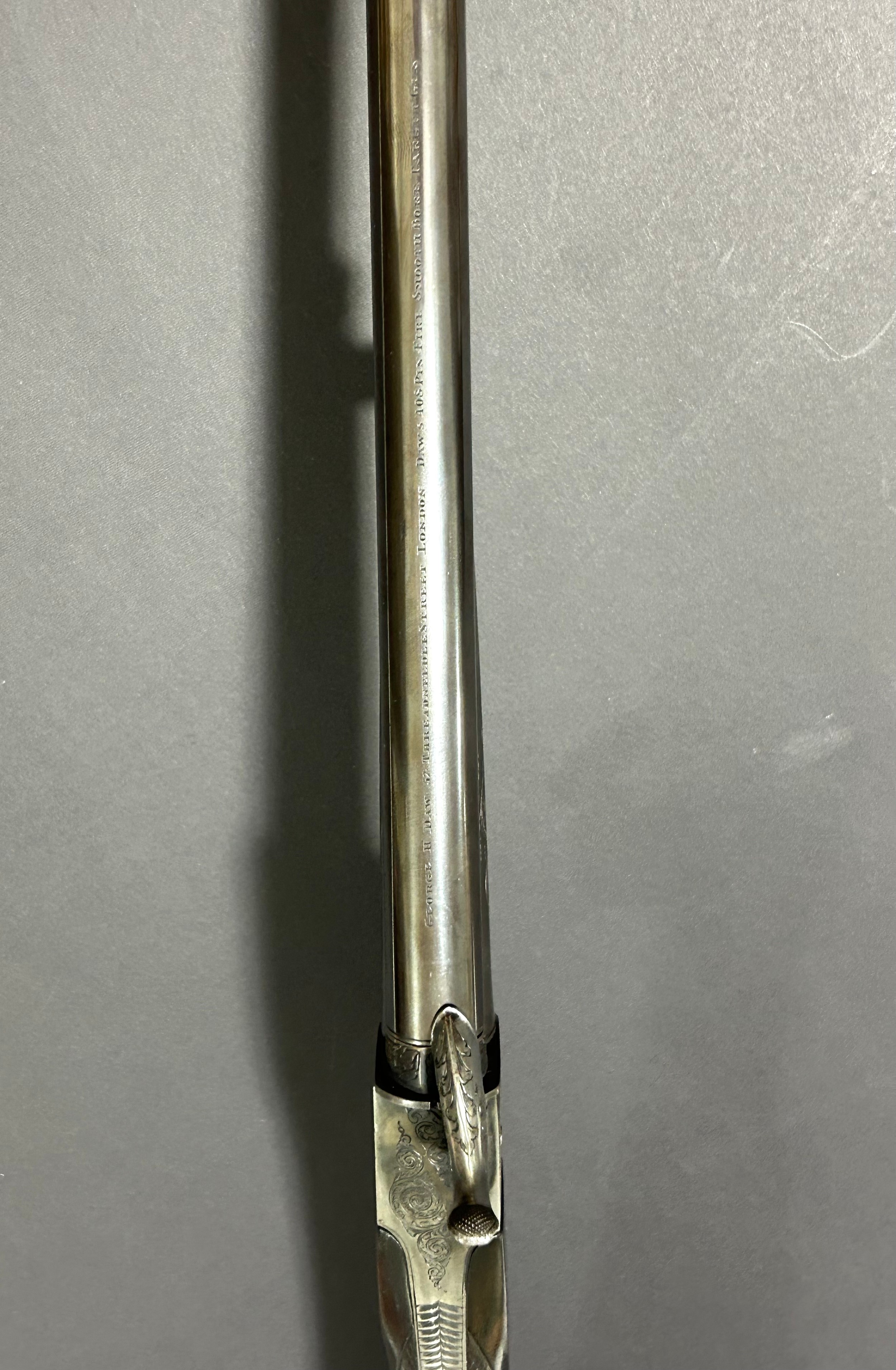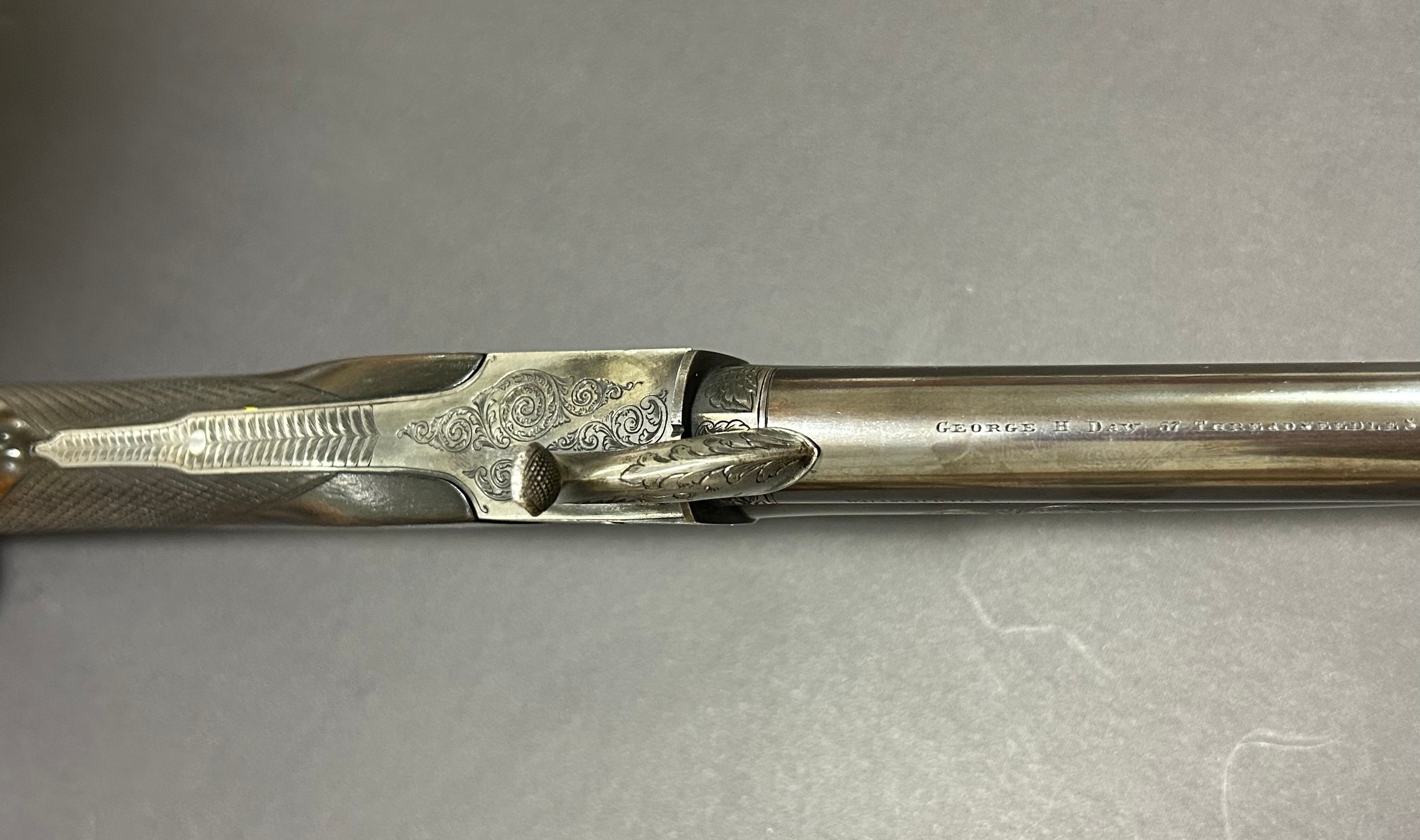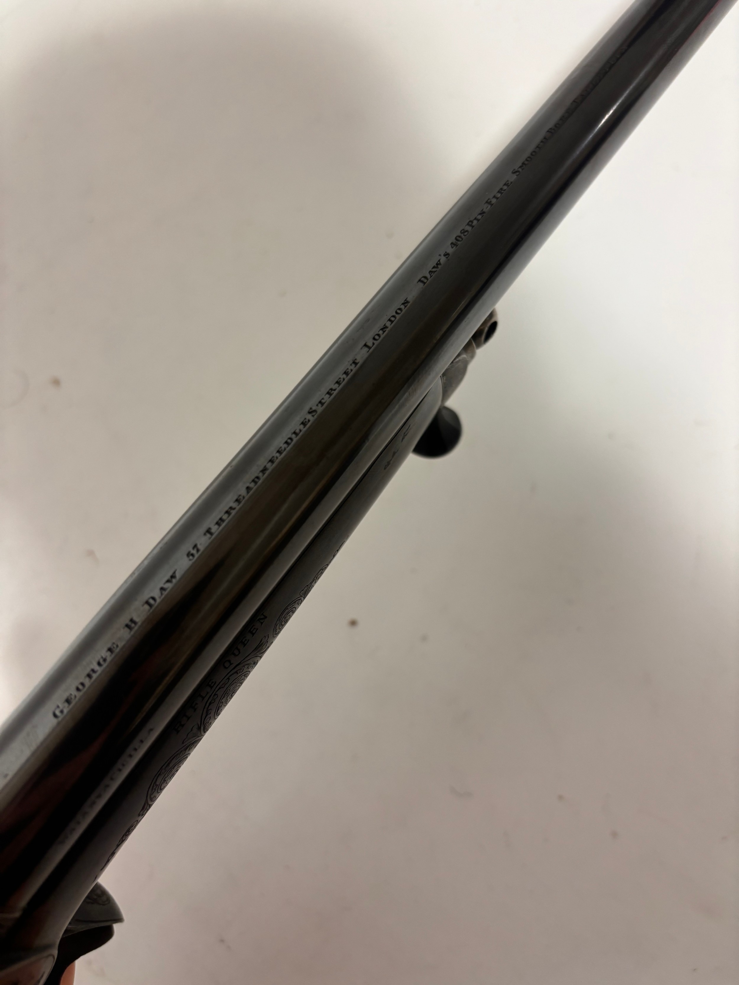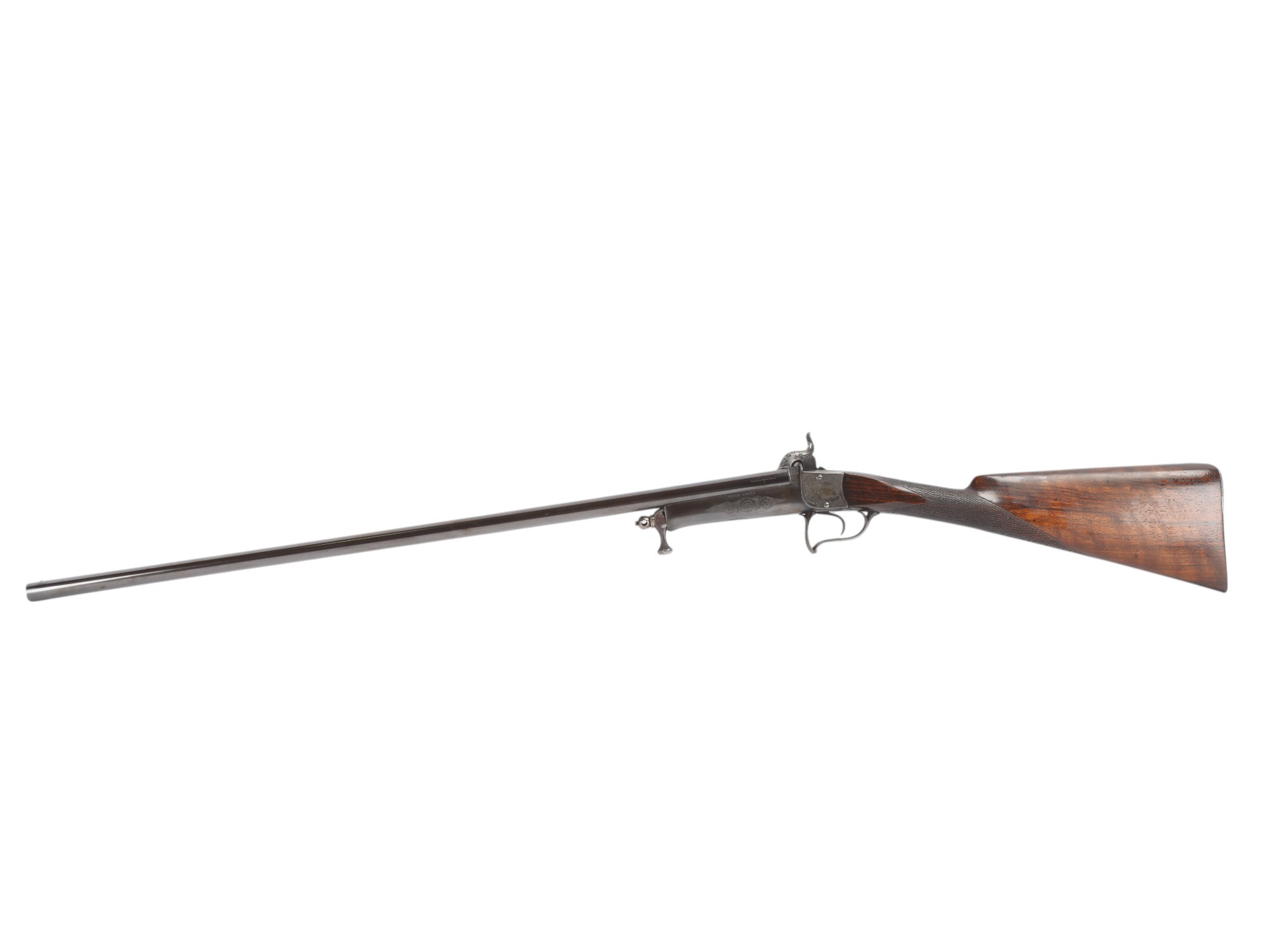 The receiver is engraved on both sides with the maker’s name “George H. Daw” and the top of the barrel with further inscription reading “George H. Daw, 57 Threadneedle Street, London. Daw’s 408 Pin-Fire Smooth Bore Target Gun” and matching serial number “3444”.