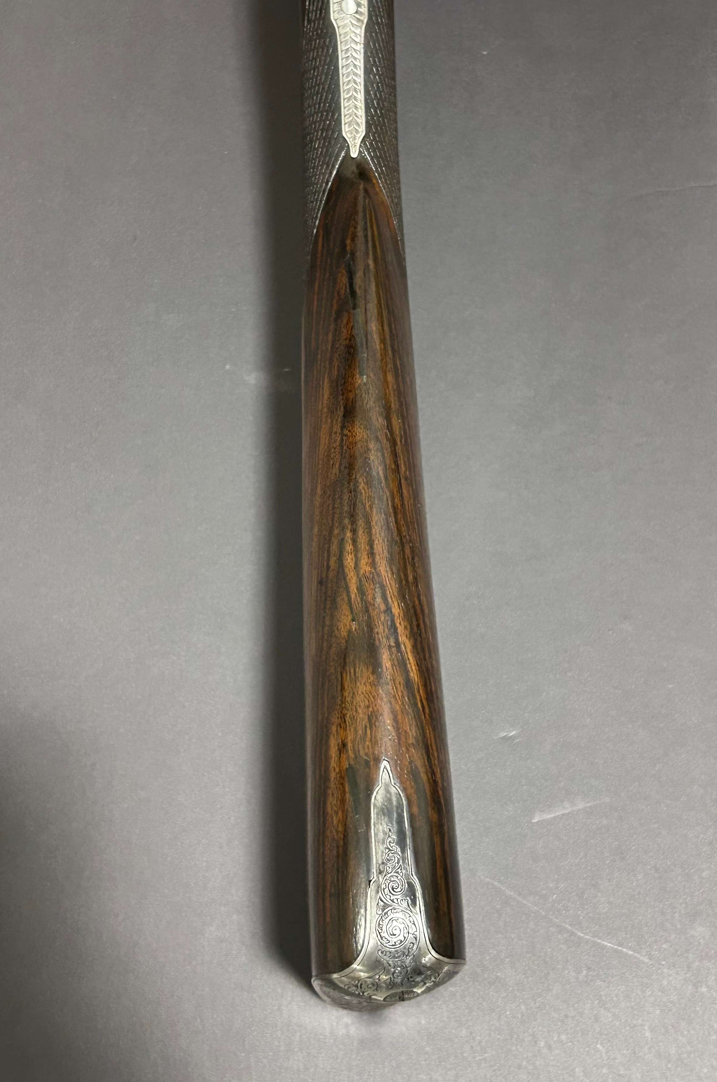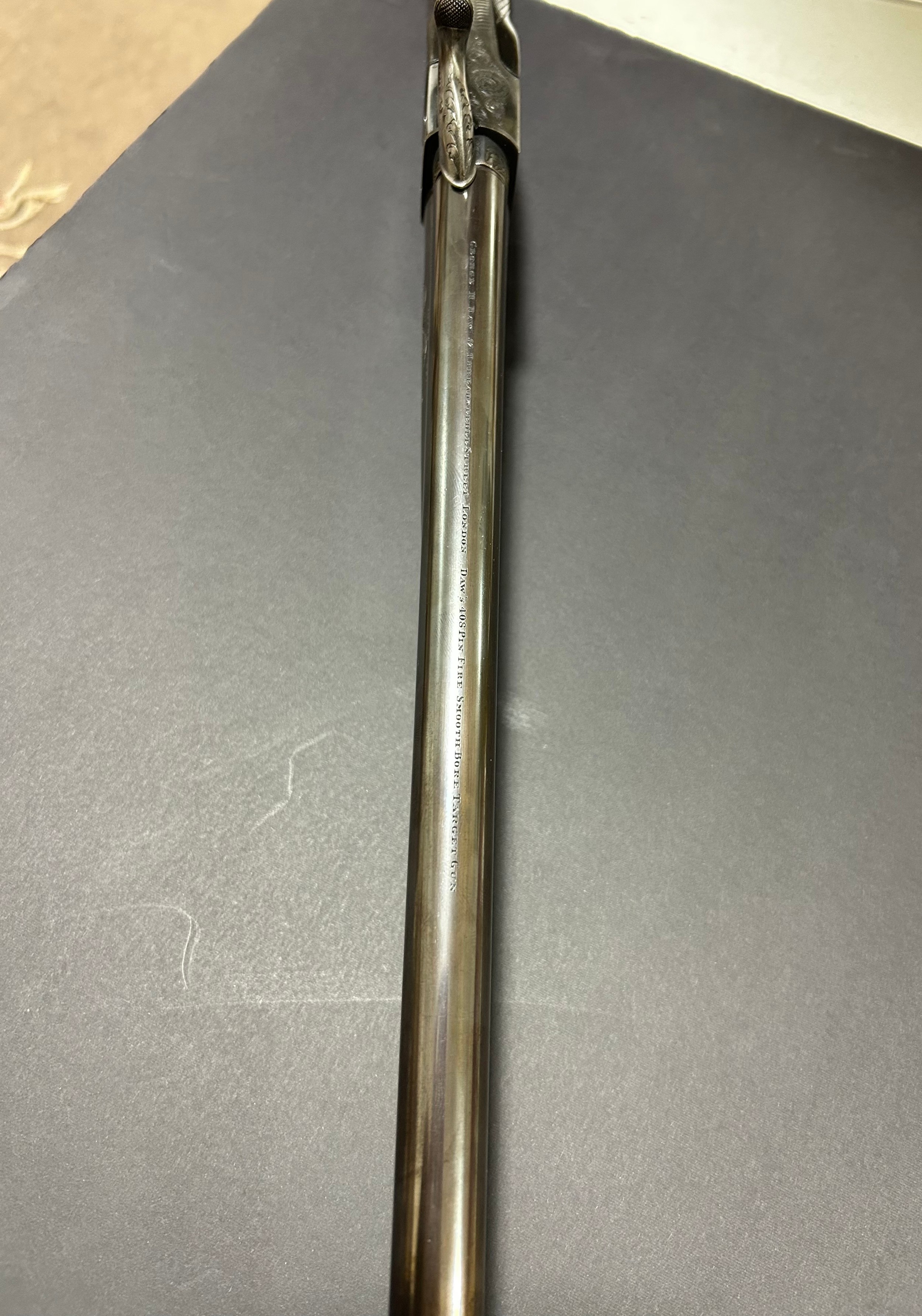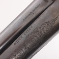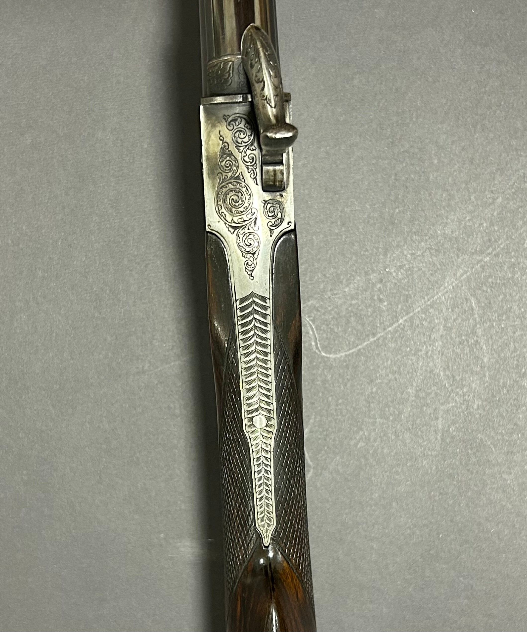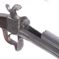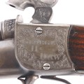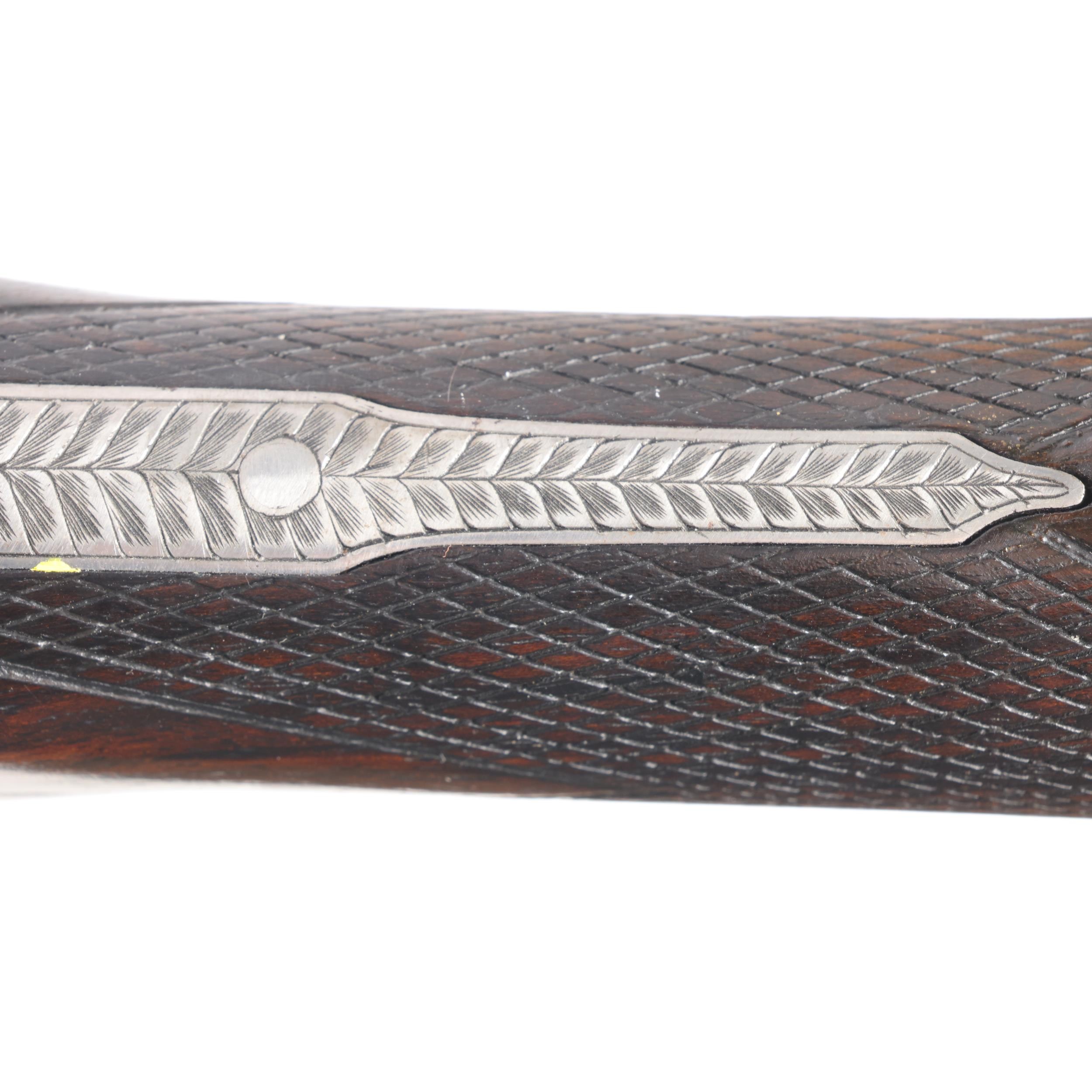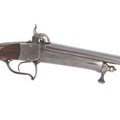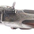 The receiver is engraved on both sides with the maker’s name “George H. Daw” and the top of the barrel with further inscription reading “George H. Daw, 57 Threadneedle Street, London. Daw’s 408 Pin-Fire Smooth Bore Target Gun” and matching serial number “3444”.