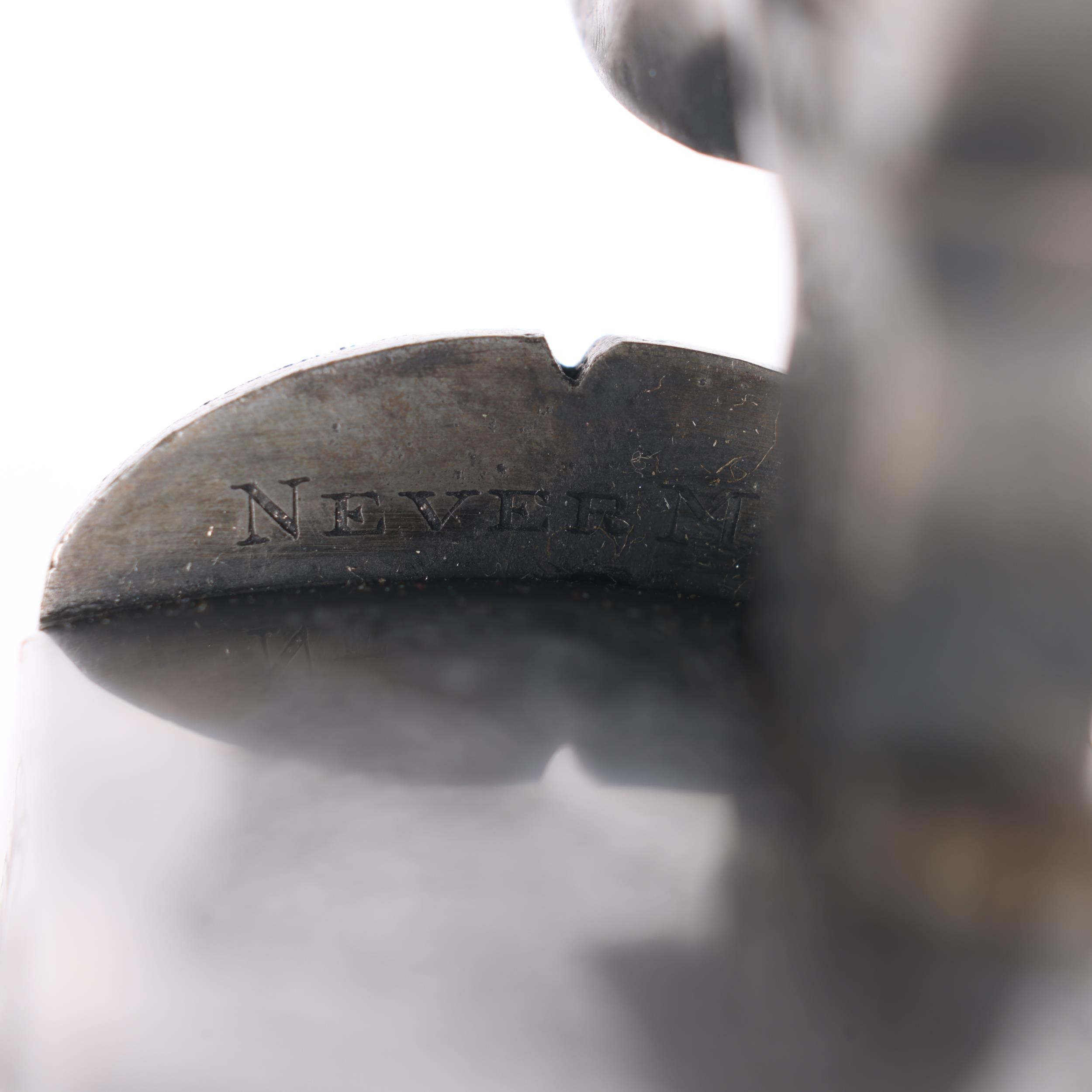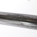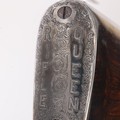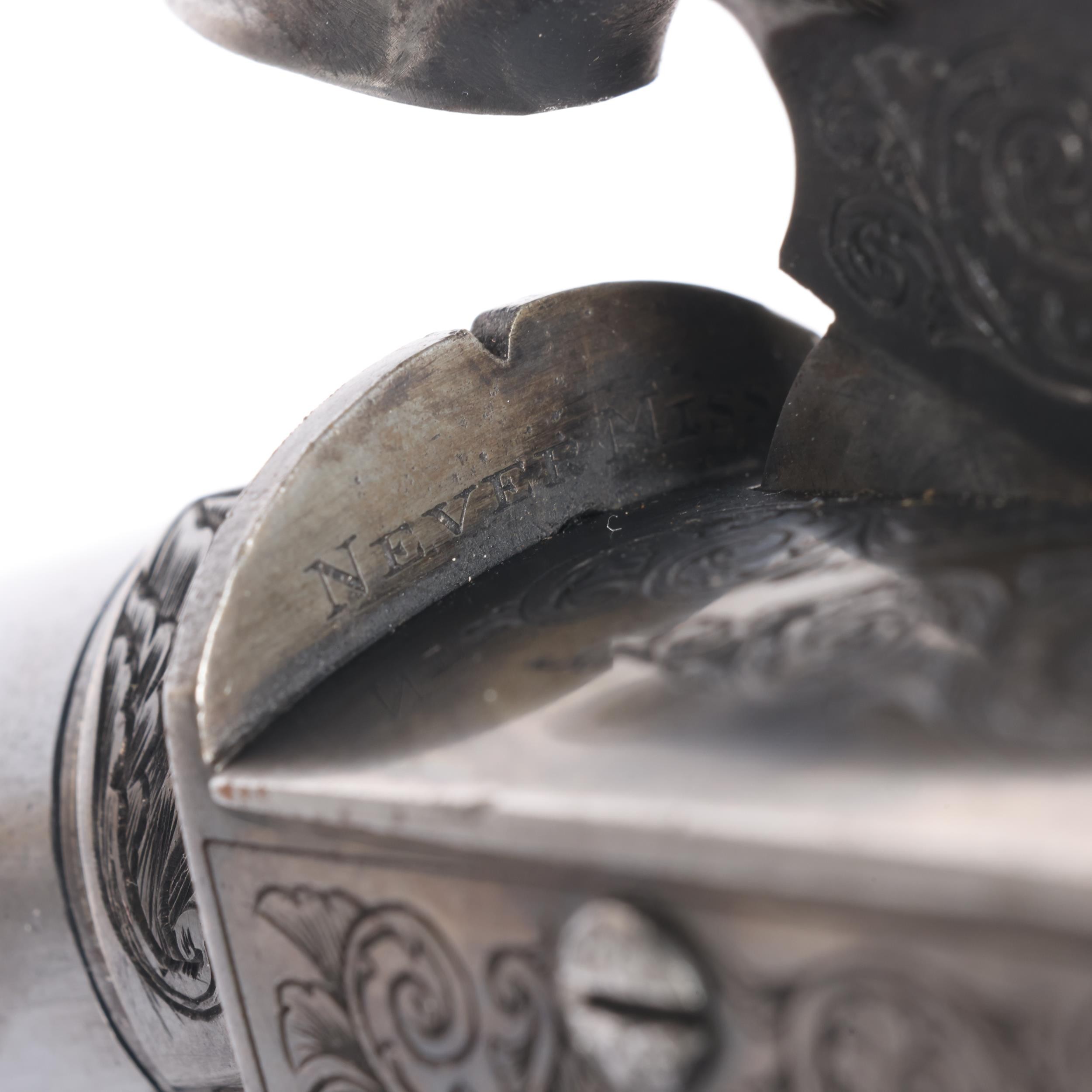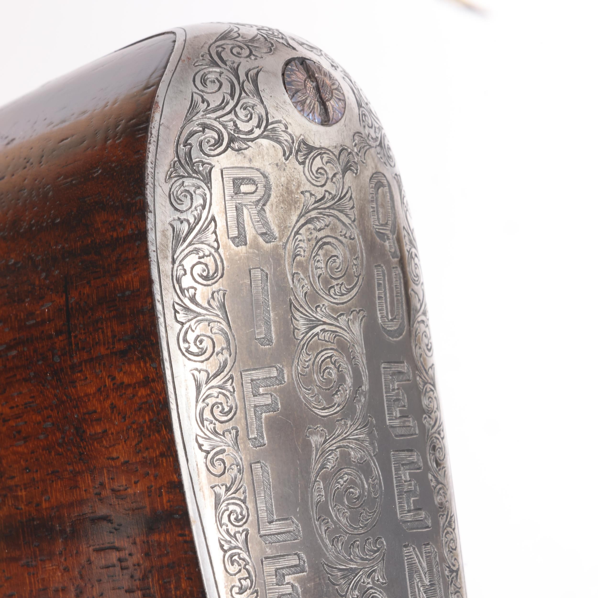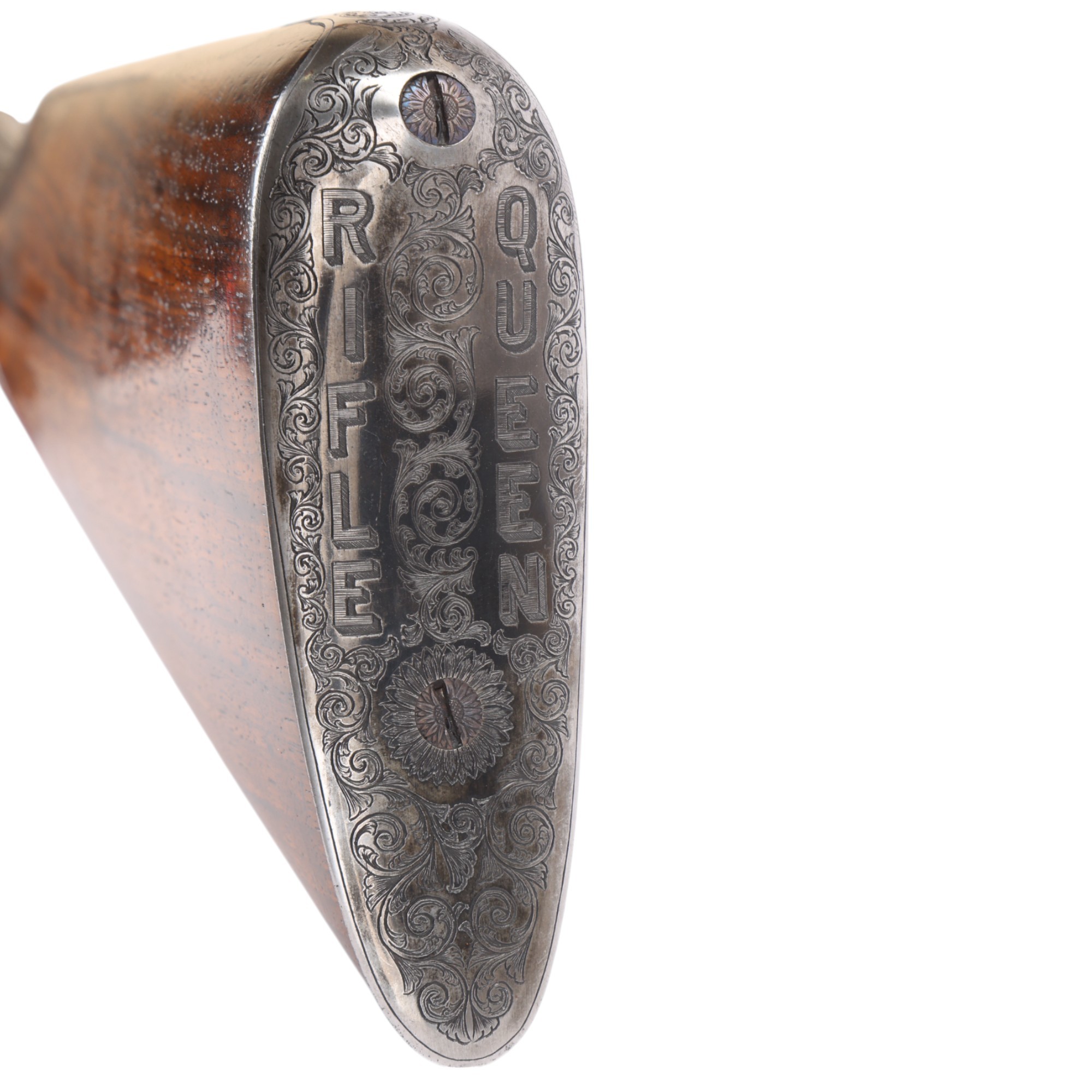 Performing daring dead-shot feats such as target shooting while standing on the back of a galloping horse and precision tasks like shooting a coin are just a couple of the reasons why she earned the stage name “Rifle Queen”, which is elaborately engraved on the butt plate of the gun along with a scrollwork surround and to both sides of the forestock. One of the most minute but important details can be seen when holding the gun and viewing down the sight, on which can be seen the words “Never Miss”.