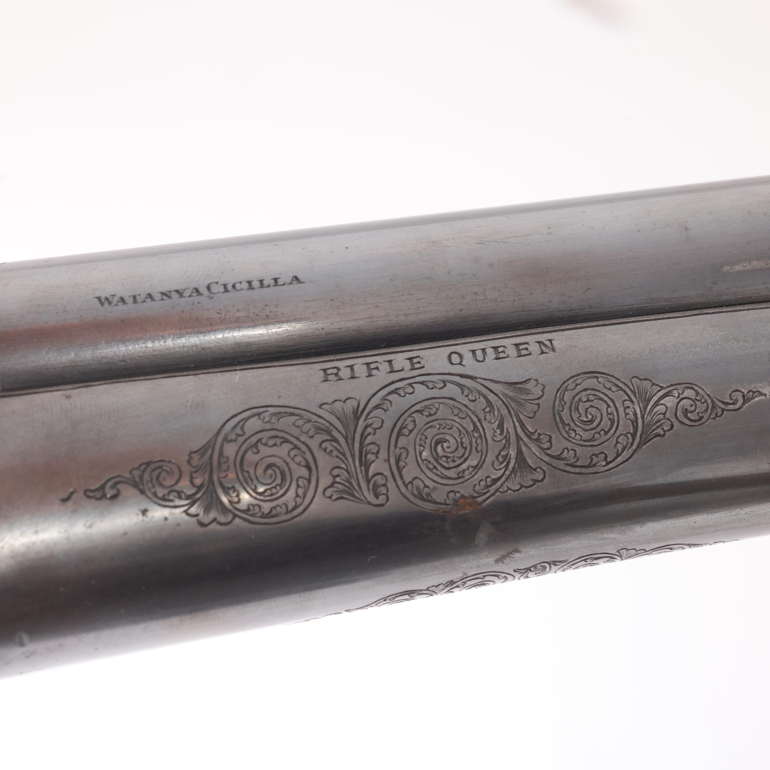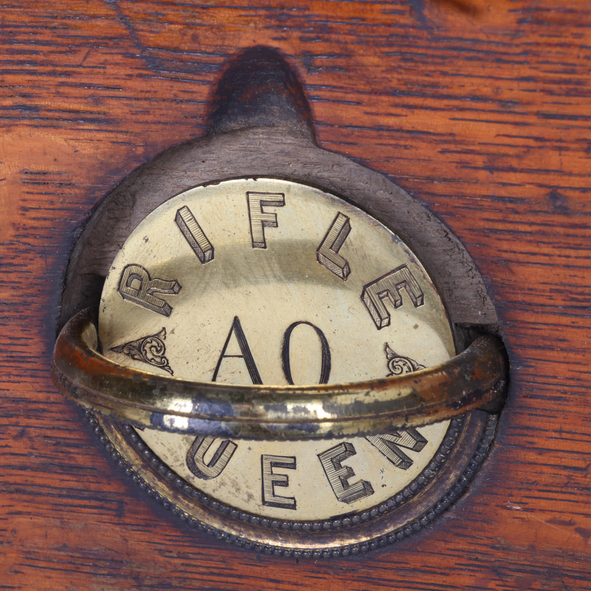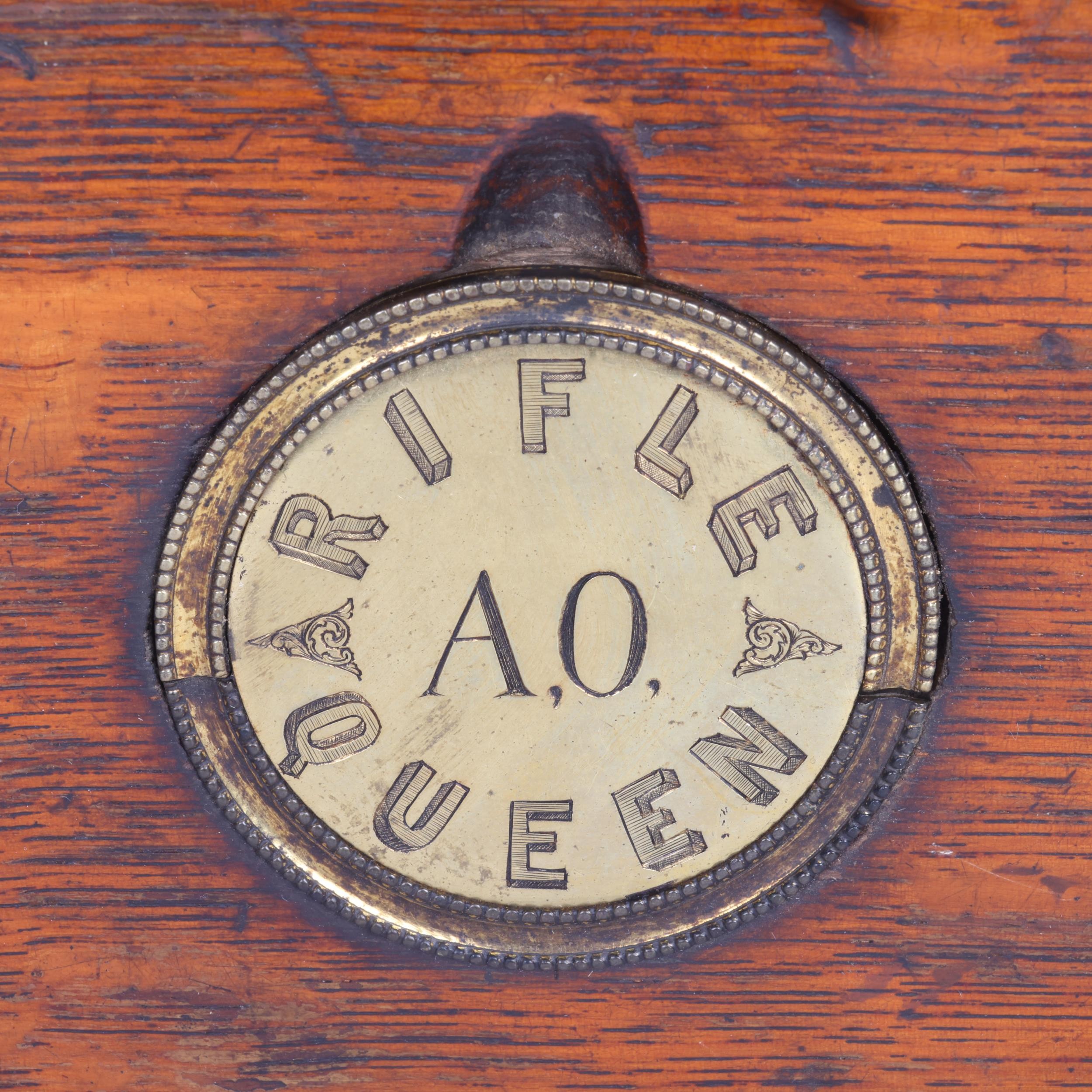The gun is accompanied by its original mahogany carrying case, which bears a brass plaque on the cover, inscribed "Rifle Queen" centred with the initials "A.O.". The case with original William Tompson of Birmingham Patent lock. The interior with re-fitted green baize lining and later plaque.