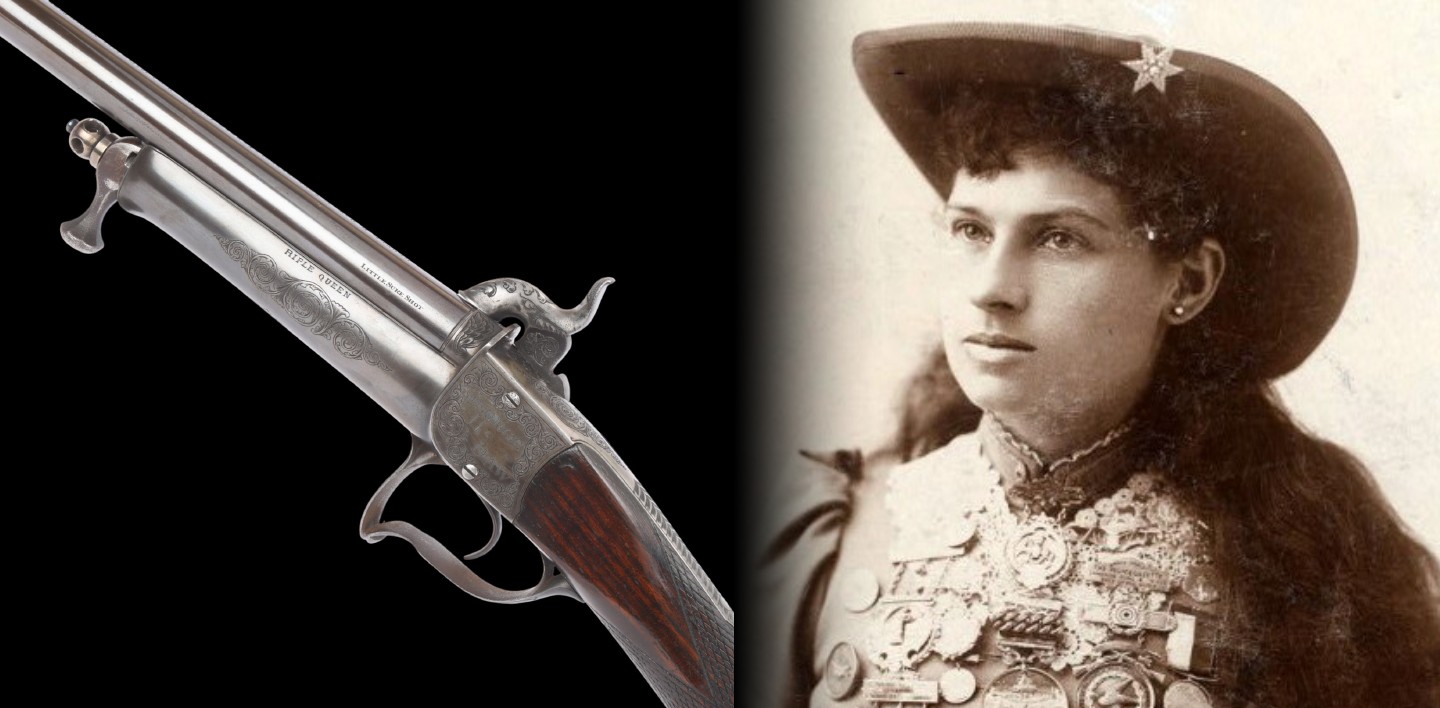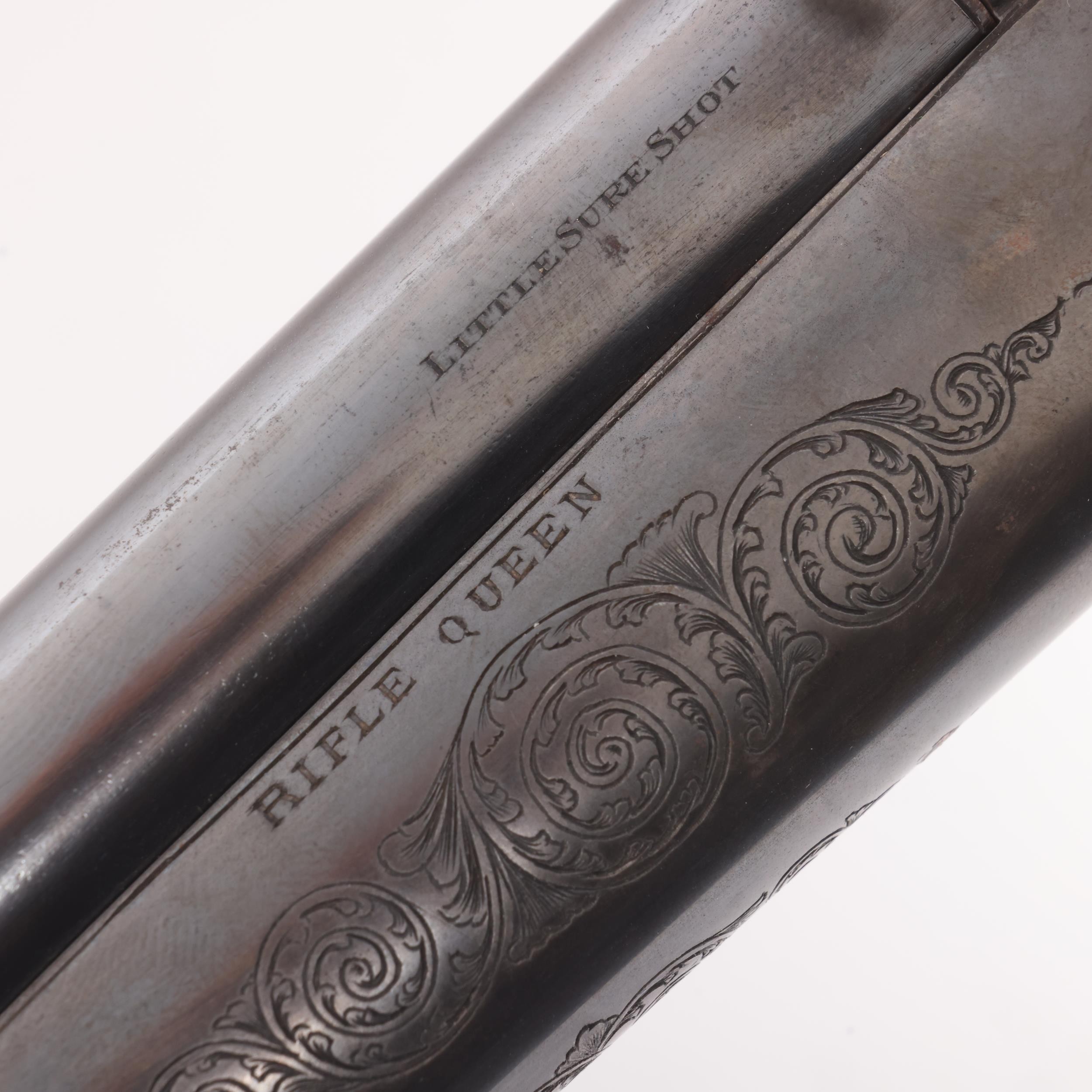 Crafted in the late 19th Century, this George Henry Daw 408 Pin-Fire Smooth Bore Target Gun with original factory engraving and revolutionary cartridge ejection mechanism was made for the legendary female target sharpshooter, Annie Oakley (Phoebe Ann Mosey, 1860-1926). Profusely engraved with references to Oakley and constructed to suit a smaller stature, this gun was intended to be for the Rifle Queen.