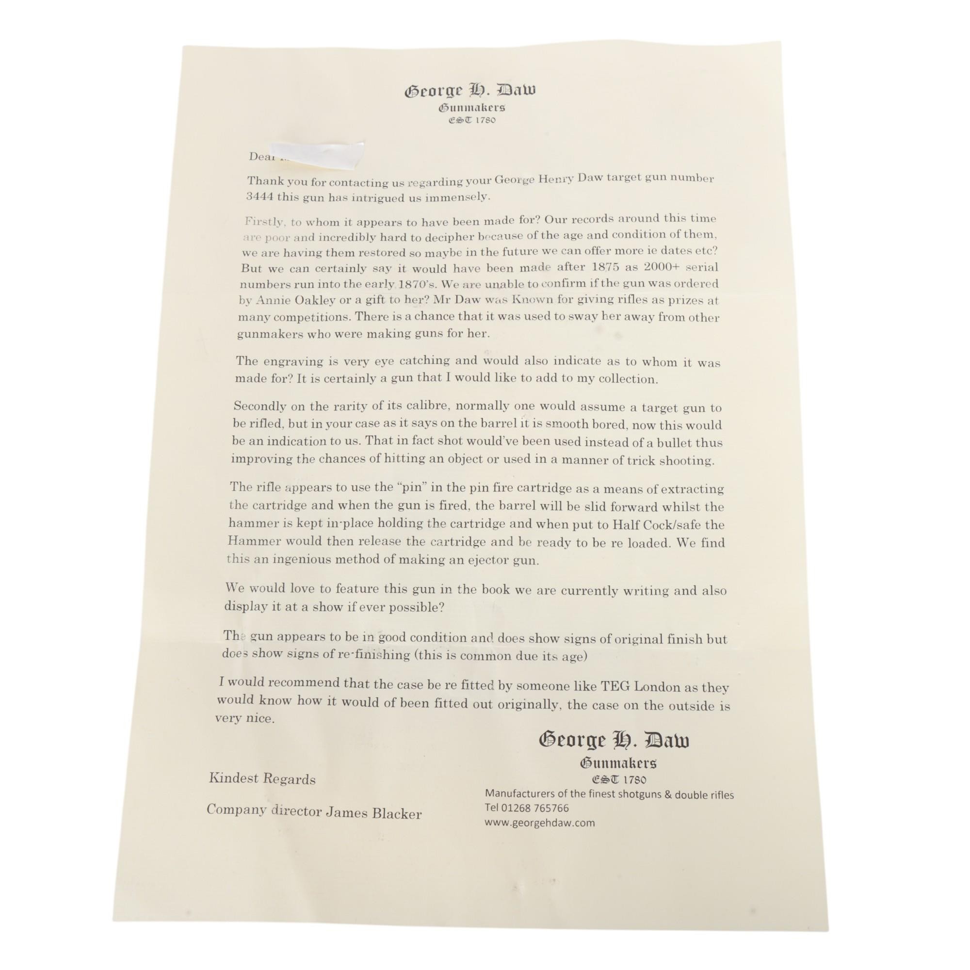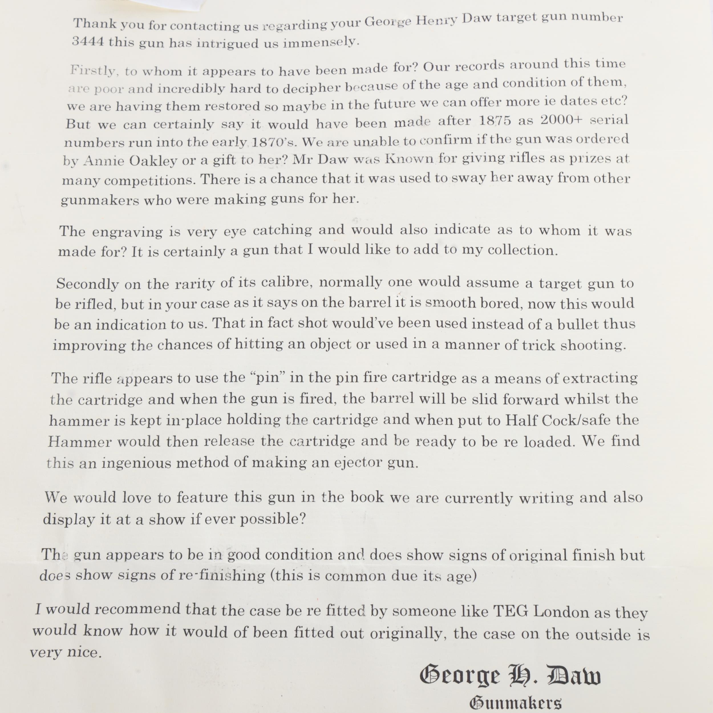 Additionally, a letter from George H. Daw Gunmakers is included regarding the gun, with some prior research and comments.