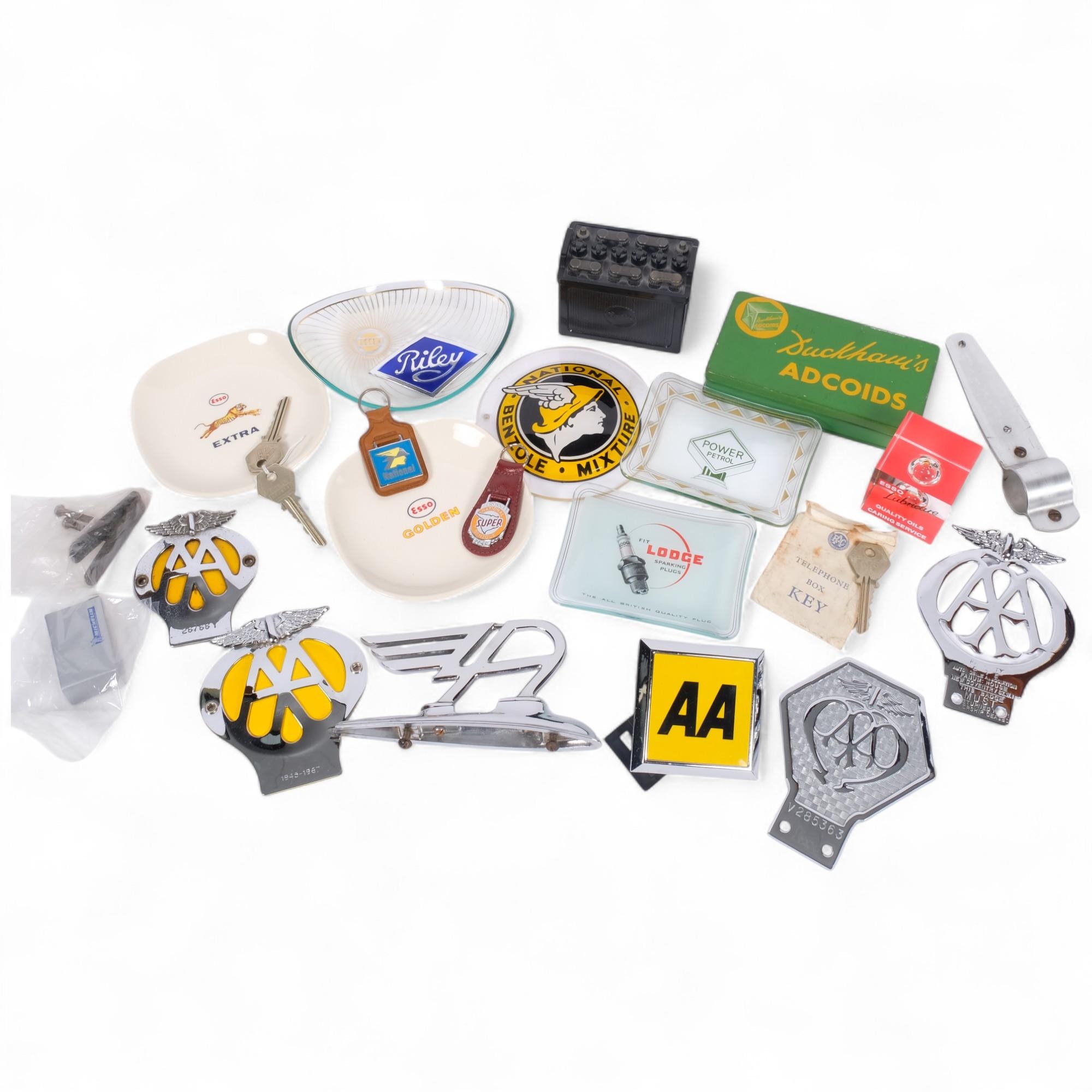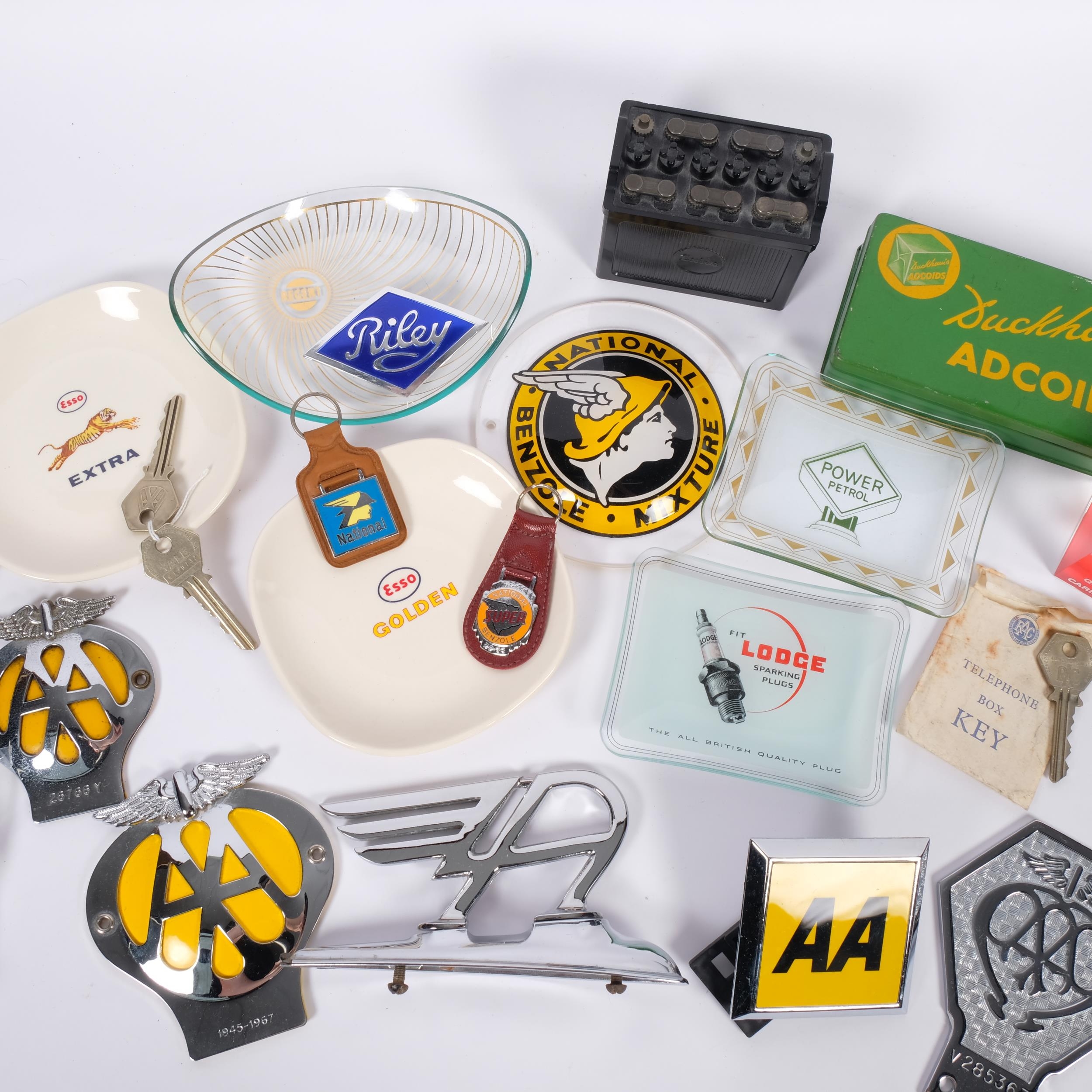 A collection of Vintage and modern motoring memorabilia, to include Esso side plates, AA badges, dishes, and keys, etc
