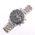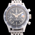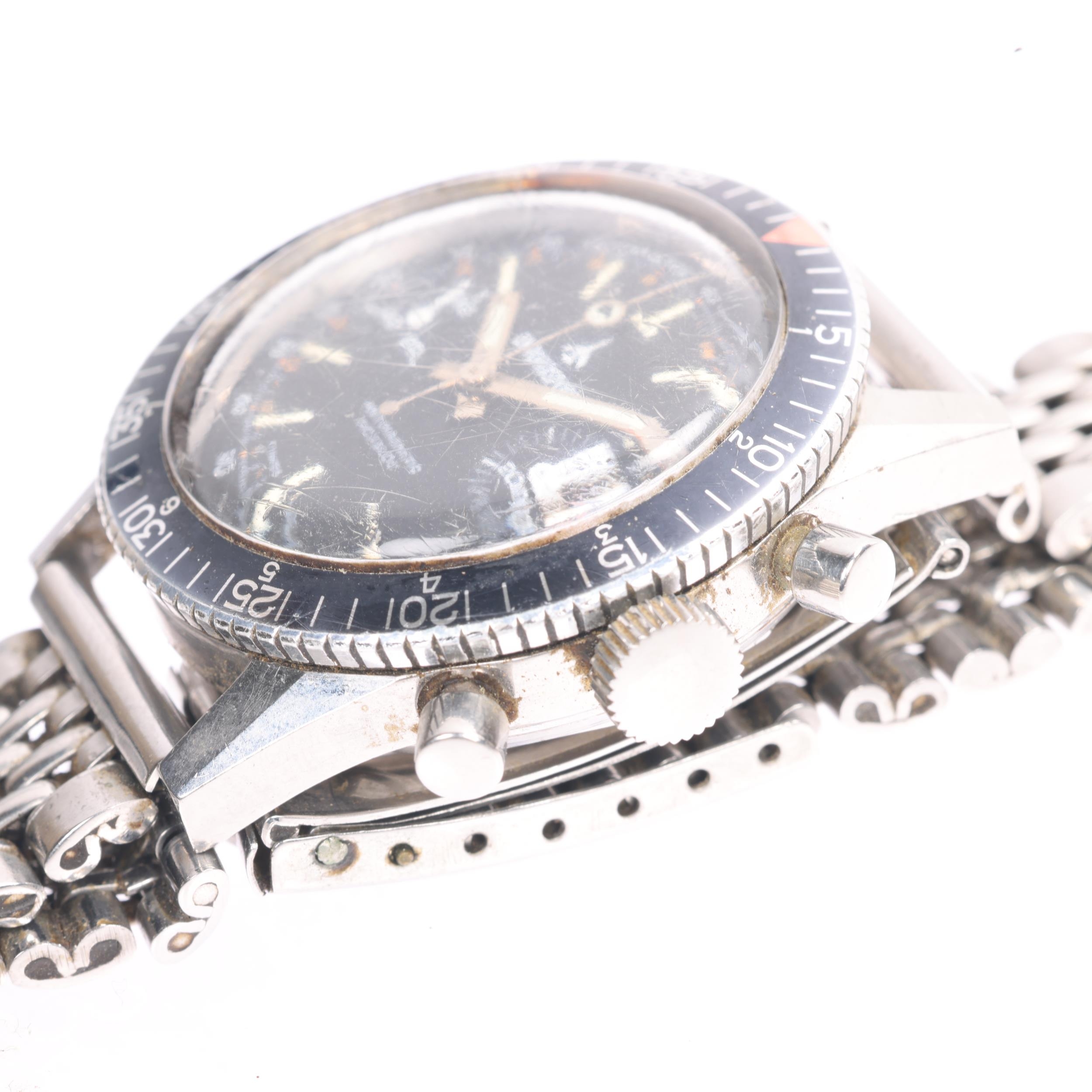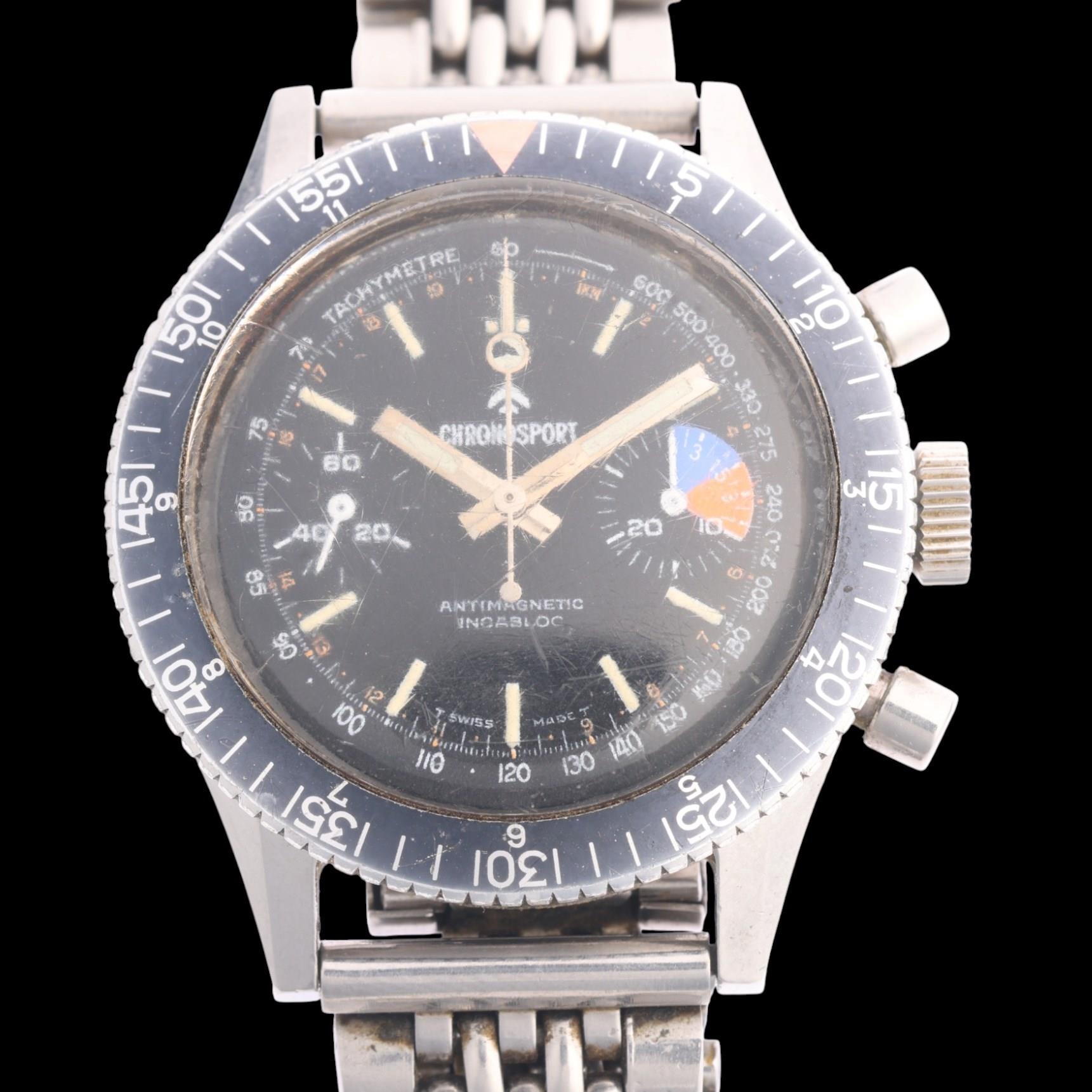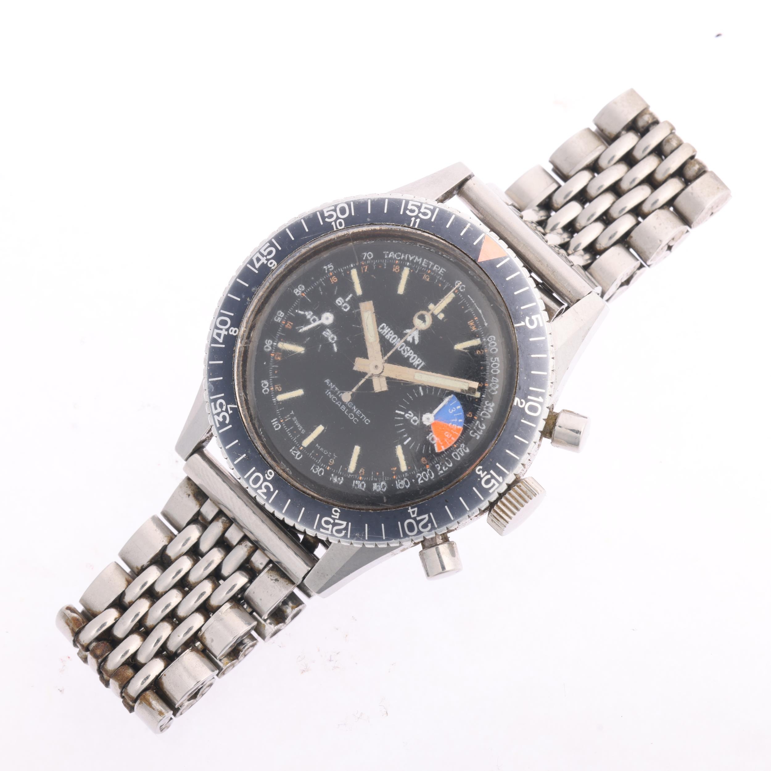 CHRONOSPORT - a Vintage stainless steel Diver's mechanical chronograph bracelet watch, circa 1970s, black dial with luminous baton hour markers, baton hands with luminous inserts, 2 subsidiary dials and black rotating bezel 17 jewel movement with Valjoux calibre 7733, case width 39mm, working order