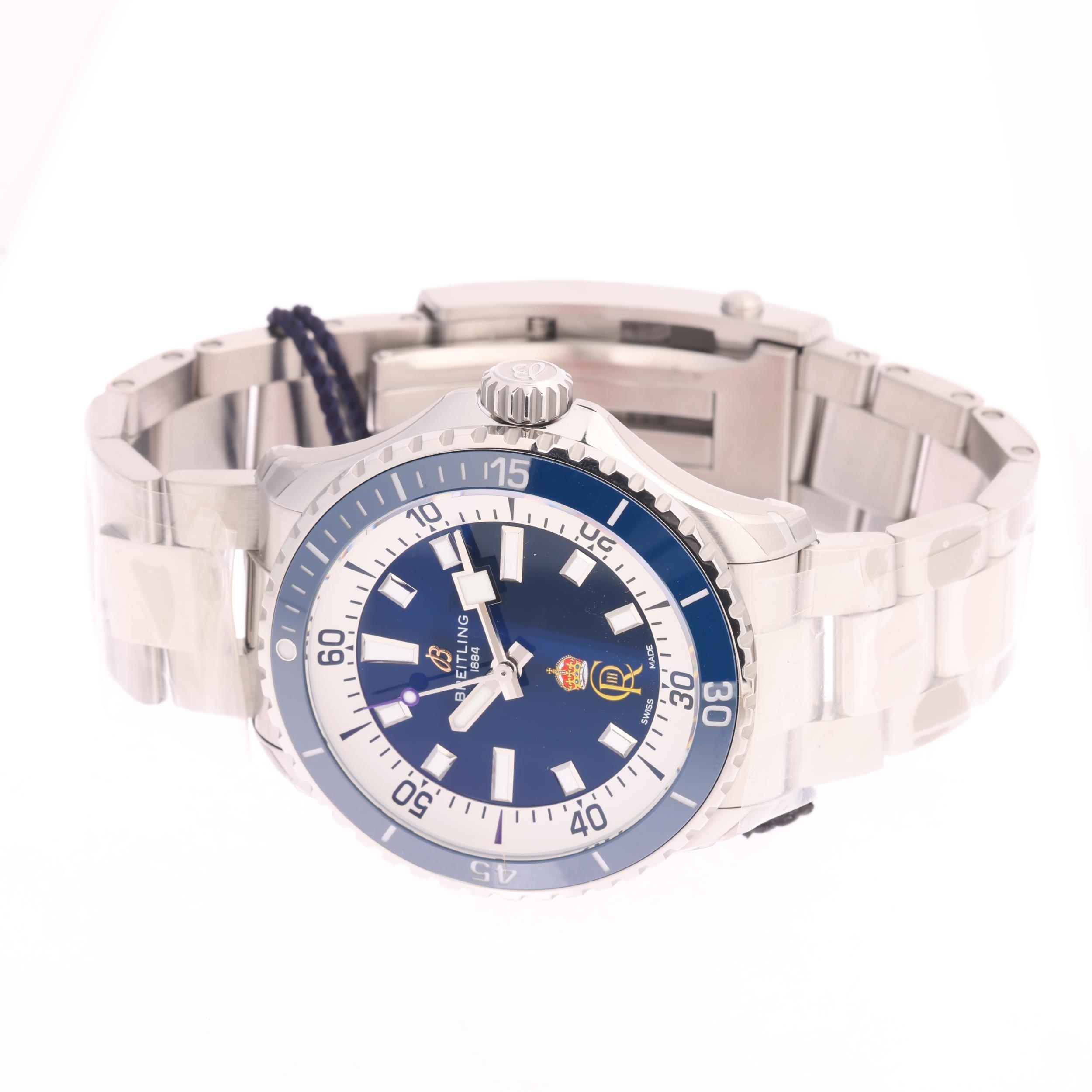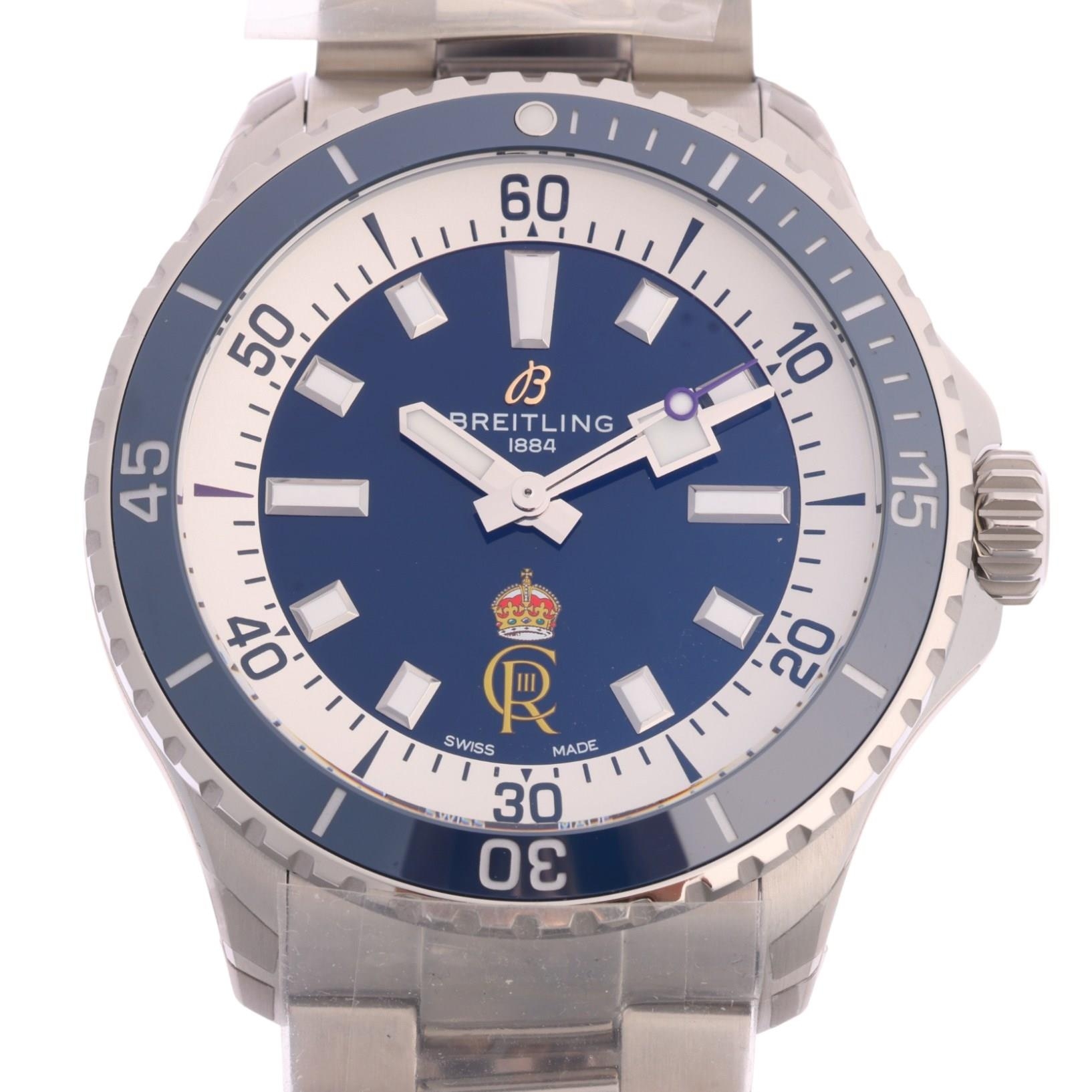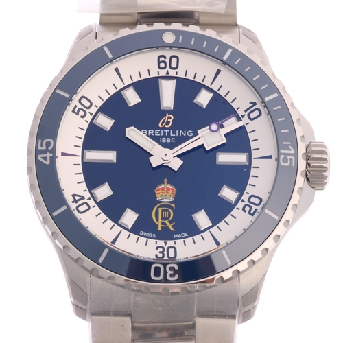BREITLING - a rare limited edition stainless steel SuperOcean 42 'King Charles III Coronation RaSP' automatic bracelet watch, made for the Royalty & Specialist Protection Unit, ref. A173754A1C1A1, purchased in 2024, blue dial with King Charles III Crowned Cypher, luminous baton hour markers, silvered outer minute divisions, luminous polished hands, sweep centre seconds hand, blue ceramic calibrated bezel insert with presentation engraving on caseback 'King Charles III Coronation, 6th May 2023', the personal warrant number, limited edition no. 120/189, on Breitling brushed and polished stainless steel bracelet with signed folding clasp, serial no. 6817738, 26 jewel movement with calibre Breitling 17, case width 42mm, working order, boxed with papers