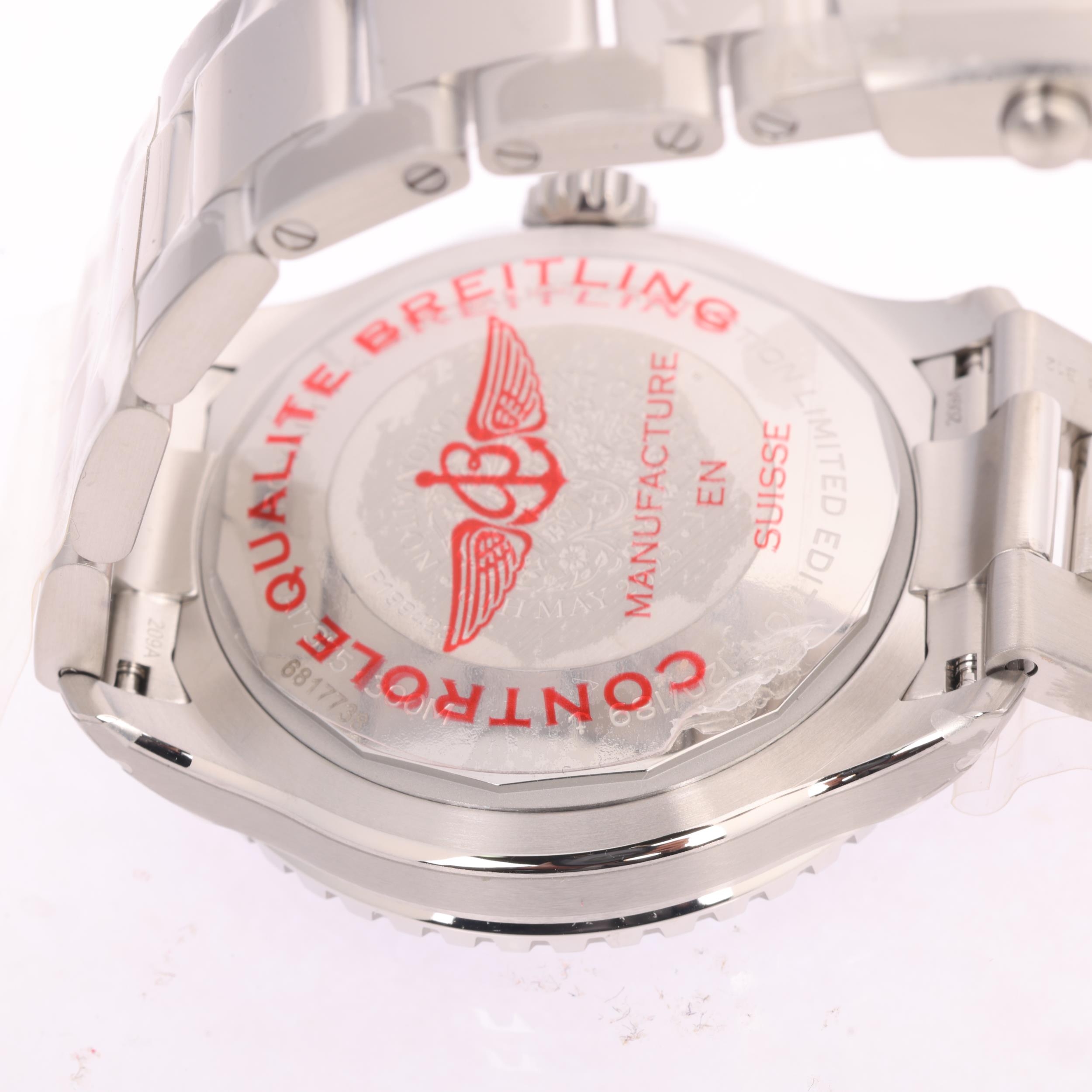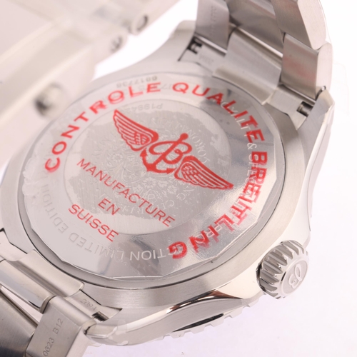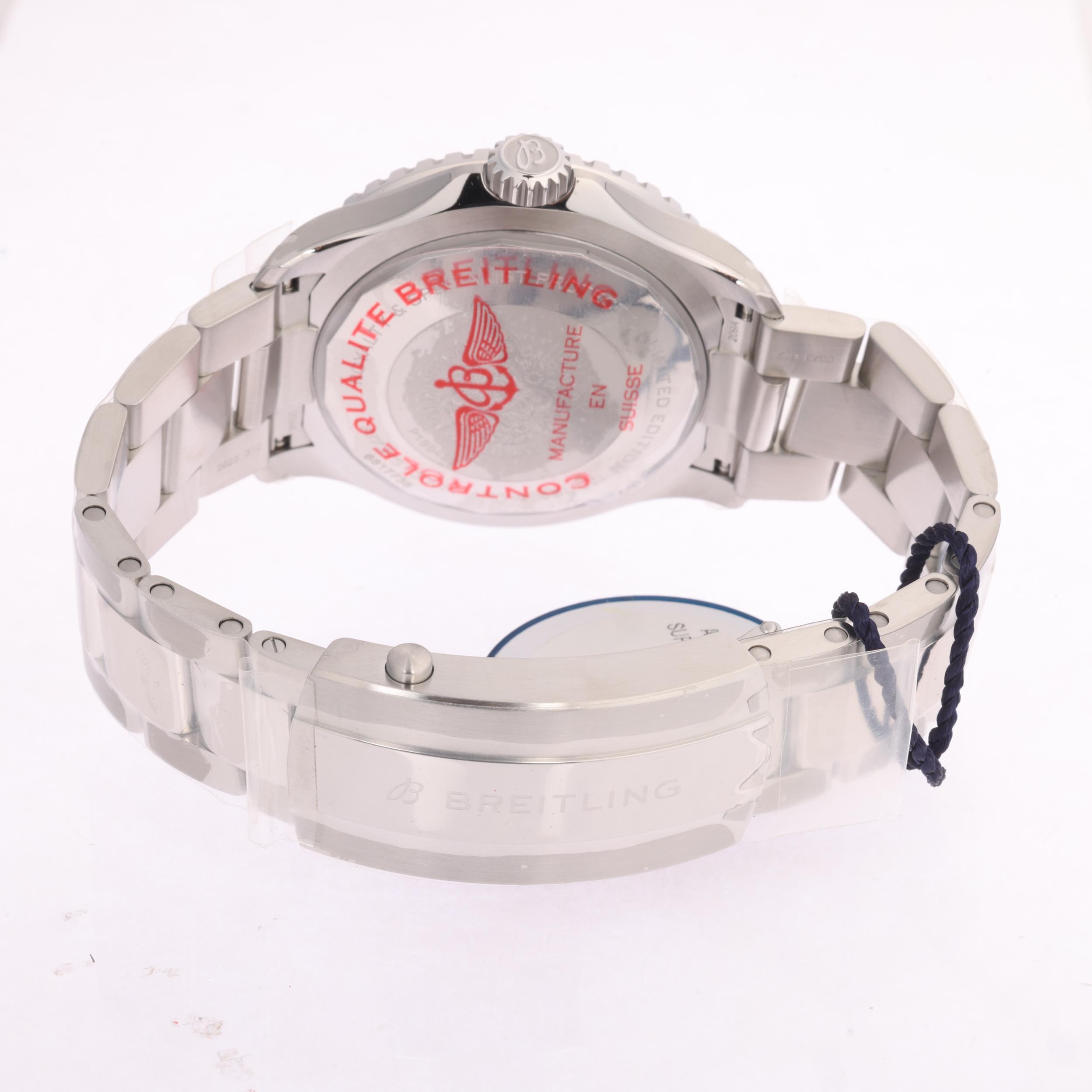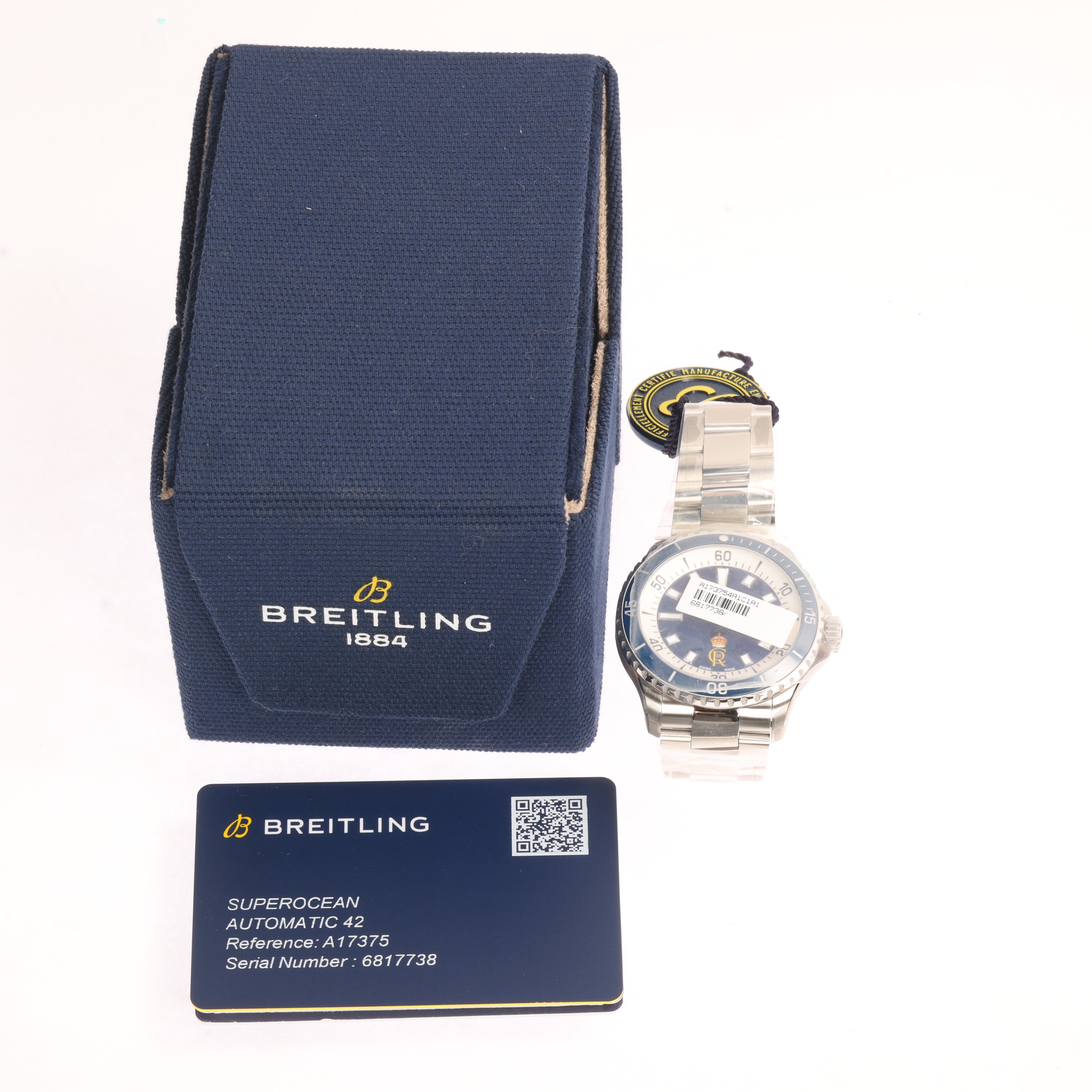 BREITLING - a rare limited edition stainless steel SuperOcean 42 'King Charles III Coronation RaSP' automatic bracelet watch, made for the Royalty & Specialist Protection Unit, ref. A173754A1C1A1, purchased in 2024, blue dial with King Charles III Crowned Cypher, luminous baton hour markers, silvered outer minute divisions, luminous polished hands, sweep centre seconds hand, blue ceramic calibrated bezel insert with presentation engraving on caseback 'King Charles III Coronation, 6th May 2023', the personal warrant number, limited edition no. 120/189, on Breitling brushed and polished stainless steel bracelet with signed folding clasp, serial no. 6817738, 26 jewel movement with calibre Breitling 17, case width 42mm, working order, boxed with papers