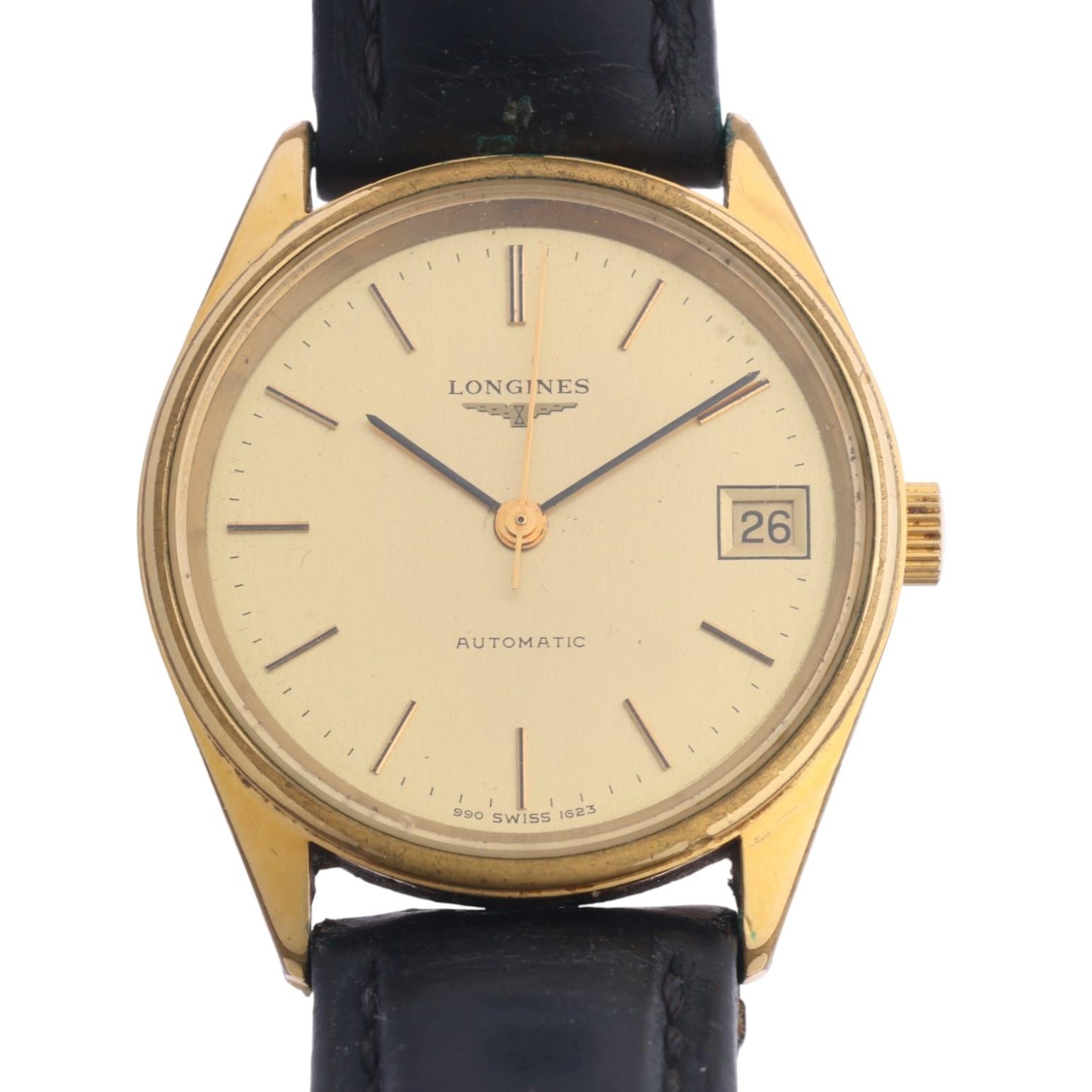 LONGINES - a Vintage gold plated stainless steel automatic calendar wristwatch, ref. 1623-1, circa 1979, champagne dial with gilt baton hour markers, black pencil hands, sweep centre seconds hand and date aperture, 25 jewel movement with calibre L990.1, serial no. 54484416, case width 33mm, working order
