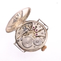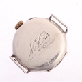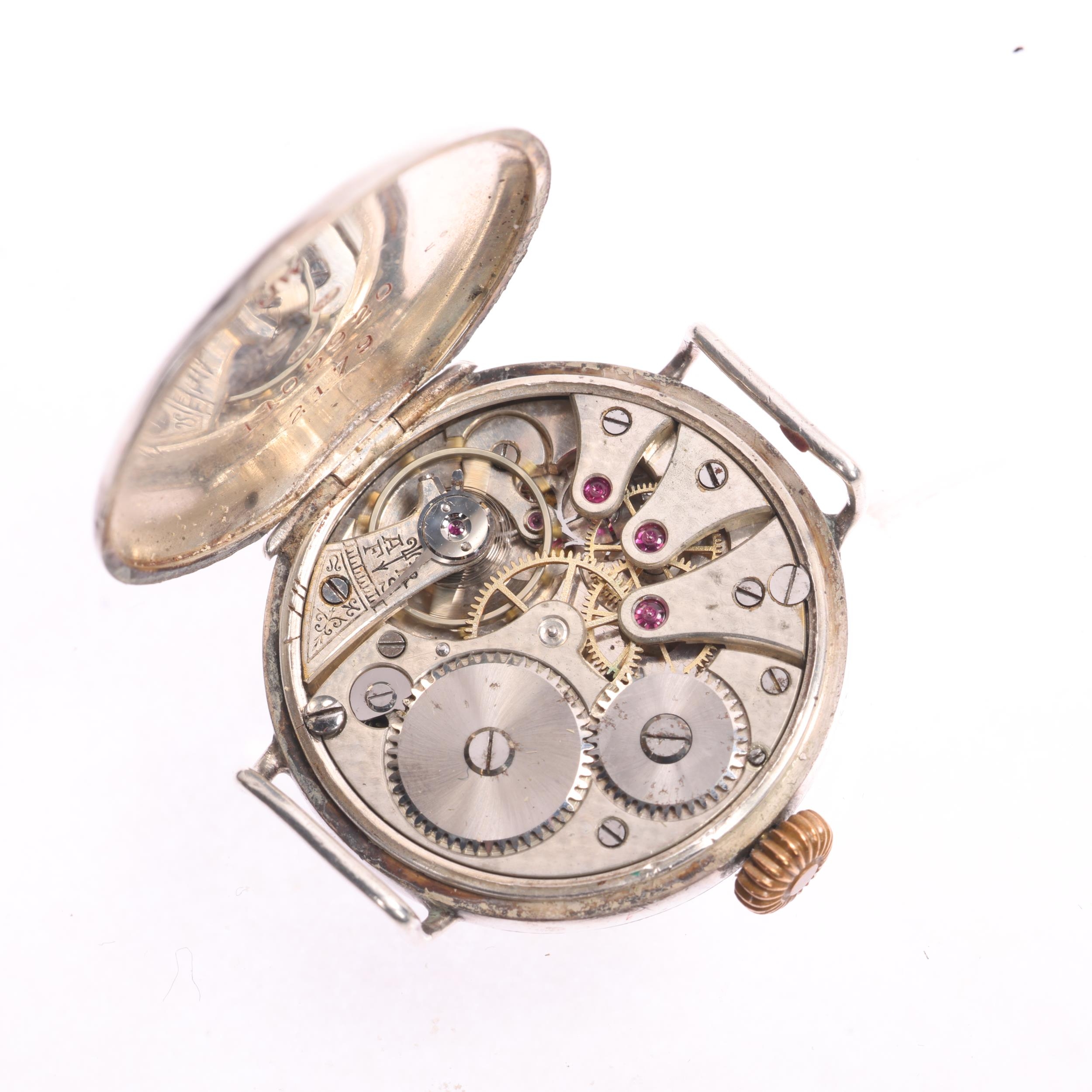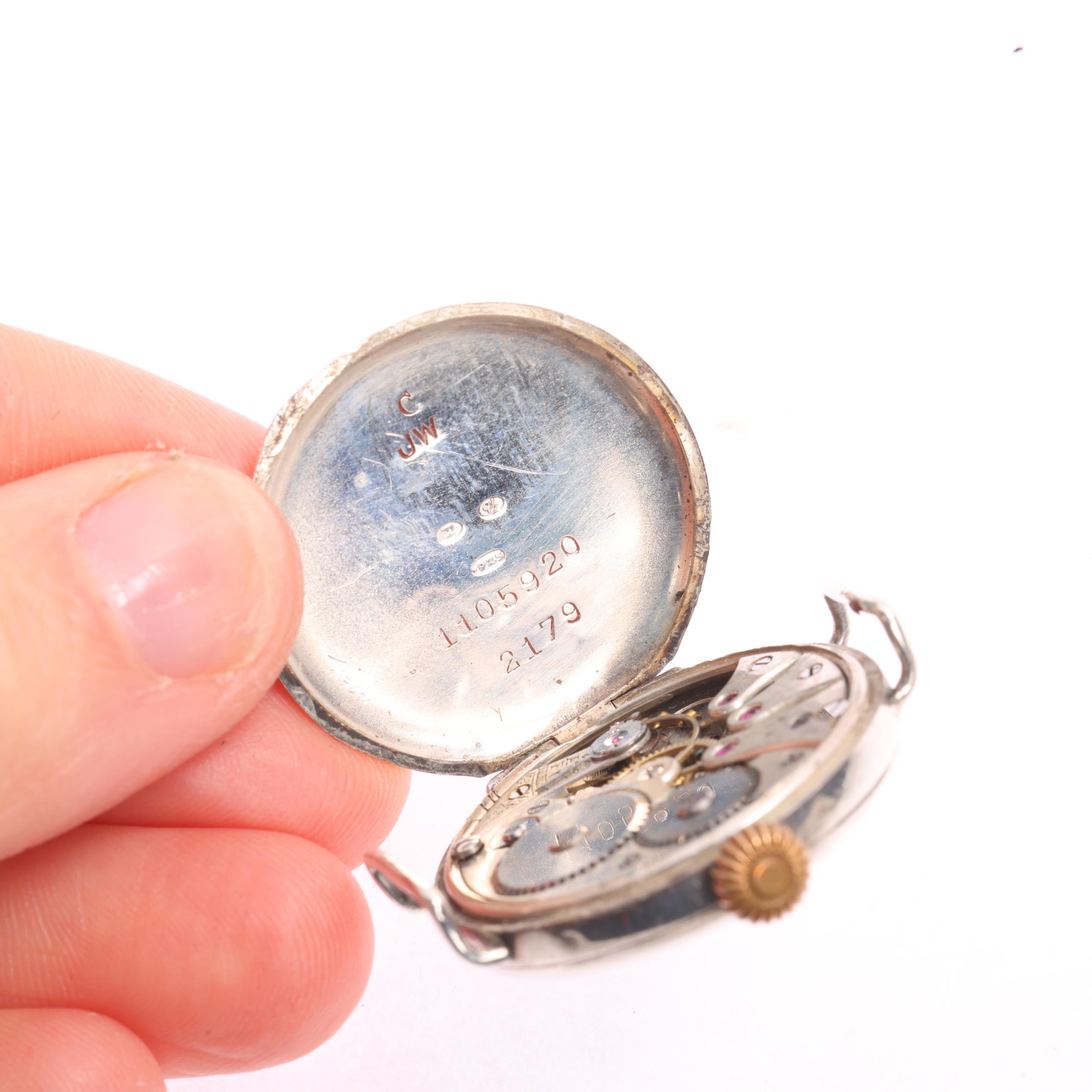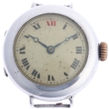 A First World War Period sterling silver Officer's style trench mechanical wristwatch head, silvered dial with black and red Roman numeral hour markers, blued steel Breguet hands and wire lugs, import hallmarks Glasgow 1917, case no. 1105920, case width 28mm, working order