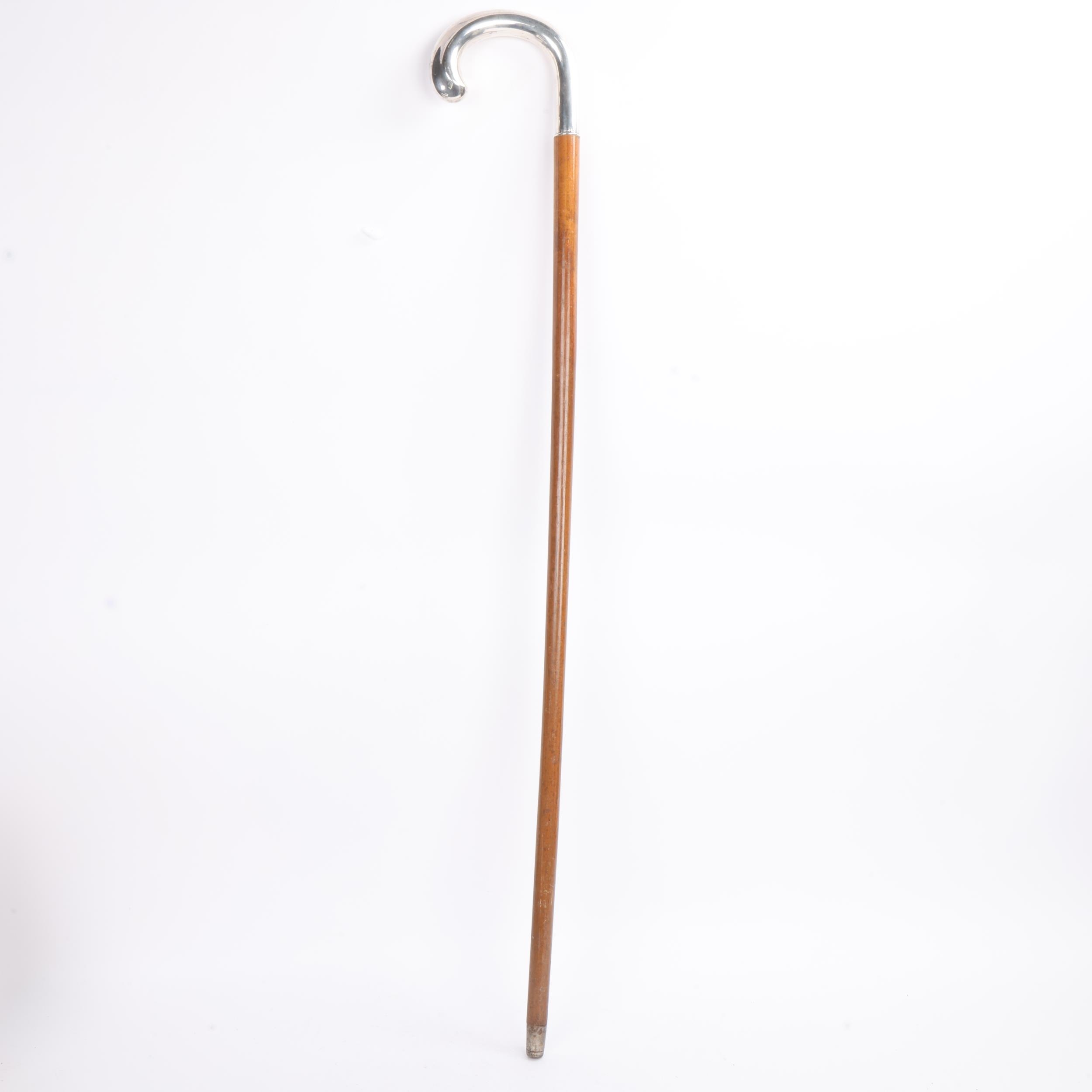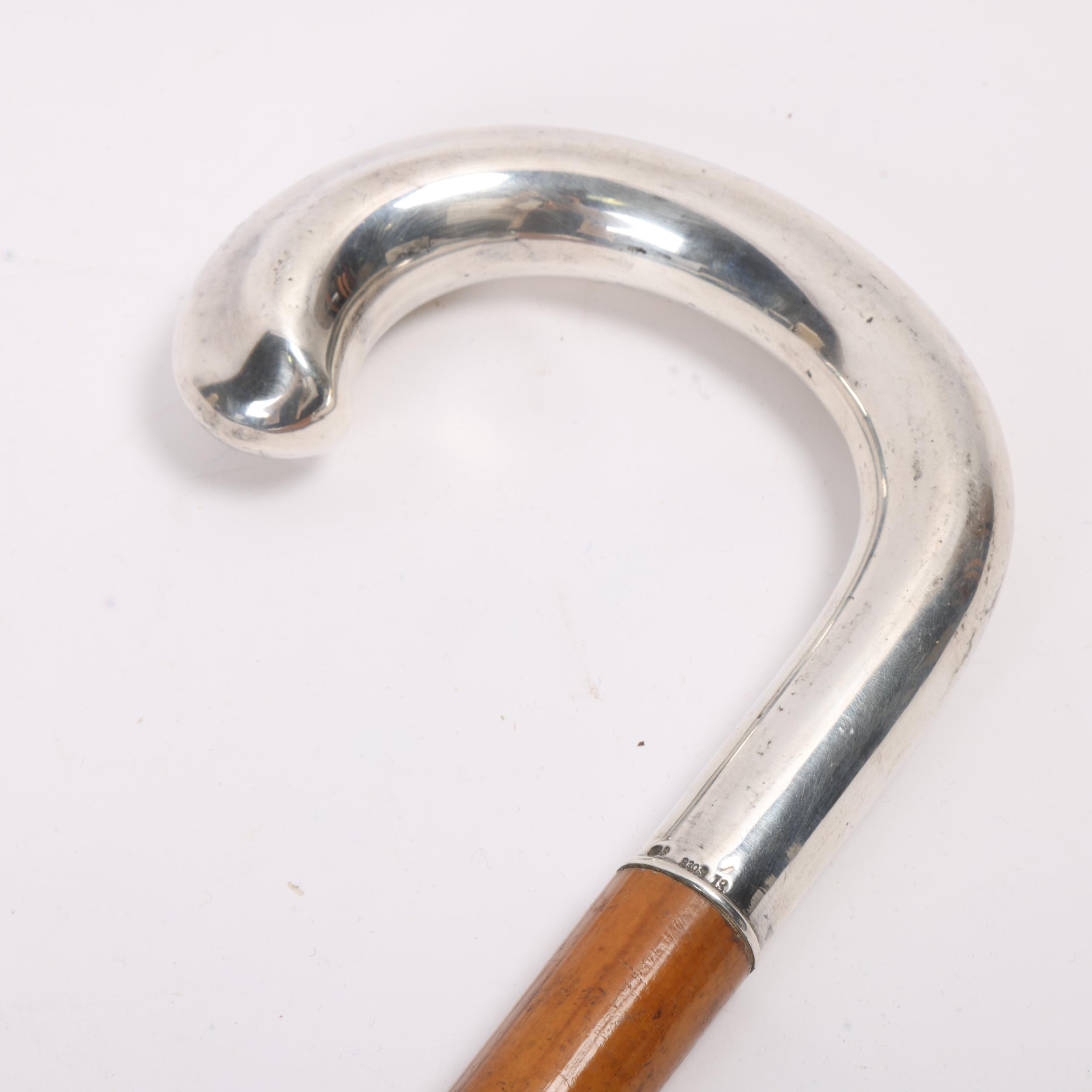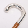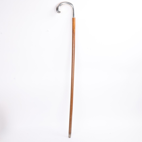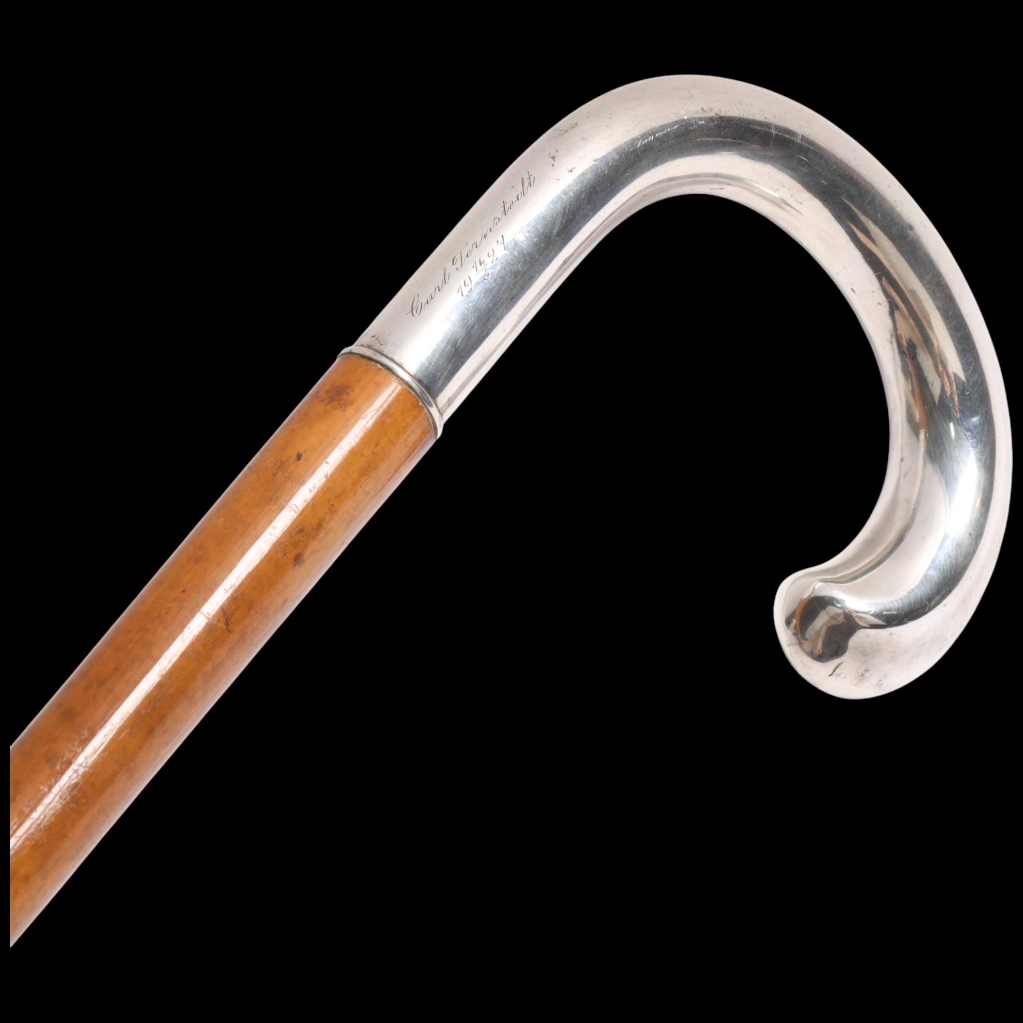A Swedish silver crook handle cane with an elegant, fluted Art Nouveau terminal, handle HM with three crowns in trefoil (Sweden), S (sterling silver) and stamped 830S 13, the side of the handle near the base with dedication "Carl Ternstedt 14.3.1924", malacca shaft, metal ferrule, Swedish, 1924, length 90cm