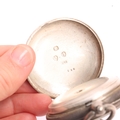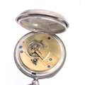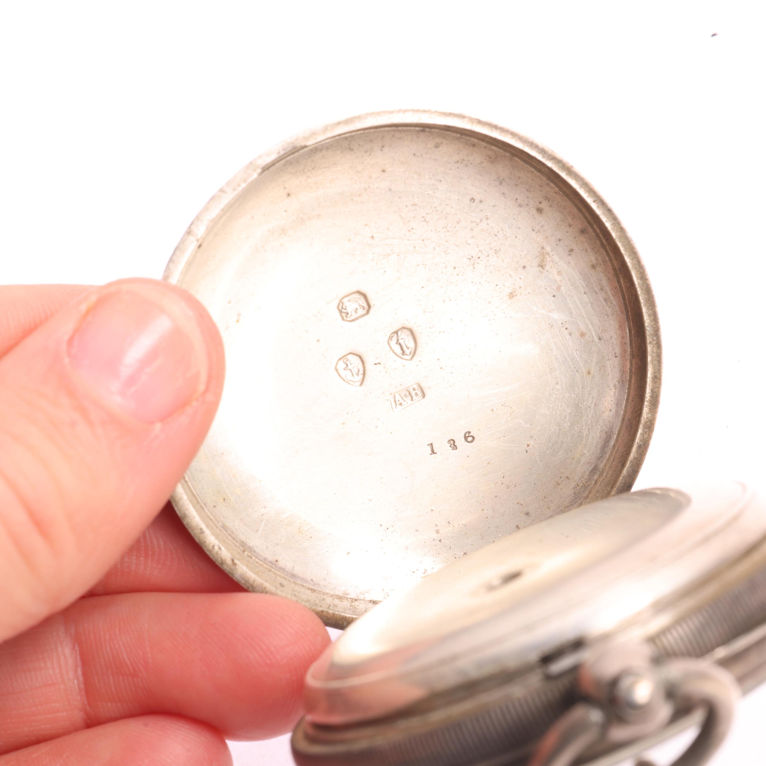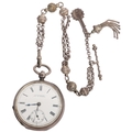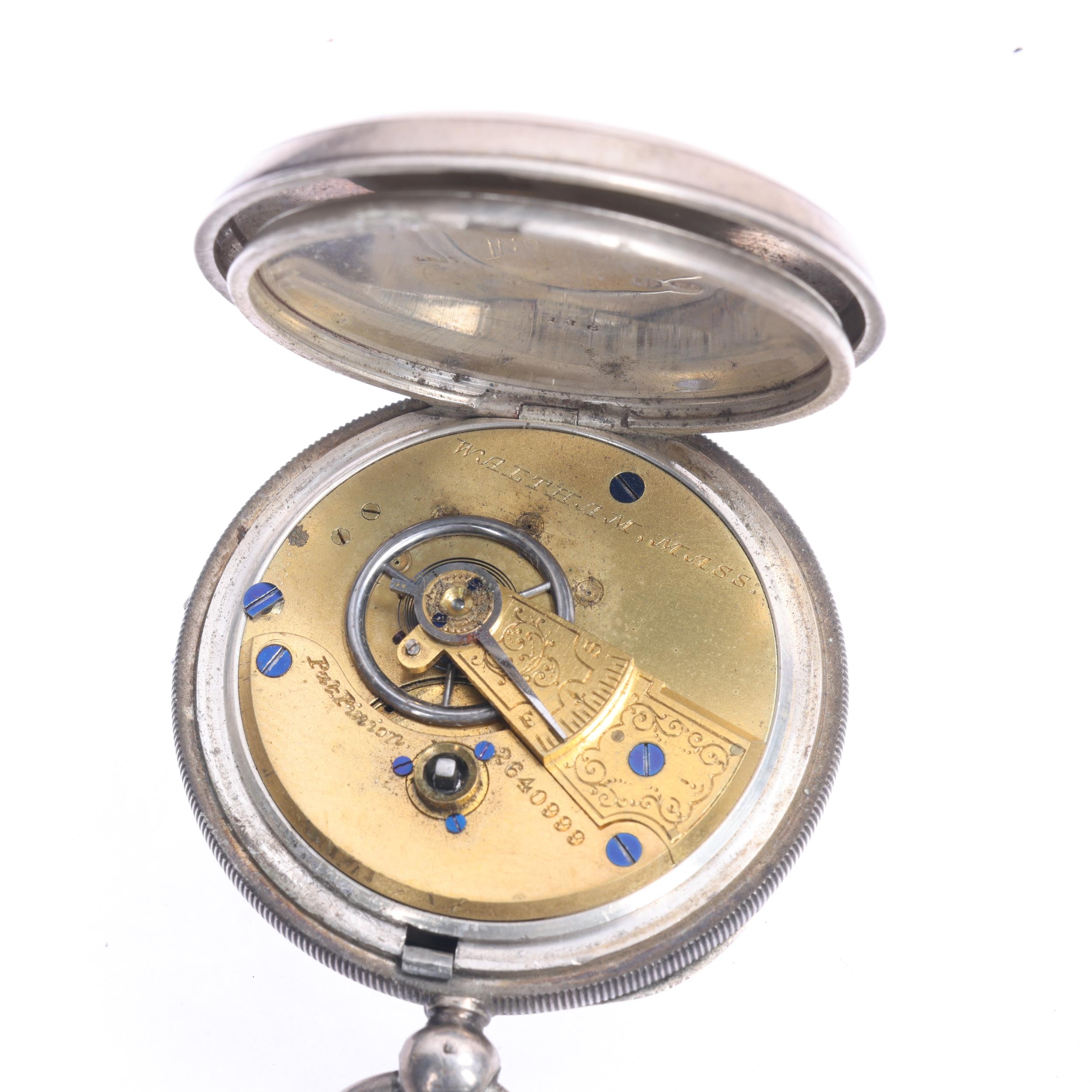 WALTHAM - a 19th century silver open-face key-wind pocket watch, retailed by J N Masters of Rye and Romney, white enamel dial with black Roman numeral hour markers, blued steel spade hands, subsidiary seconds dial, engine turned caseback and silver dust cover, movement signed Waltham Mass, with patent pinion, hallmarks Birmingham 1883, movement no. 2640999, case width 49mm, working order, with silver Albertina chain, 24cm