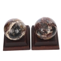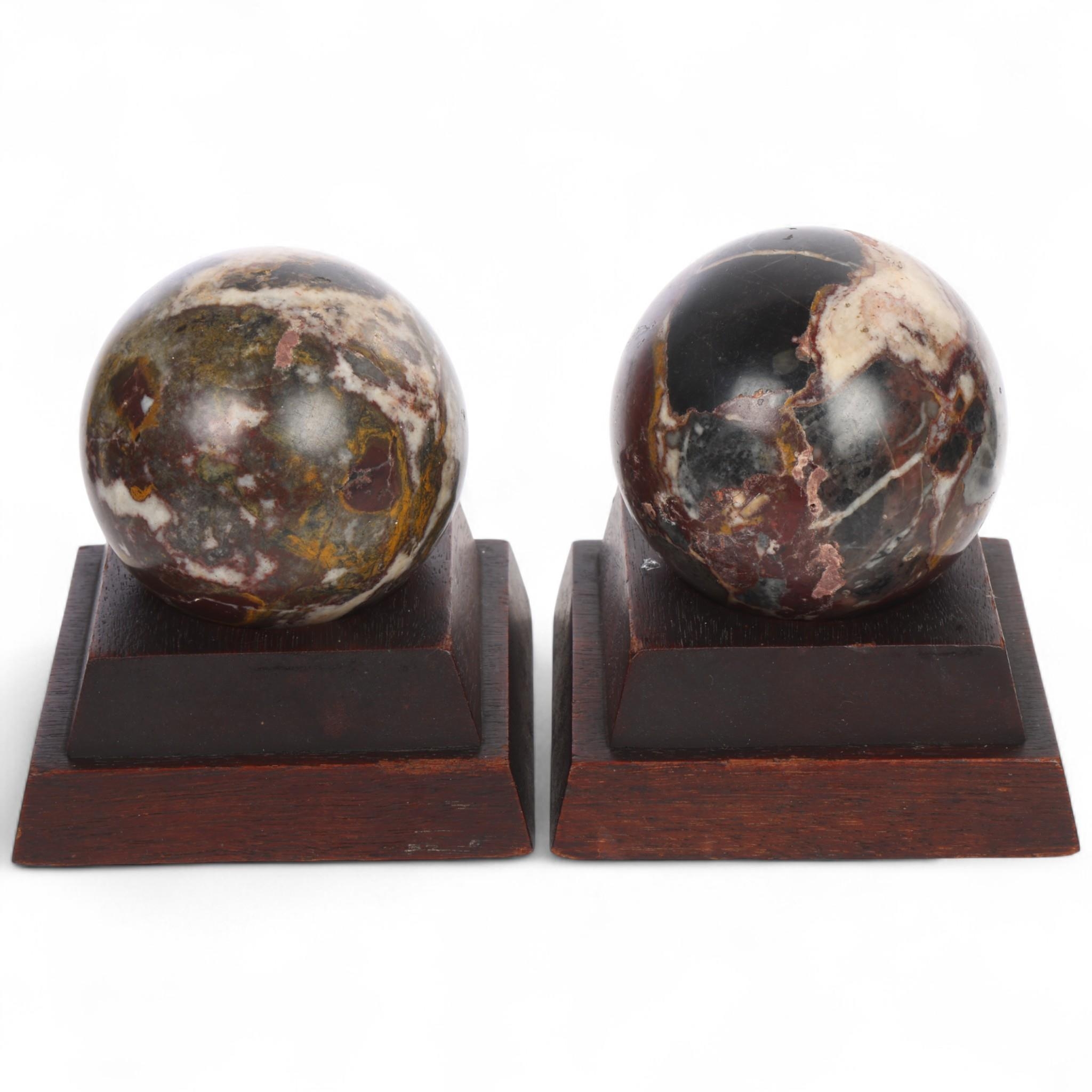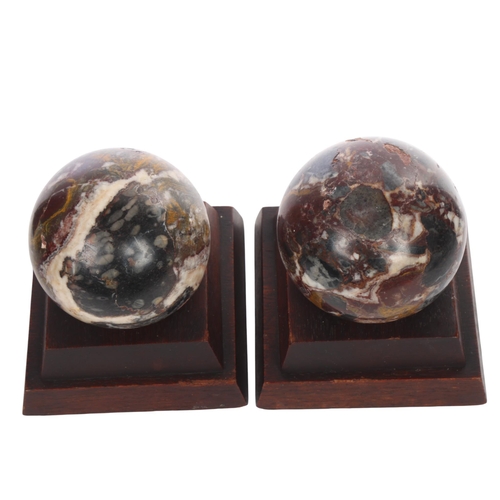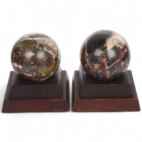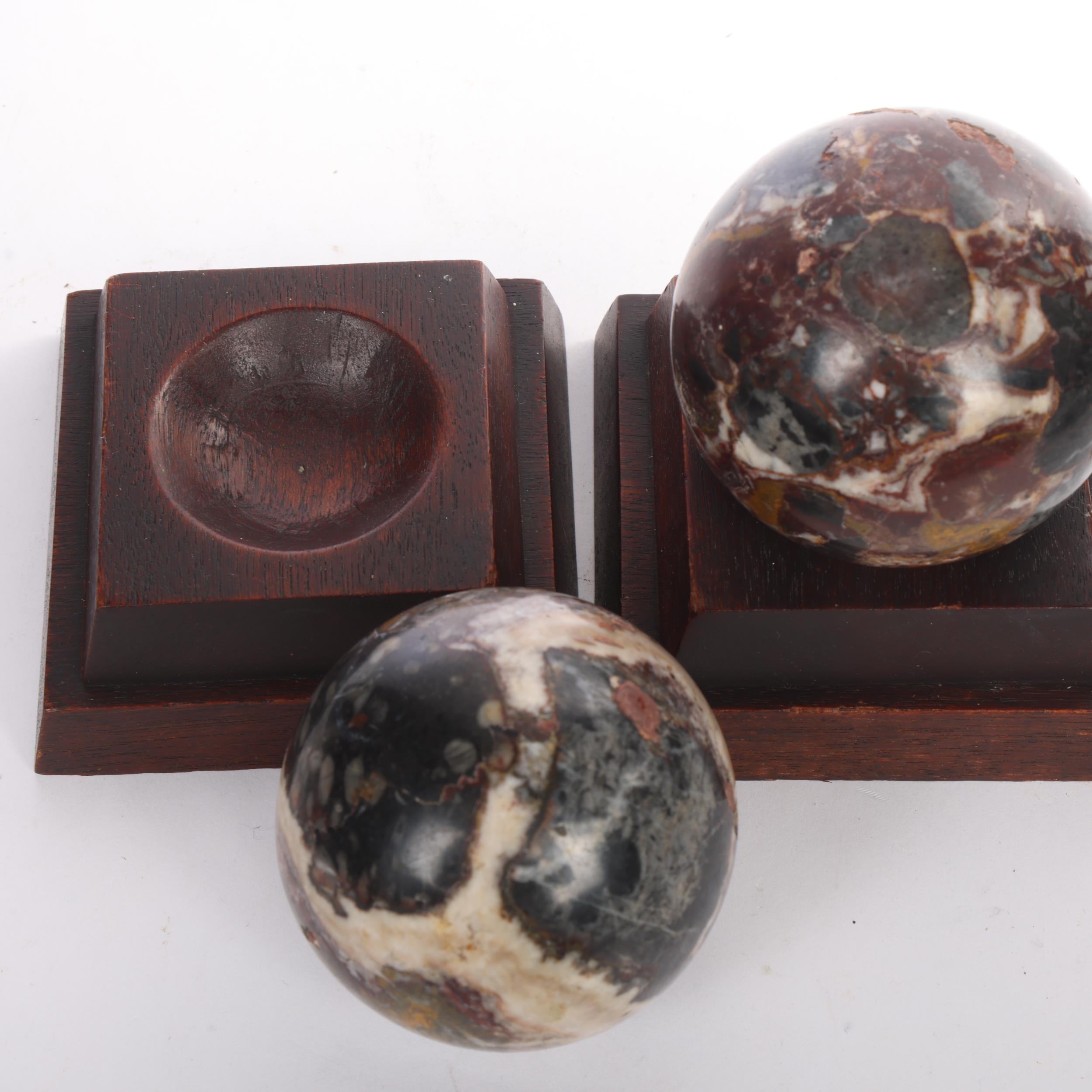 A pair of polished marble ornamental balls on stained wood stands, overall height 10cm