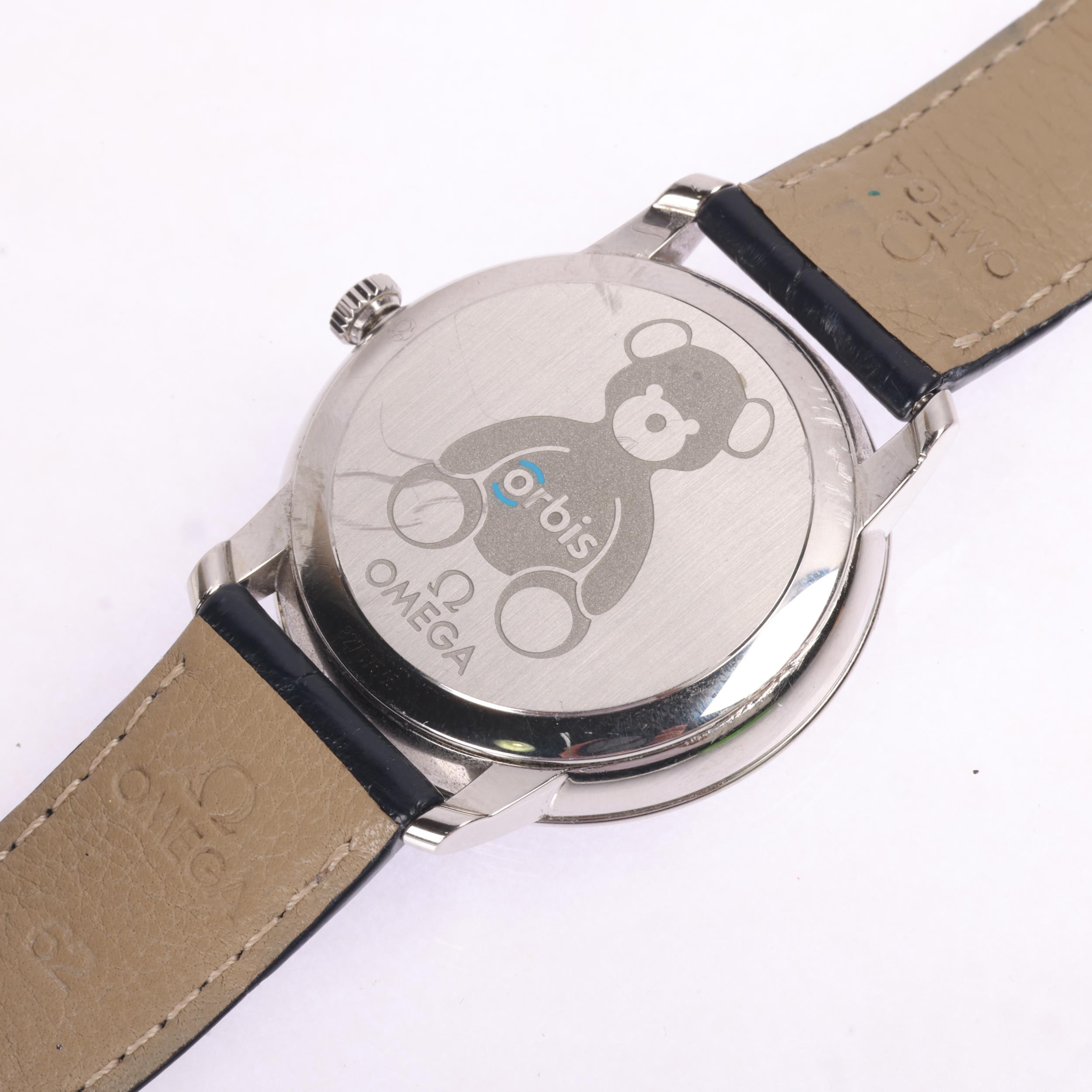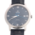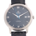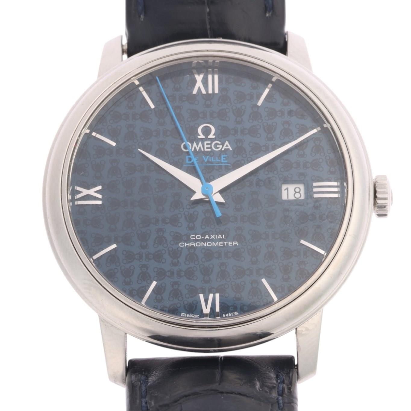 OMEGA - a stainless steel De Ville Prestige 'Orbis' Co-Axial chronometer automatic calendar wristwatch, ref. 424.13.40.20.03.003, lacquered blue dial with Omega teddy bear pattern, polished quarterly Roman numeral hour markers, dauphine hands, blue sweep centre seconds hand and date aperture, 27 jewel movement with calibre 2500, serial no. 82707565, case width 39mm, working order, boxed