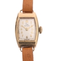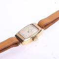 RECORD - a lady's Vintage 9ct gold mechanical wristwatch, circa 1960s, silvered dial with gilt Arabic numerals, leaf hands and 9ct gold case, 17 jewel movement with calibre 601, hallmarks London 1965, case no. 299069, case width 15mm, 9.3g gross, working order