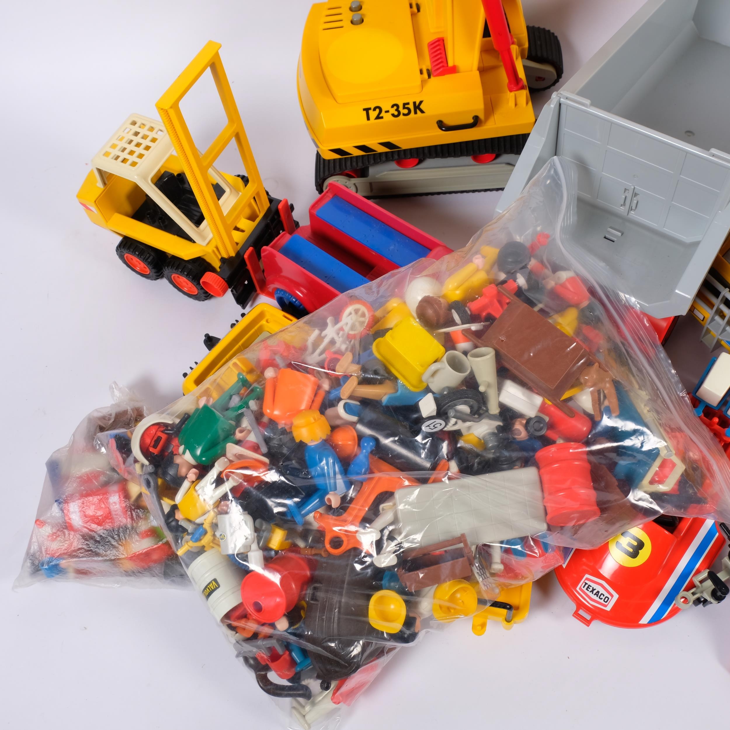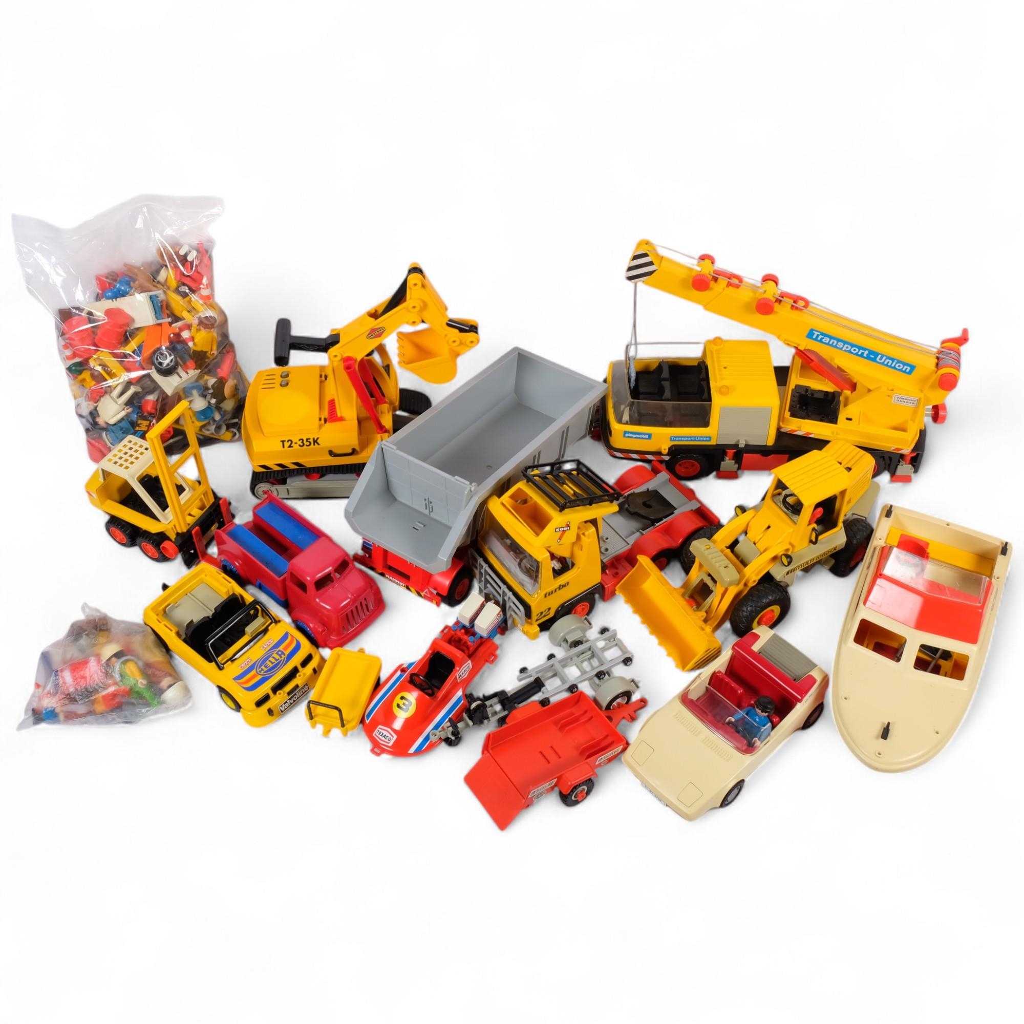 2 boxes containing various Playmobil vehicles, figures and a...