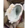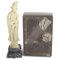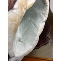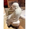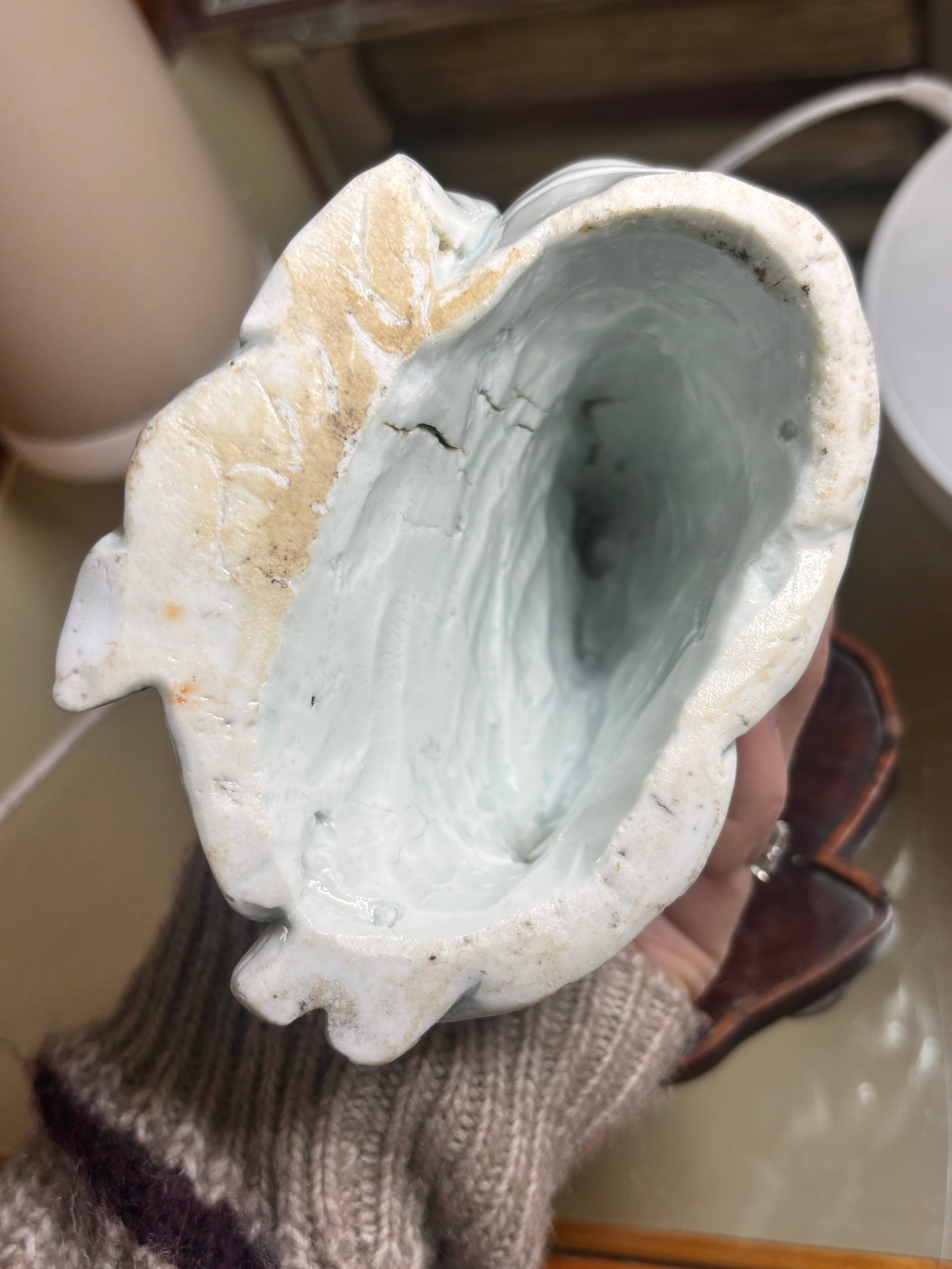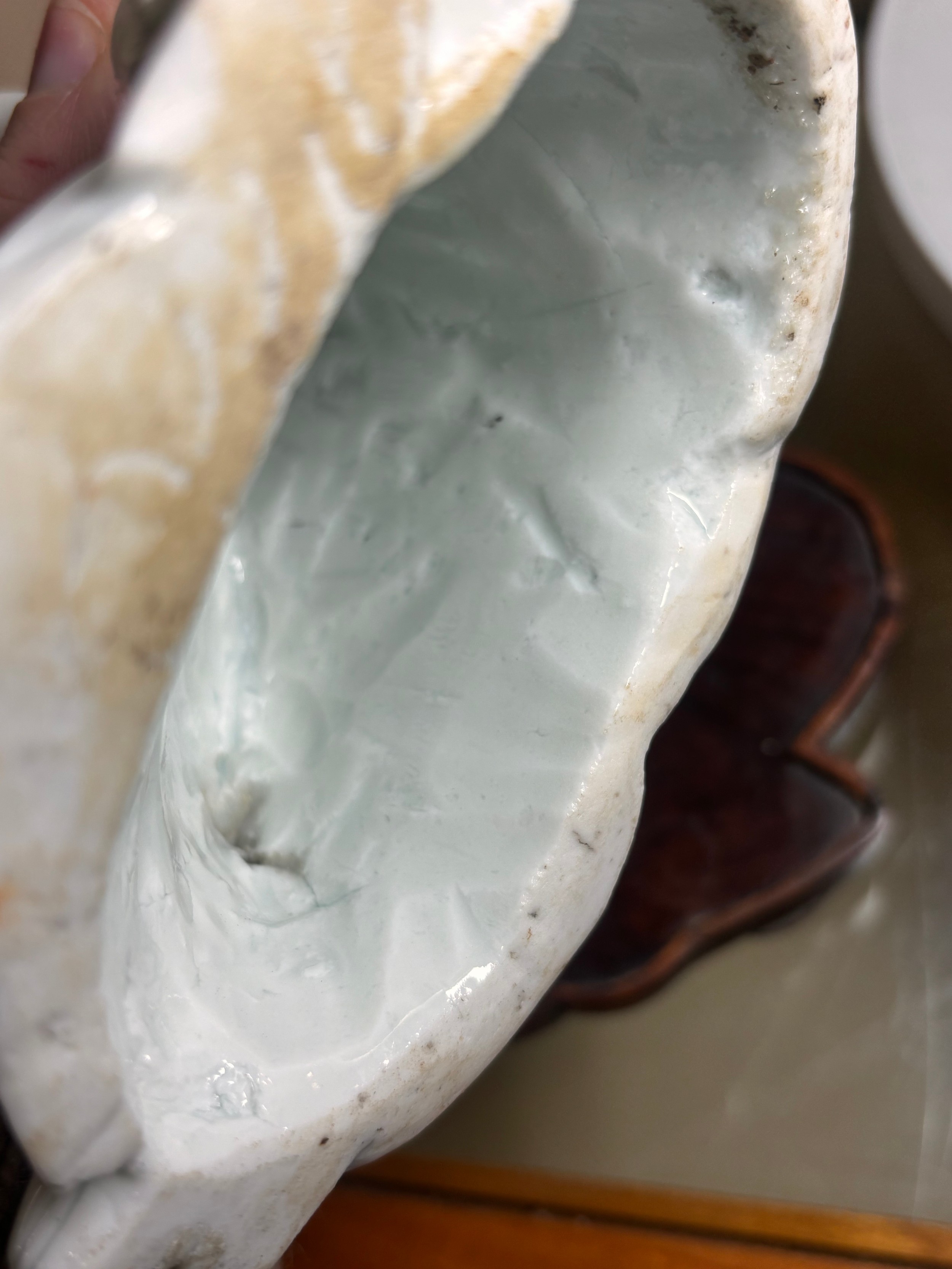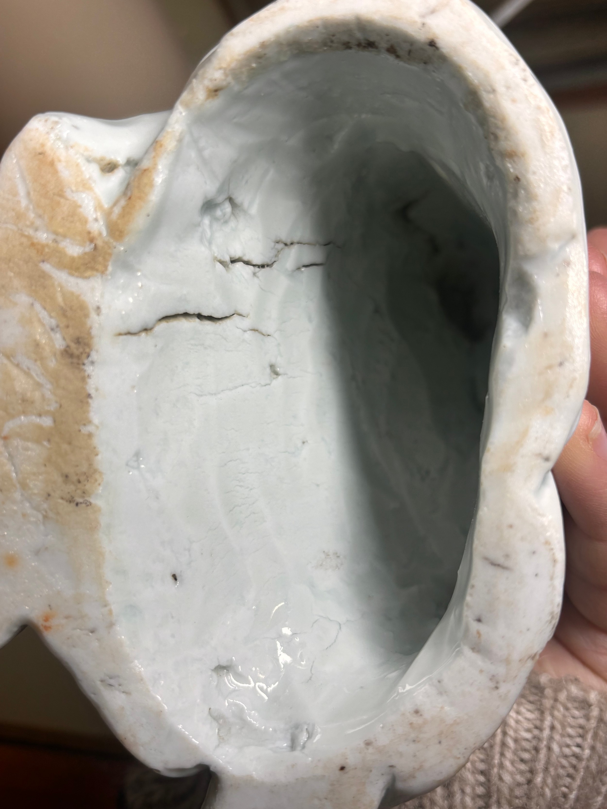 Good condition, some internal cracks from original manufacture, firing spot on head, minor glaze chips at base, no other chips, cracks or restoration. Some pitting of the glaze and surface crack to the glaze on lower left sleeve, probably from manufacture, dirt or minor kiln debris on has collected in the pitted area possibly a chip from glaze that has been polished over. From local deceased estate