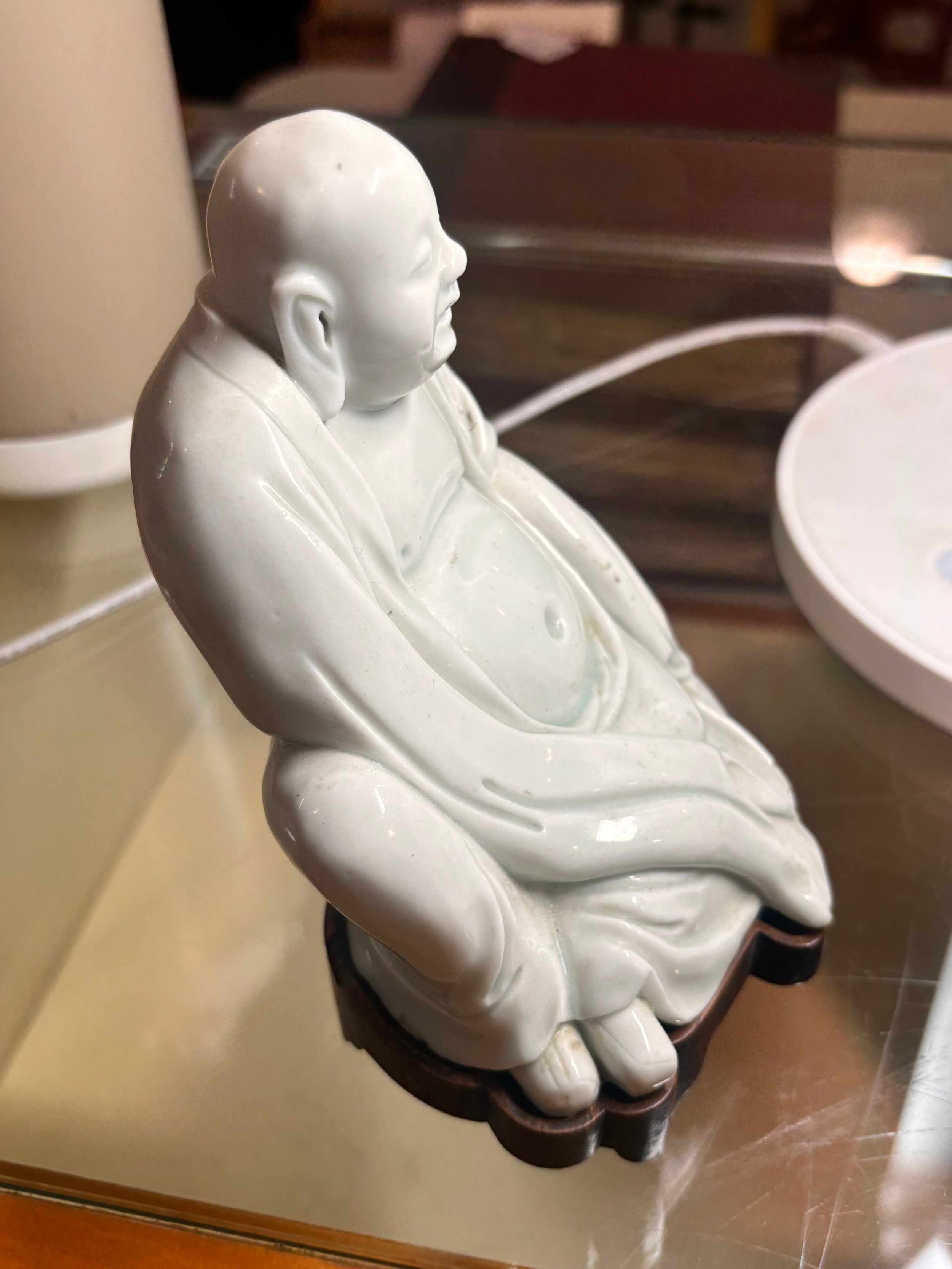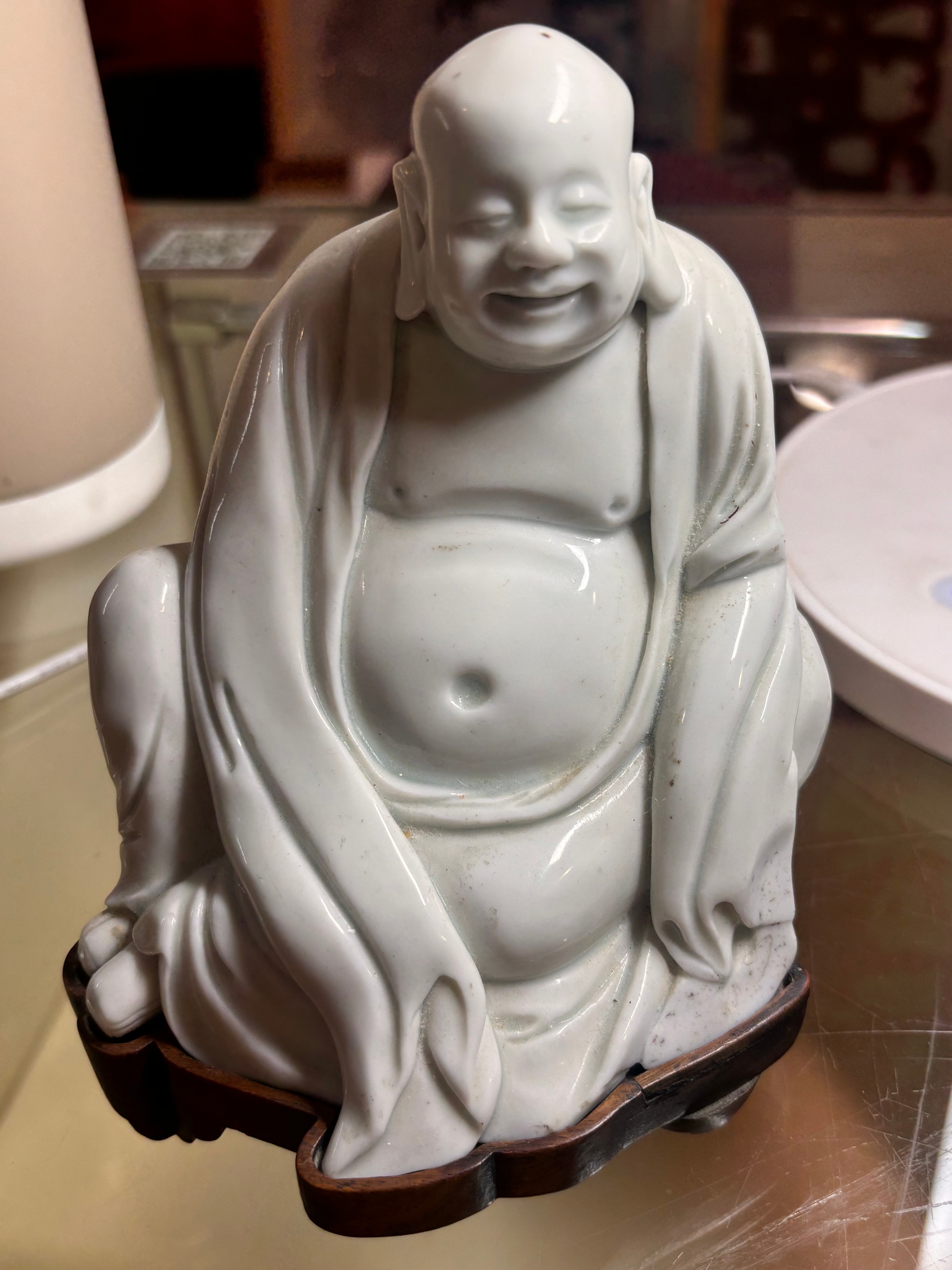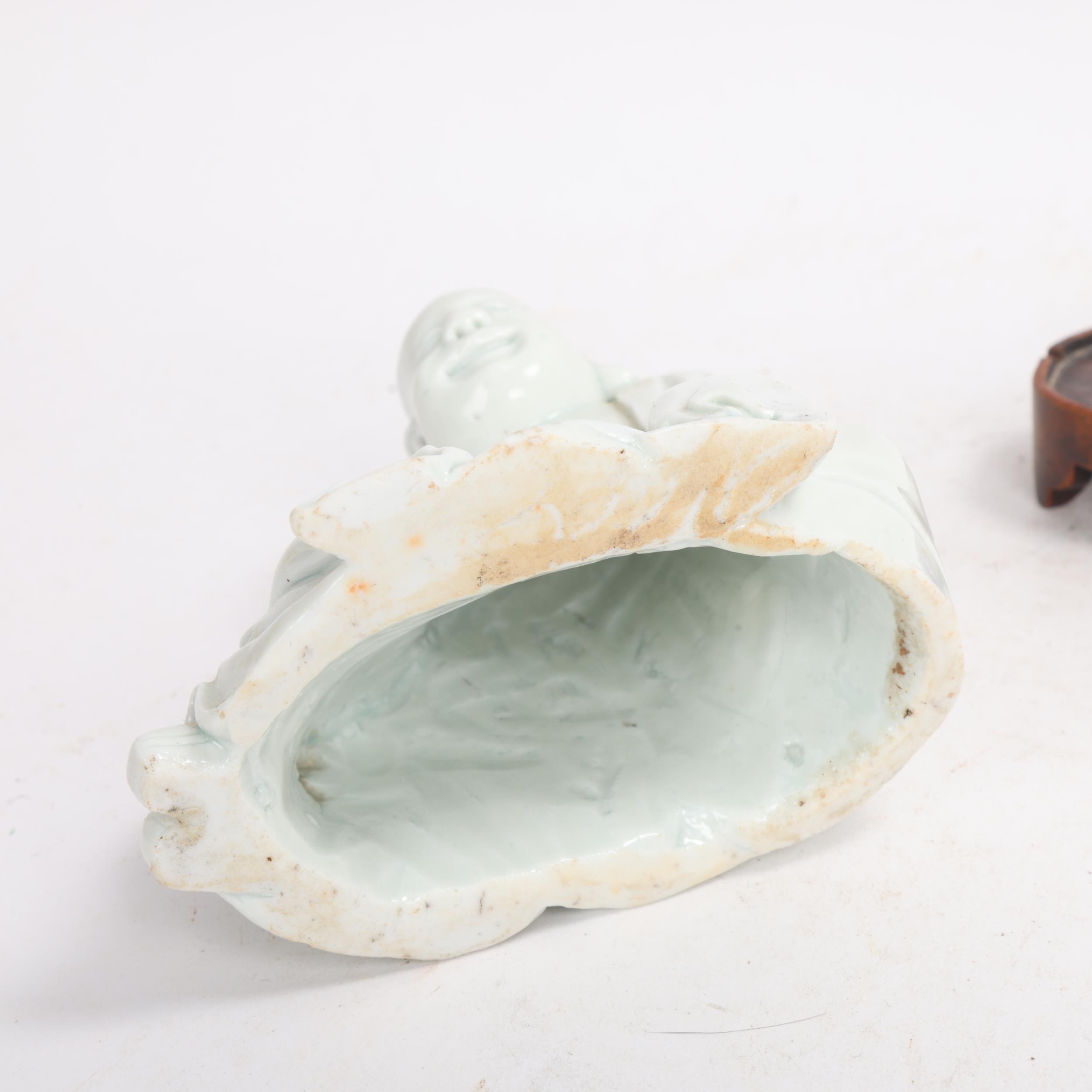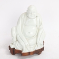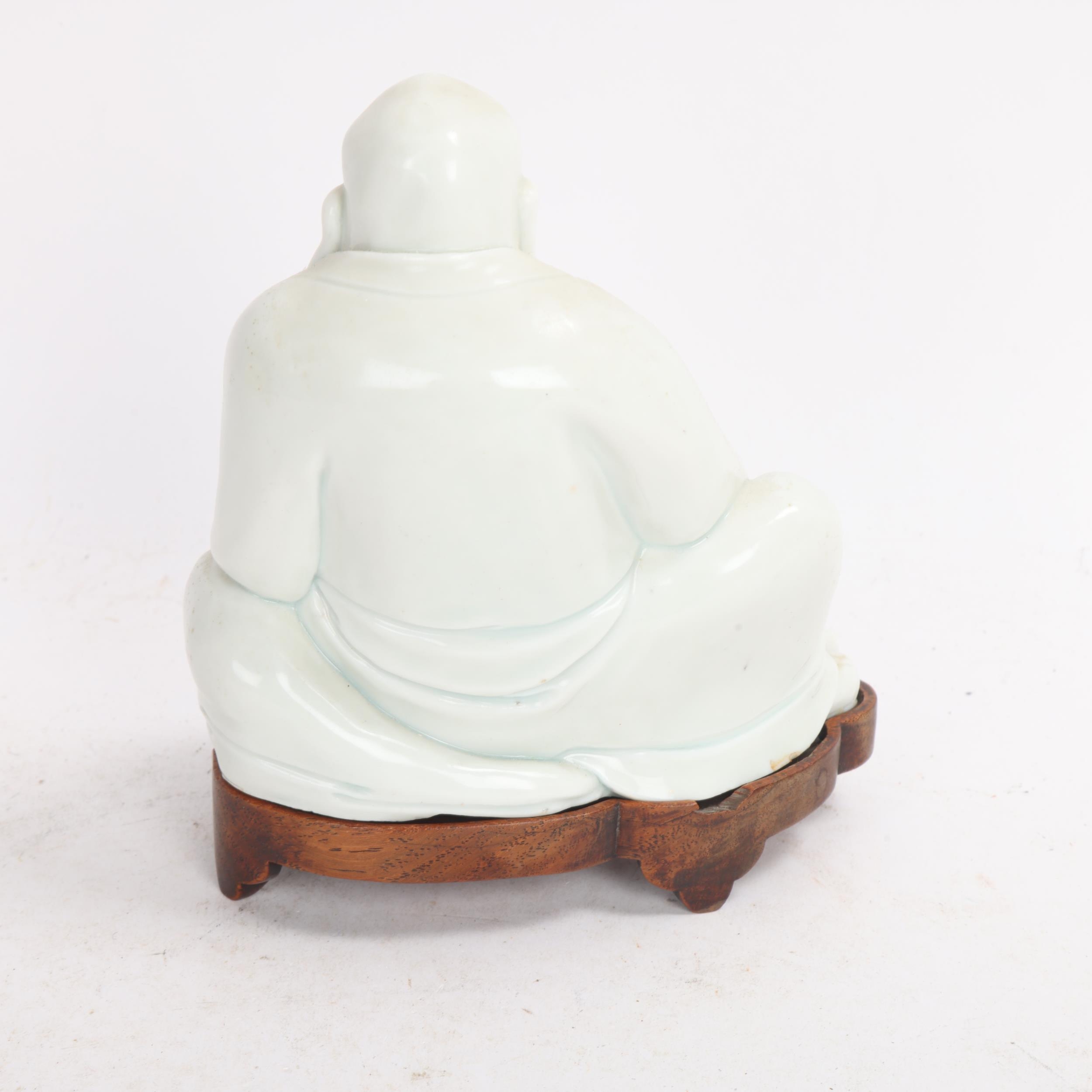 A Chinese blanc de chine porcelain figure of Budai, on original fitted wood stand, height 14.5cm