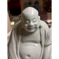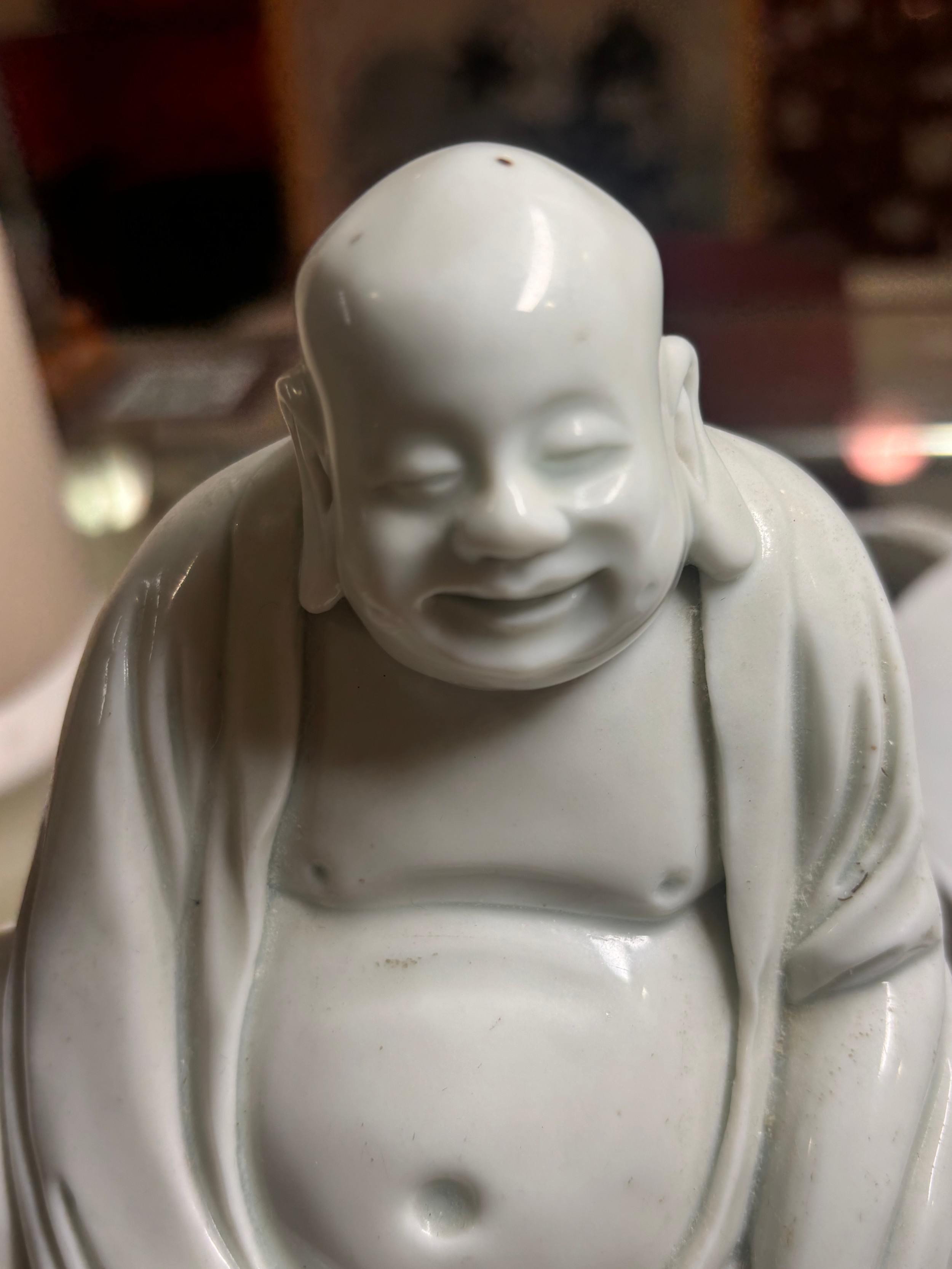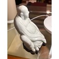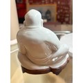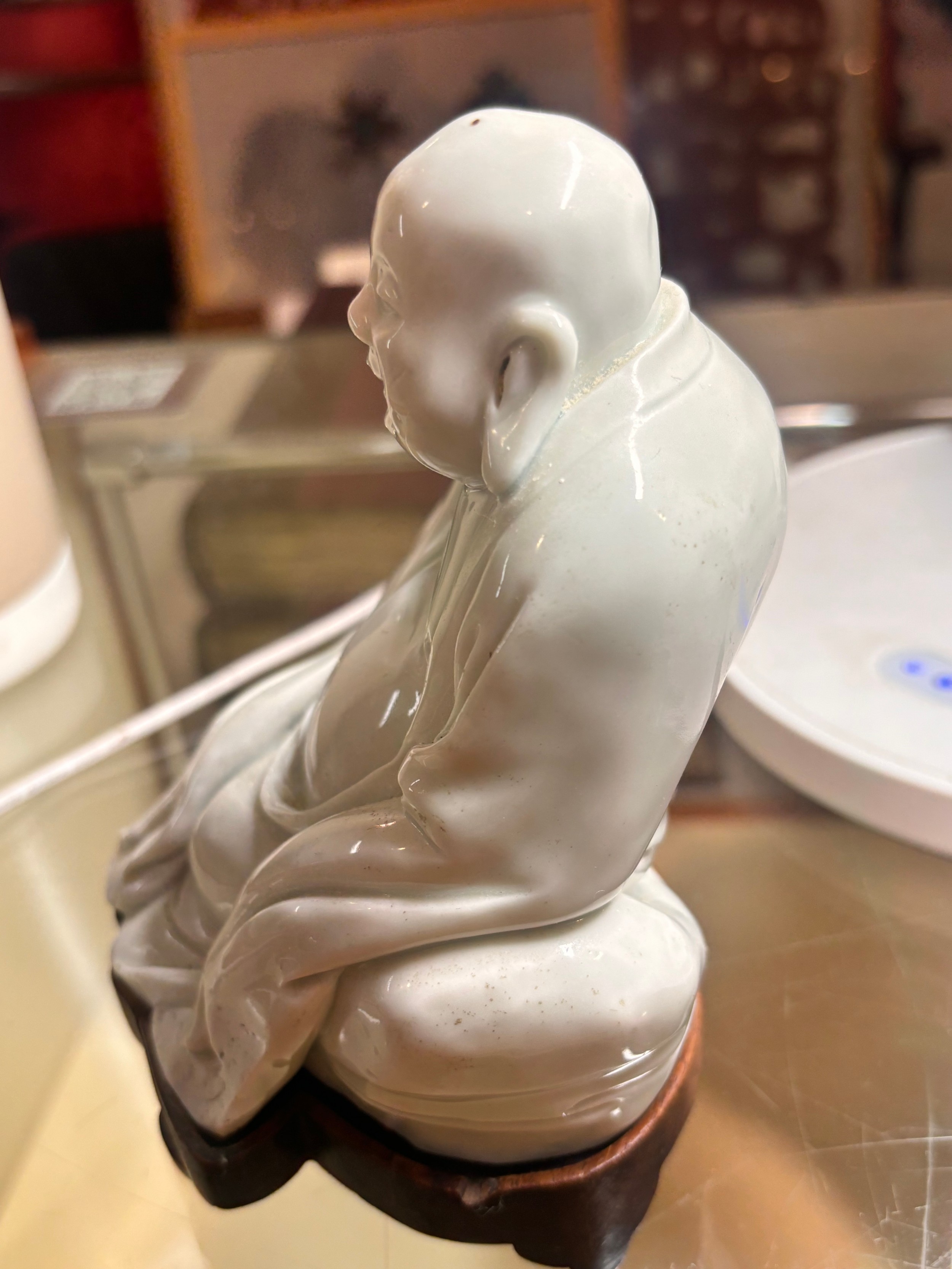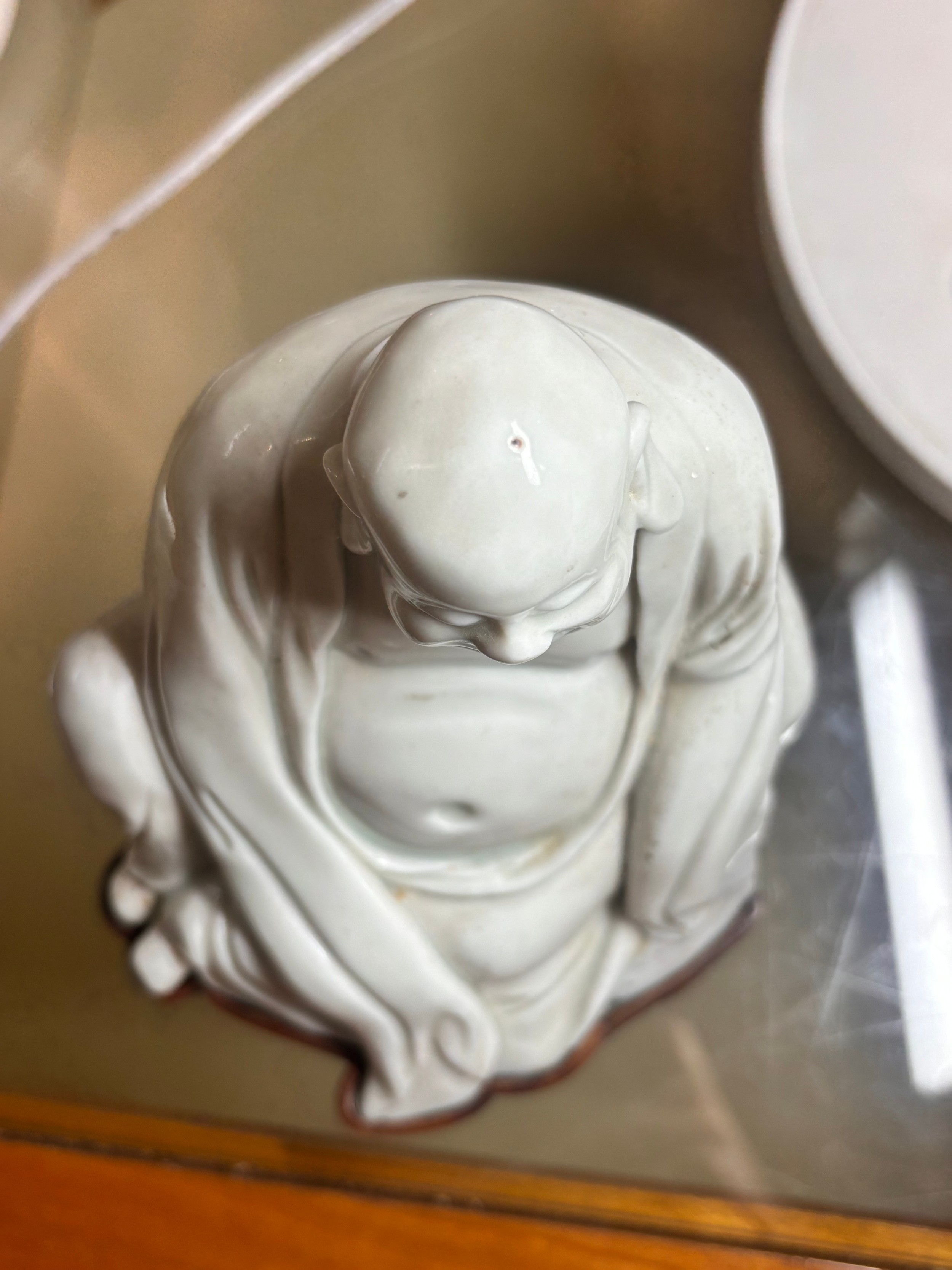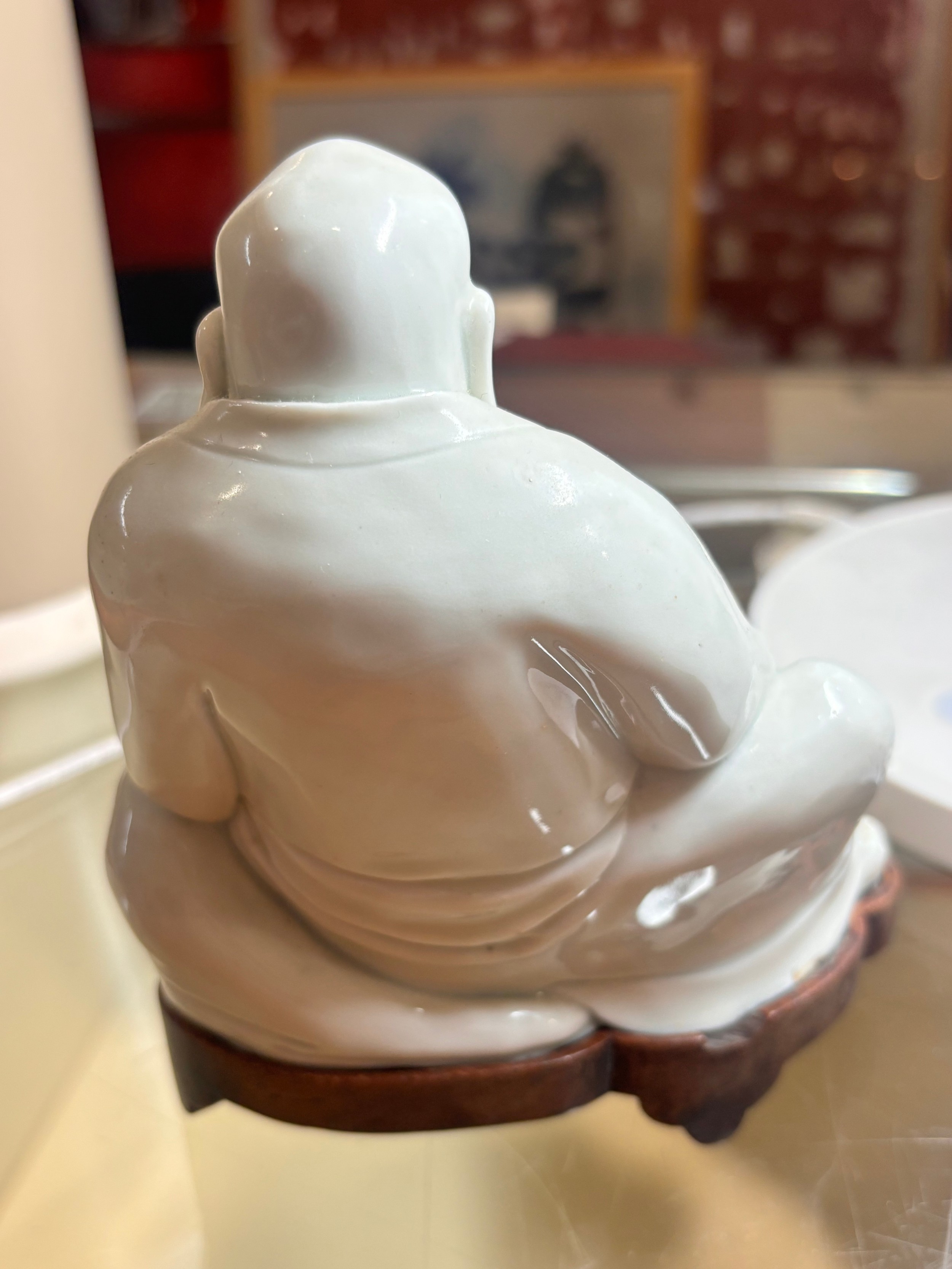 A Chinese blanc de chine porcelain figure of Budai, on original fitted wood stand, height 14.5cm