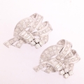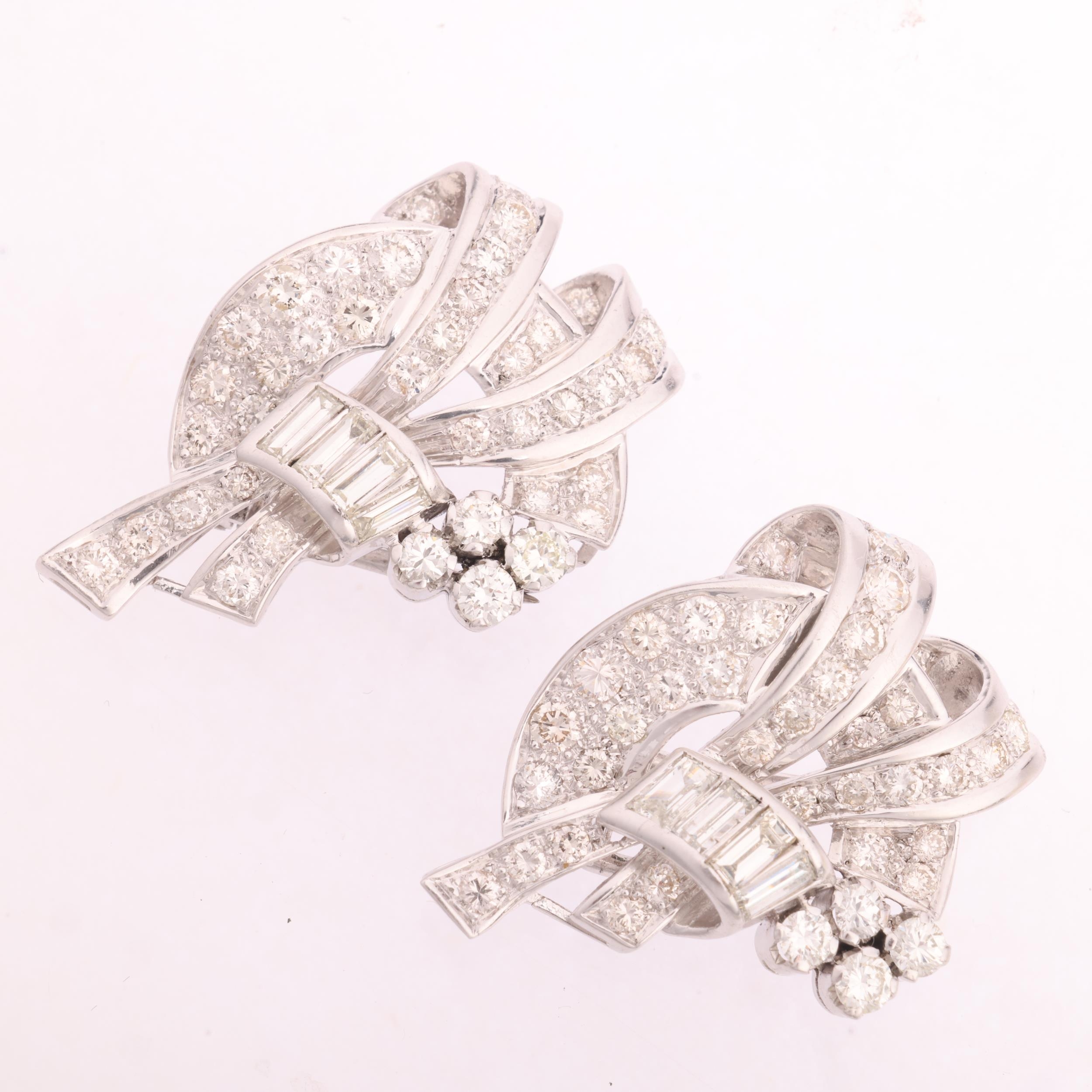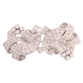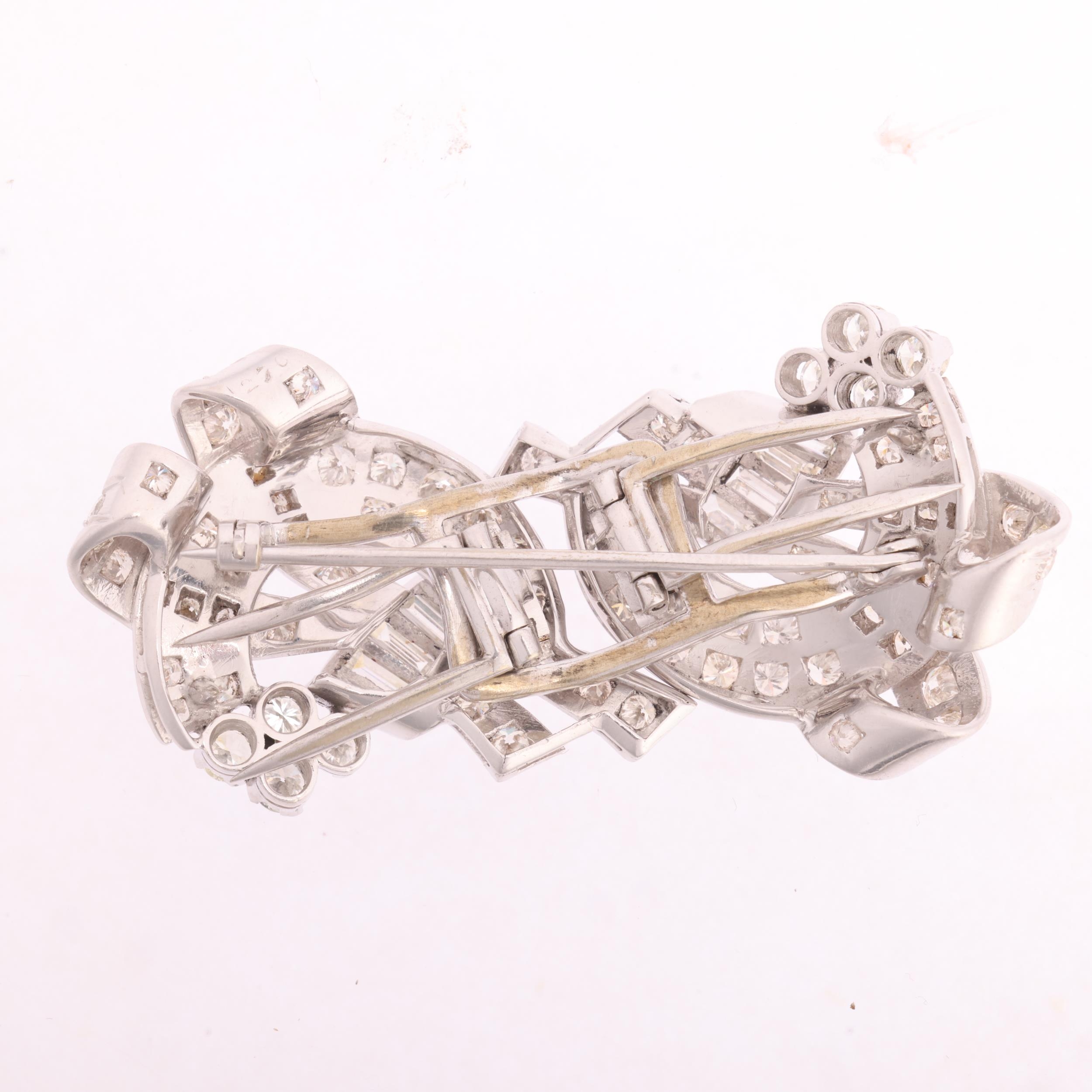 A Retro platinum diamond double-clip brooch, circa 1950, scrolling ribbon form, each clip detachable from the brooch fitting to become separate lapel clips, set throughout with rectangular step-cut and round transitional-cut diamonds, total diamond content approx 5.00ct, colour approx H-K, clarity approx VS-SI, unmarked mount tests as platinum, 54.4mm, 23.3g