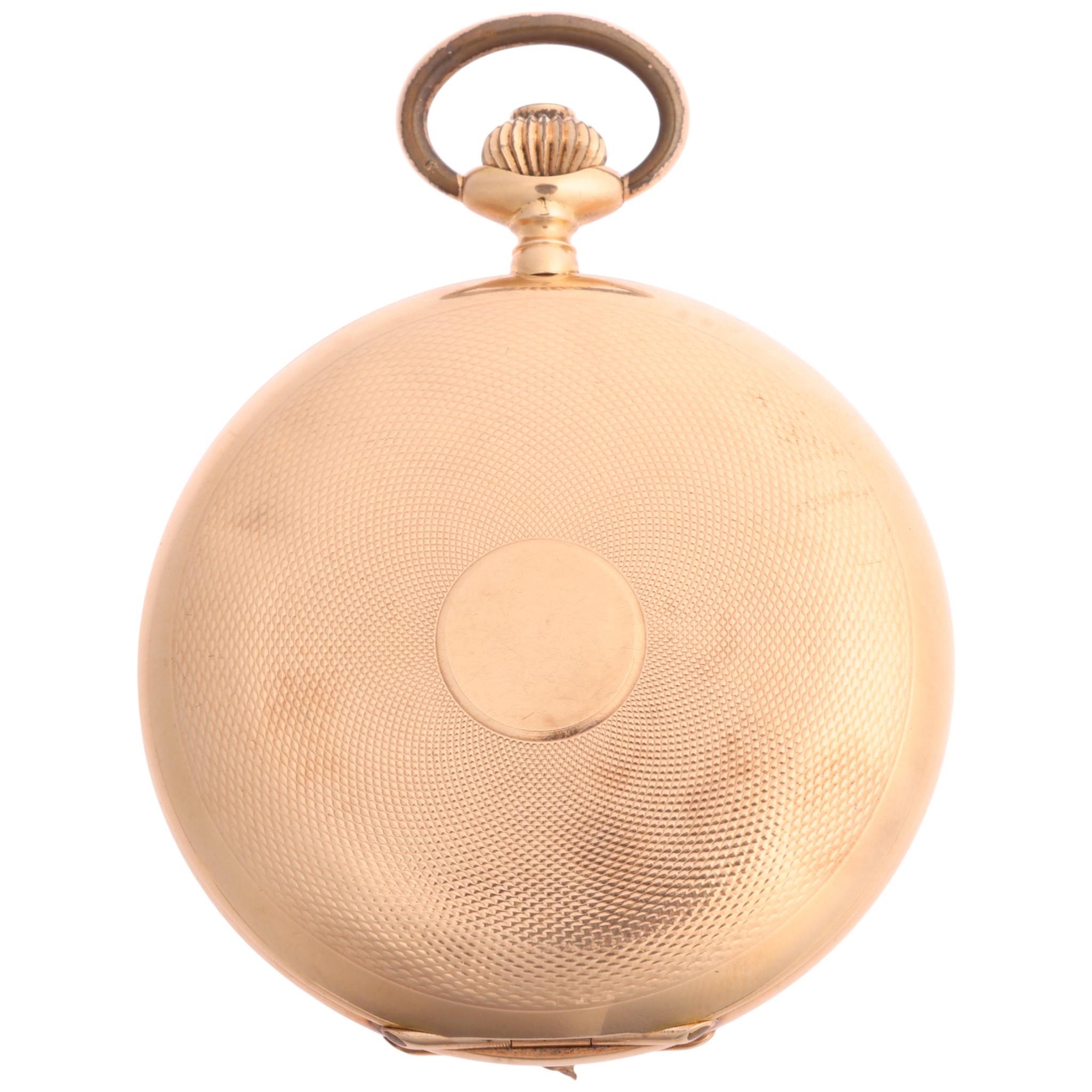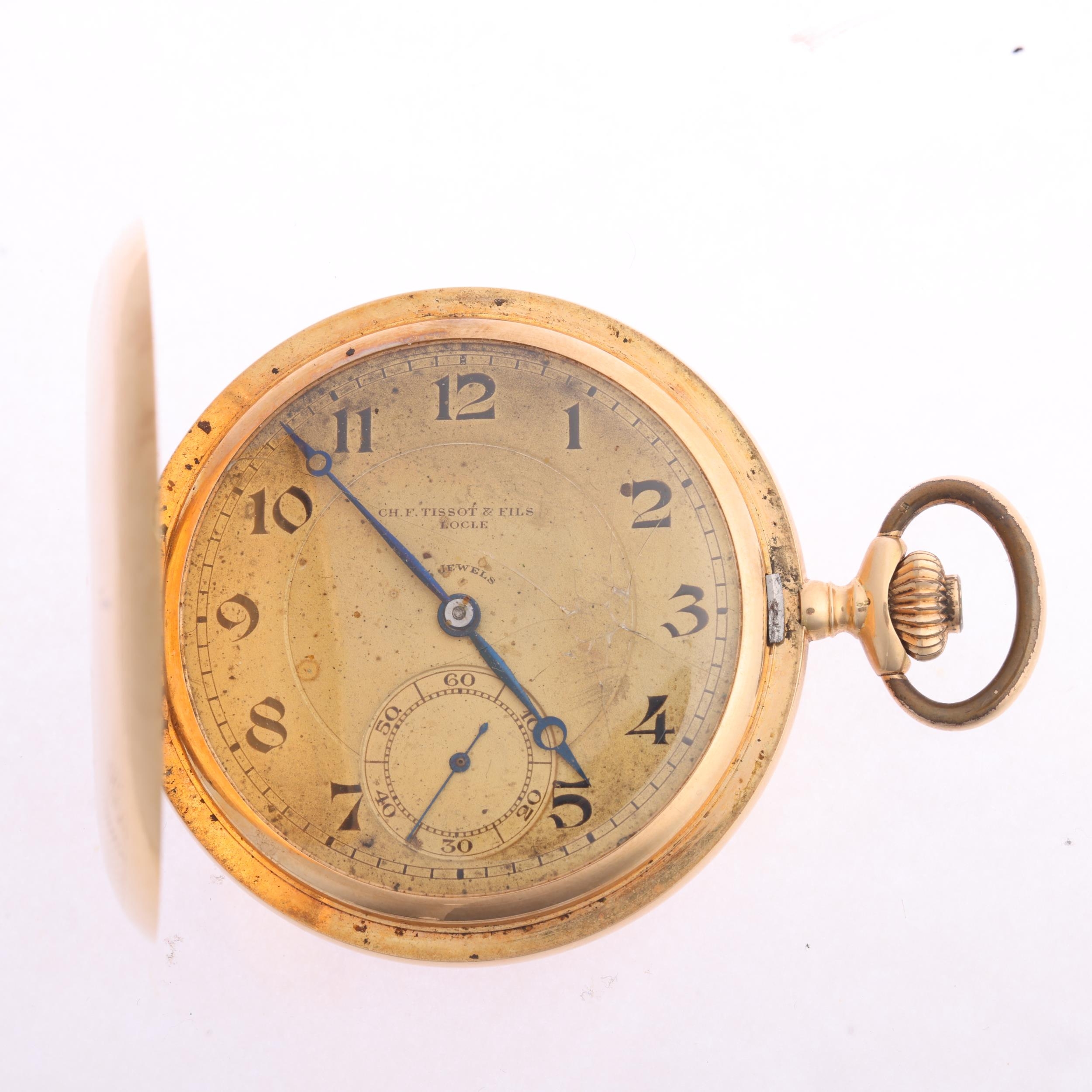 C.H.F. TISSOT & FILS - an Art Deco 14ct rose gold full hunter keyless slimline pocket watch, circa 1920s, champagne dial with black Arabic numerals, blued steel Breguet hands, subsidiary seconds dial and 14ct dust cover, movement signed C.H.F. Tissot & Fils Locle, serial no. 417859, case width 52mm, 86g gross, working order