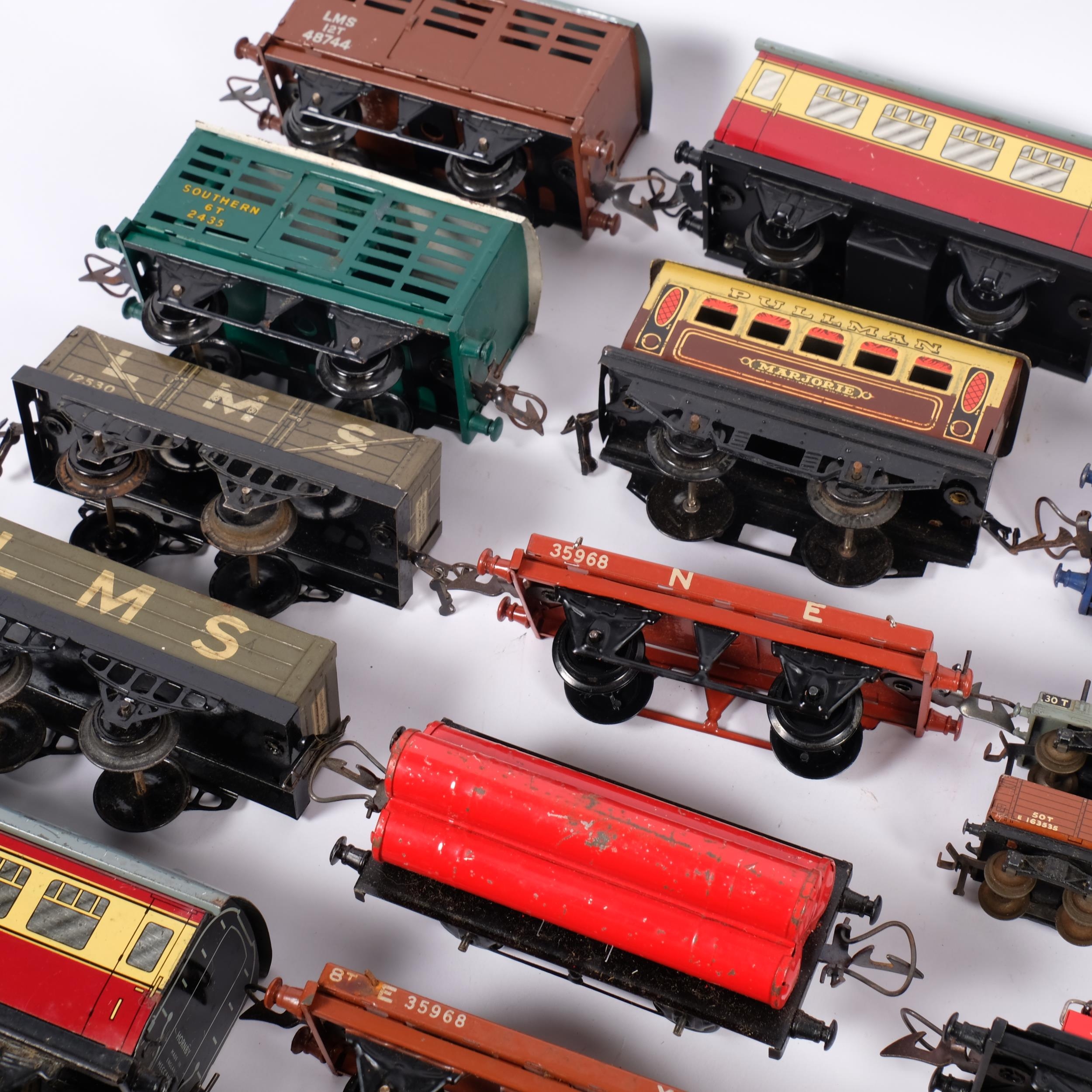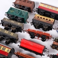 A selection of Hornby and other tenders and wagons, including a Red Line Glico Super Petrol tanker, and a boxed Dinky 994 loading ramp, etc (boxful)
