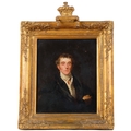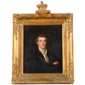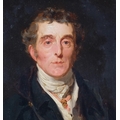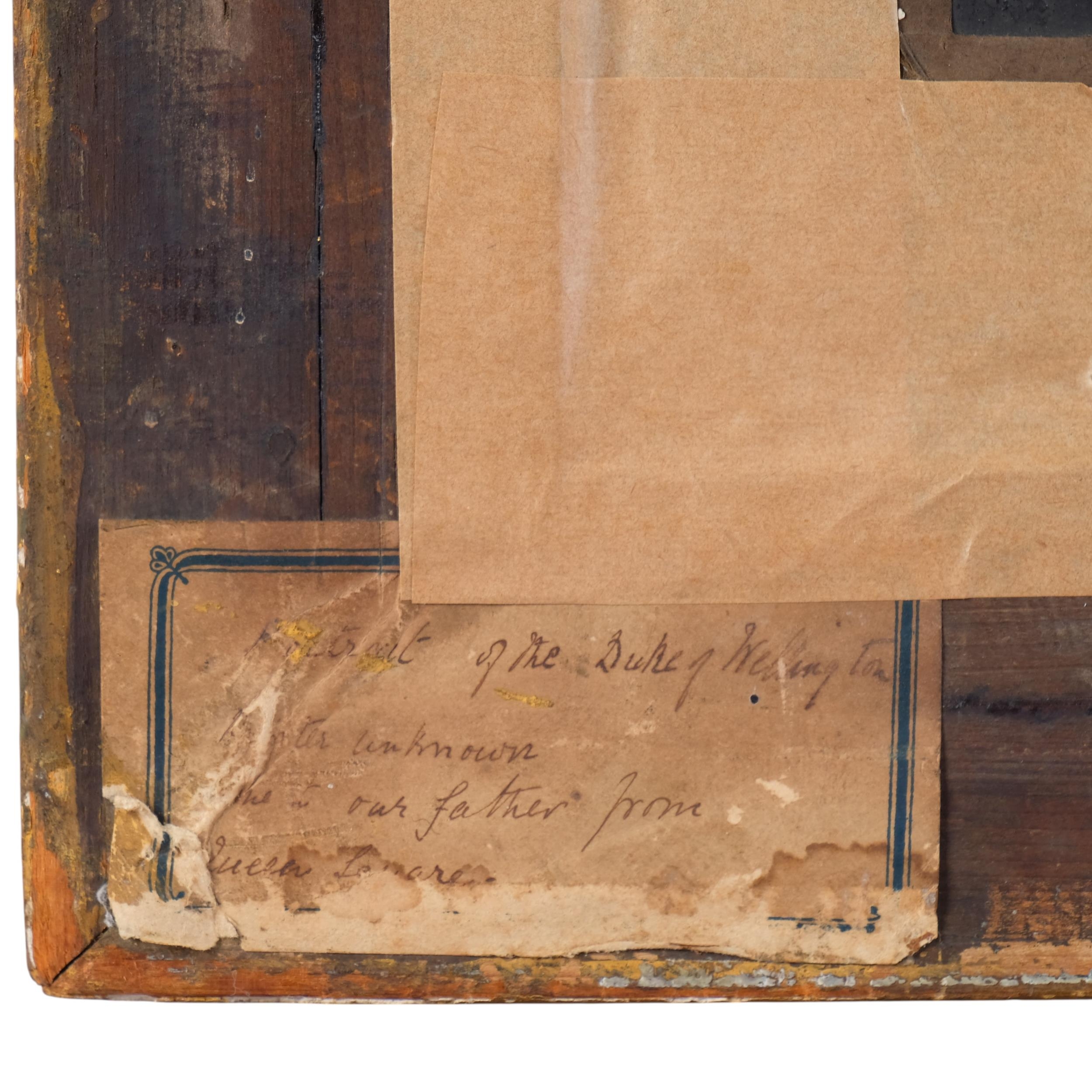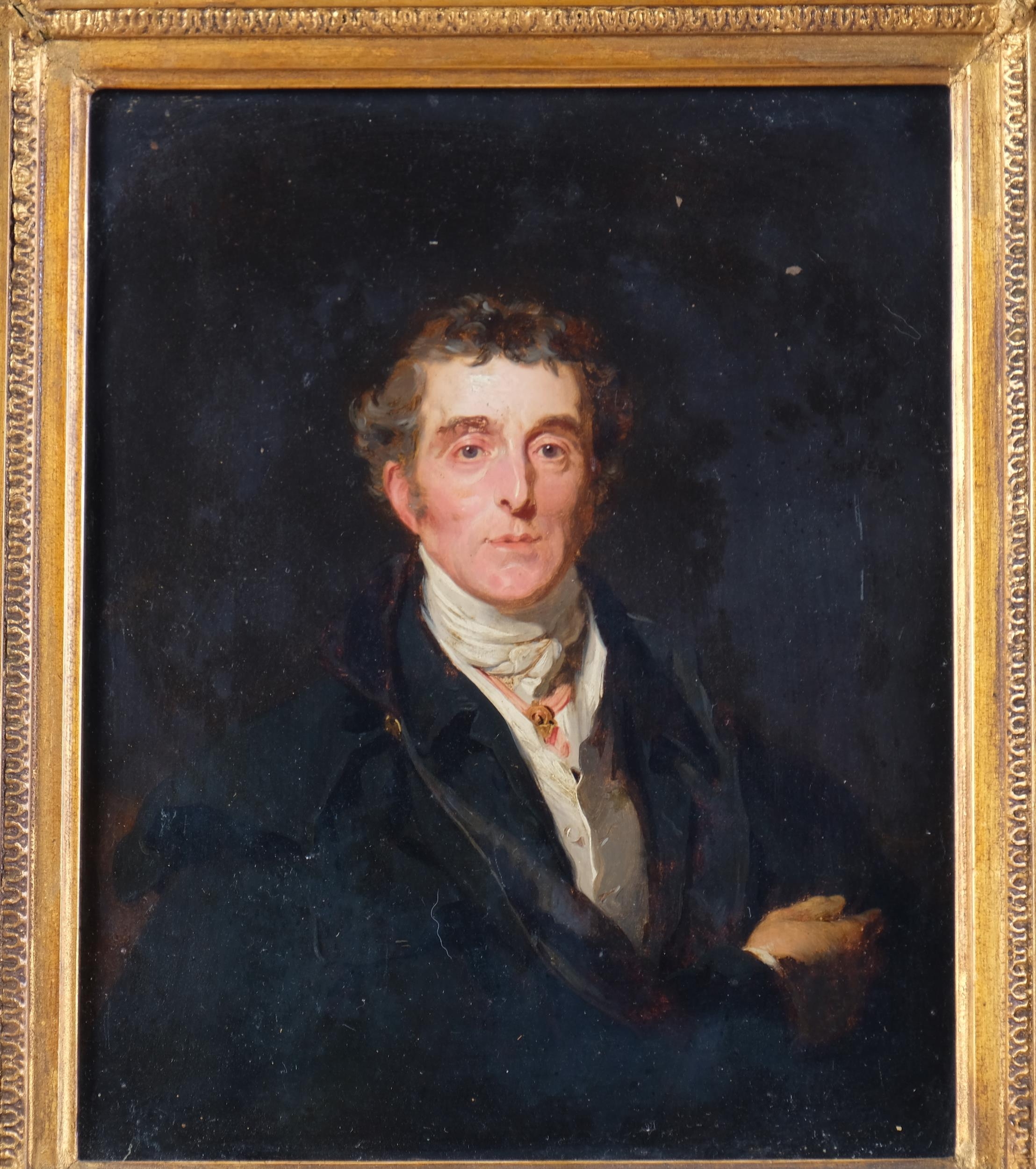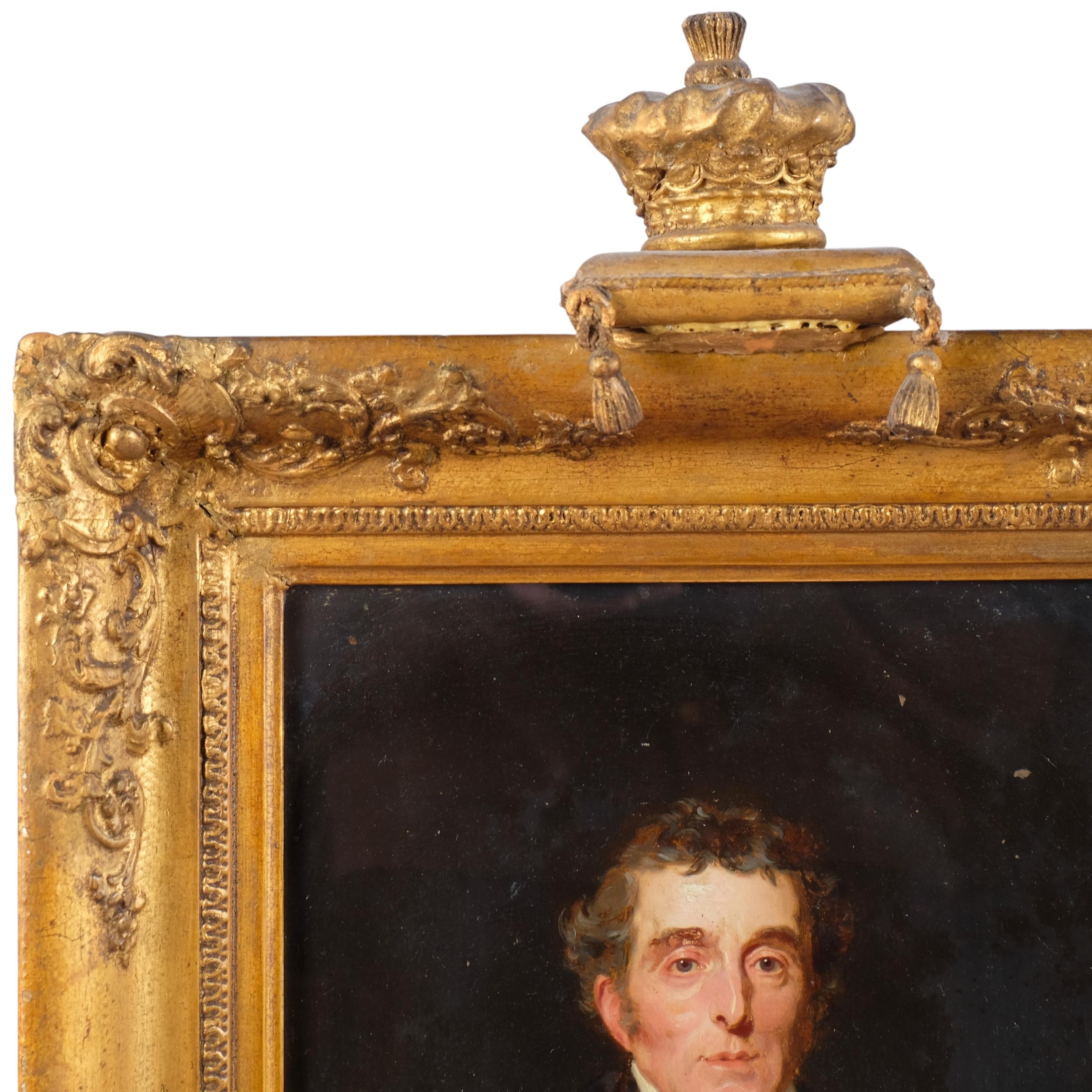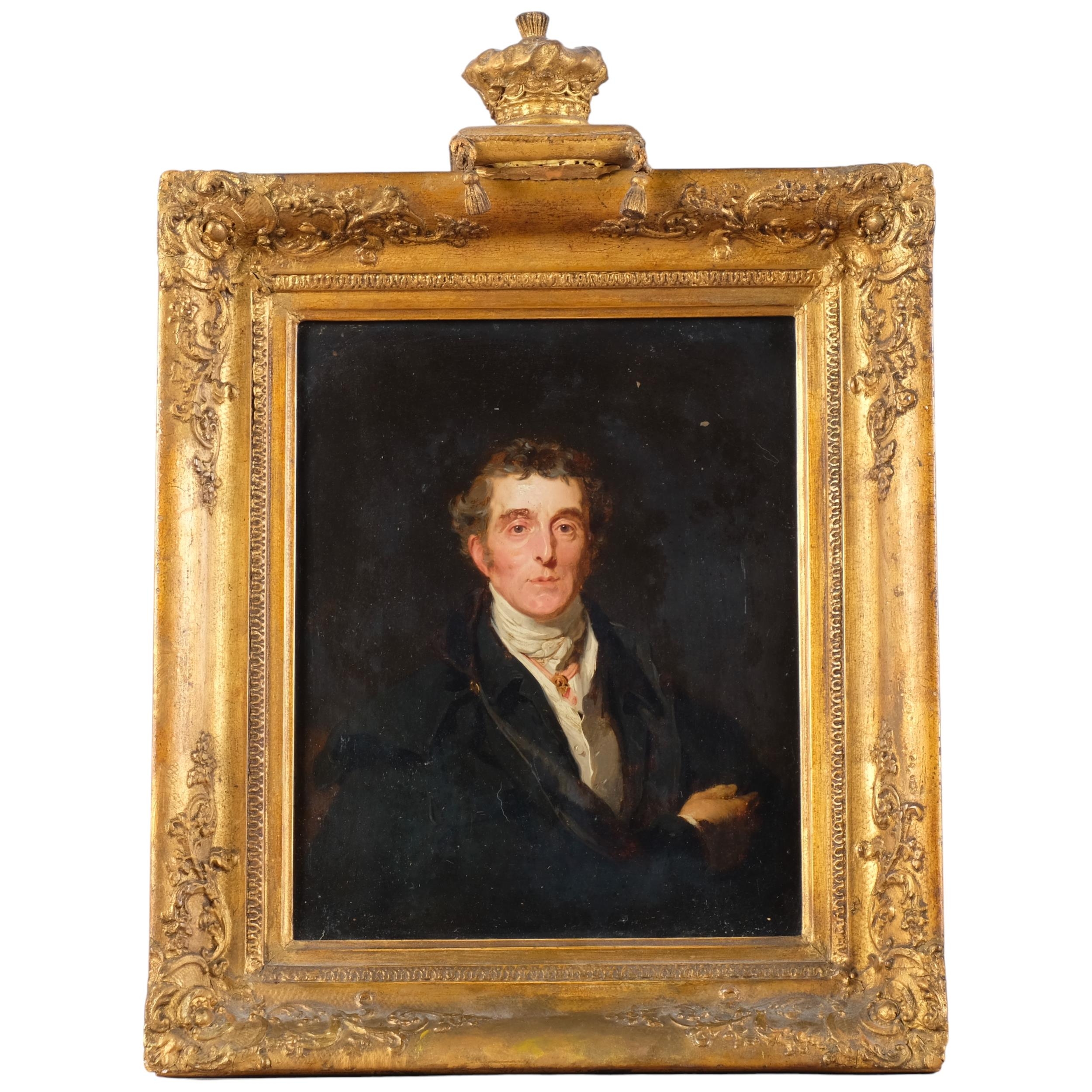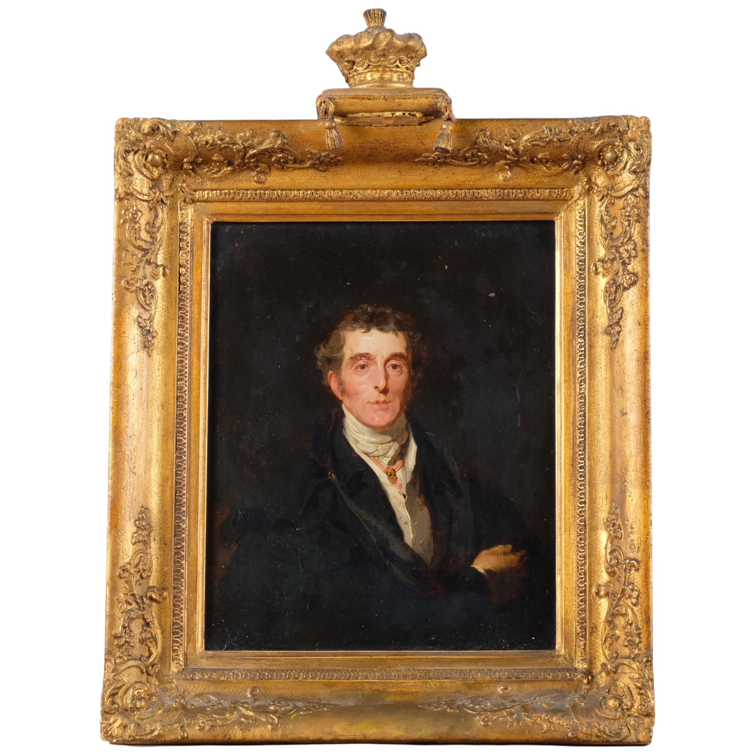 After Sir Thomas Lawrence, Portrait Arthur Wellesley, 1st Duke of Wellington, K.G, K.B., M.P (1769-1852), 19th century oil on wood panel, unsigned, with old label verso stating Artist unknown, given to our father from Queen..., 31cm x 25cm, original gilt-gesso frame with coronet pediment and glazed, overall frame dimensions excluding coronet 41cm x 36cm