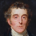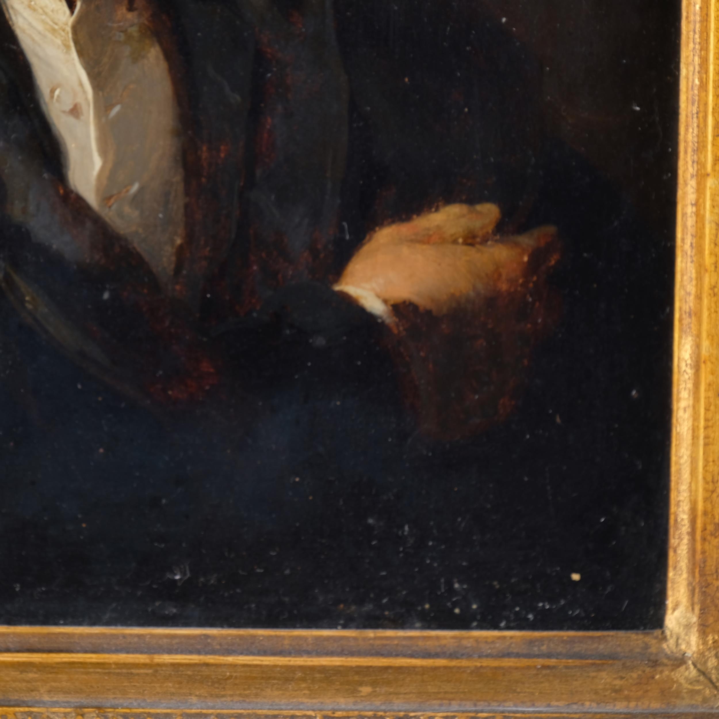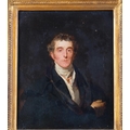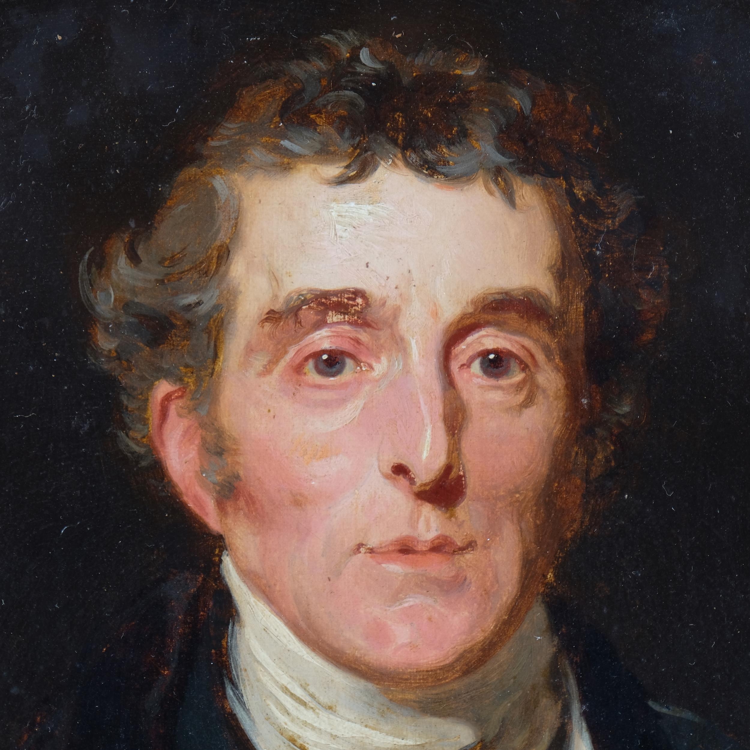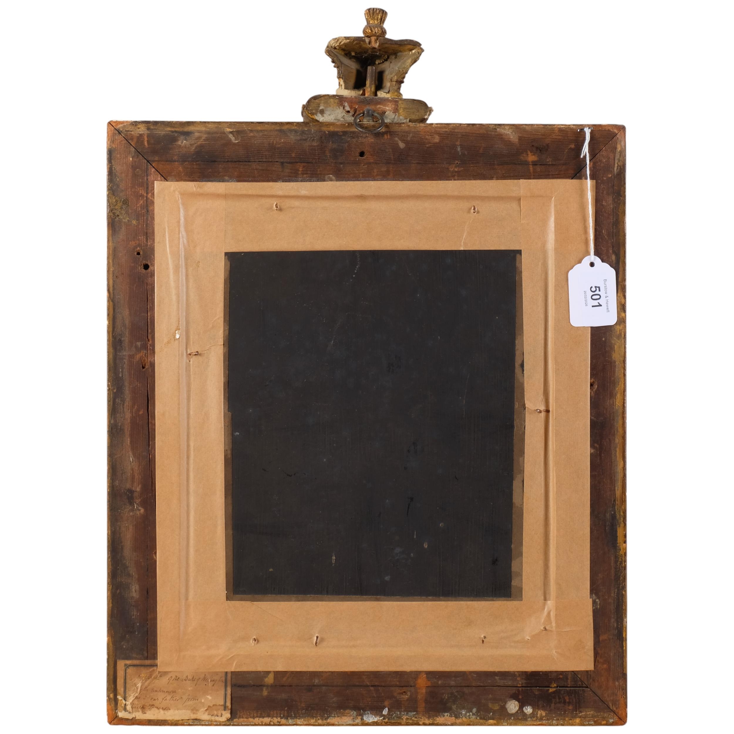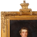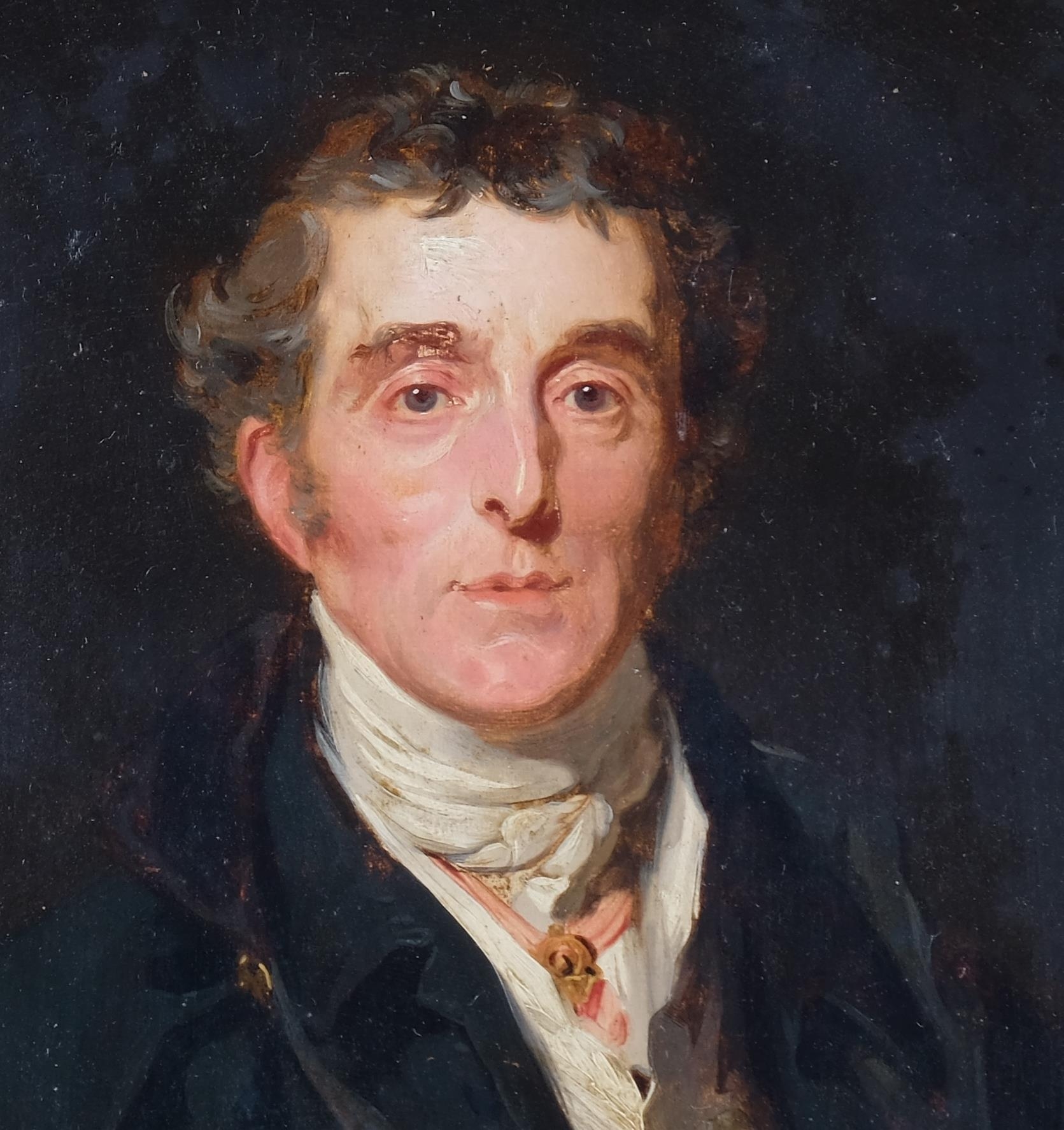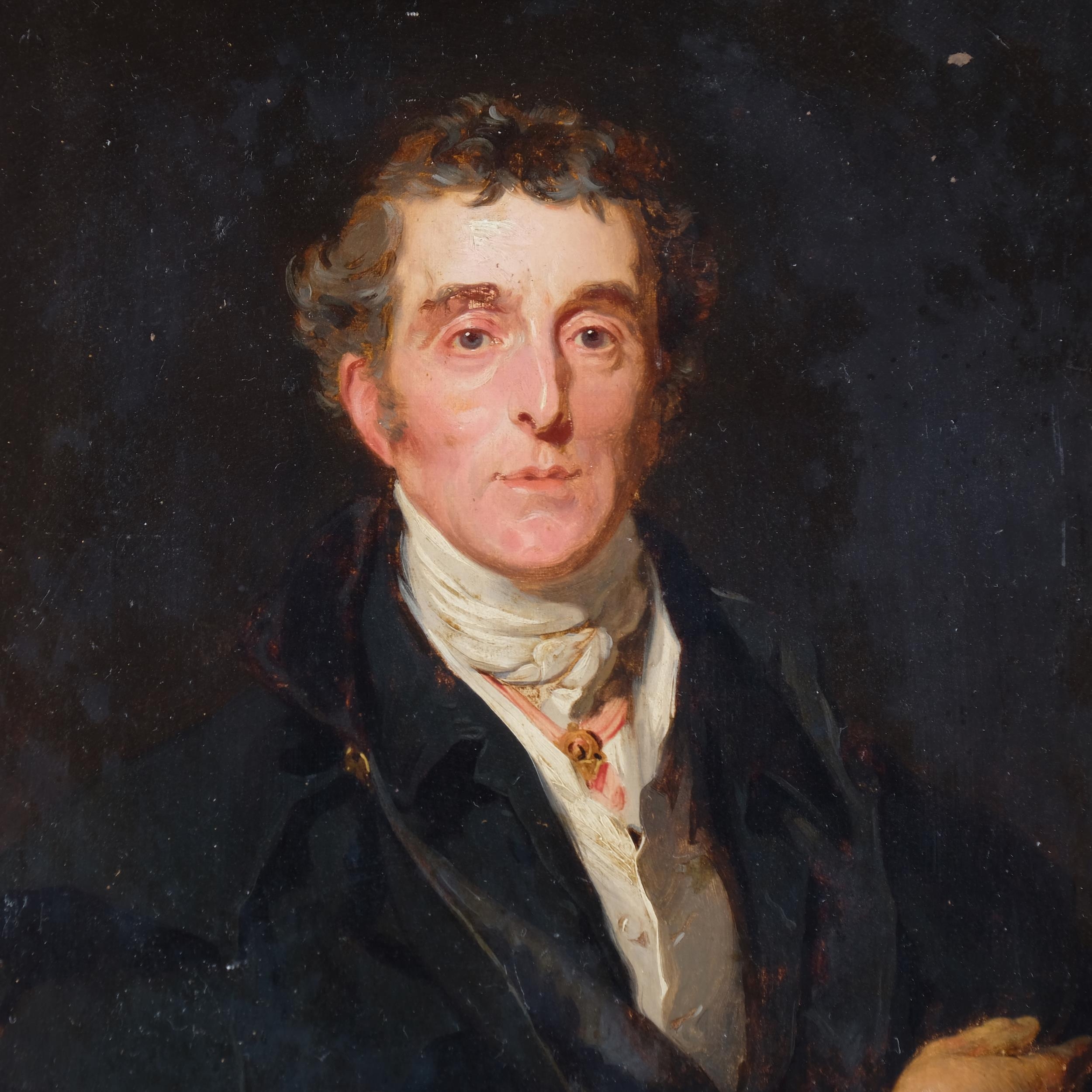 After Sir Thomas Lawrence, Portrait Arthur Wellesley, 1st Duke of Wellington, K.G, K.B., M.P (1769-1852), 19th century oil on wood panel, unsigned, with old label verso stating Artist unknown, given to our father from Queen..., 31cm x 25cm, original gilt-gesso frame with coronet pediment and glazed, overall frame dimensions excluding coronet 41cm x 36cm