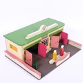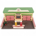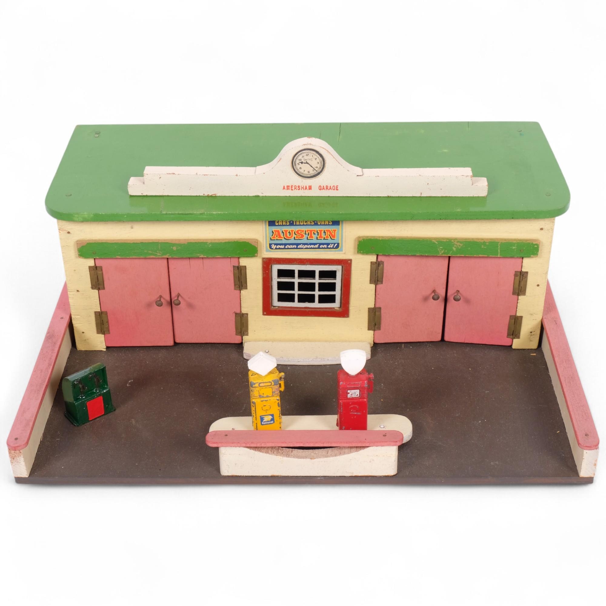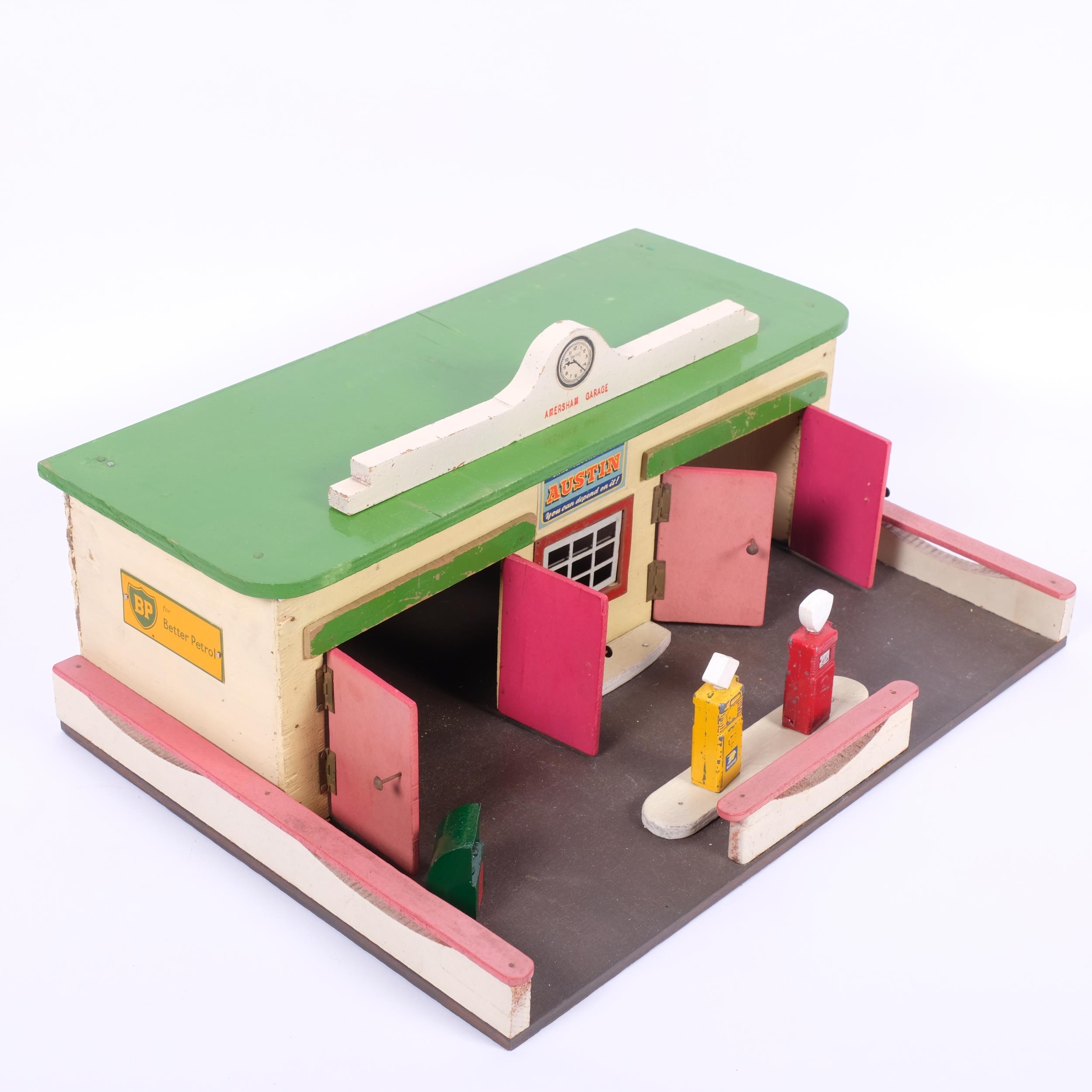 A 1950s style scratch-built model garage, labelled for BP, with 3 tin petrol pump models, overall width 37cm, height 16cm, depth 28cm