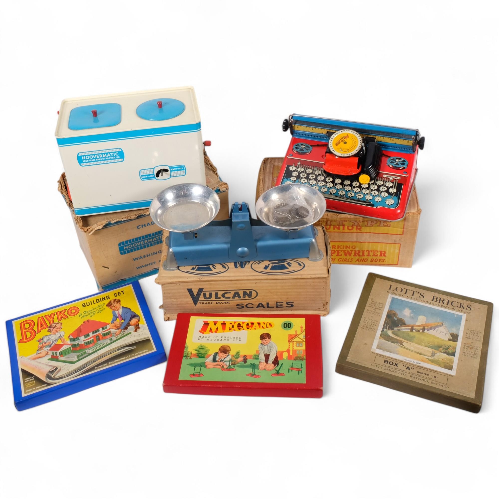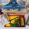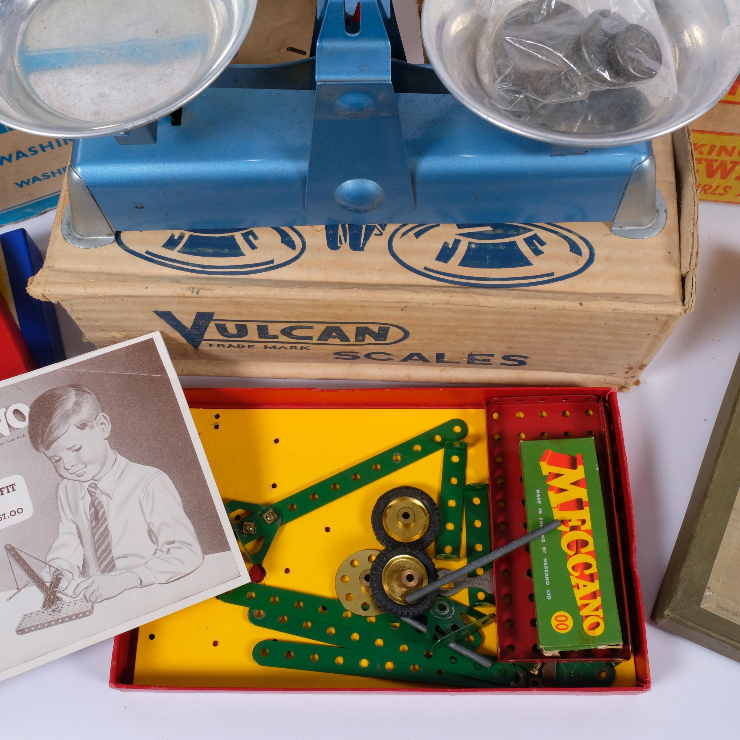 A box containing various Vintage games, including a cased Bako building set, and a cased Meccano building set, etc