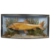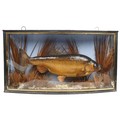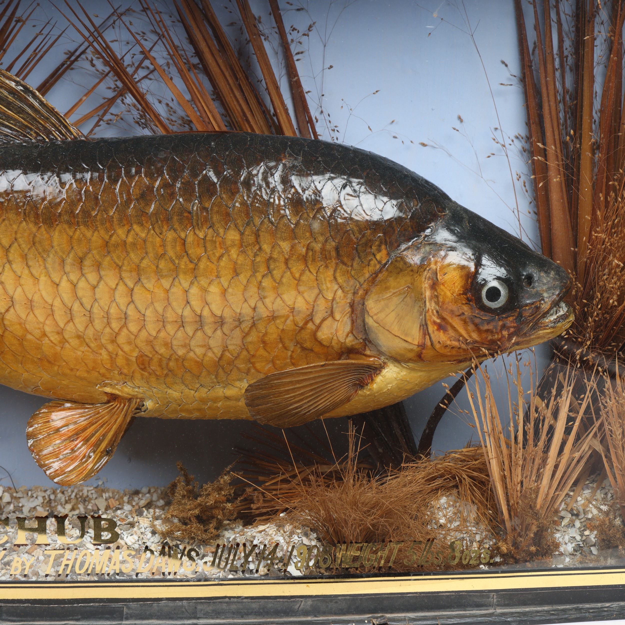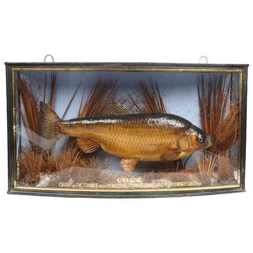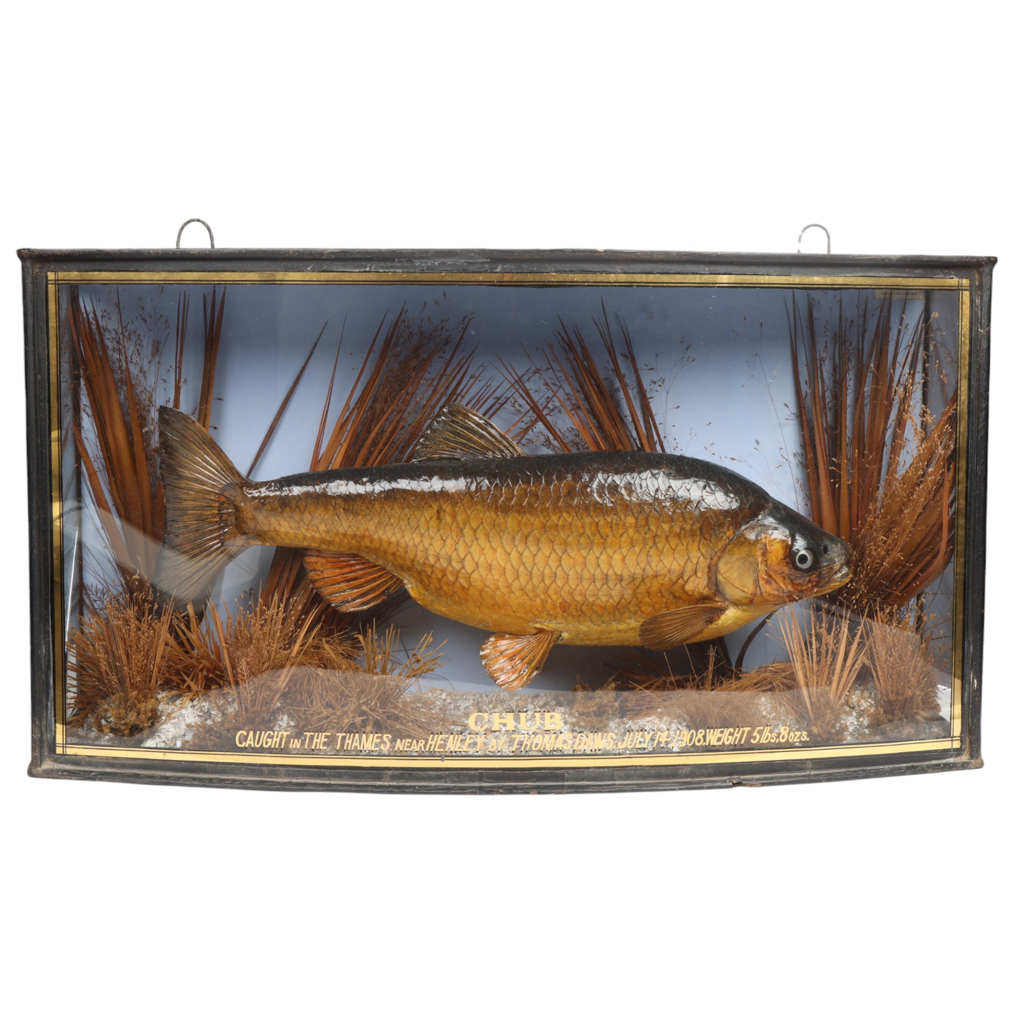 TAXIDERMY - a chub, by Stanley Mead of Henley-on-Thames, bow-front glass display case inscribed Caught in the Thames near Henley by Thomas Daws July 14 1908, weight 5lbs 8oz, case 69cm x 37cm