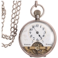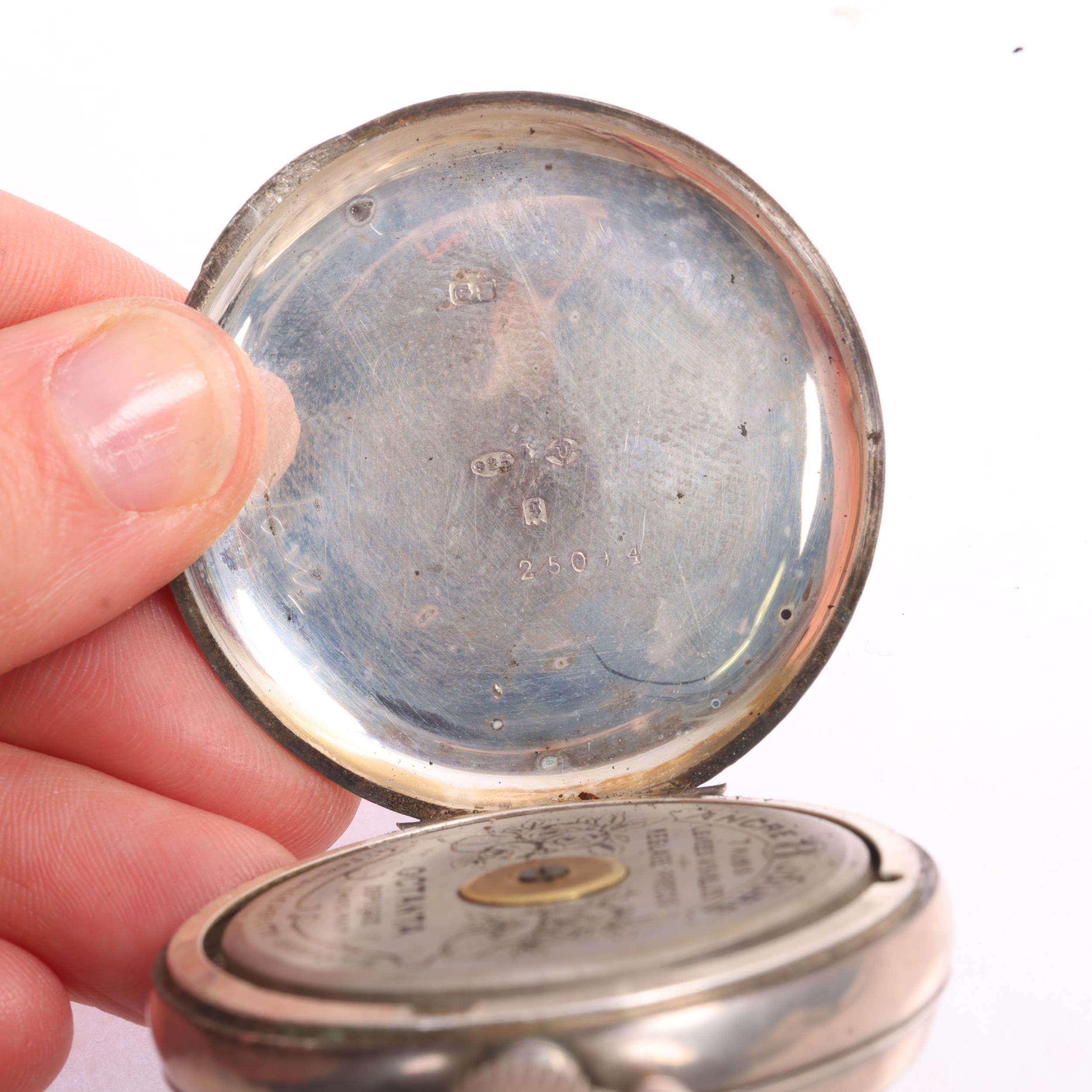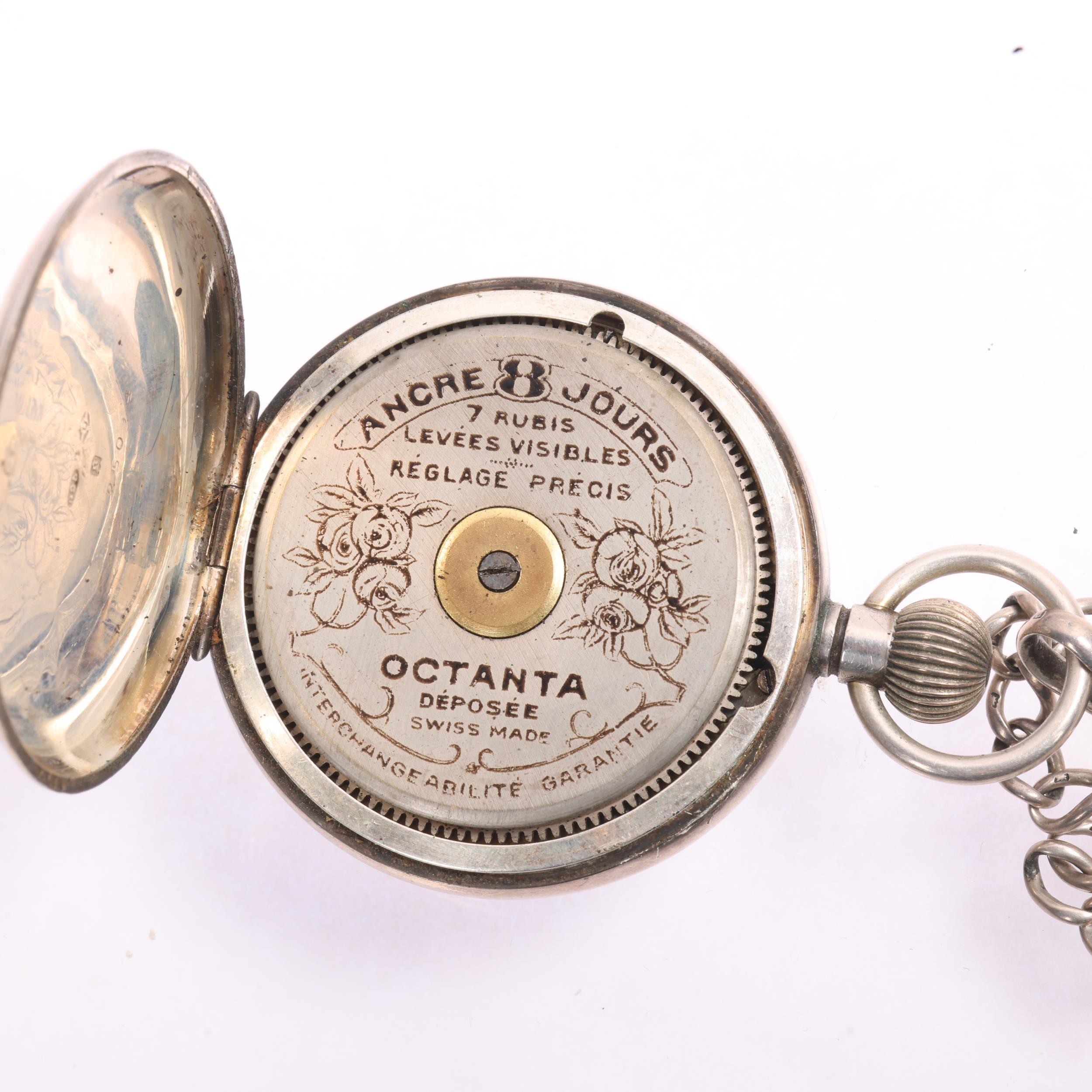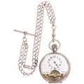 An early 20th century silver open-face keyless 8-day pocket watch, white enamel semi-skeleton dial with black Arabic numerals, blued steel spade hands, visible balance bridge and octanta 7 jewel movement, import hallmarks London 1922, case no. 25094, case width 47mm, working order, with a silver curb link Albert chain, 50cm