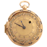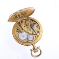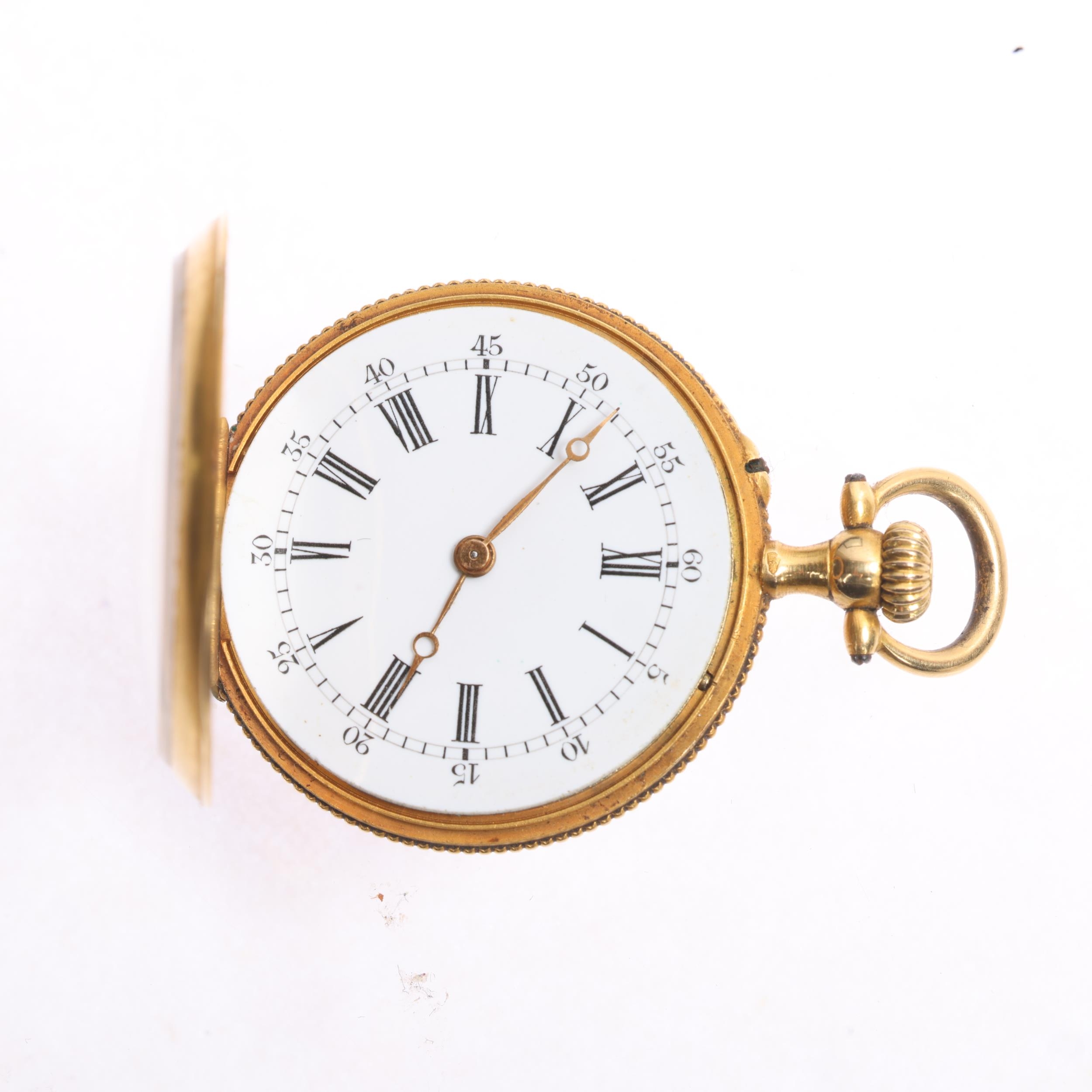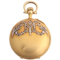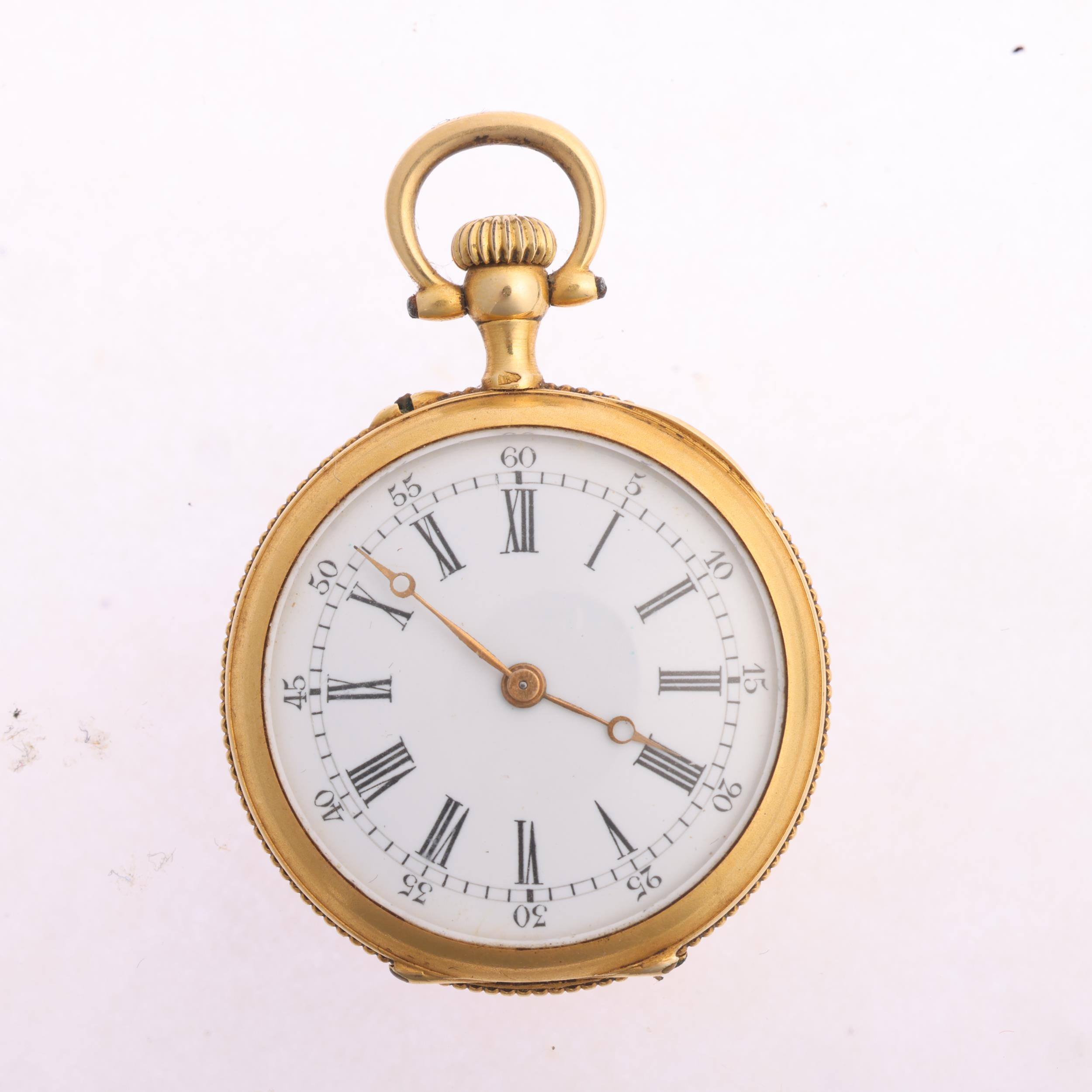 An Art Nouveau French 18ct gold diamond open-face keyless fob watch, circa 1910, white enamel dial with black Roman numeral hour markers, gilt Breguet hands and textured caseback with applied rose-cut diamond set stylised motif and 18ct dust cover, case by Societe Generale Des Monteurs De Boites d'Or, French assay marks, serial no. 14983, case width 28mm, 19g gross, working order
