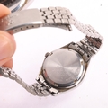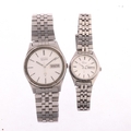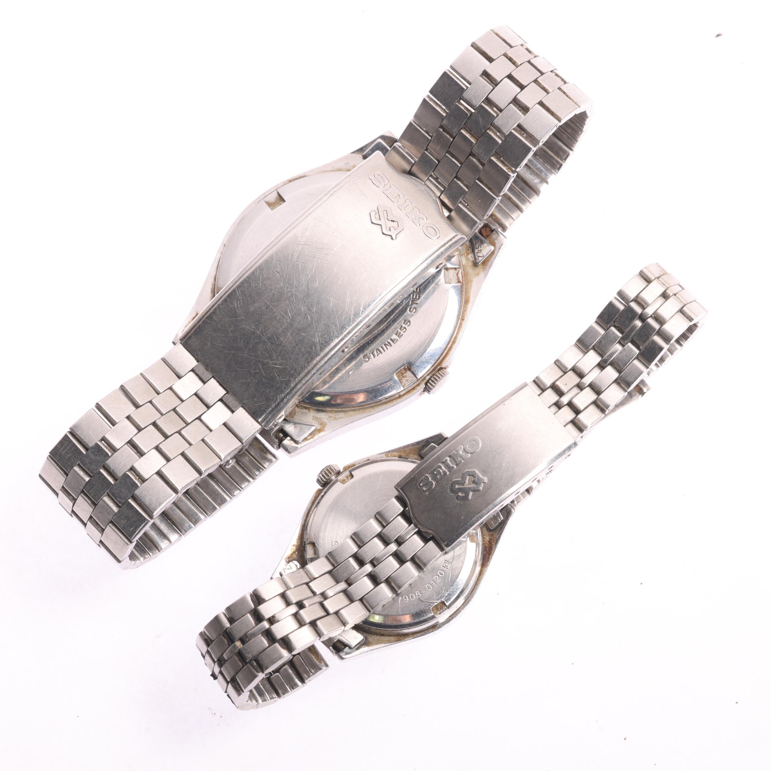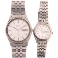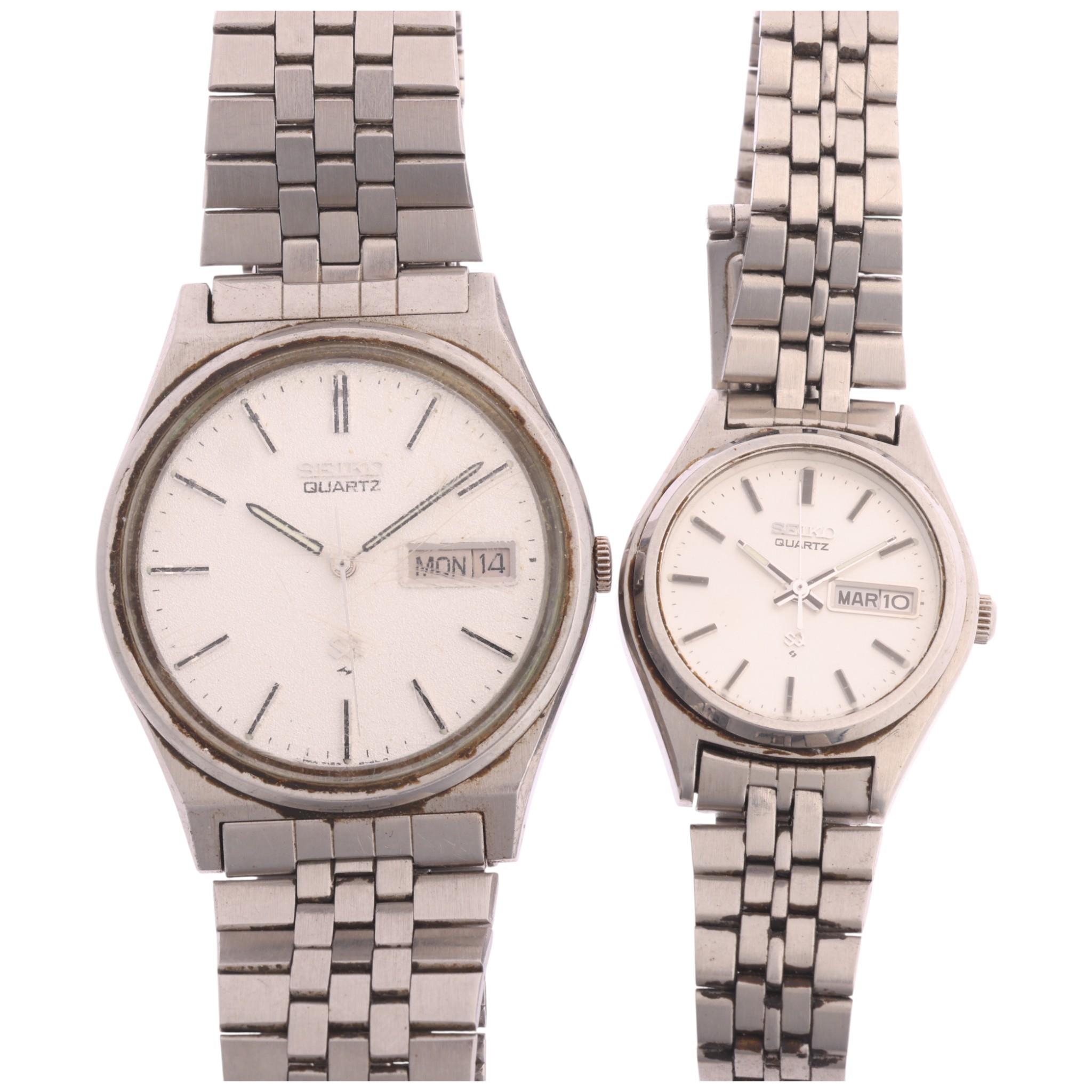 SEIKO - a pair of 'His And Hers' stainless steel SQ quartz calendar bracelet watches, ref. 7123-8430 and 7908-0120, case width 34mm and 25mm, not currently working (2)