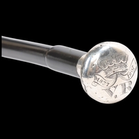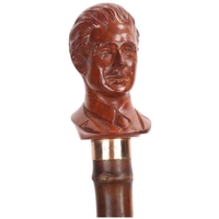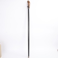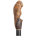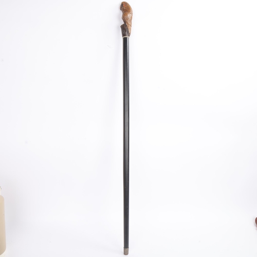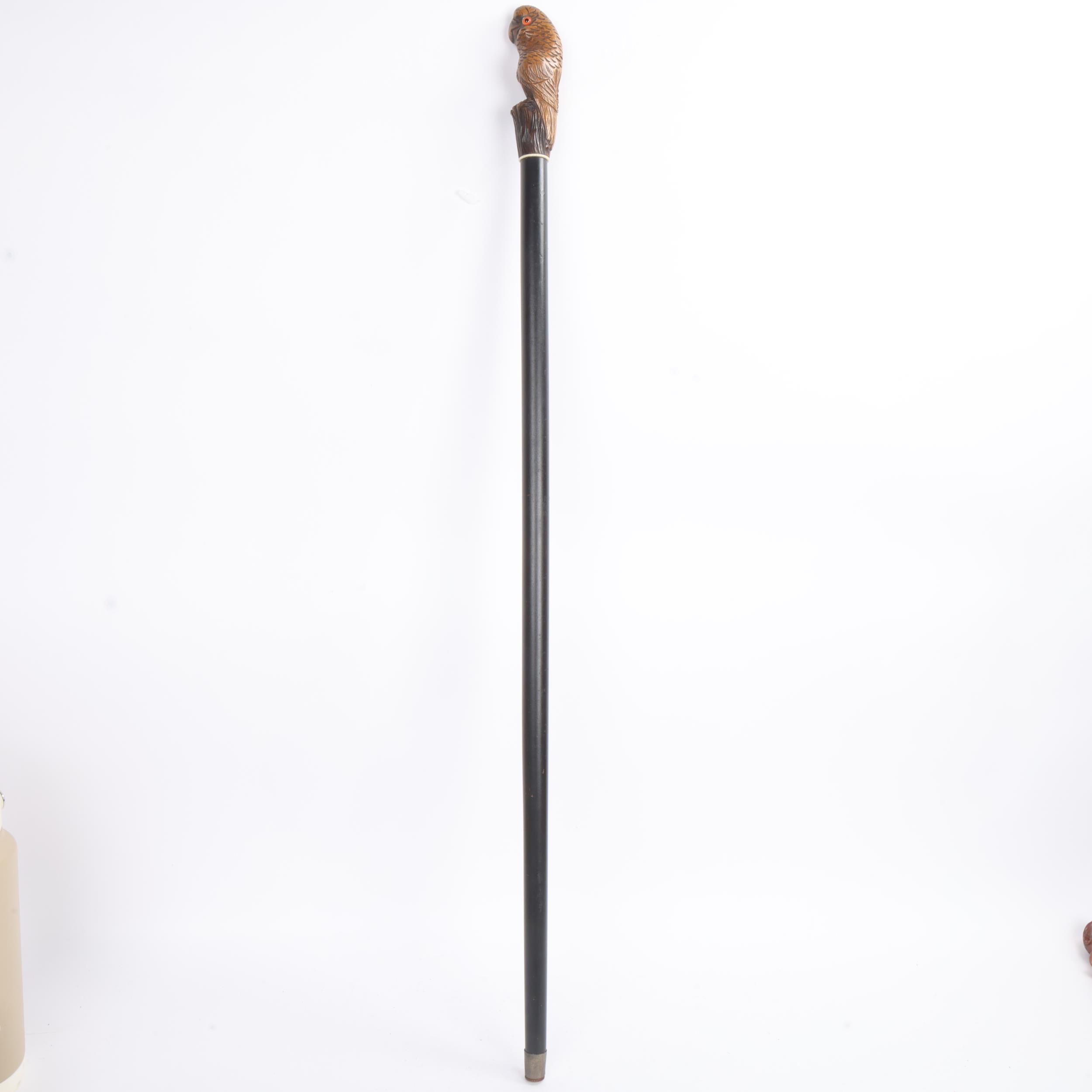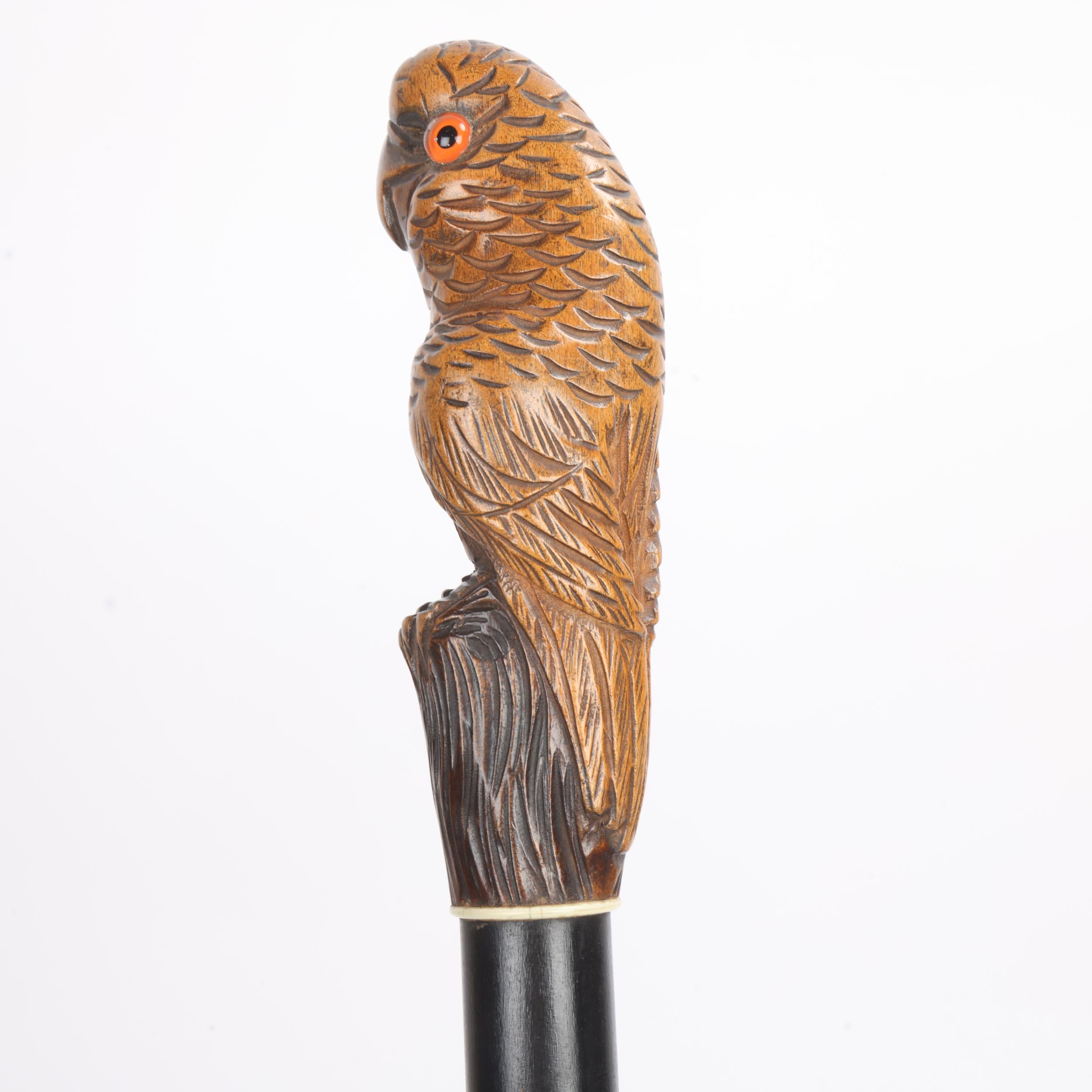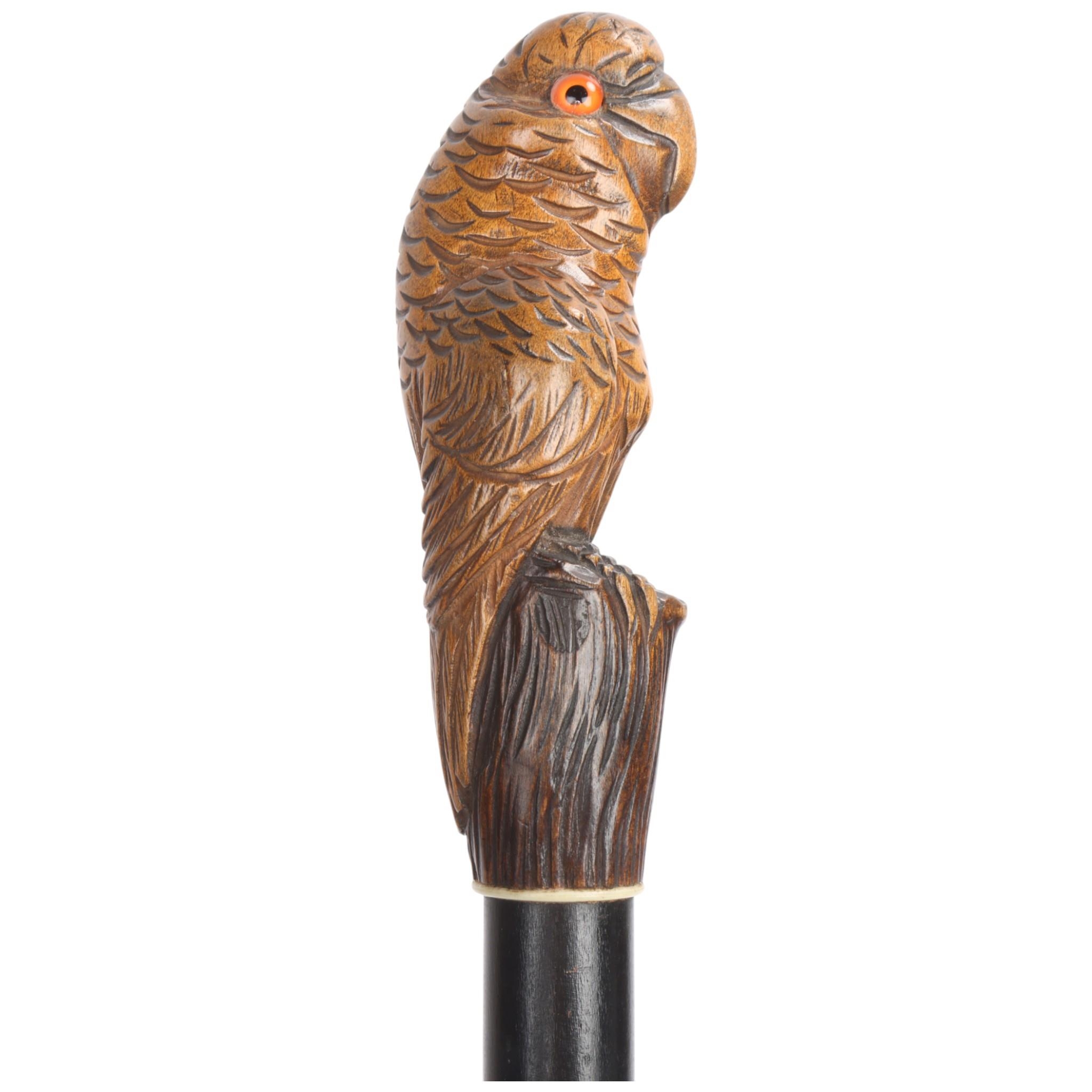 A Victorian hardwood handle cane with carved and stained as a full parrot perched on a tree trunk with inset orange glass eyes, early plastic collar, hardwood shaft painted black, metal ferrule, English, circa 1890s, length 89cm