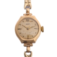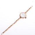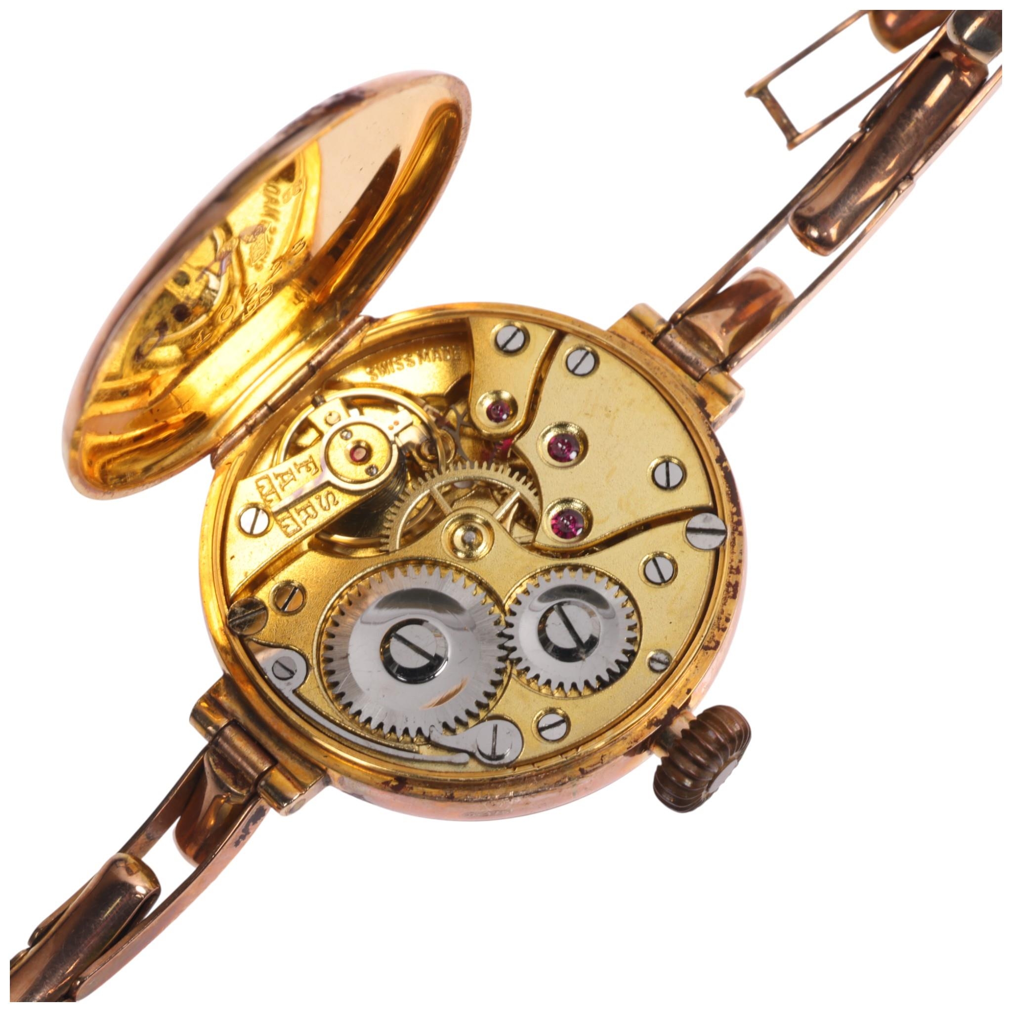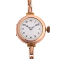 A lady's 9ct rose gold Officer's style mechanical wristwatch, white enamel dial with black Breguet numerals, blued steel lozenge hands, and 9ct gold expanding bracelet, import hallmarks London 1923, serial no. 10223, case width 25mm, 19.5g gross, working order