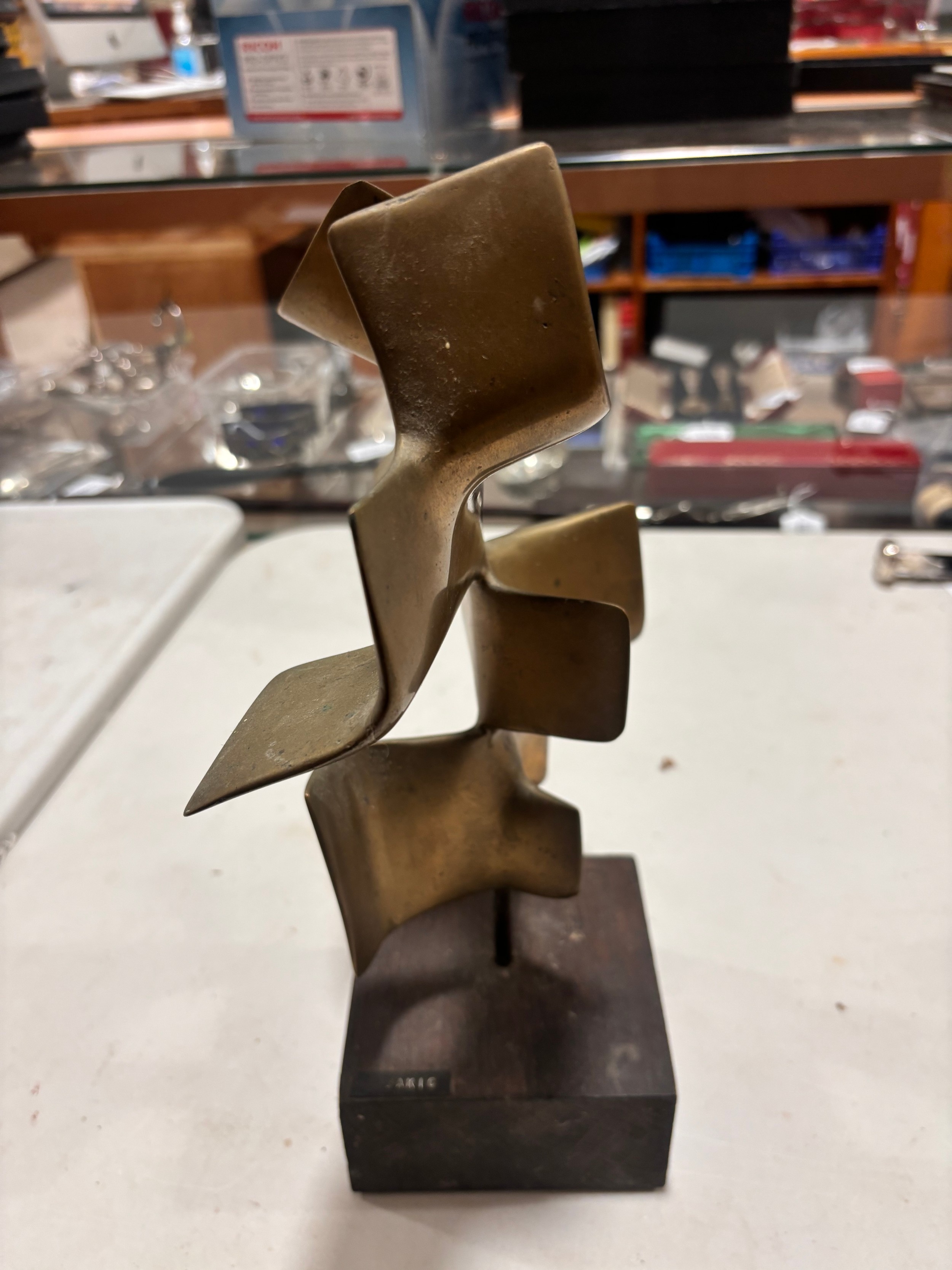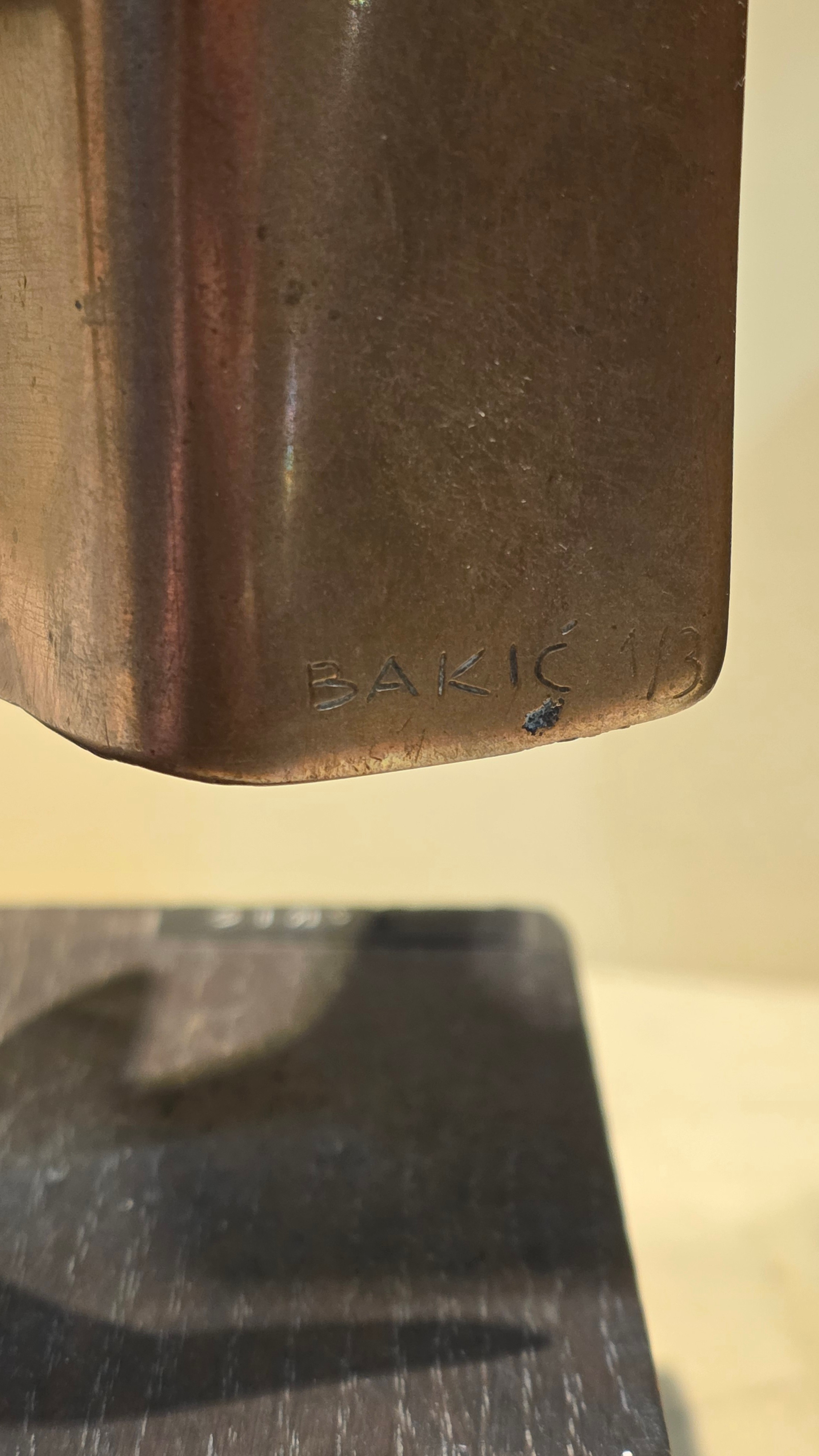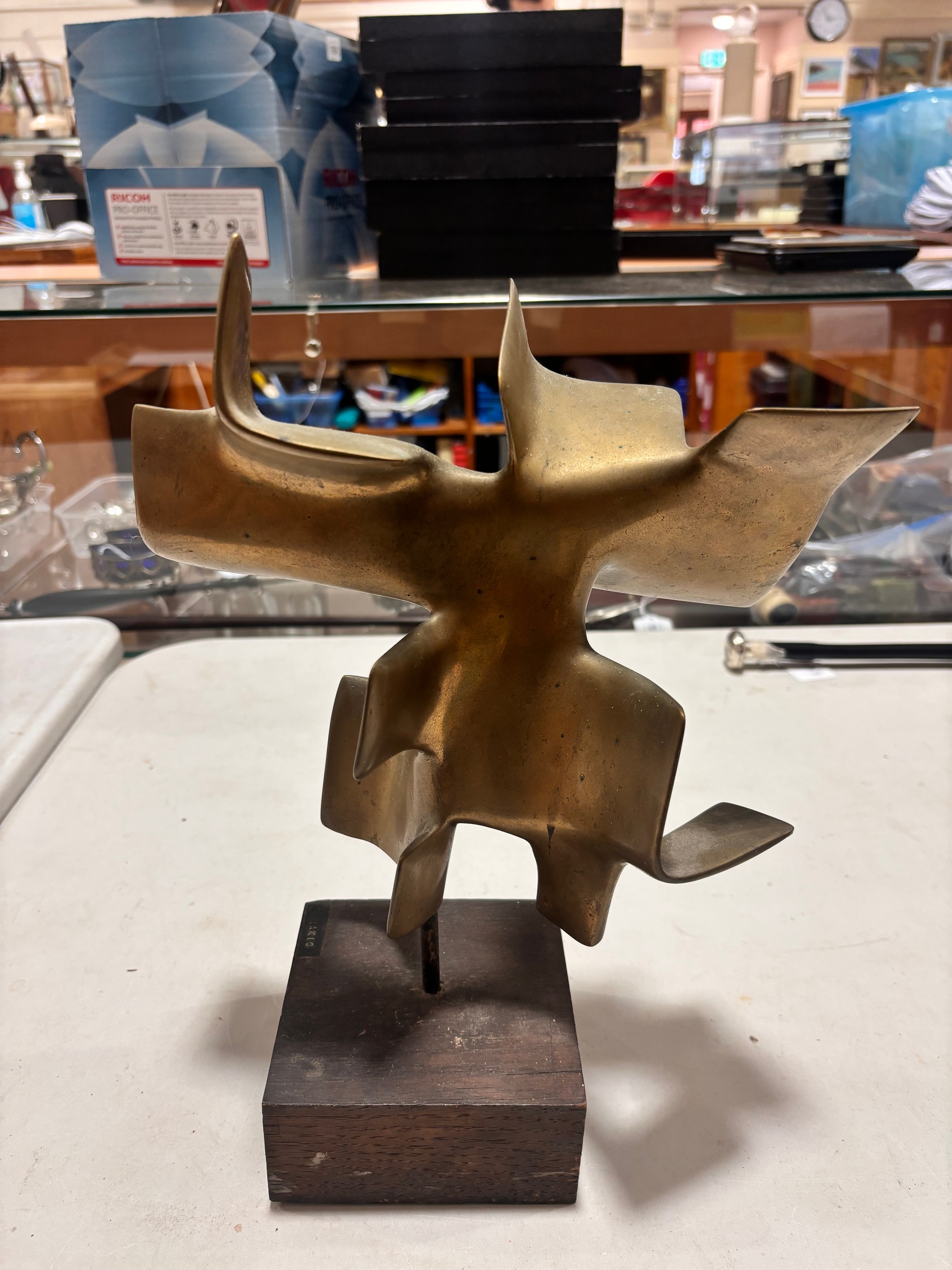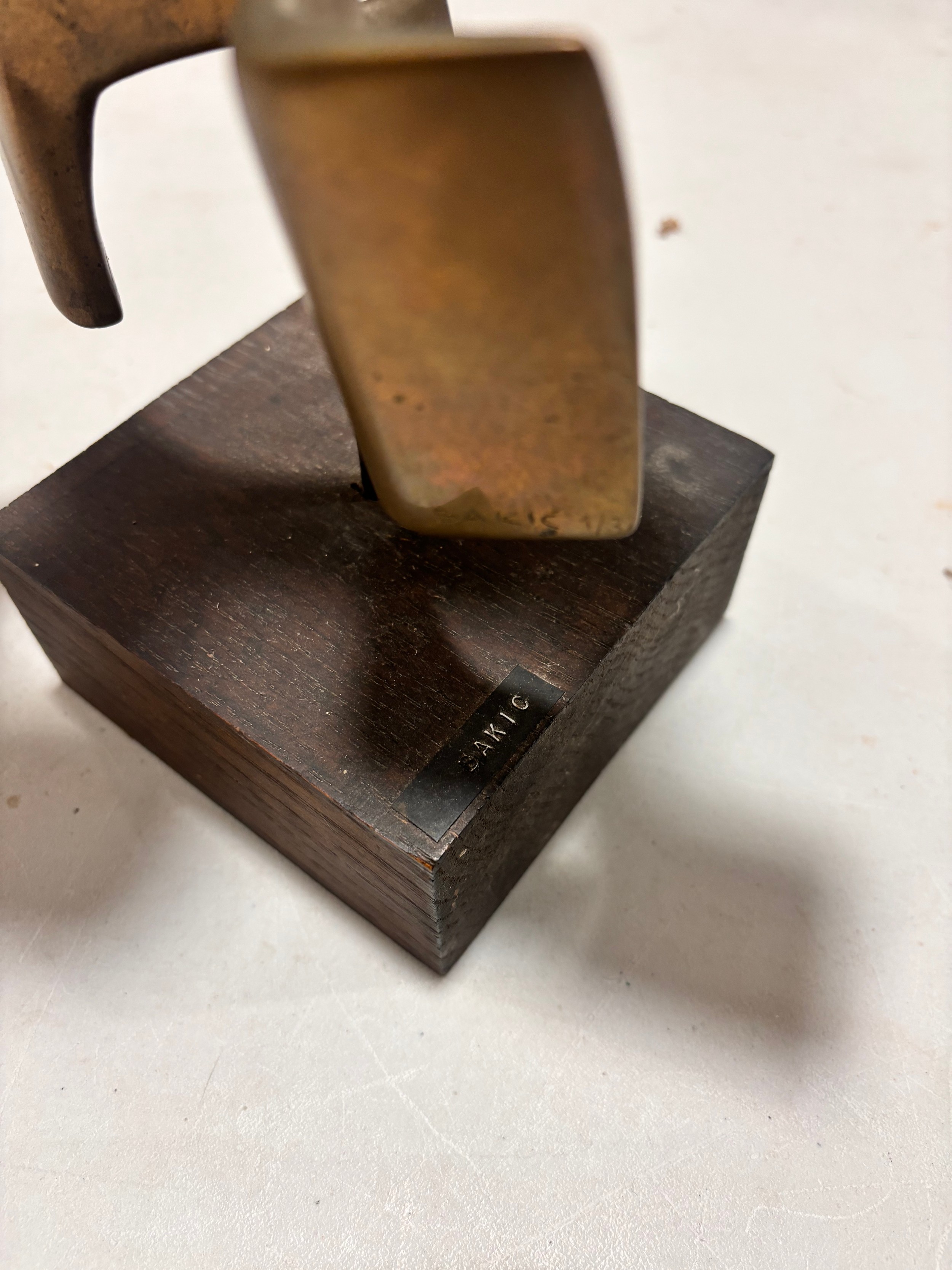 An addition square section was added to the bottom on the sculpture and has screw threading, this box section is broken to two sides, a new rod may hold this on the base or a repair to the box section may be required, otherwise good condition with slight tarnishing