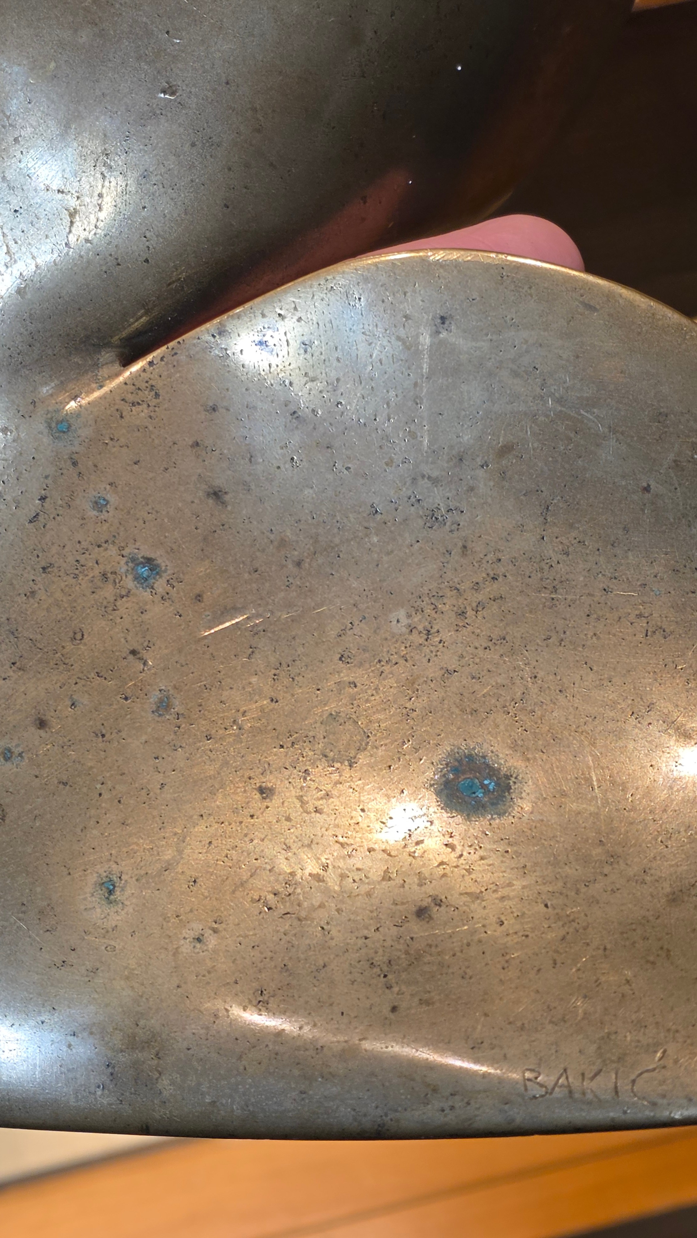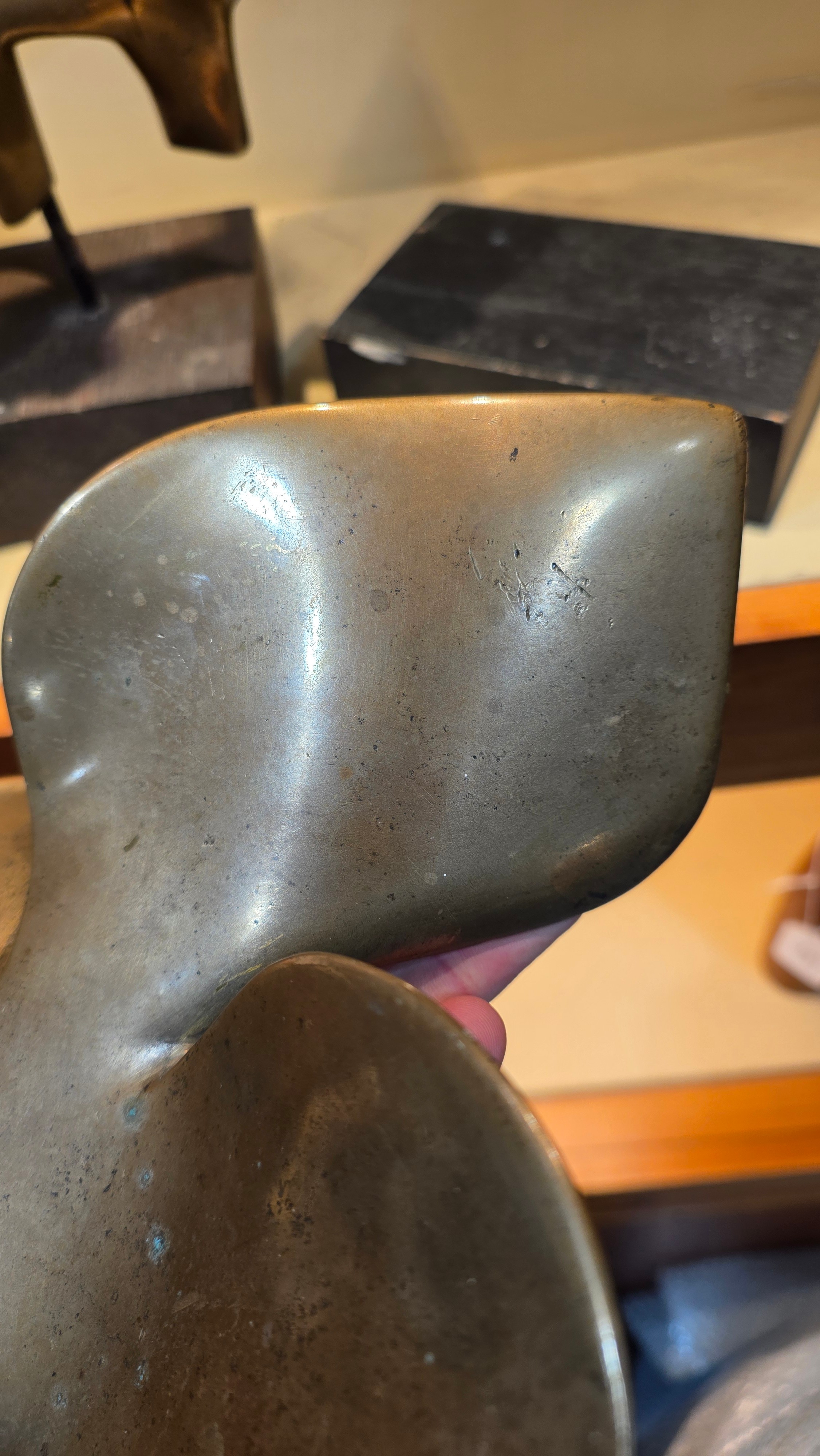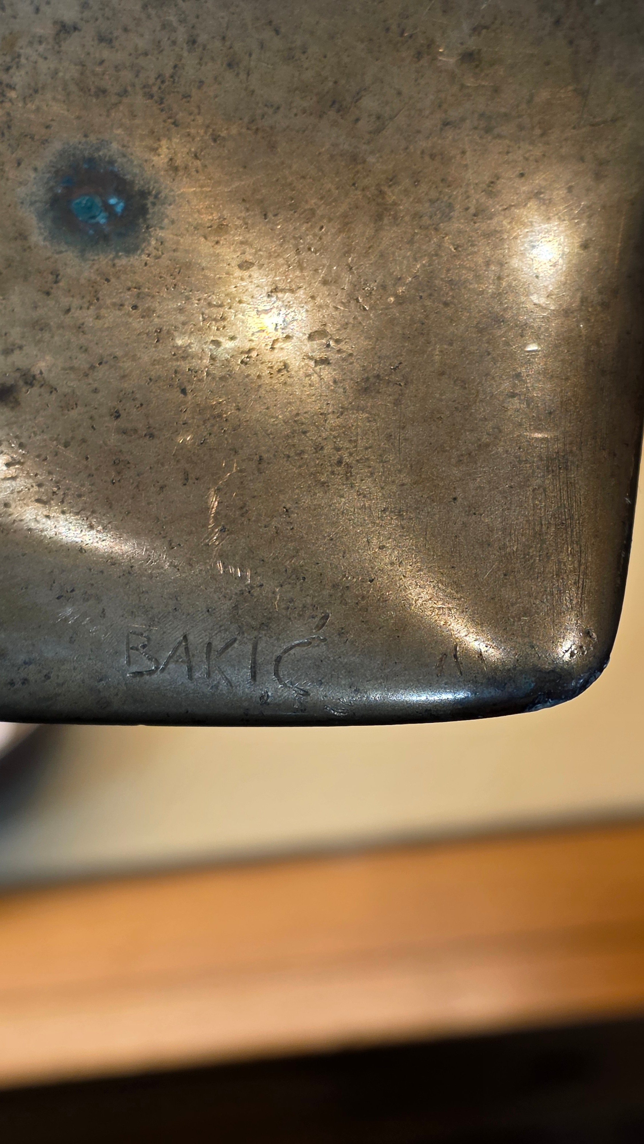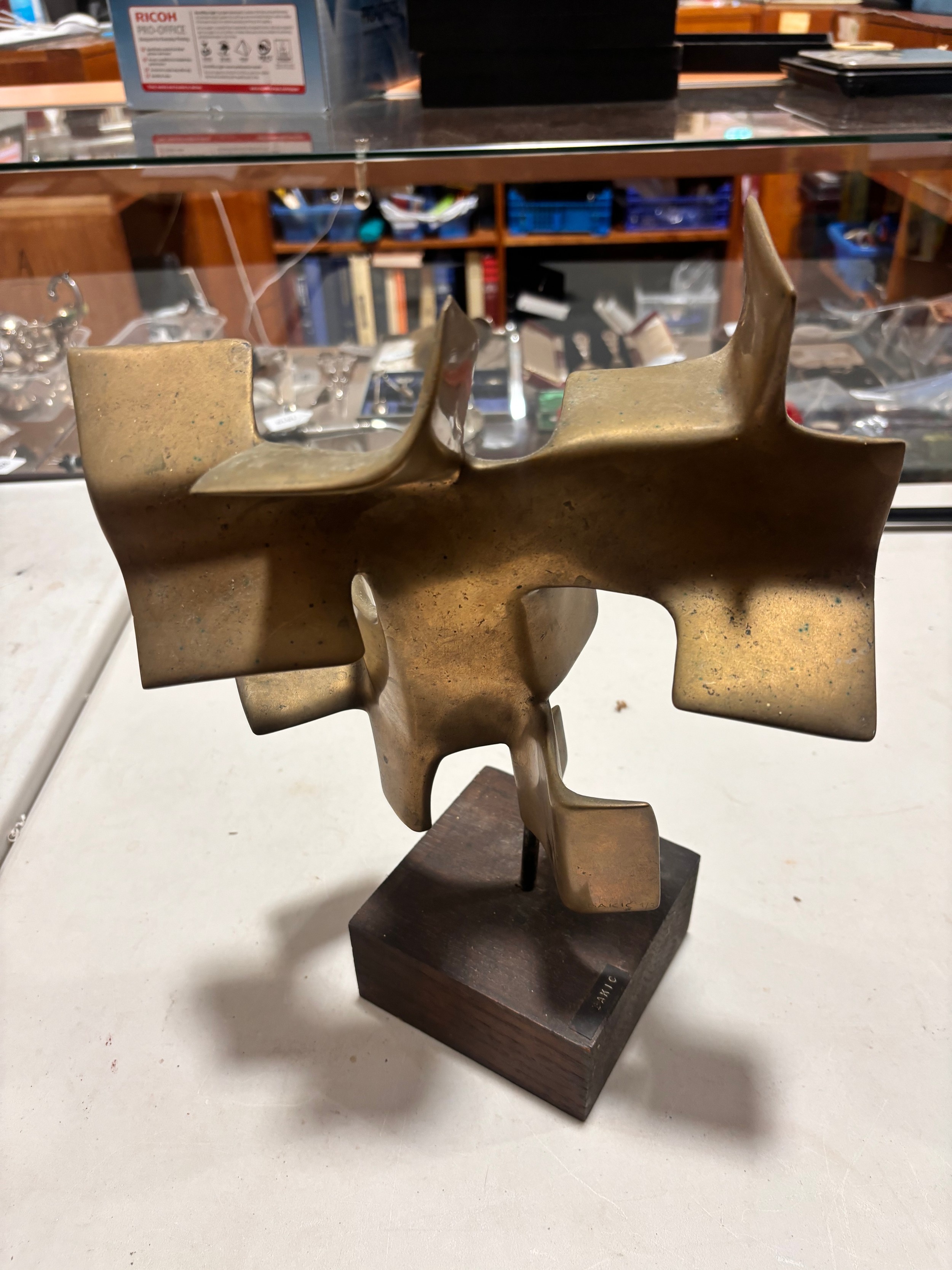 An addition square section was added to the bottom on the sculpture and has screw threading, this box section is broken to two sides, a new rod may hold this on the base or a repair to the box section may be required, otherwise good condition with slight tarnishing