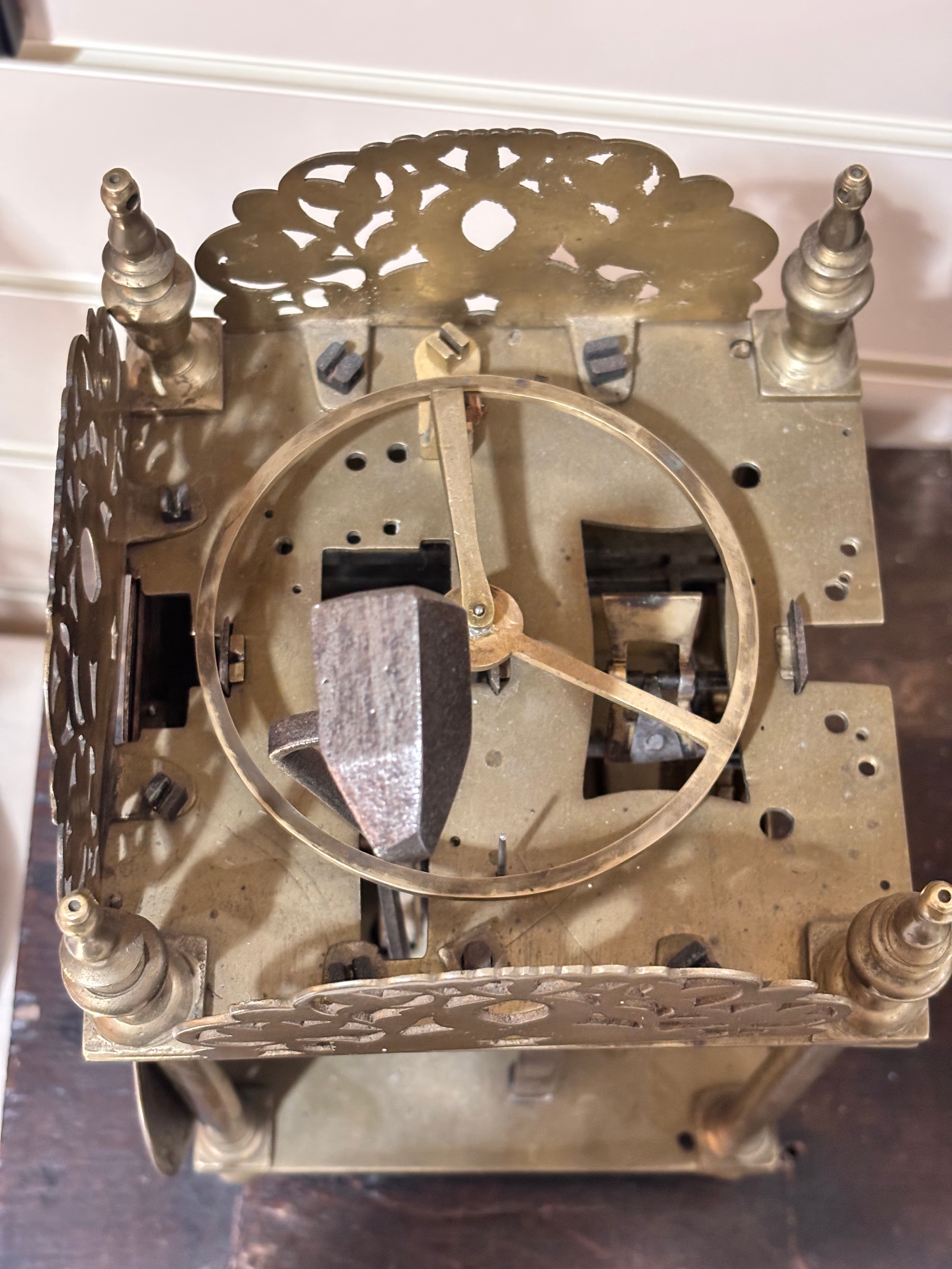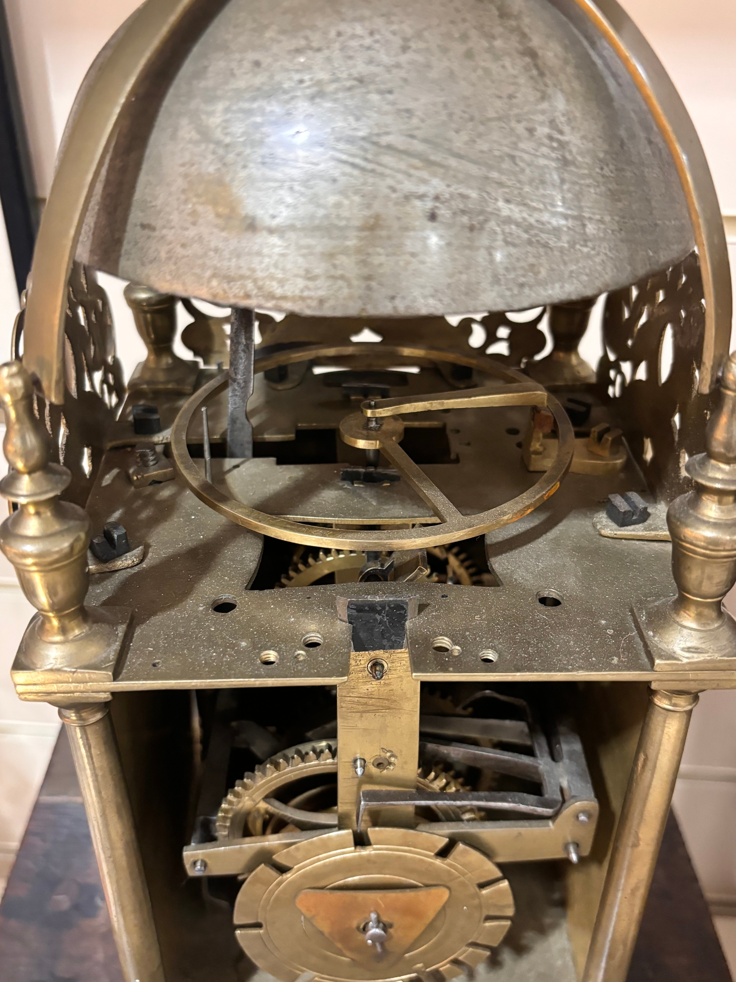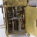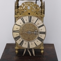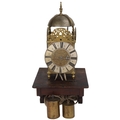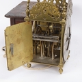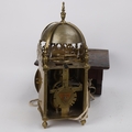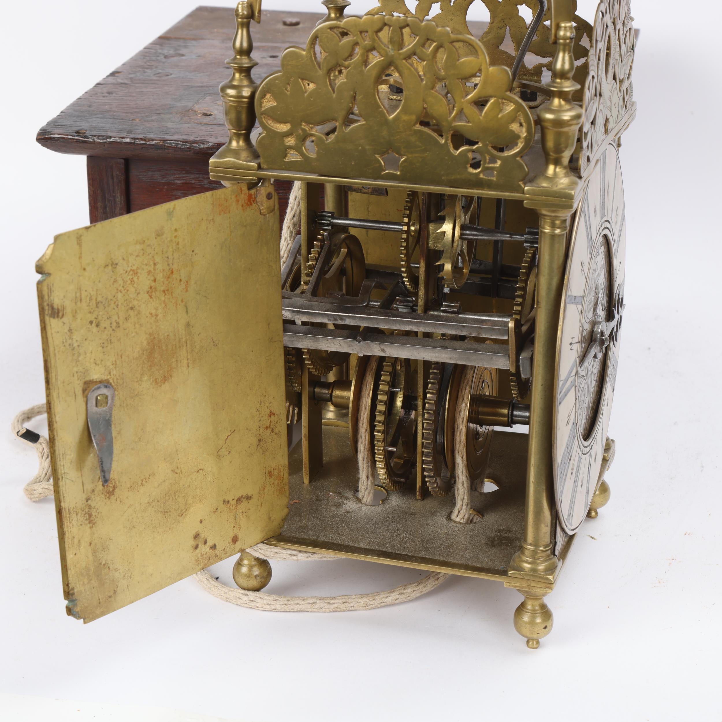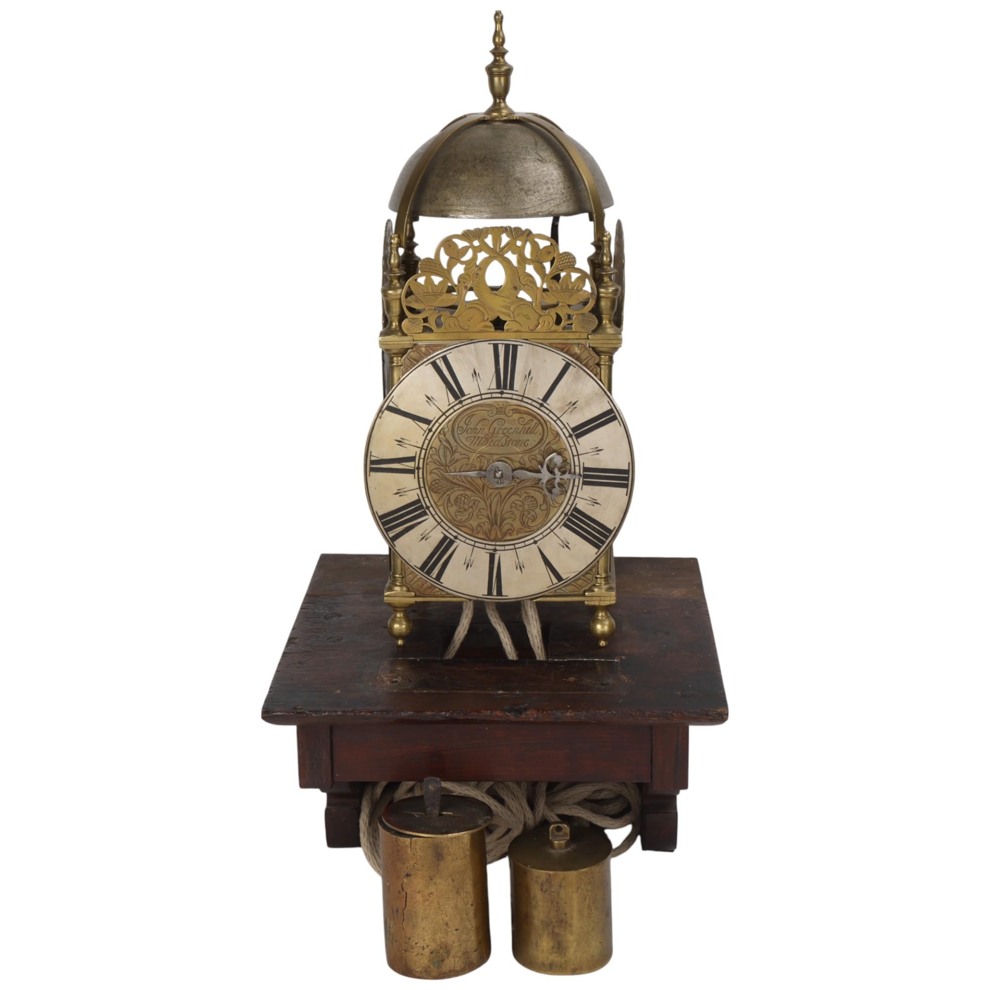 A 17th century brass lantern clock, by John Greenhill of Maidstone, circa 1680, horizontal balance wheel, with silvered chapter ring and engraved centre panel, pierced and engraved central fret with brass weights, height 37cm, together with an oak wall bracket, in working order