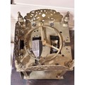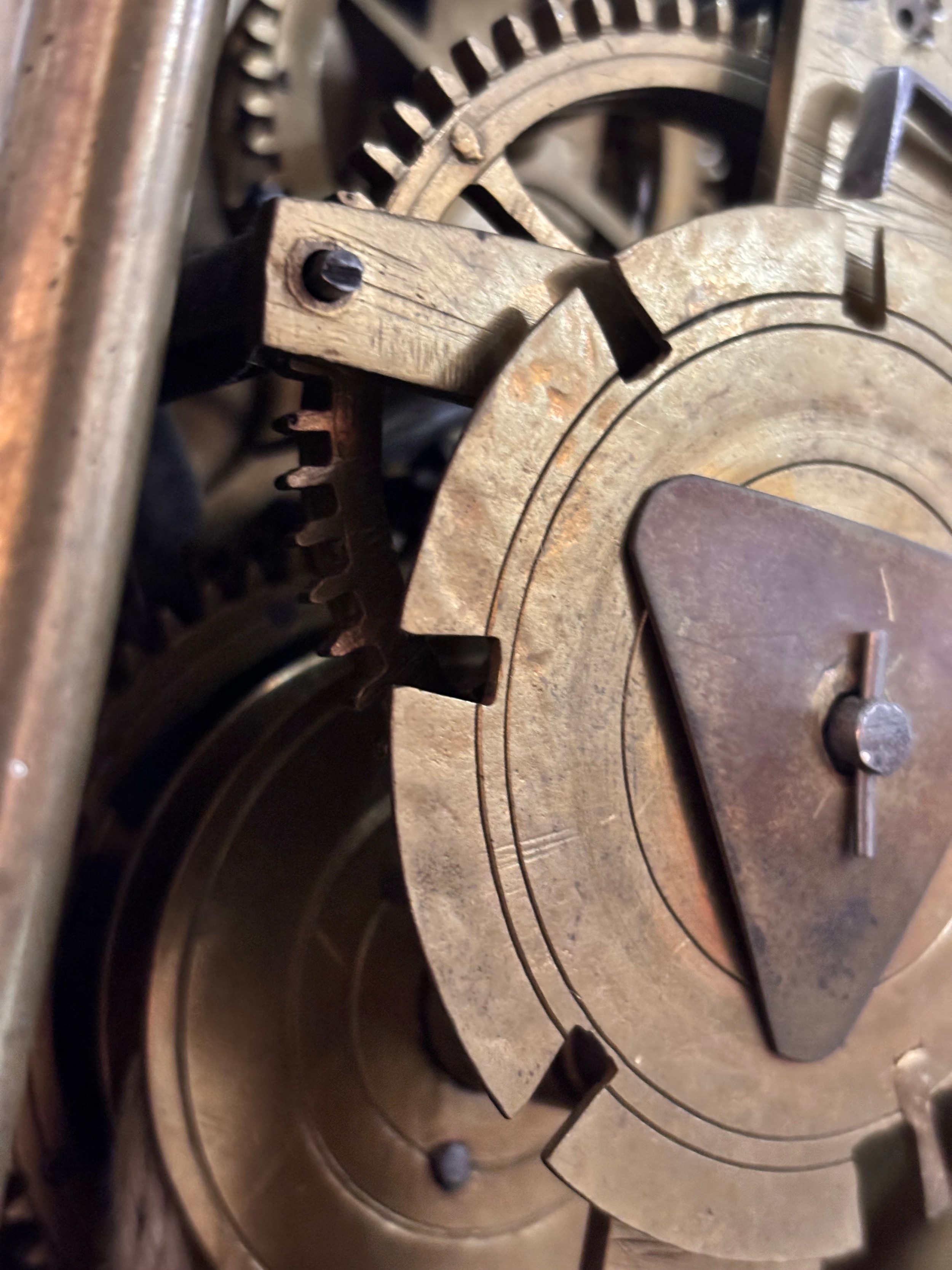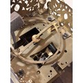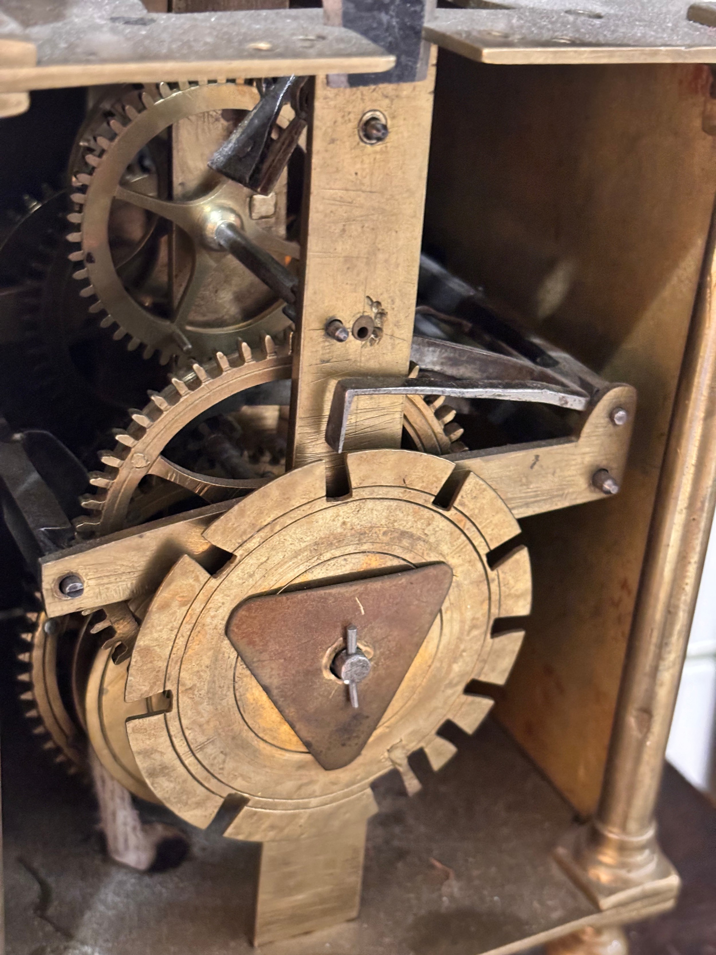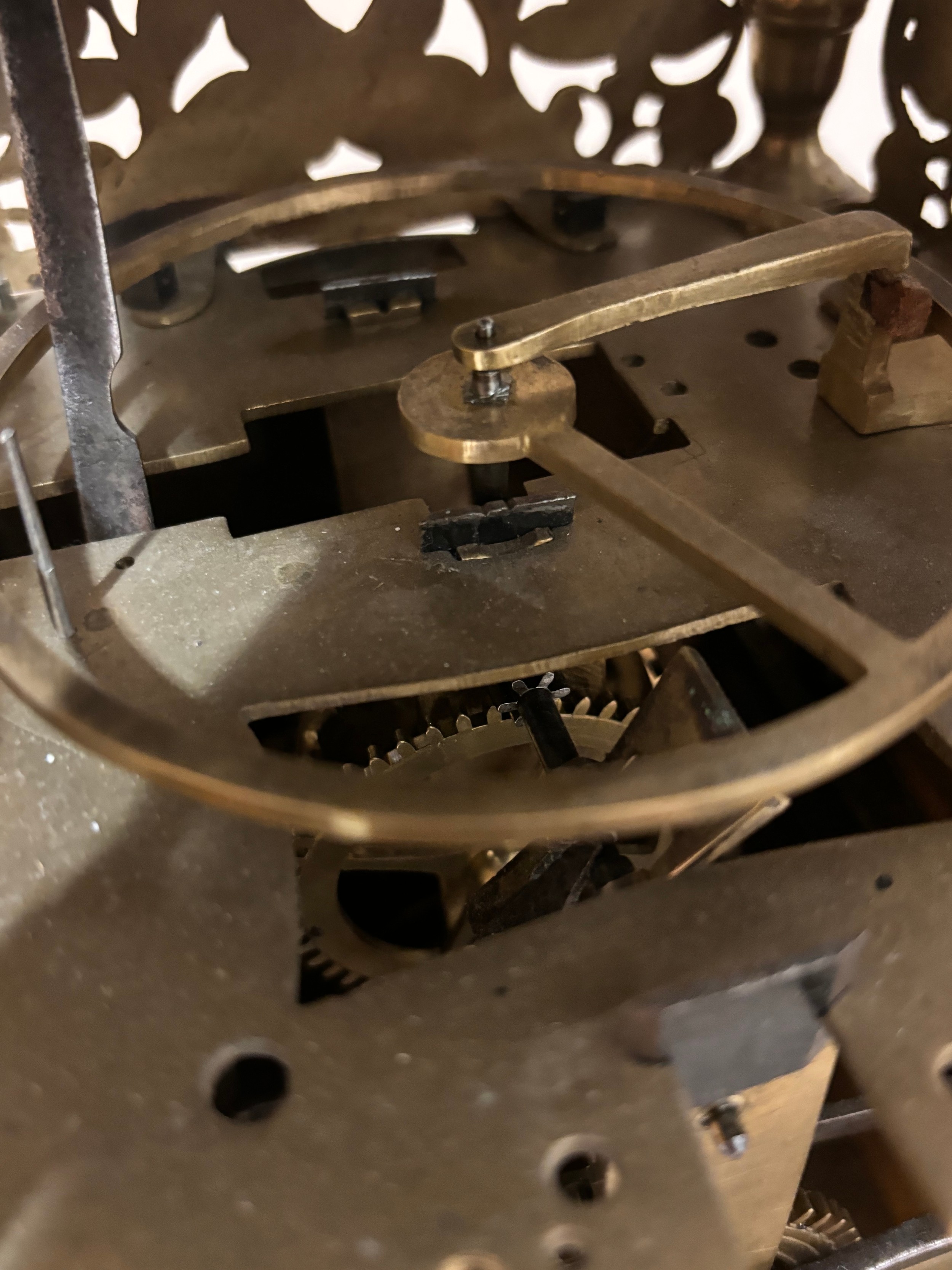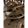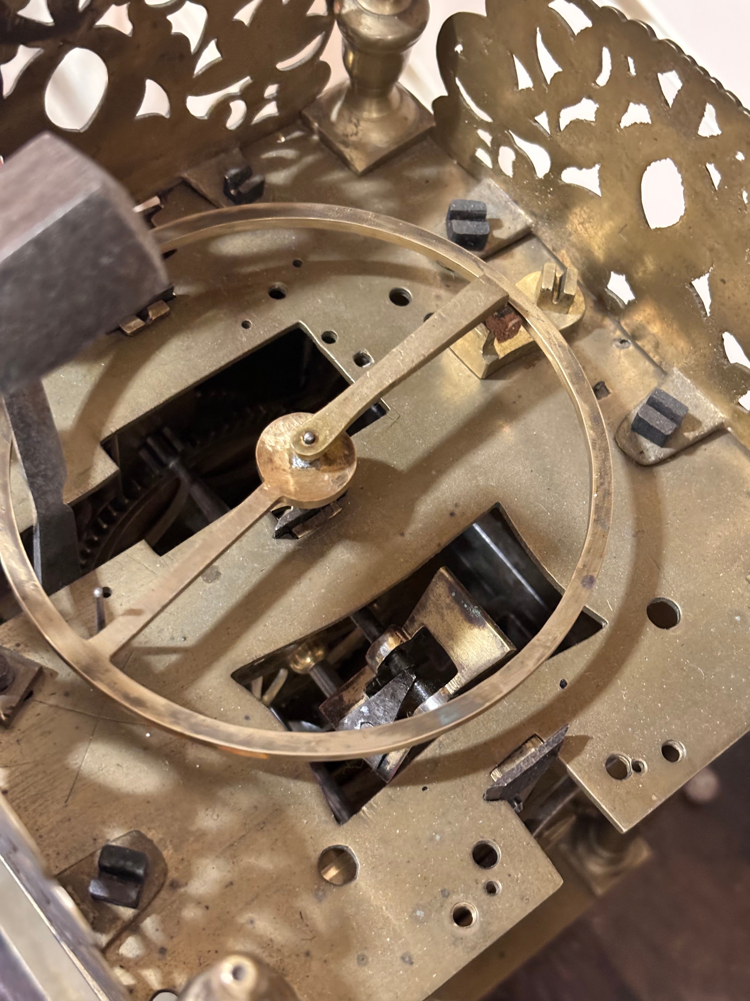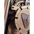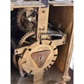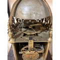 A 17th century brass lantern clock, by John Greenhill of Maidstone, circa 1680, horizontal balance wheel, with silvered chapter ring and engraved centre panel, pierced and engraved central fret with brass weights, height 37cm, together with an oak wall bracket, in working order