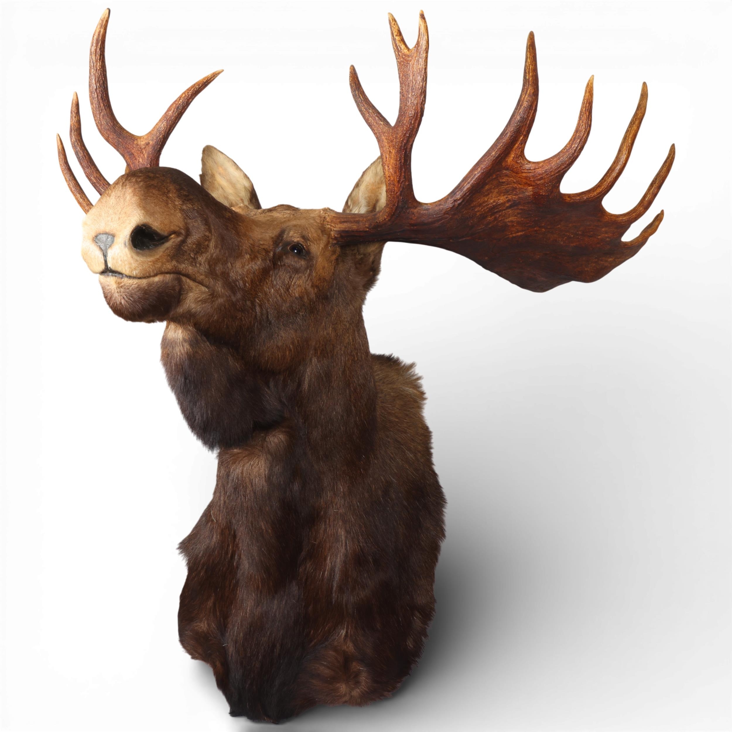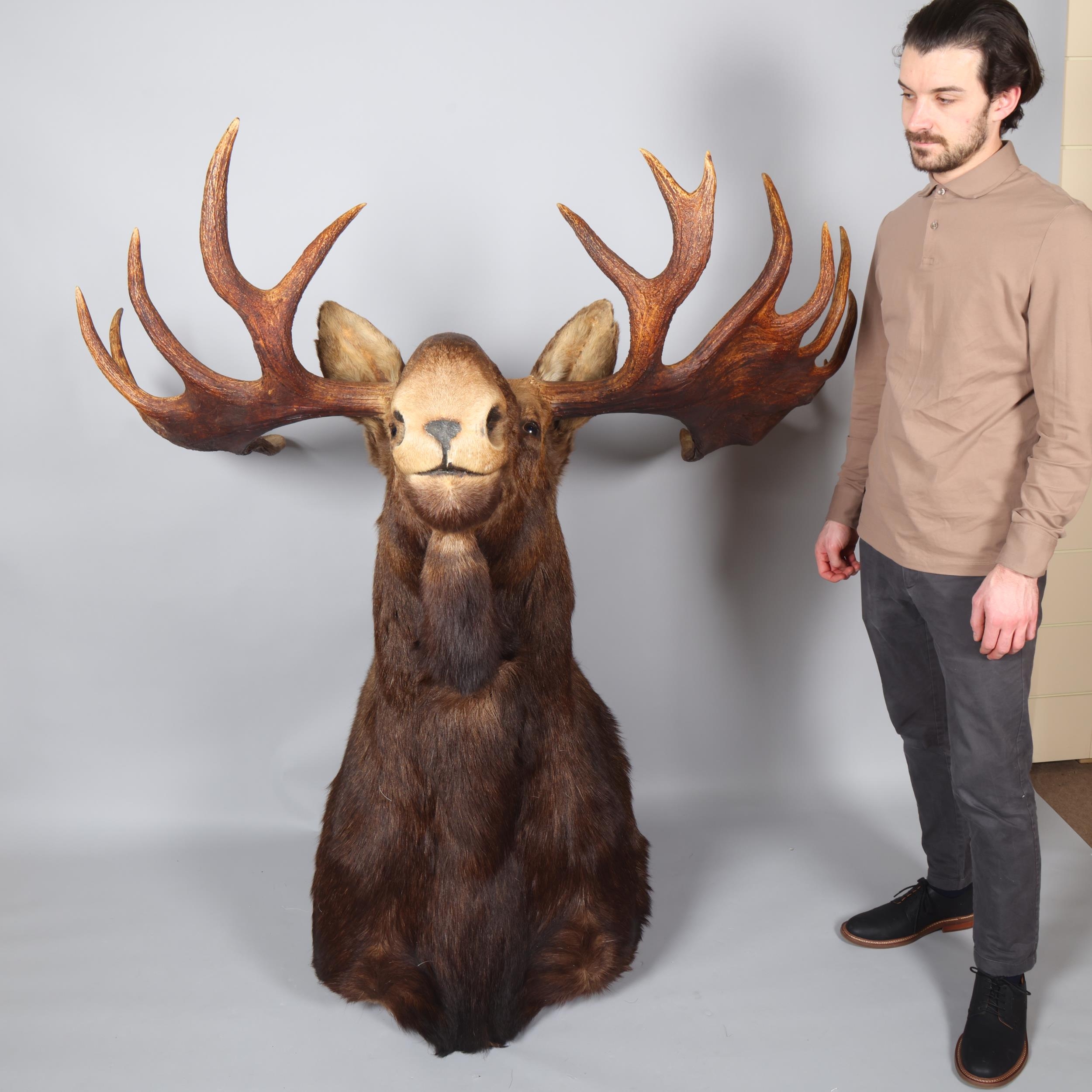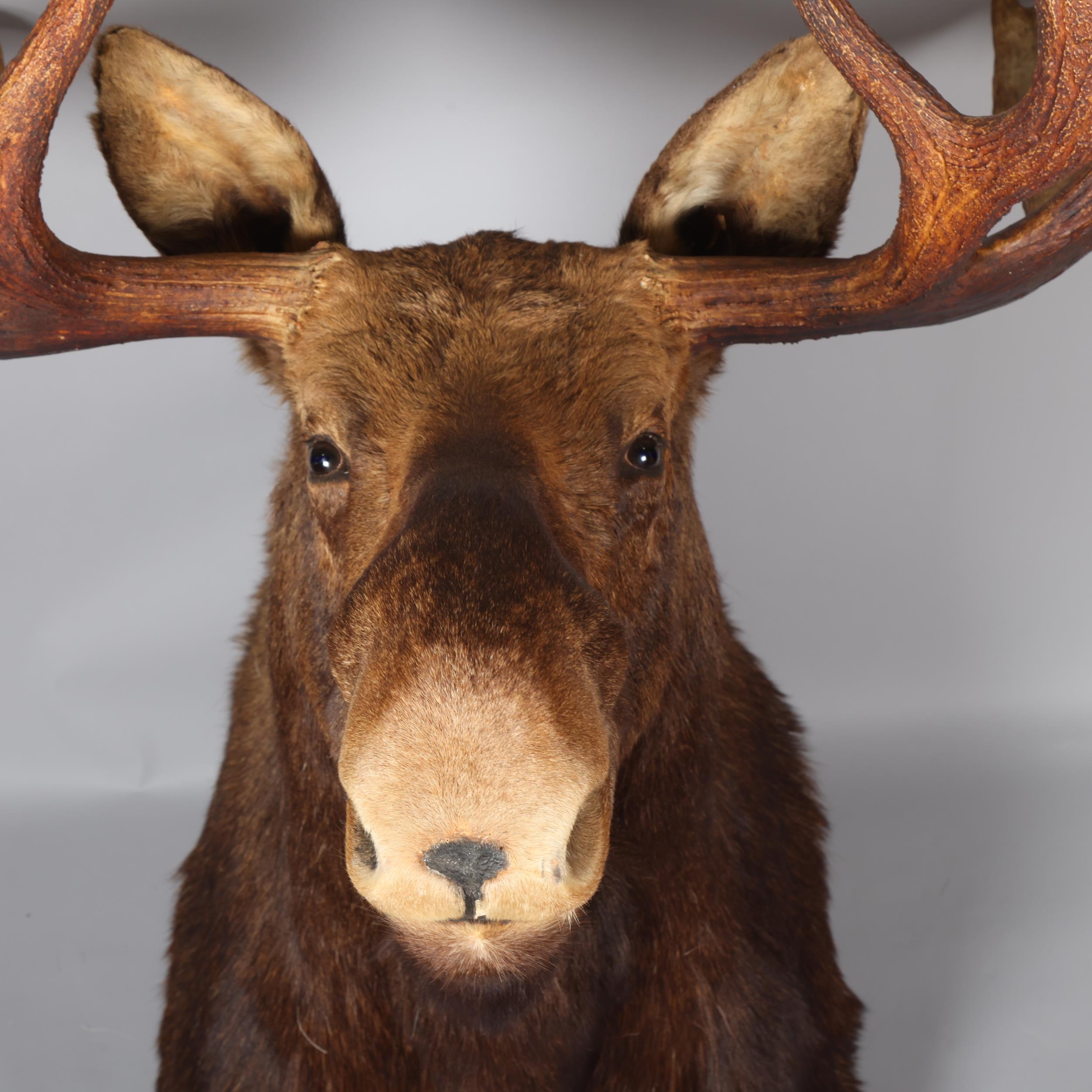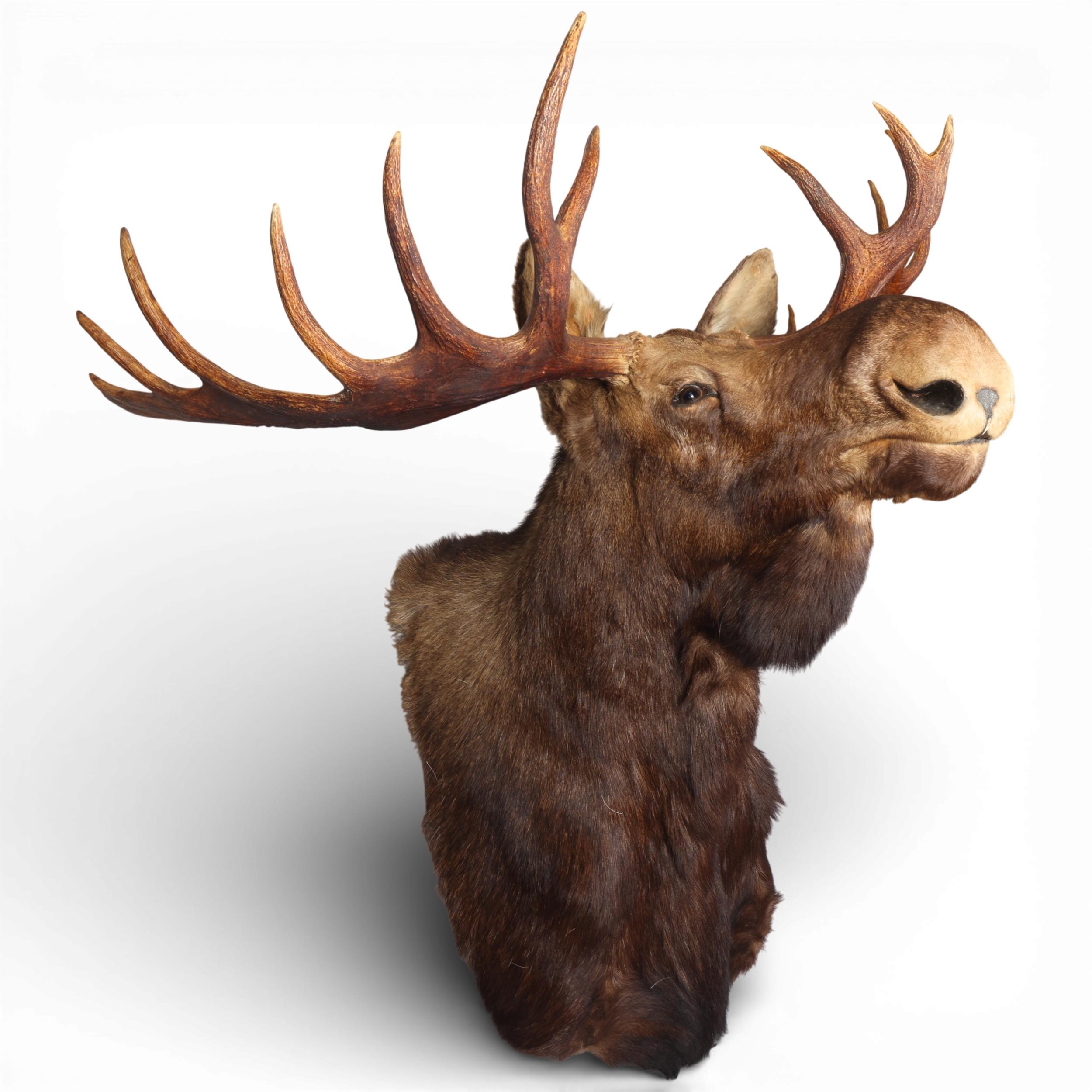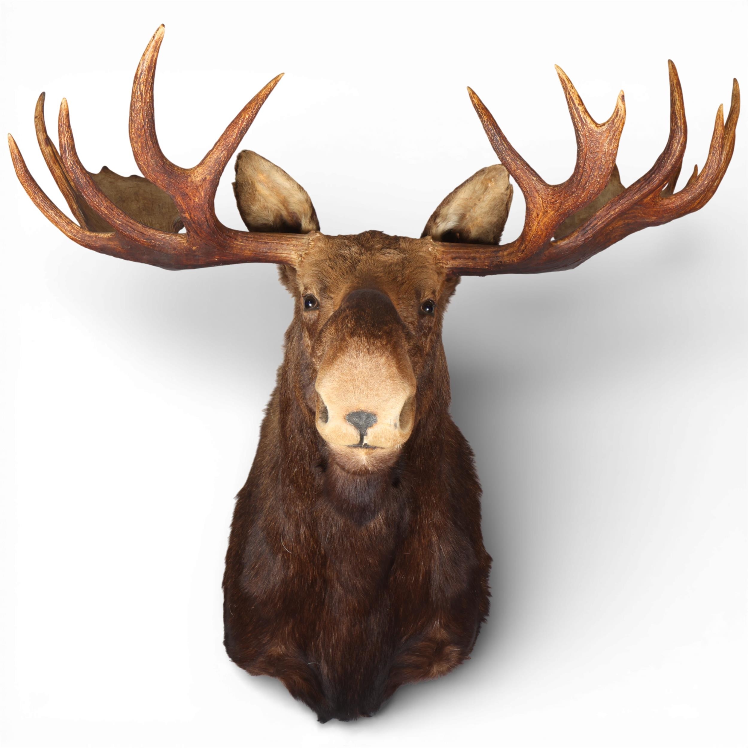 TAXIDERMY - a massive adult moose (Alces alces) head, should mount with 13-point antlers, span of antlers approx 1.5m, overall height approx 1.4m, CITES exempt, however prospective bidders should check export documentation requirements before bidding