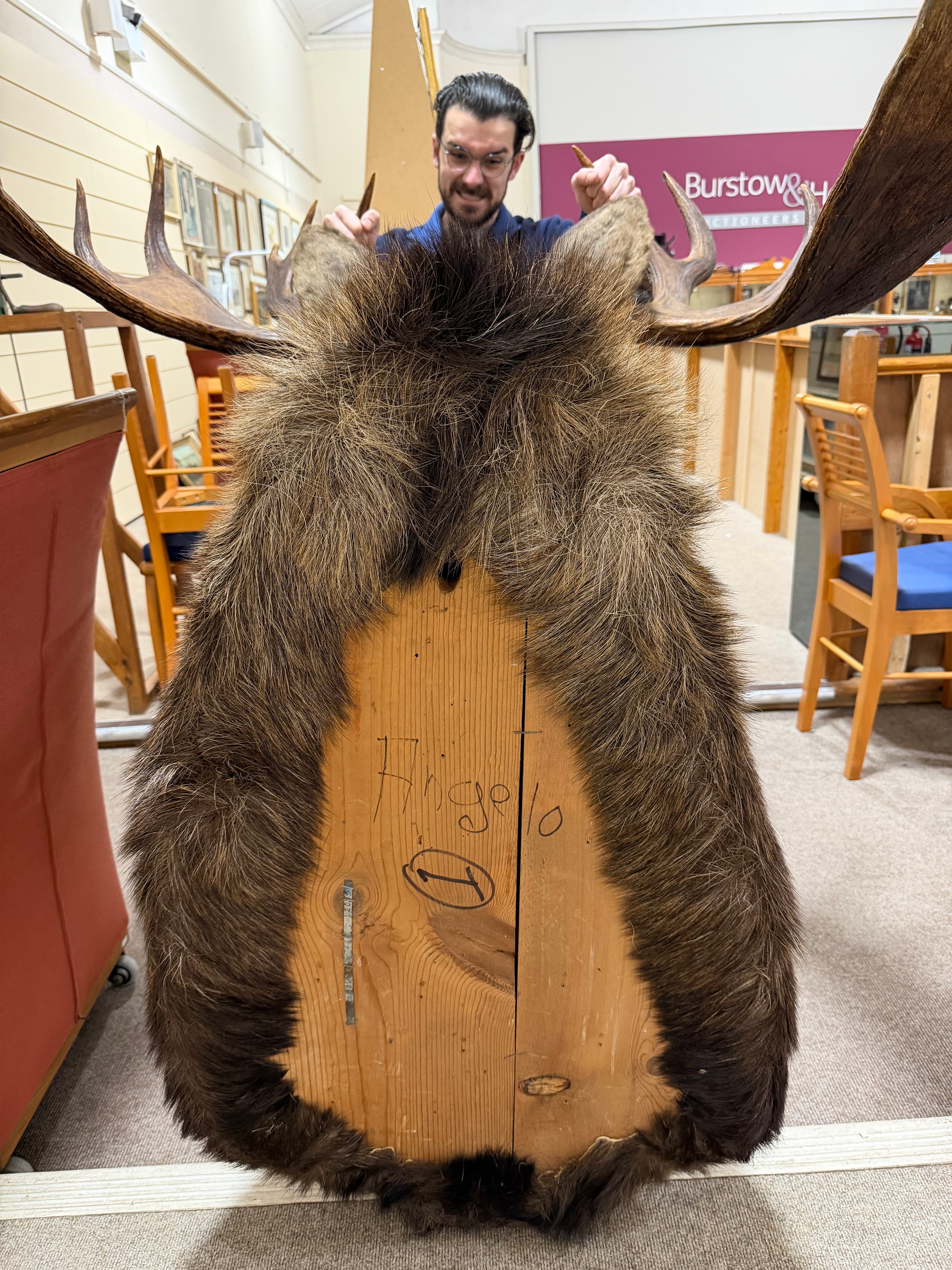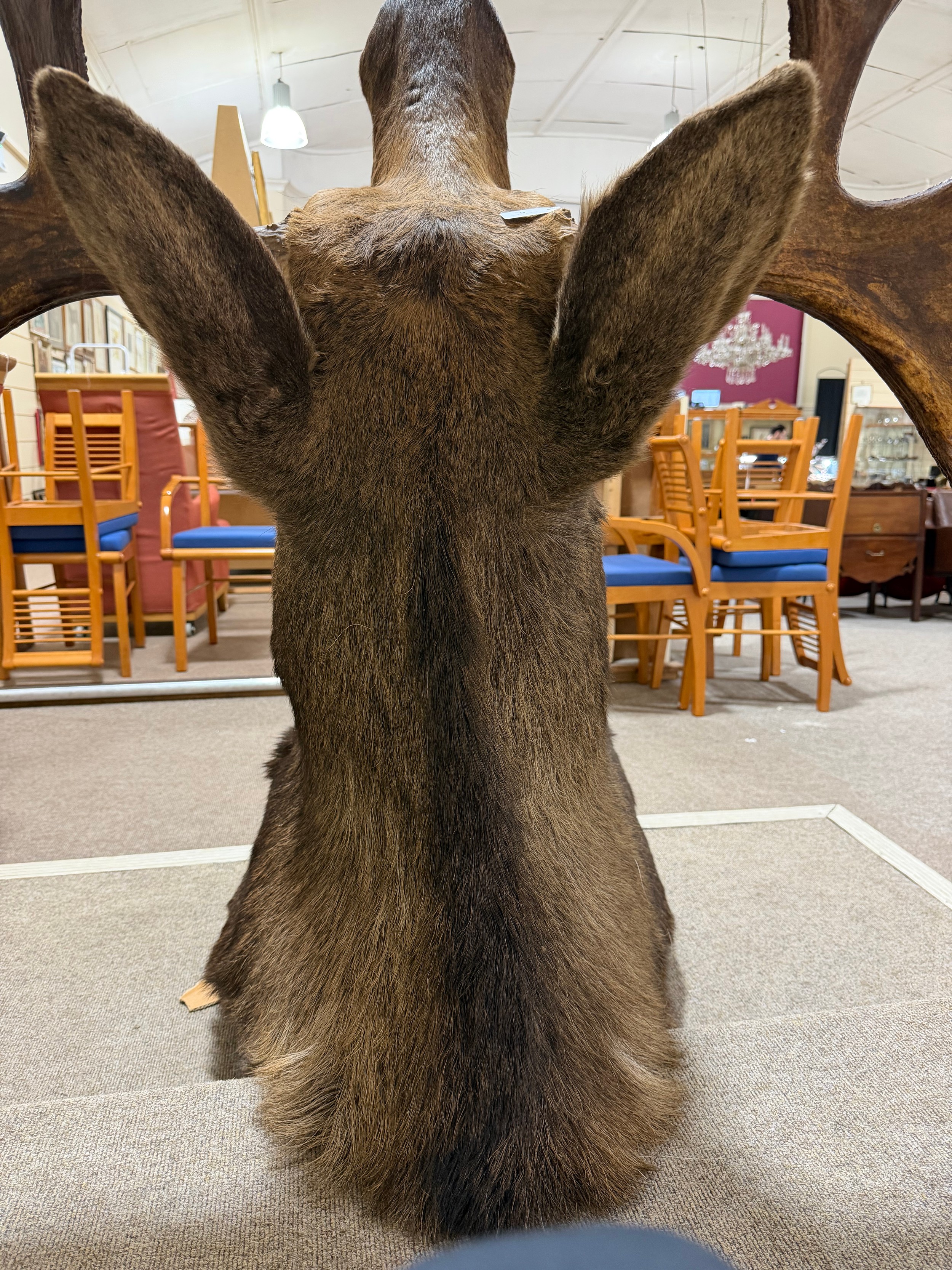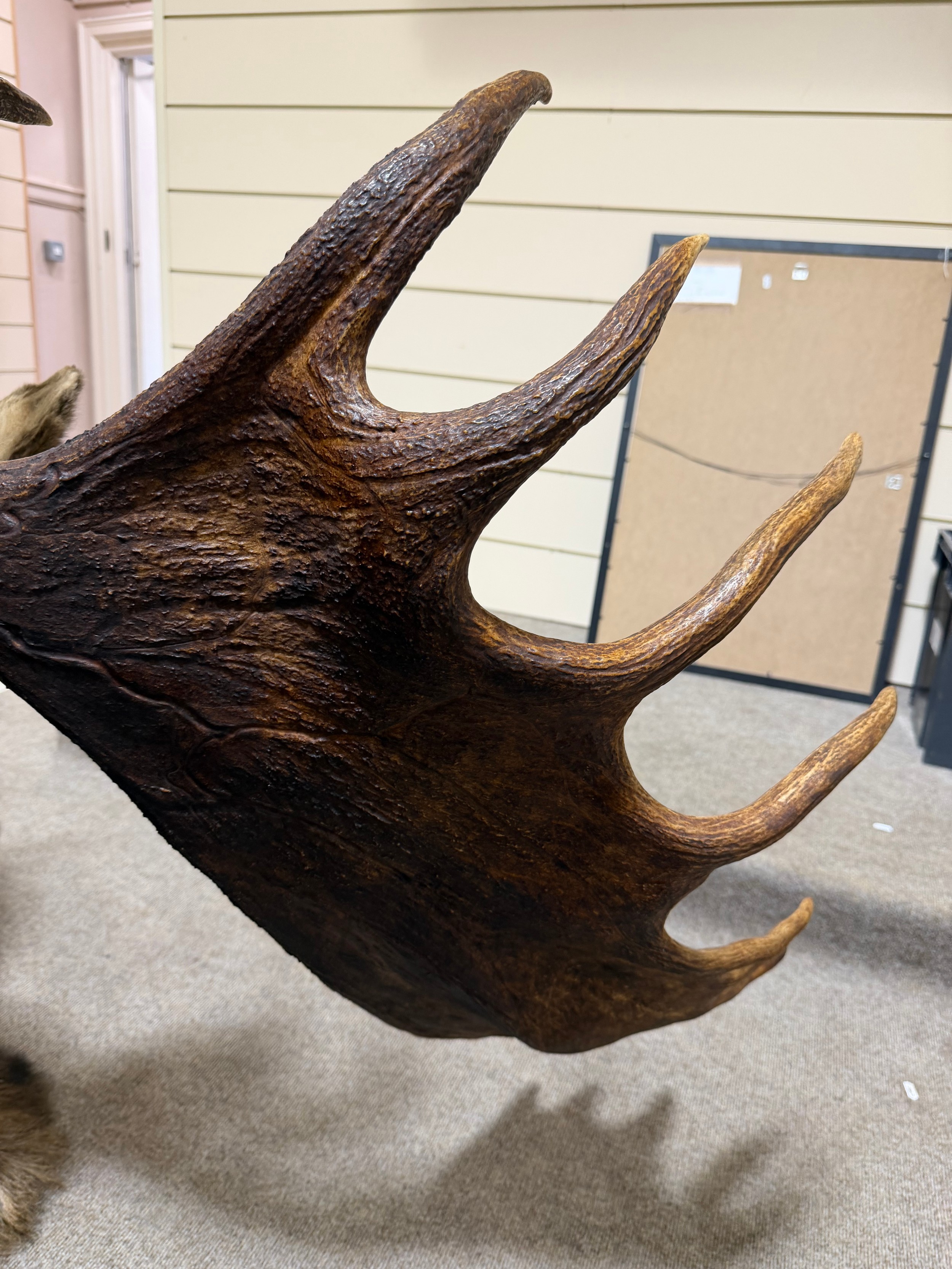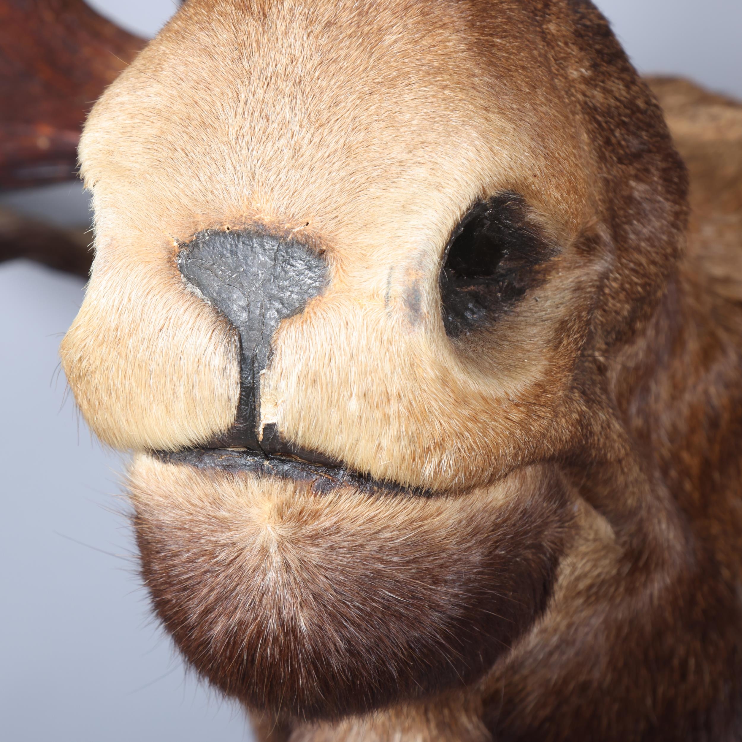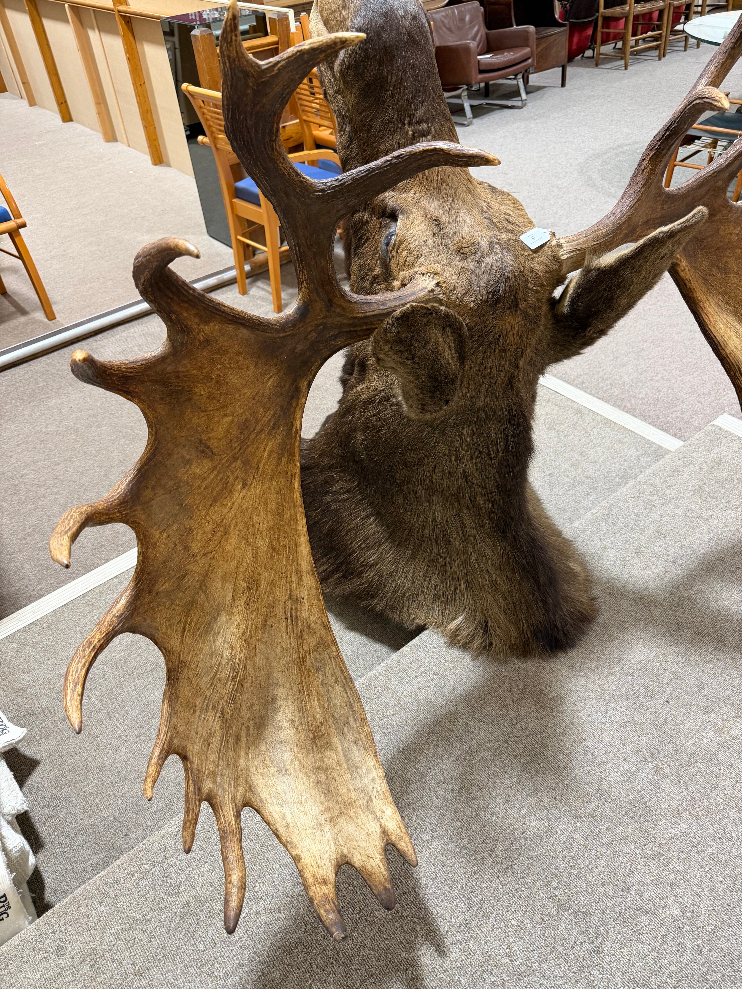 TAXIDERMY - a massive adult moose (Alces alces) head, should mount with 13-point antlers, span of antlers approx 1.5m, overall height approx 1.4m, CITES exempt, however prospective bidders should check export documentation requirements before bidding