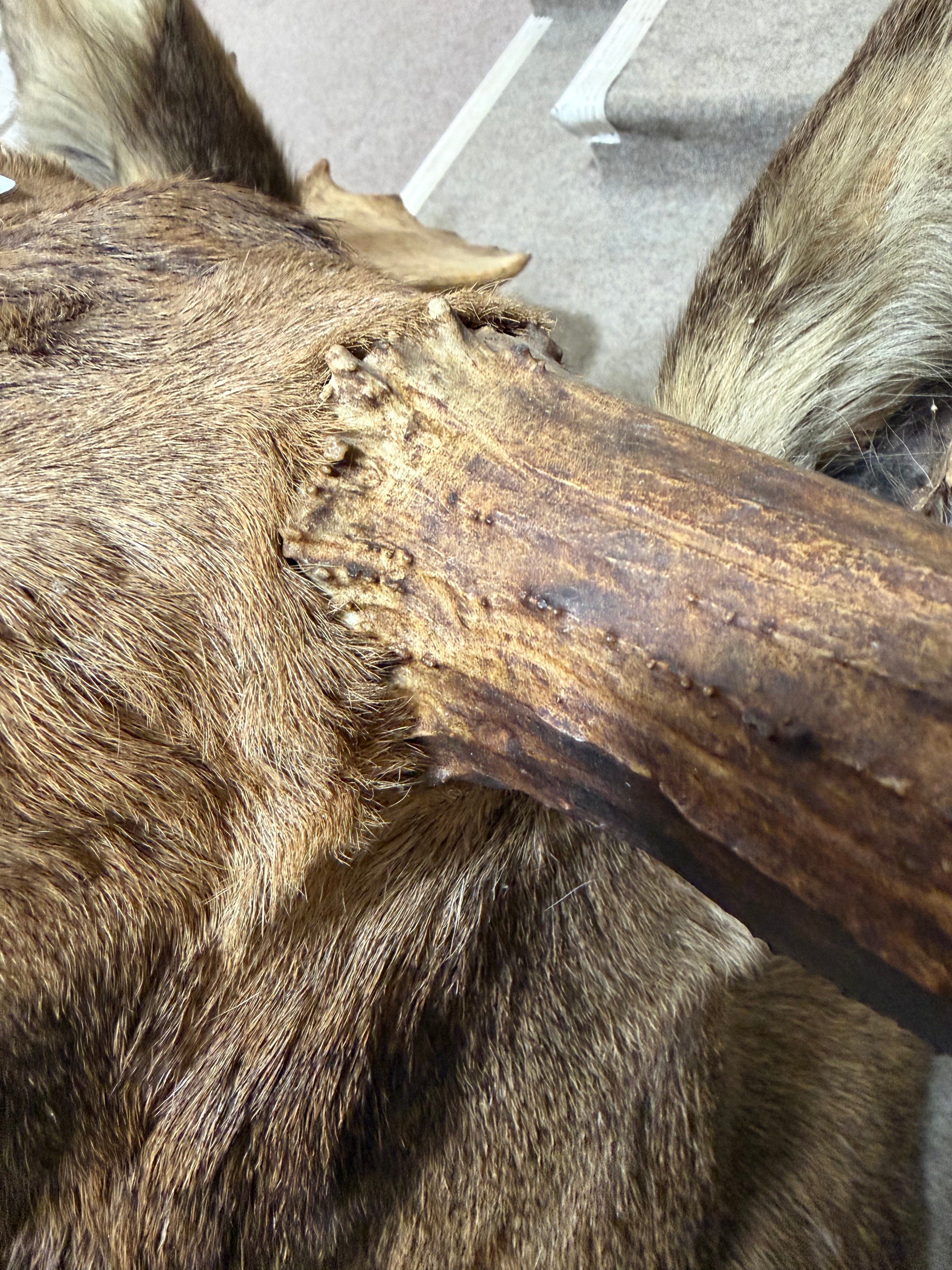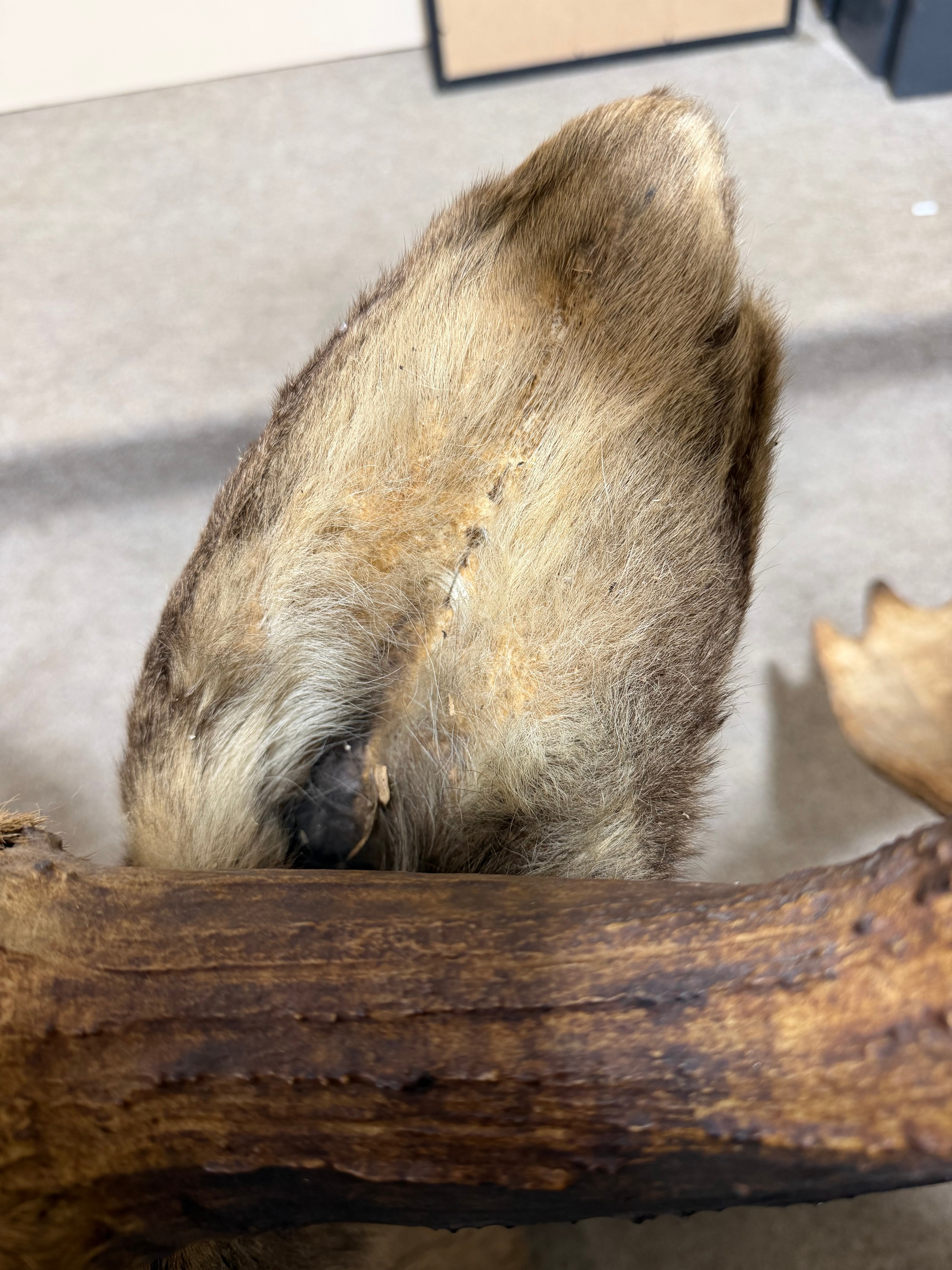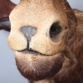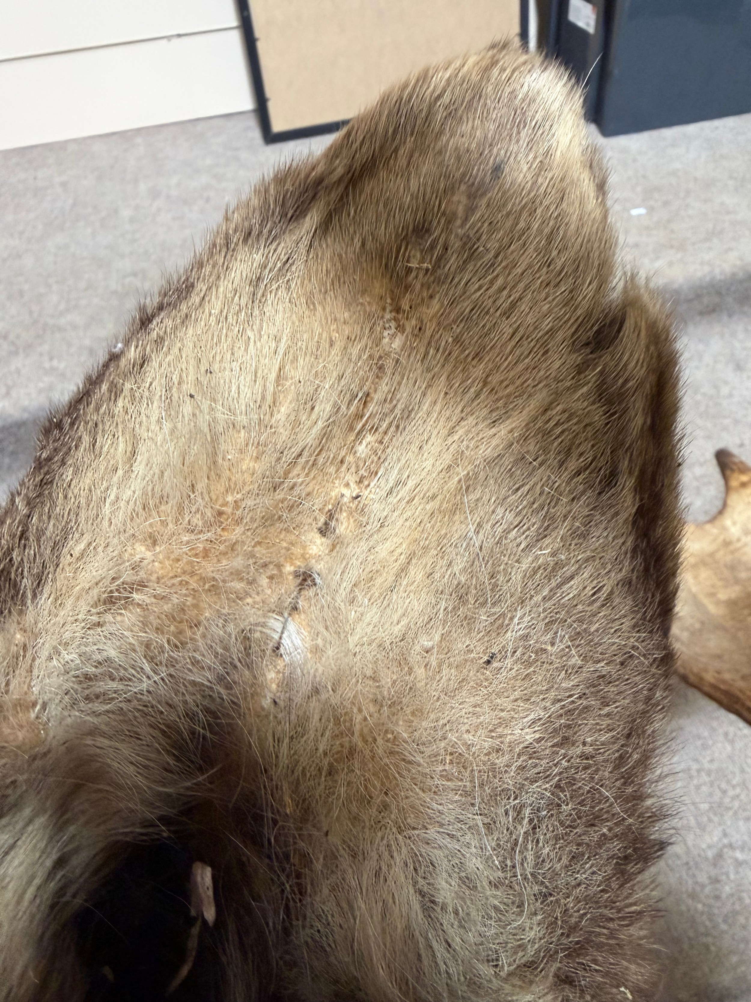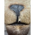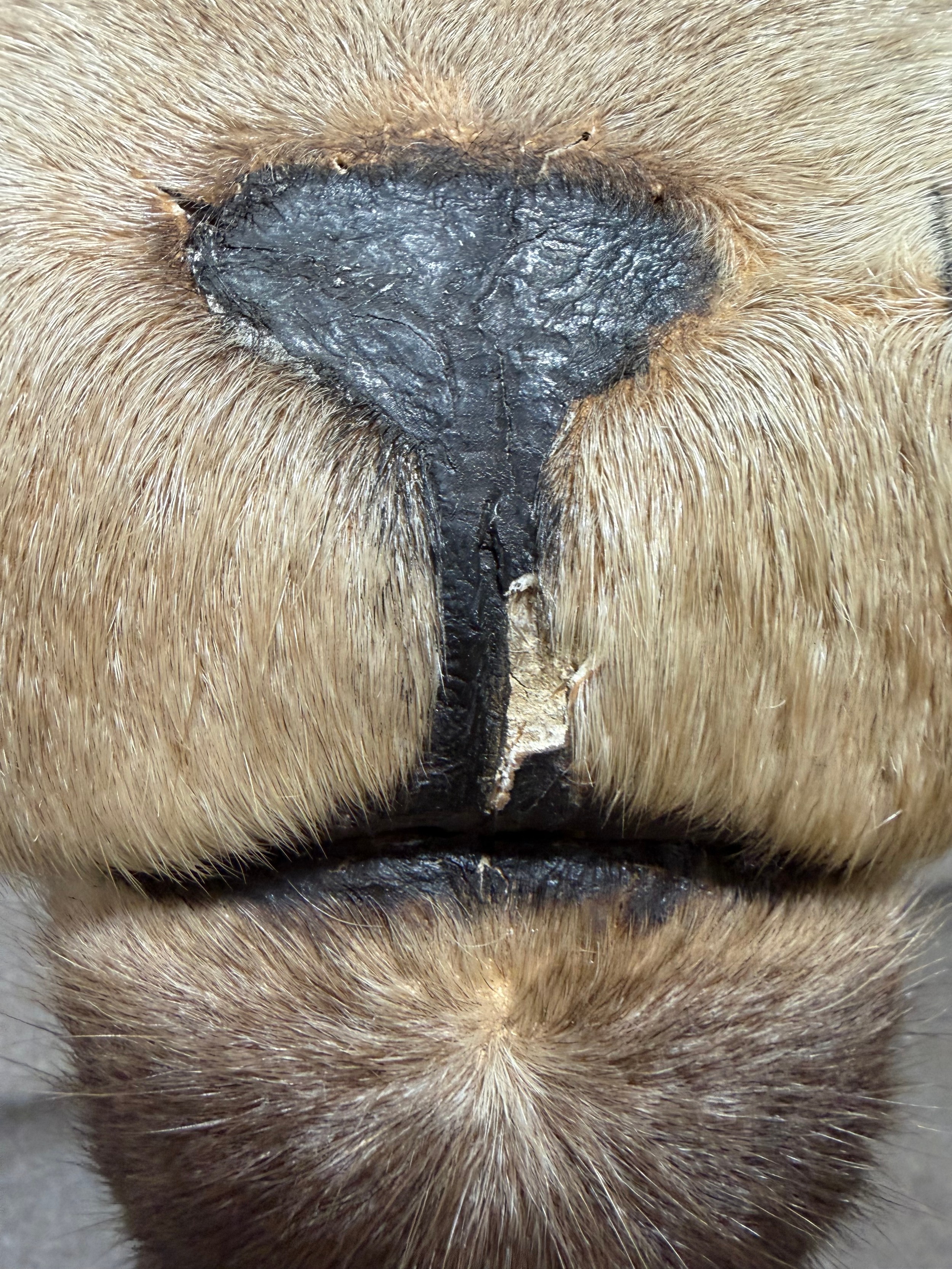 Good condition, some light hair loss to the ears and visible seams here. Losses to the mouth section and the horns are firmly attached and cannot be removed.