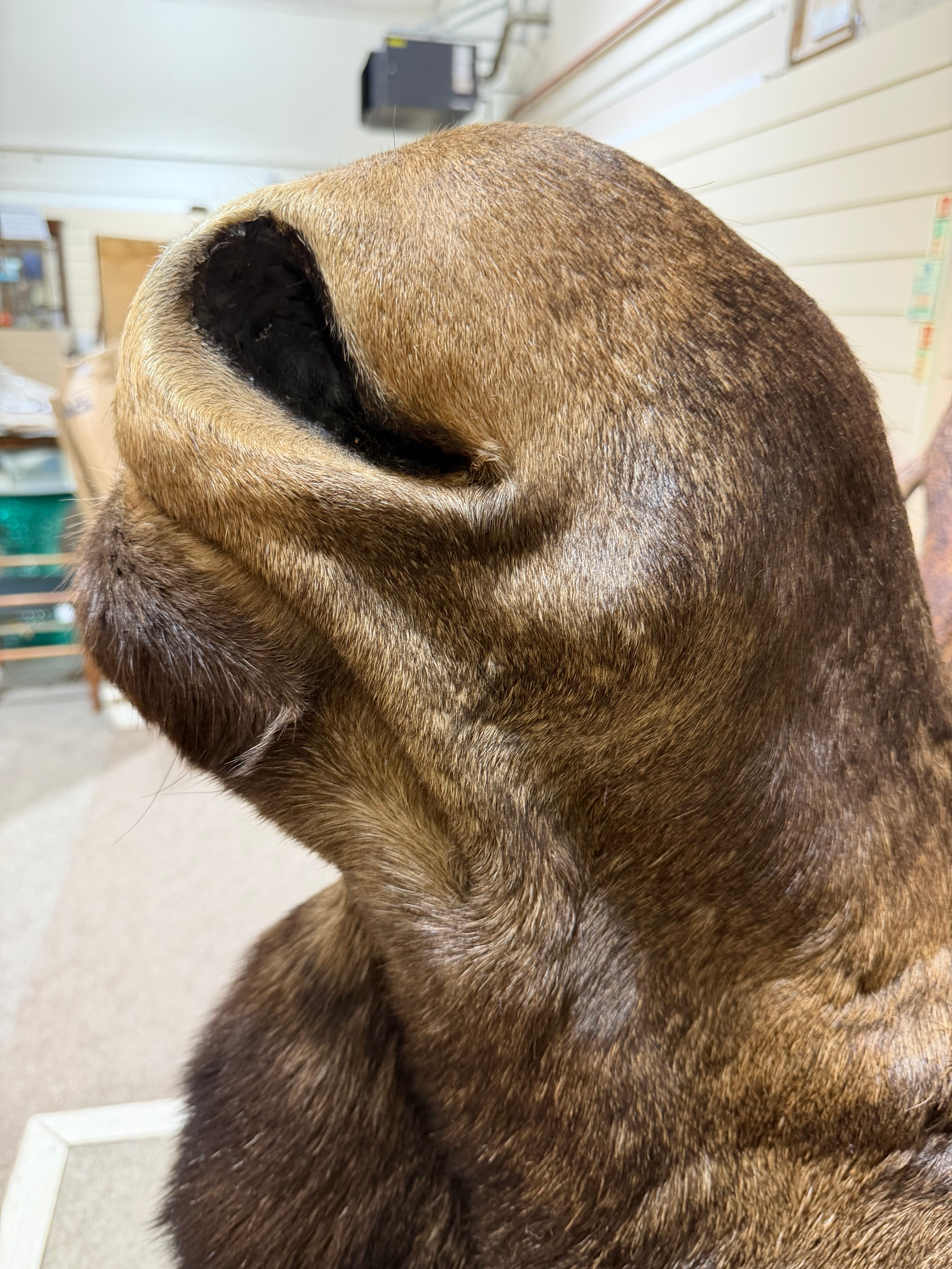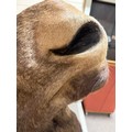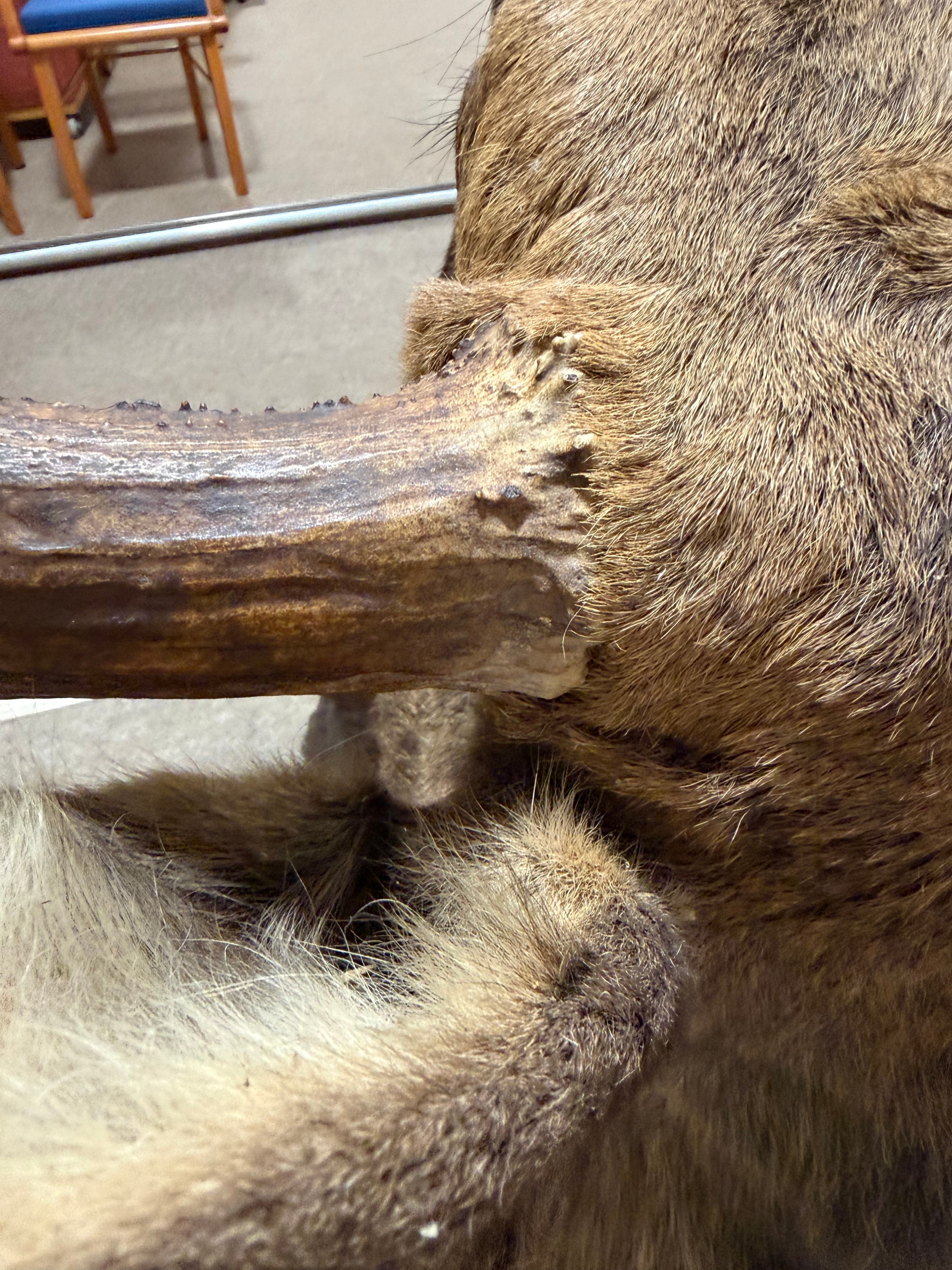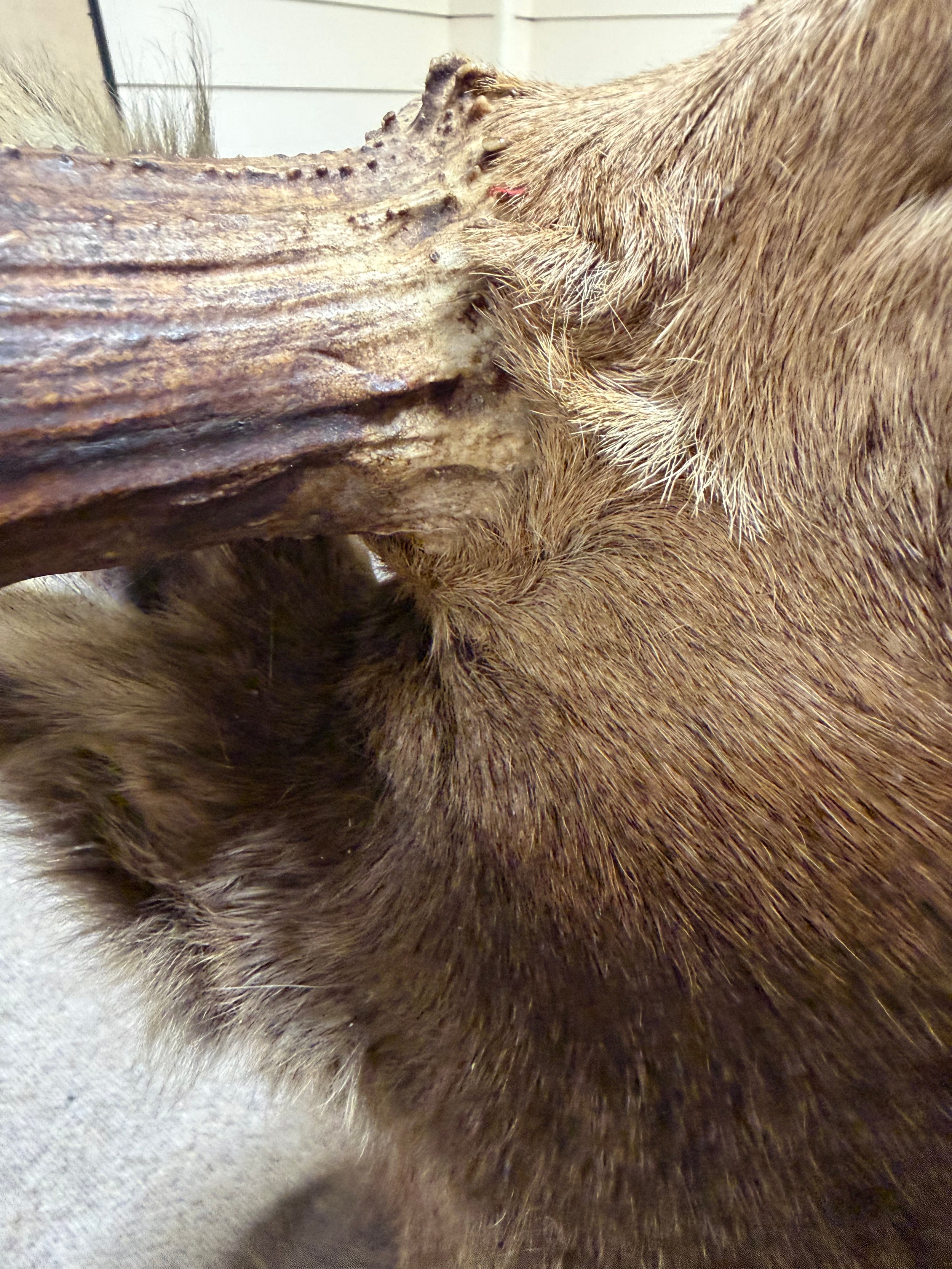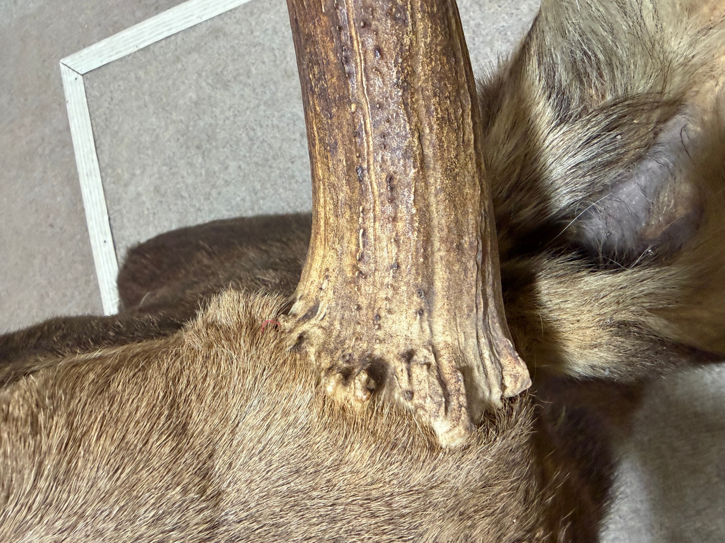 Good condition, some light hair loss to the ears and visible seams here. Losses to the mouth section and the horns are firmly attached and cannot be removed.