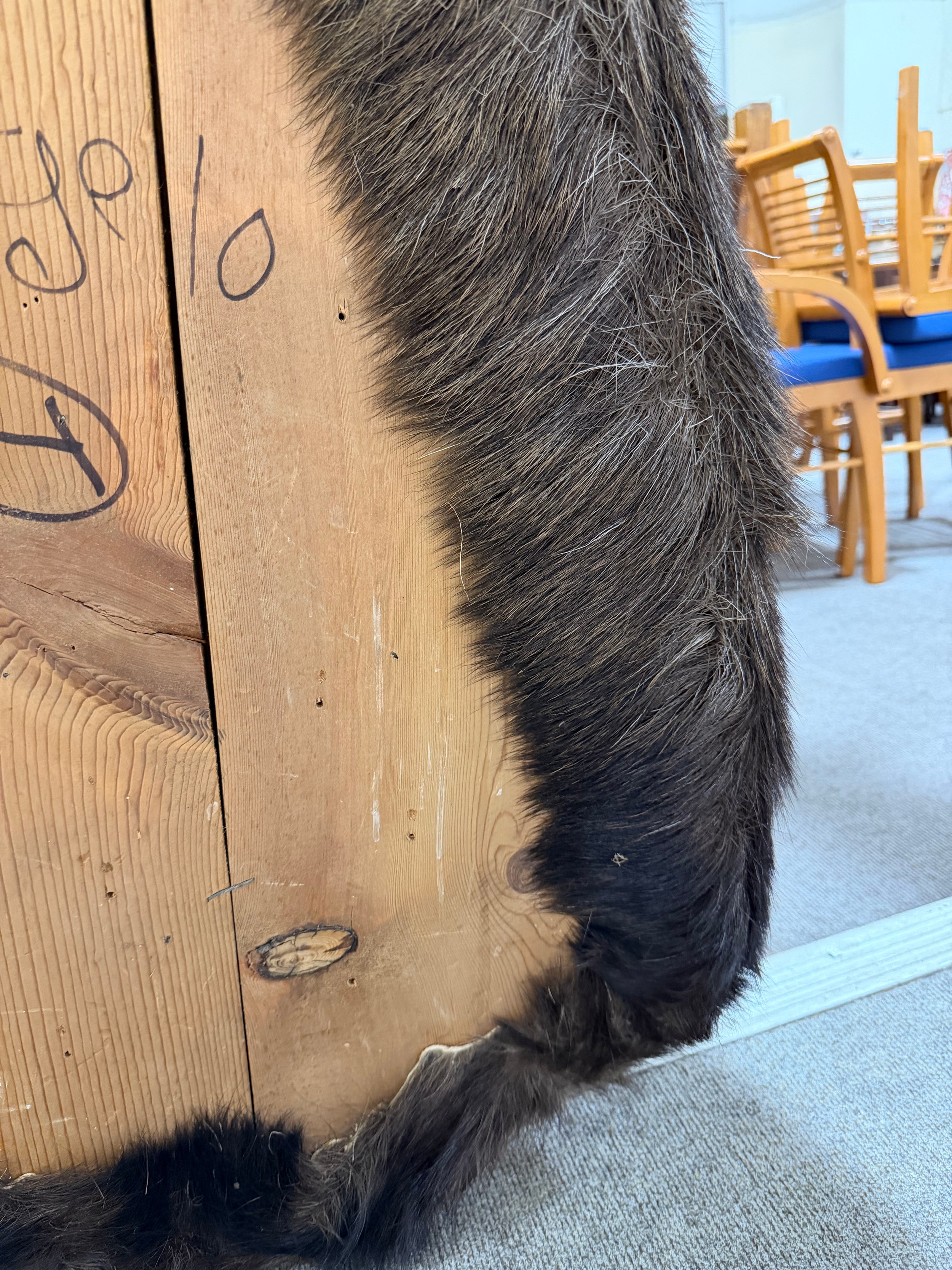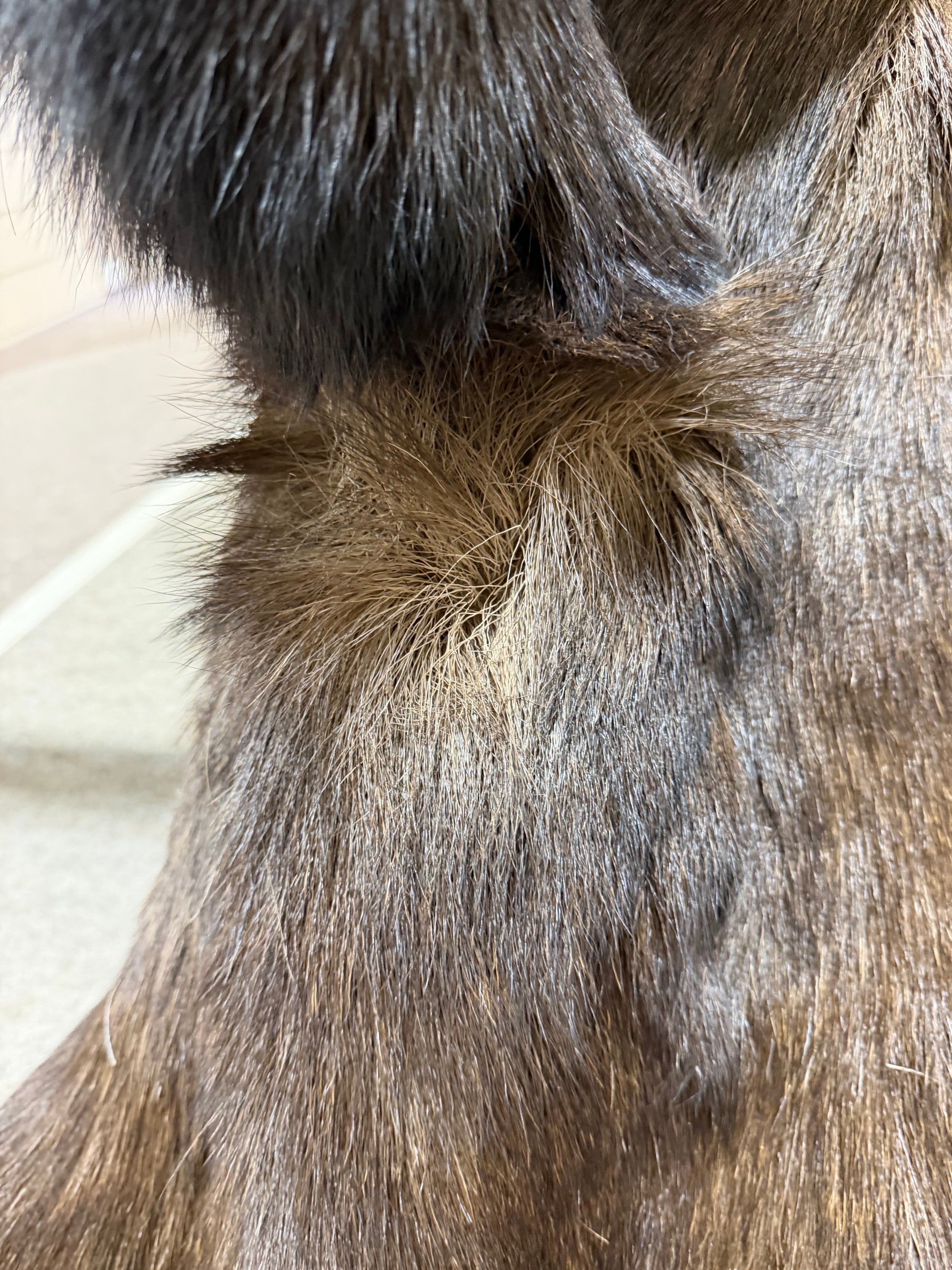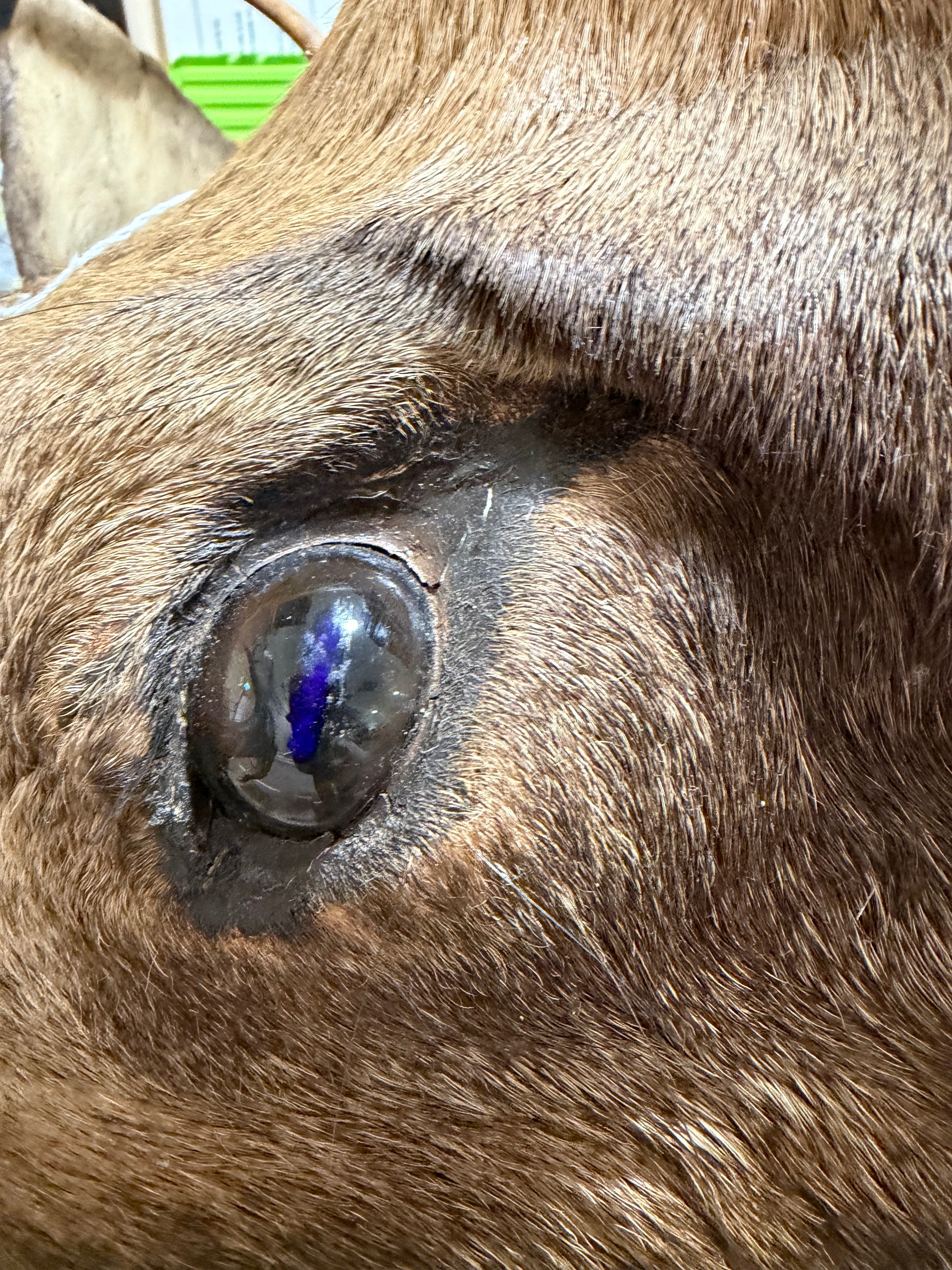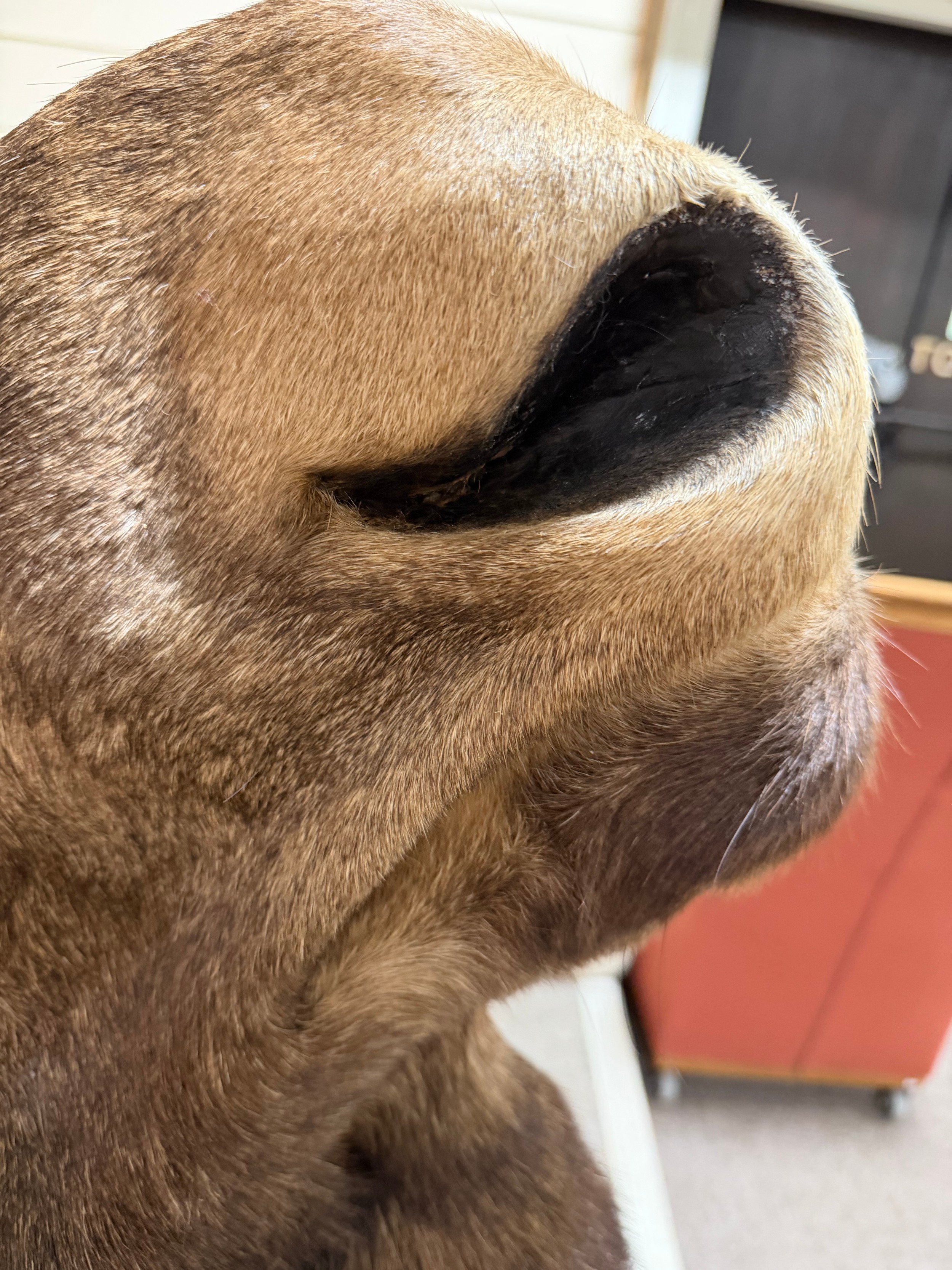 Good condition, some light hair loss to the ears and visible seams here. Losses to the mouth section and the horns are firmly attached and cannot be removed.