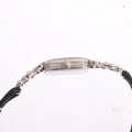 An Art Deco lady's platinum diamond mechanical cocktail wristwatch, circa 1940s, silvered dial with black Arabic numerals, blued steel leaf hands and geometric diamond set openwork case, with leather strap and 9ct white gold clasp, case no. 8034, case width 12mm, 13.1g gross, working order