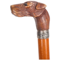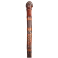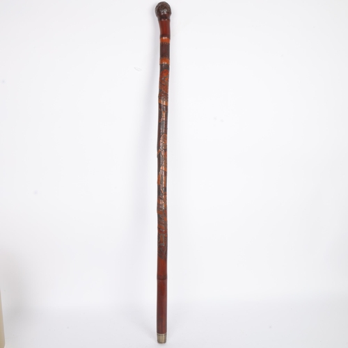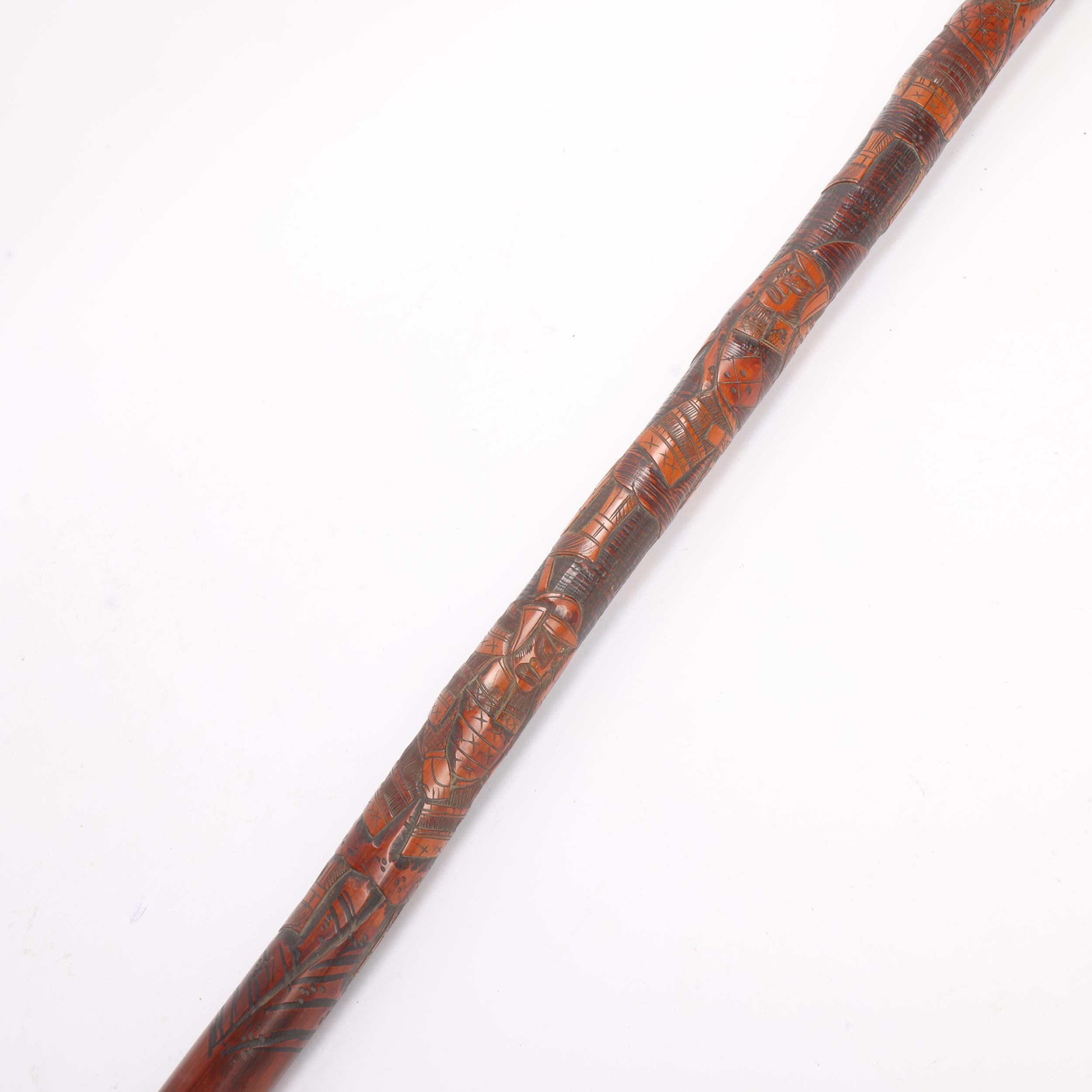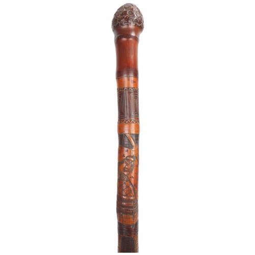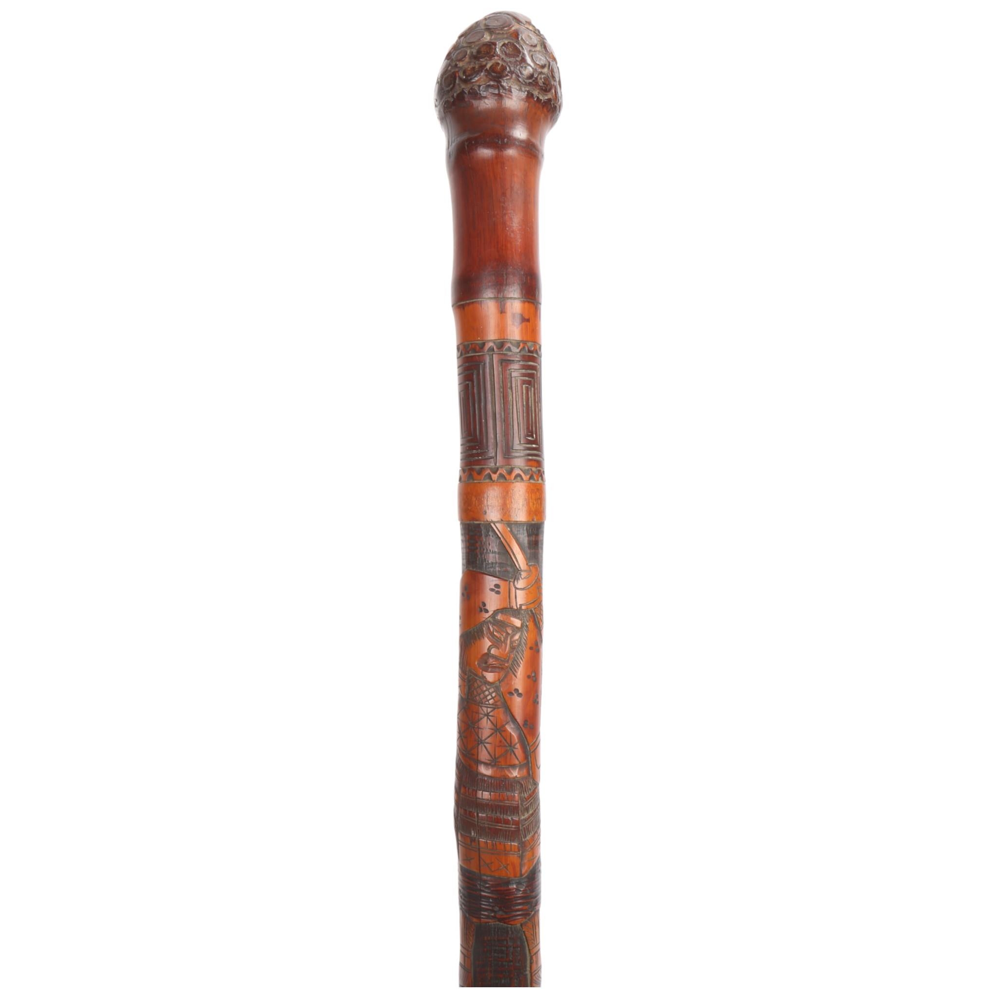 A one-piece bamboo cane with the root ball forming the handle, the length of the shaft carved in finely detailed relief with three Samurai in traditional dress, elements of the designs stained for contrast, metal ferrule, Japanese, circa 1910s, length 89cm