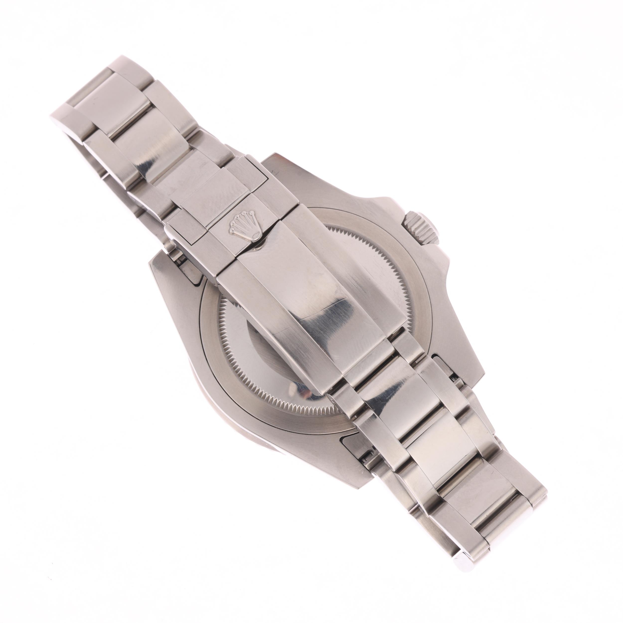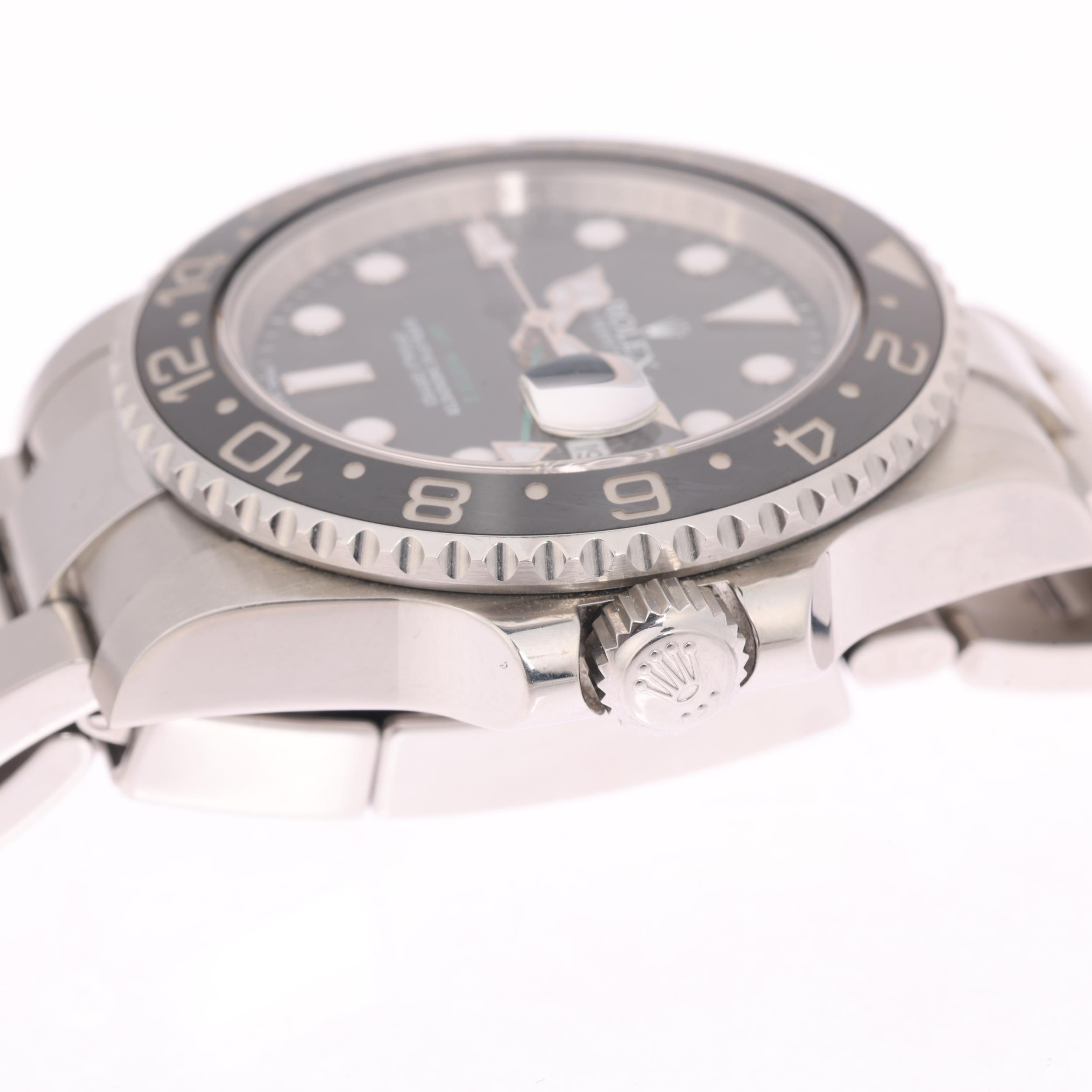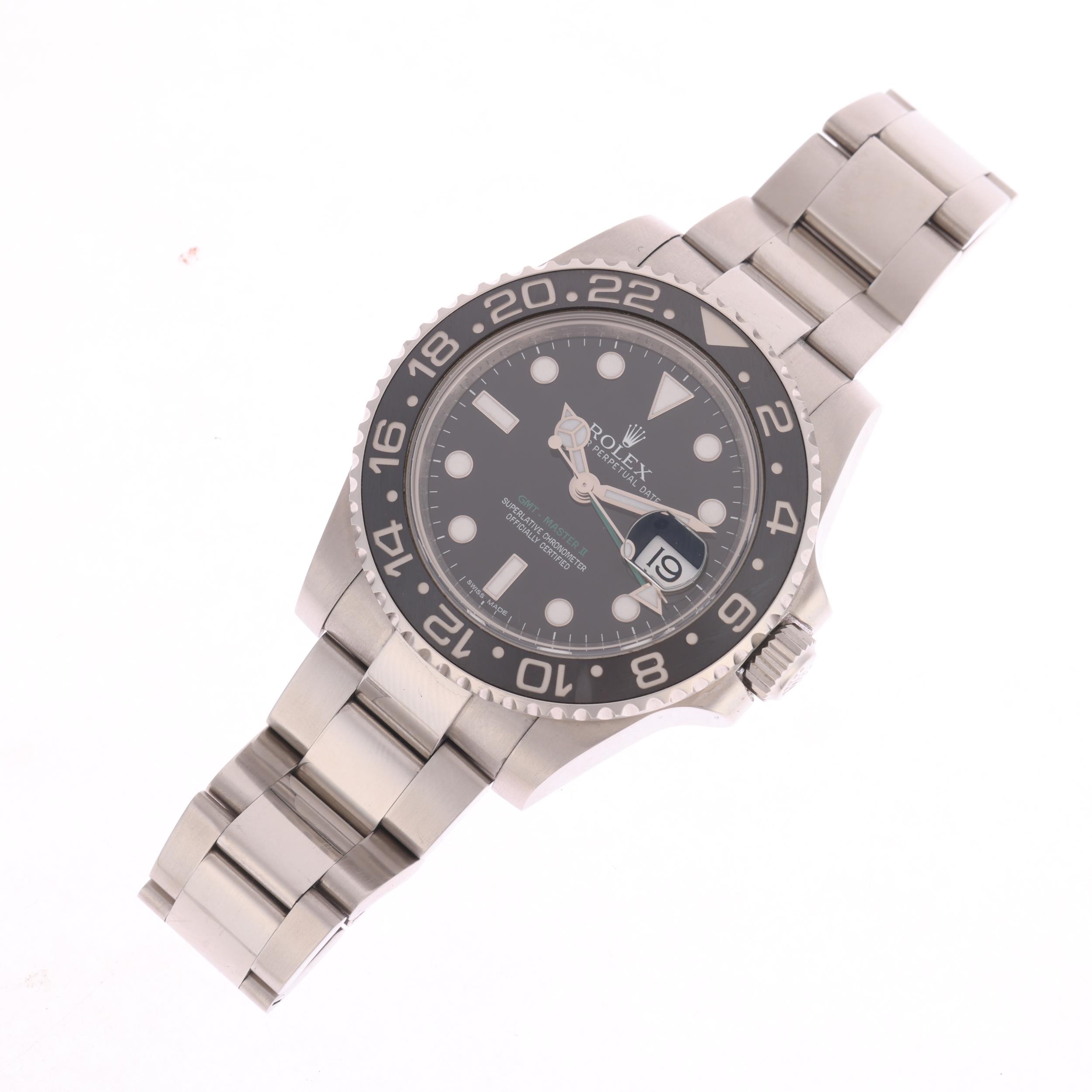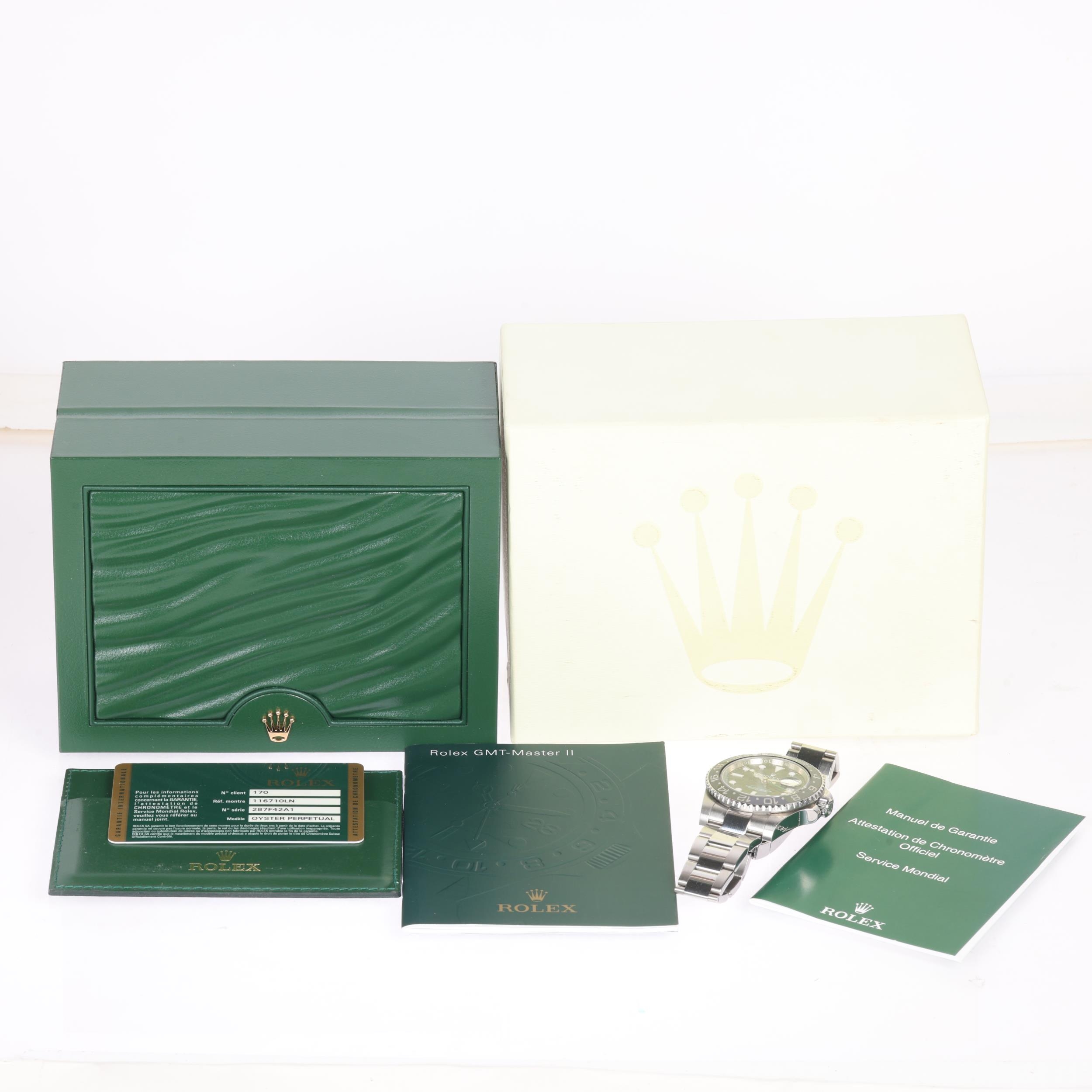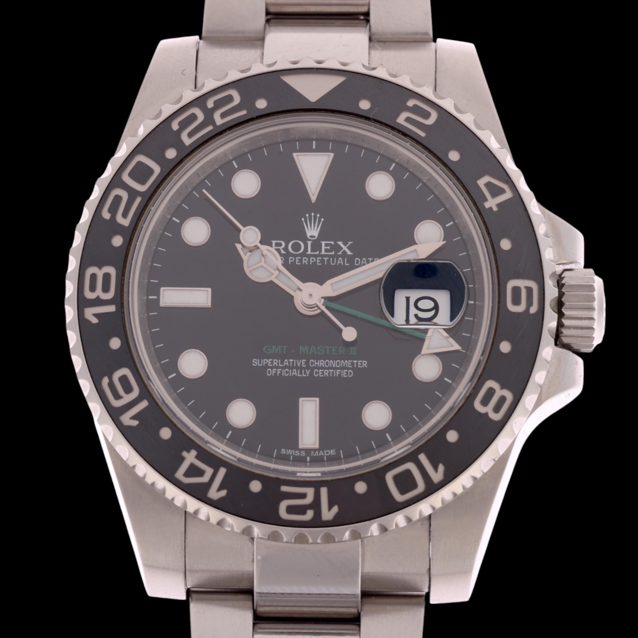 ROLEX - a stainless steel Oyster Perpetual Date GMT-Master II automatic calendar bracelet watch, ref. 116710LN, circa 2013, black dial with luminous dot and baton hour markers, polished Mercedes hands with luminous inserts, sweep centre seconds hand, green arrow tipped GMT hand, cyclops date aperture, black ceramic bezel insert with Rolex stainless steel Oyster link bracelet, and signed folding clasp, serial no. 287F42A1, case width 40mm, working order, boxed with papers