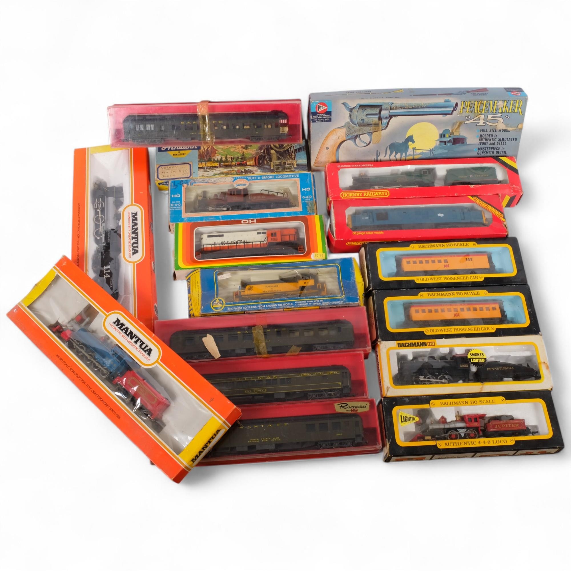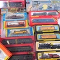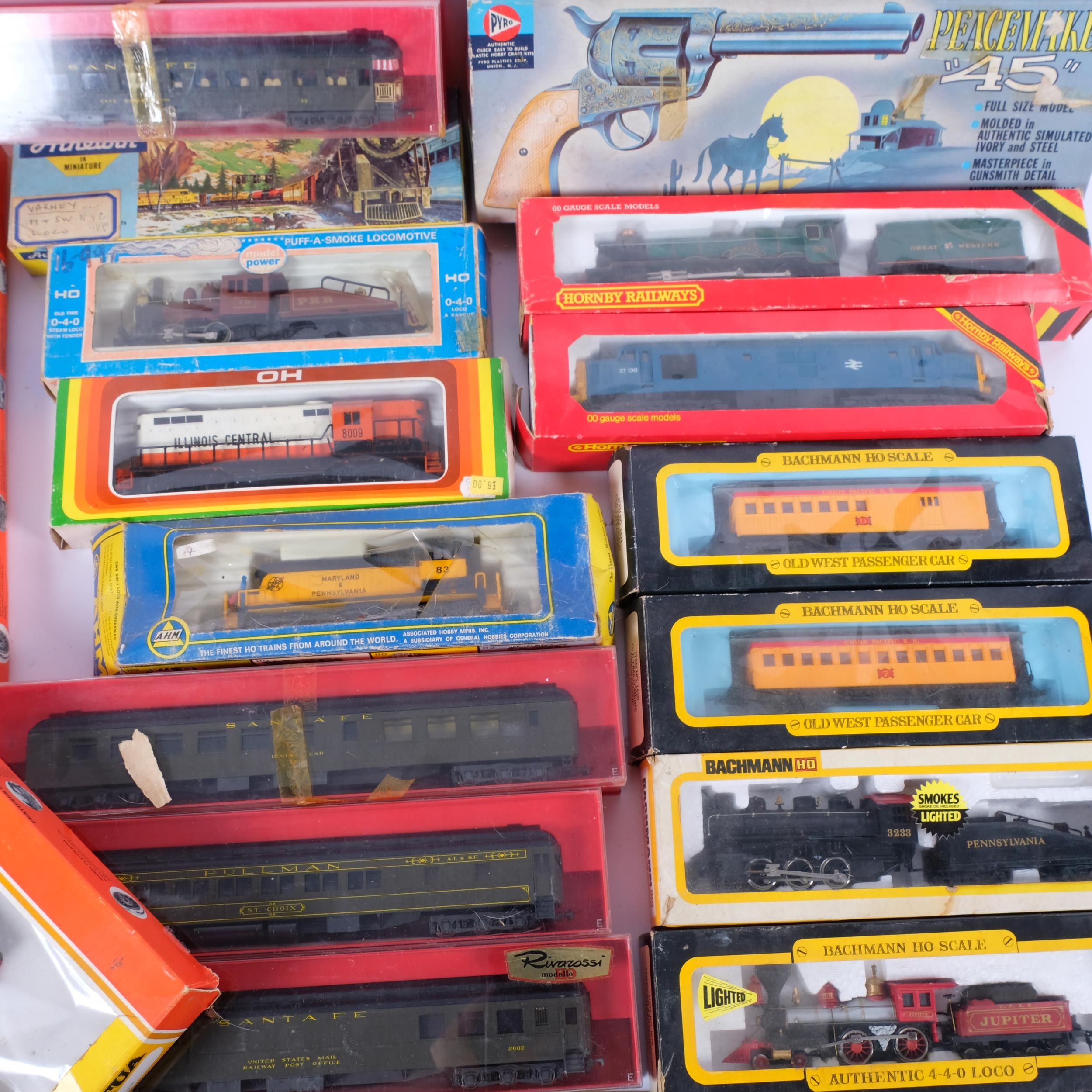 A box containing various model railway locomotives and coaches, names including Hornby and Bachmann, examples including a Hornby OO gauge GWR Hall locomotive, and a Tyco HO scale 282 Mikado locomotive and tender, etc