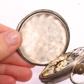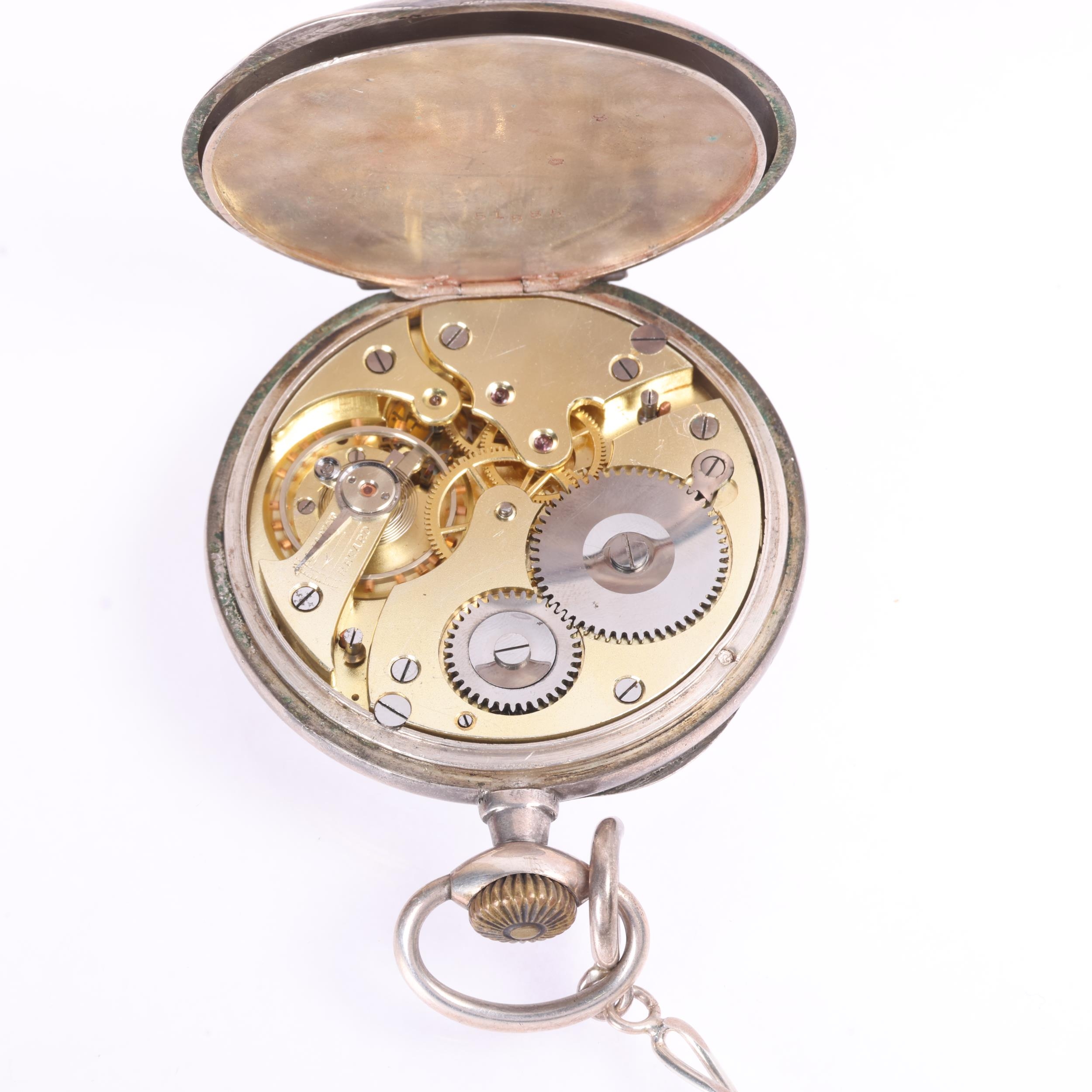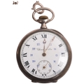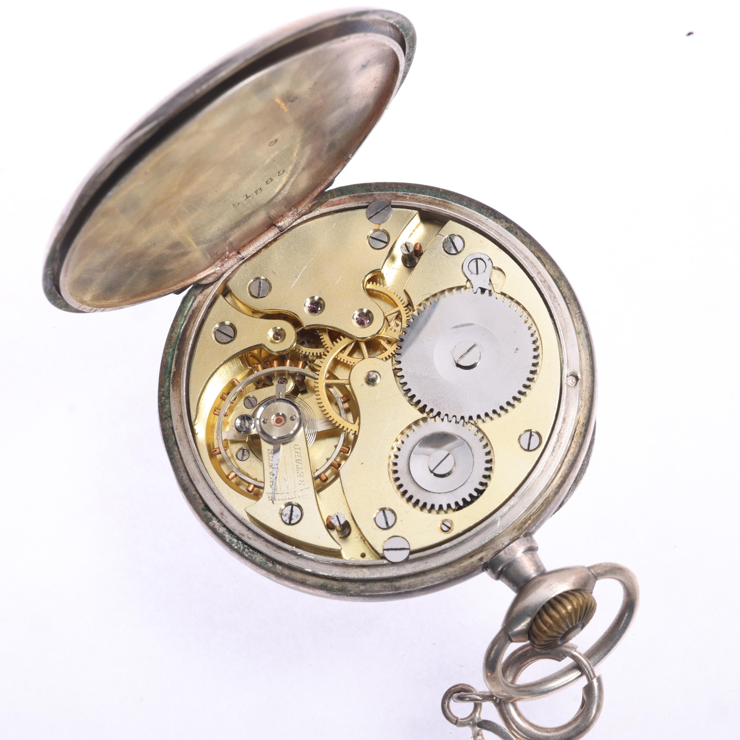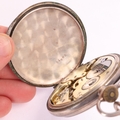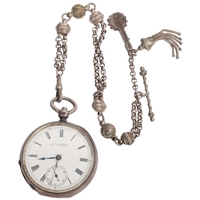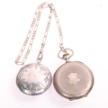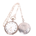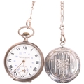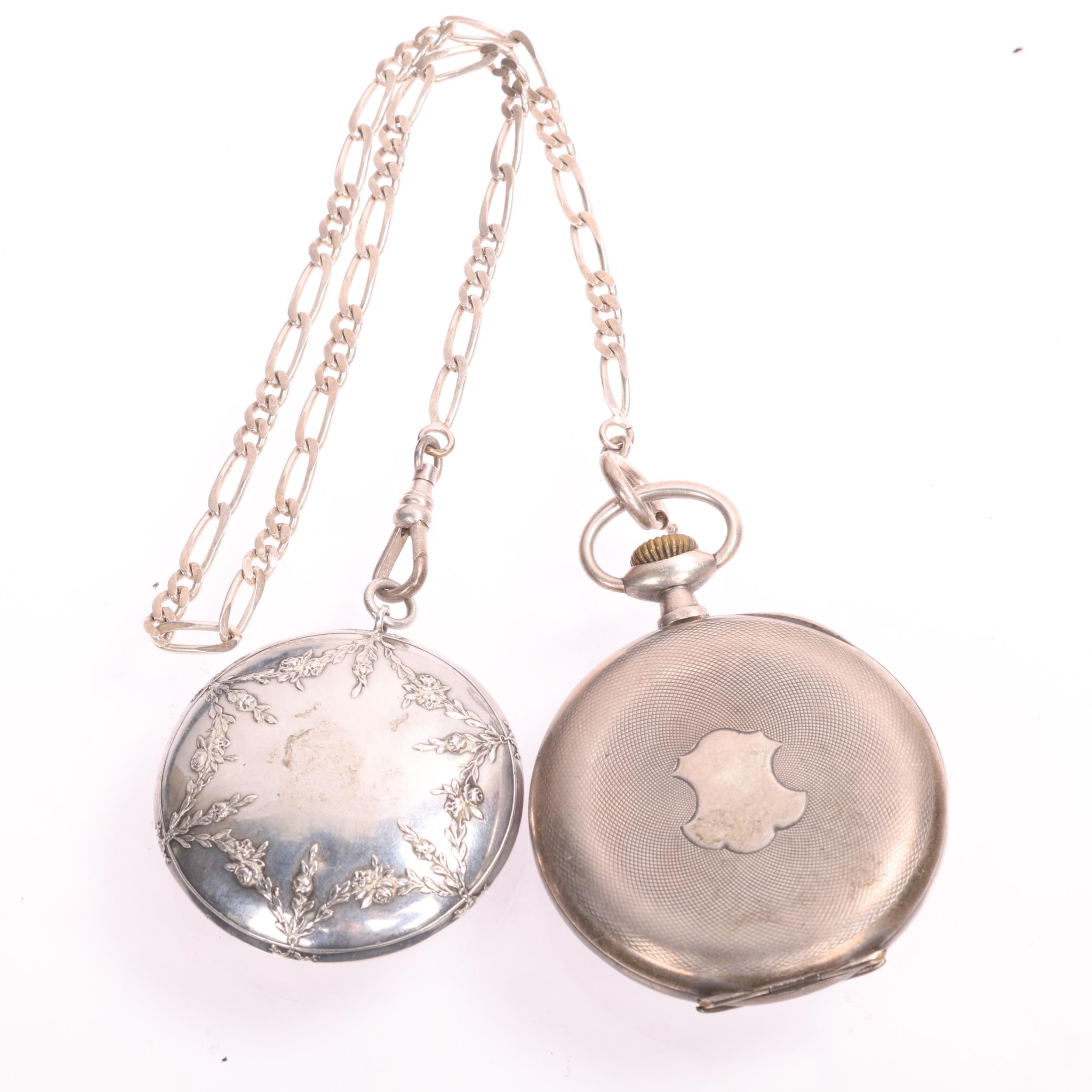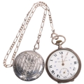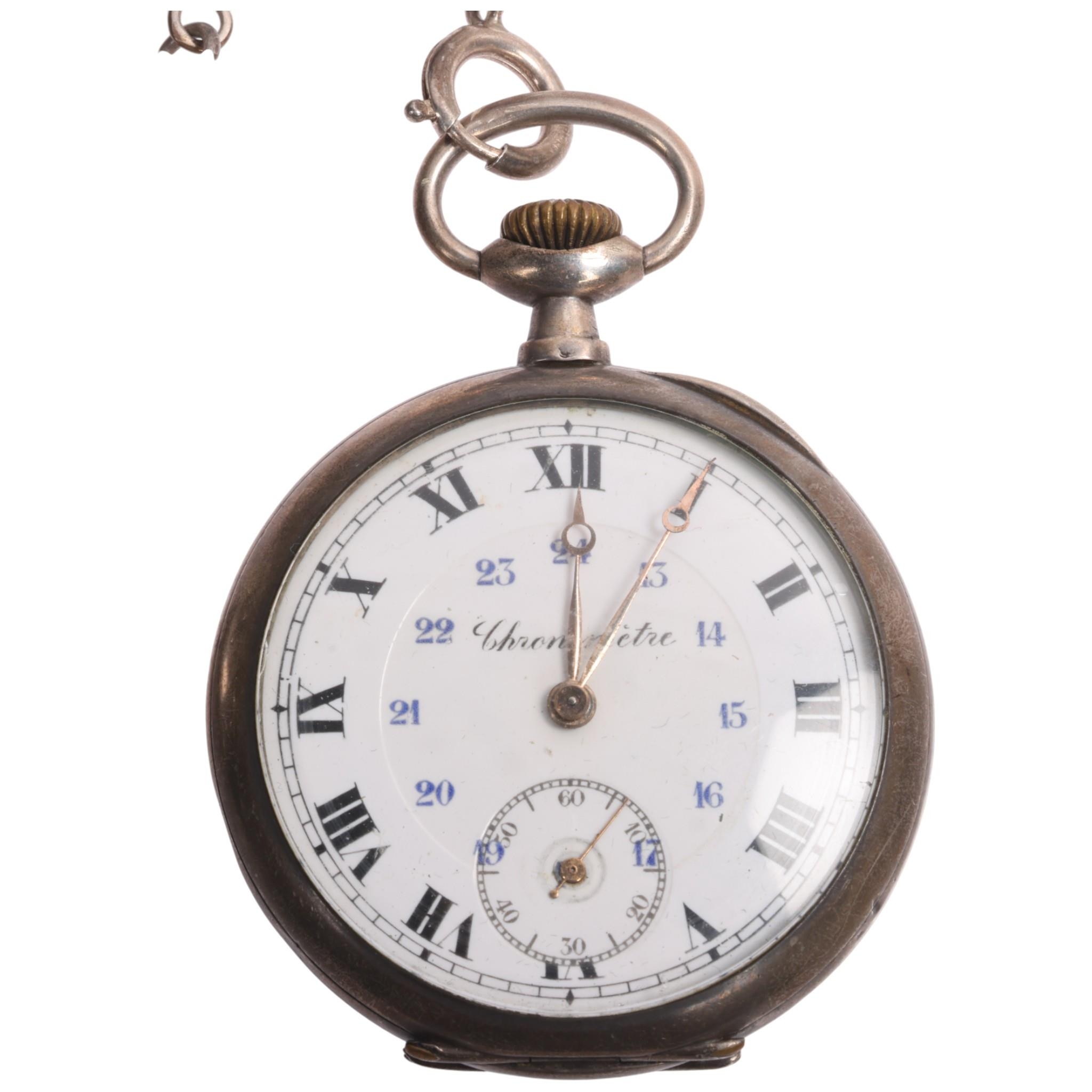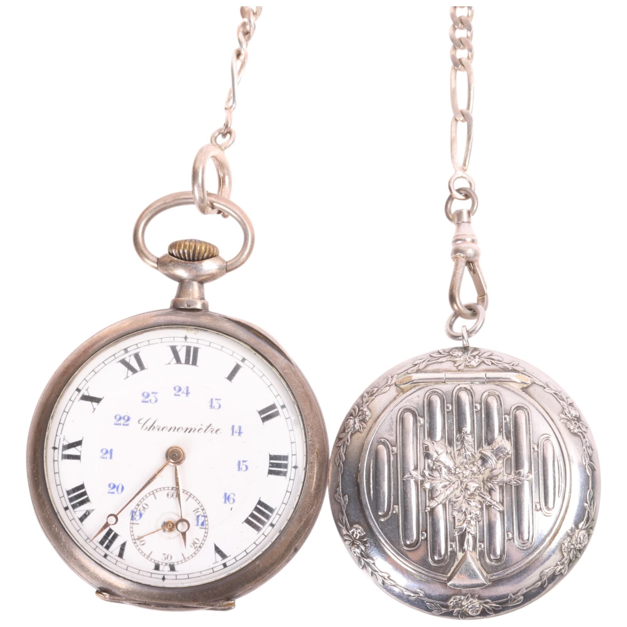 An Antique Swiss silver open-face keyless chronometer pocket watch, white enamel dial with black Roman numeral hour markers, gilt Breguet hands, subsidiary seconds dial and silver dust cover, serial no. 51885, case width 49mm, working order, with silver flat figaro link Albert chain and French silver powder compact